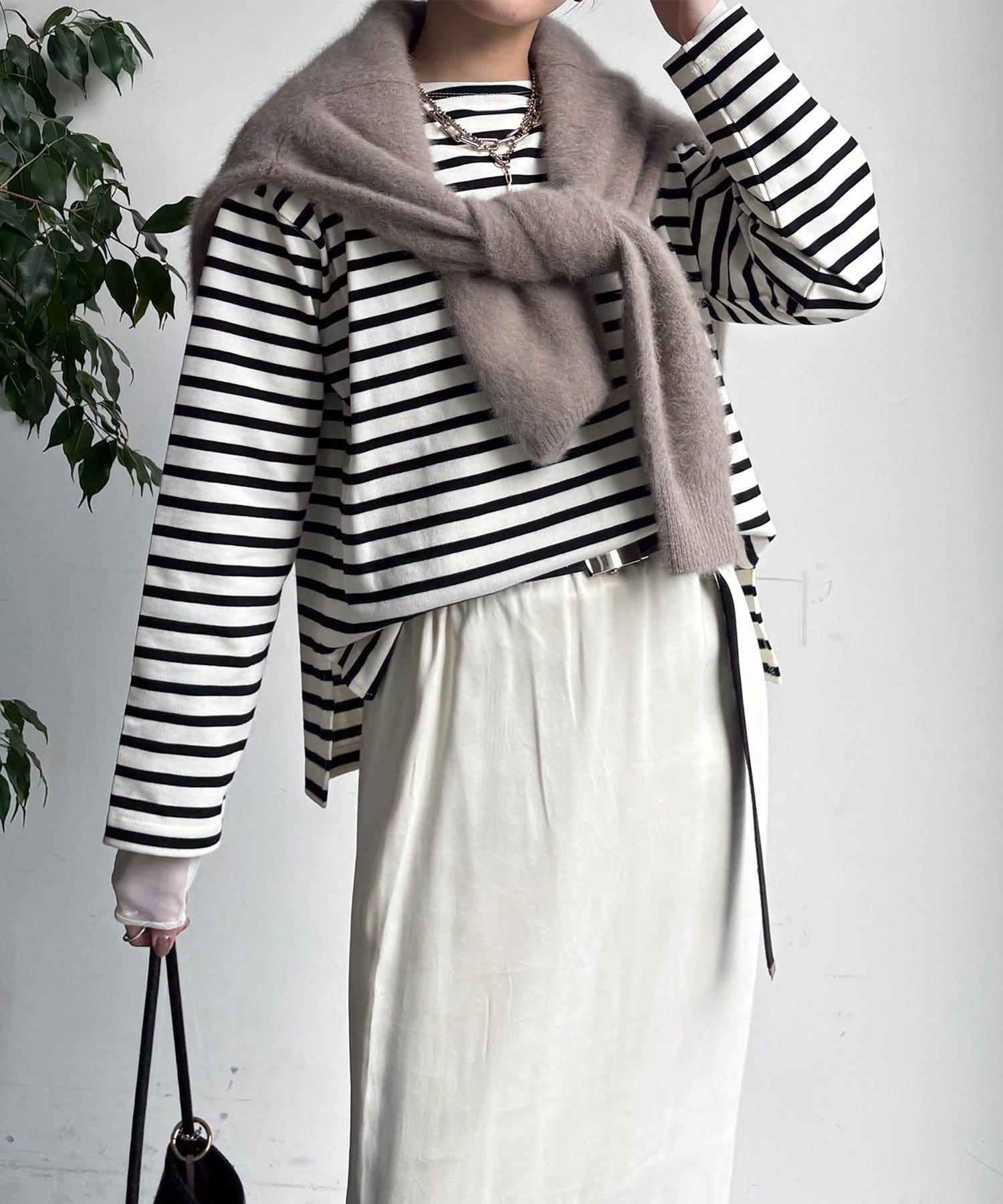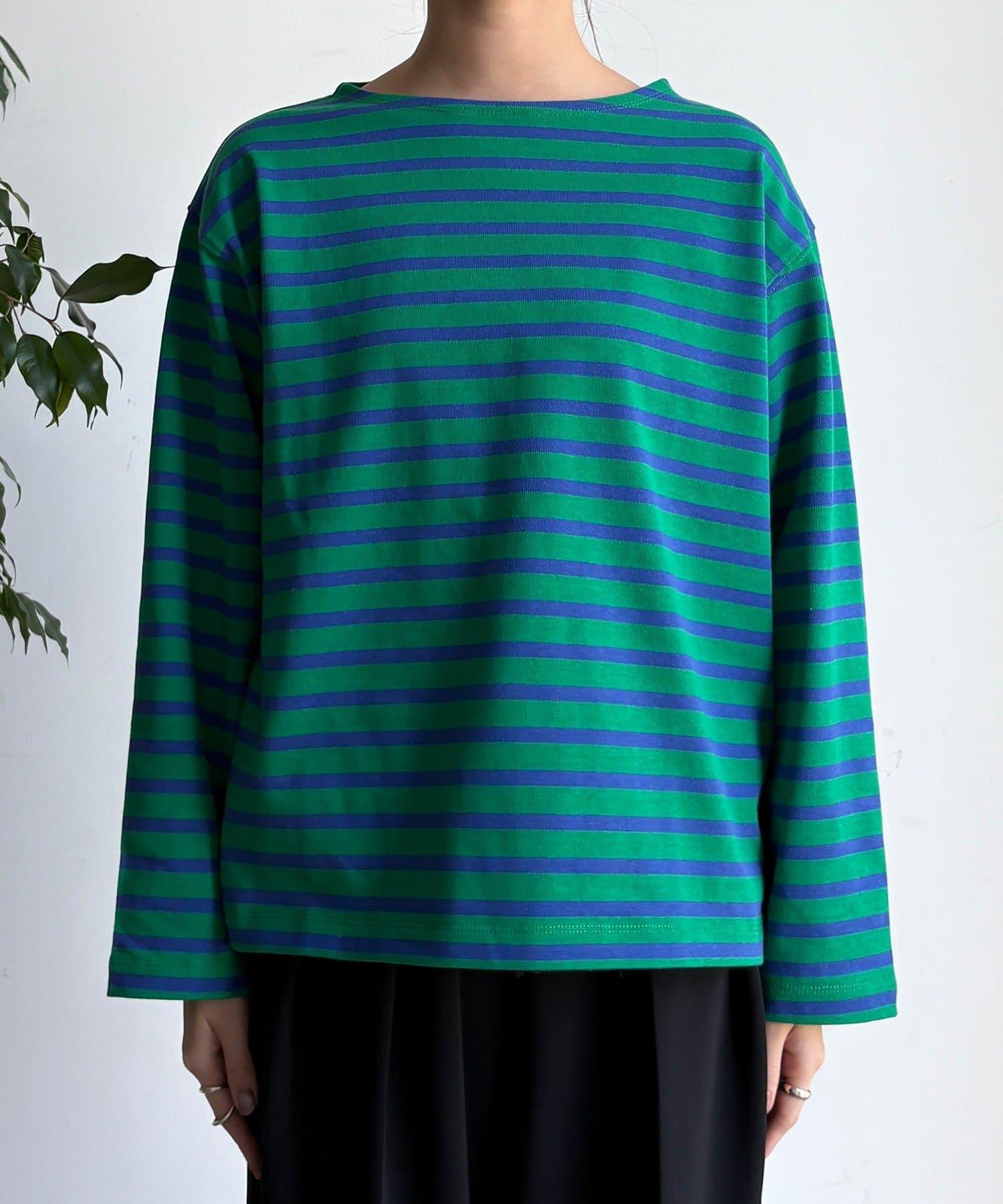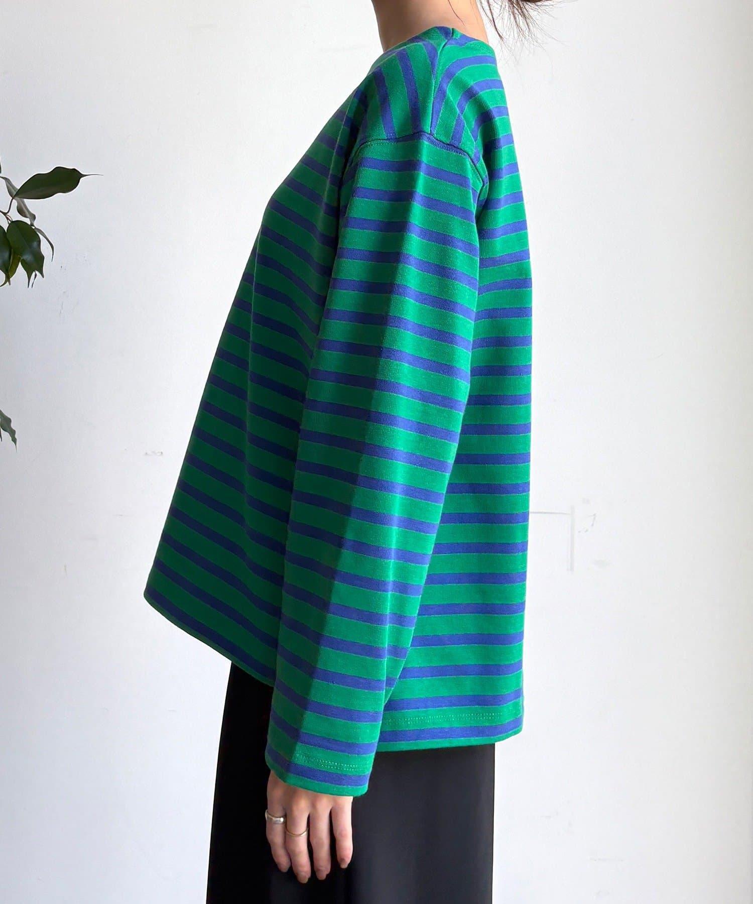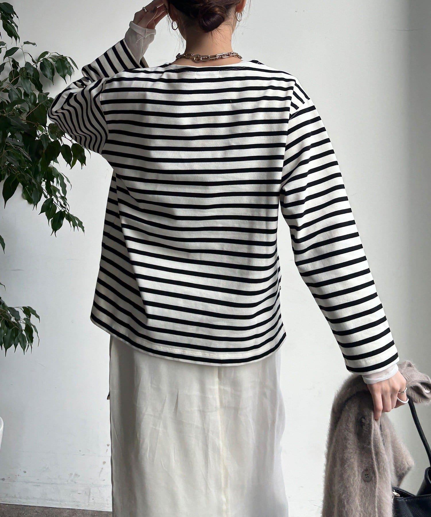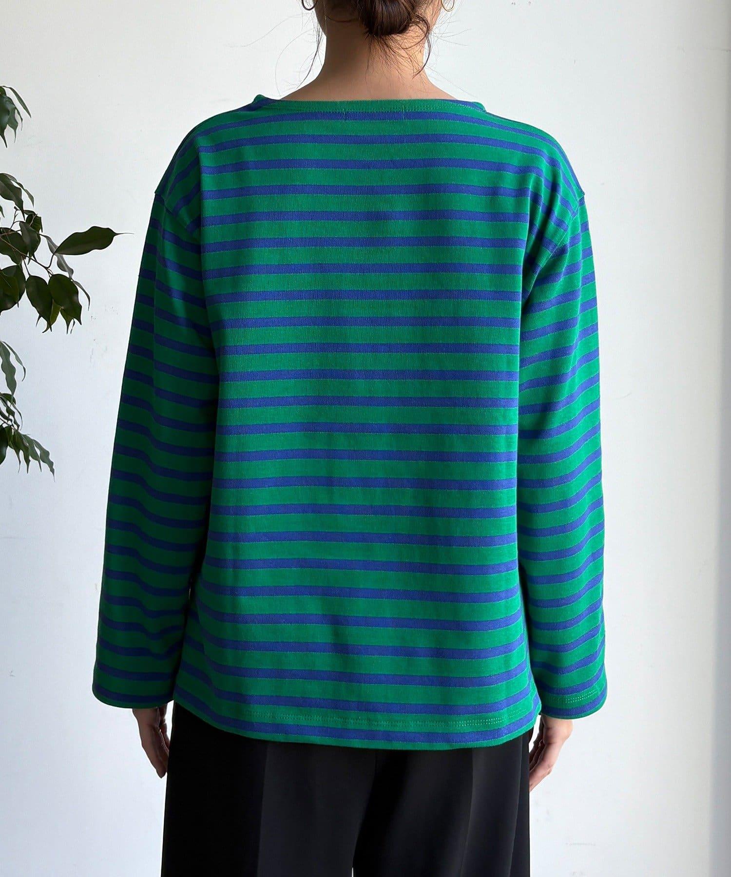 船領長款 T 恤,露出頸部,採用經典條紋圖案。