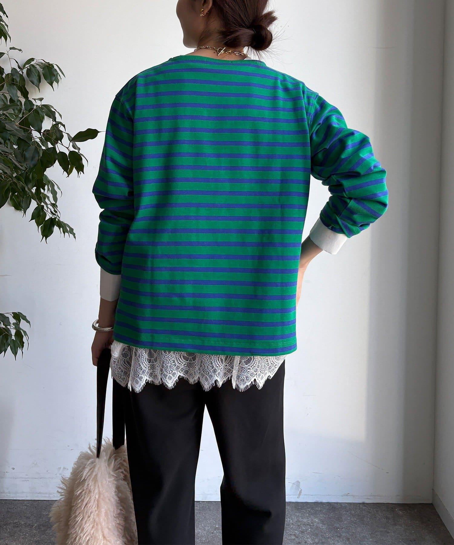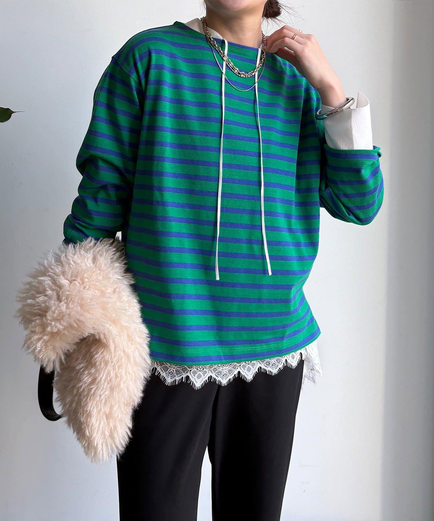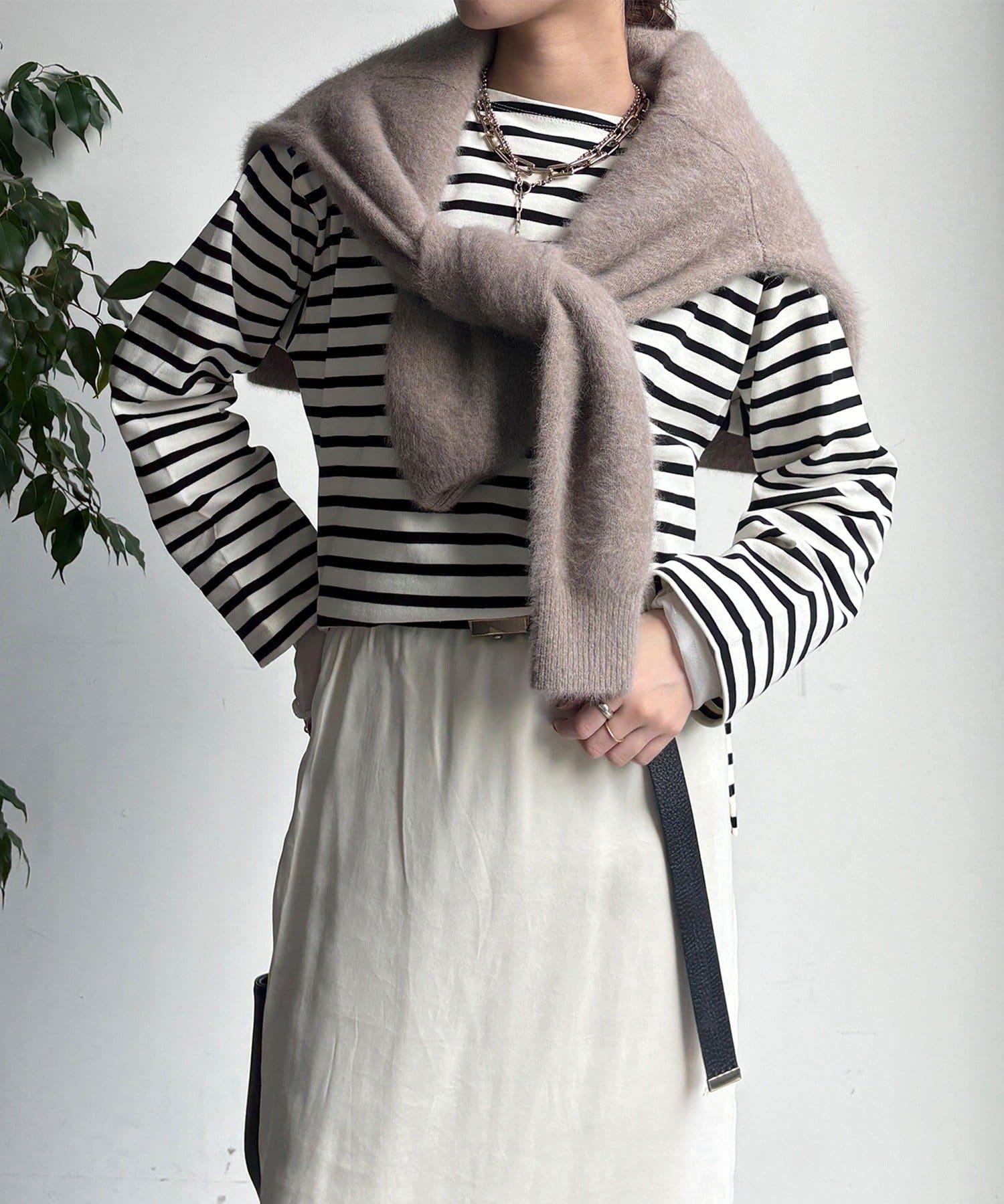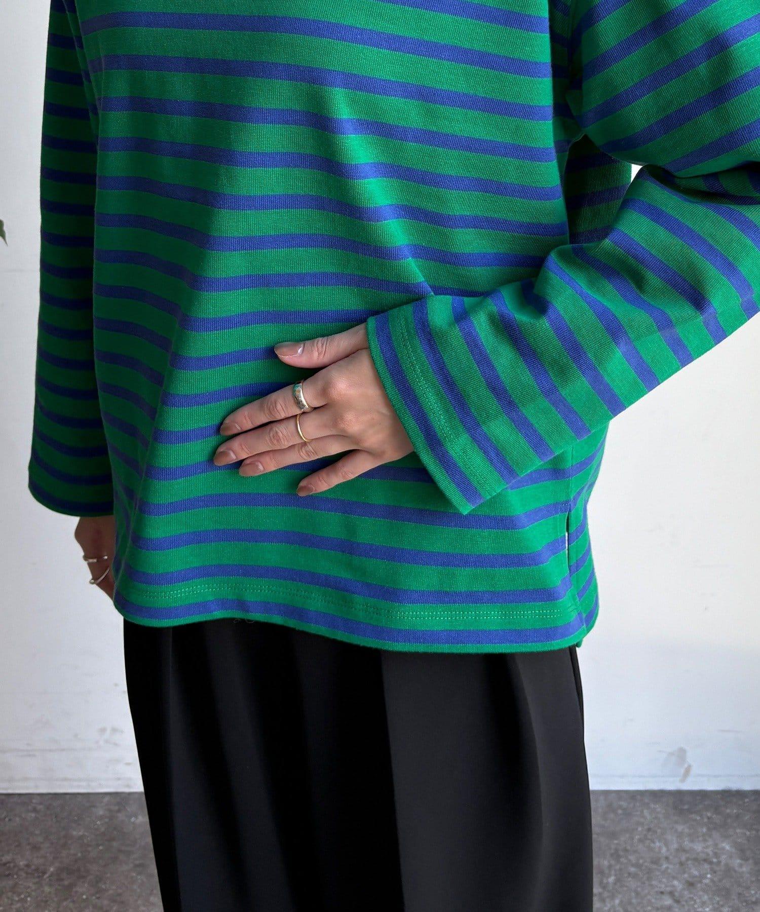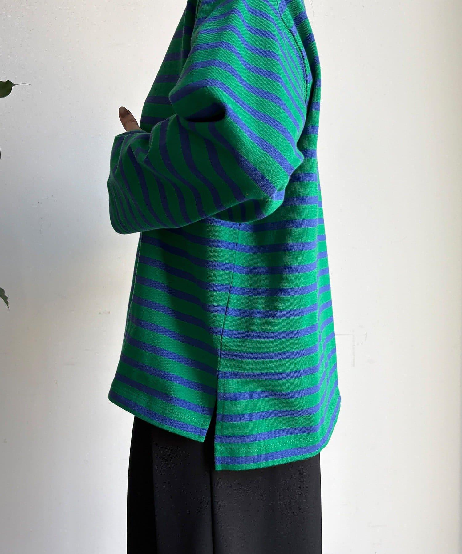 船領長款 T 恤,露出頸部,採用經典條紋圖案。