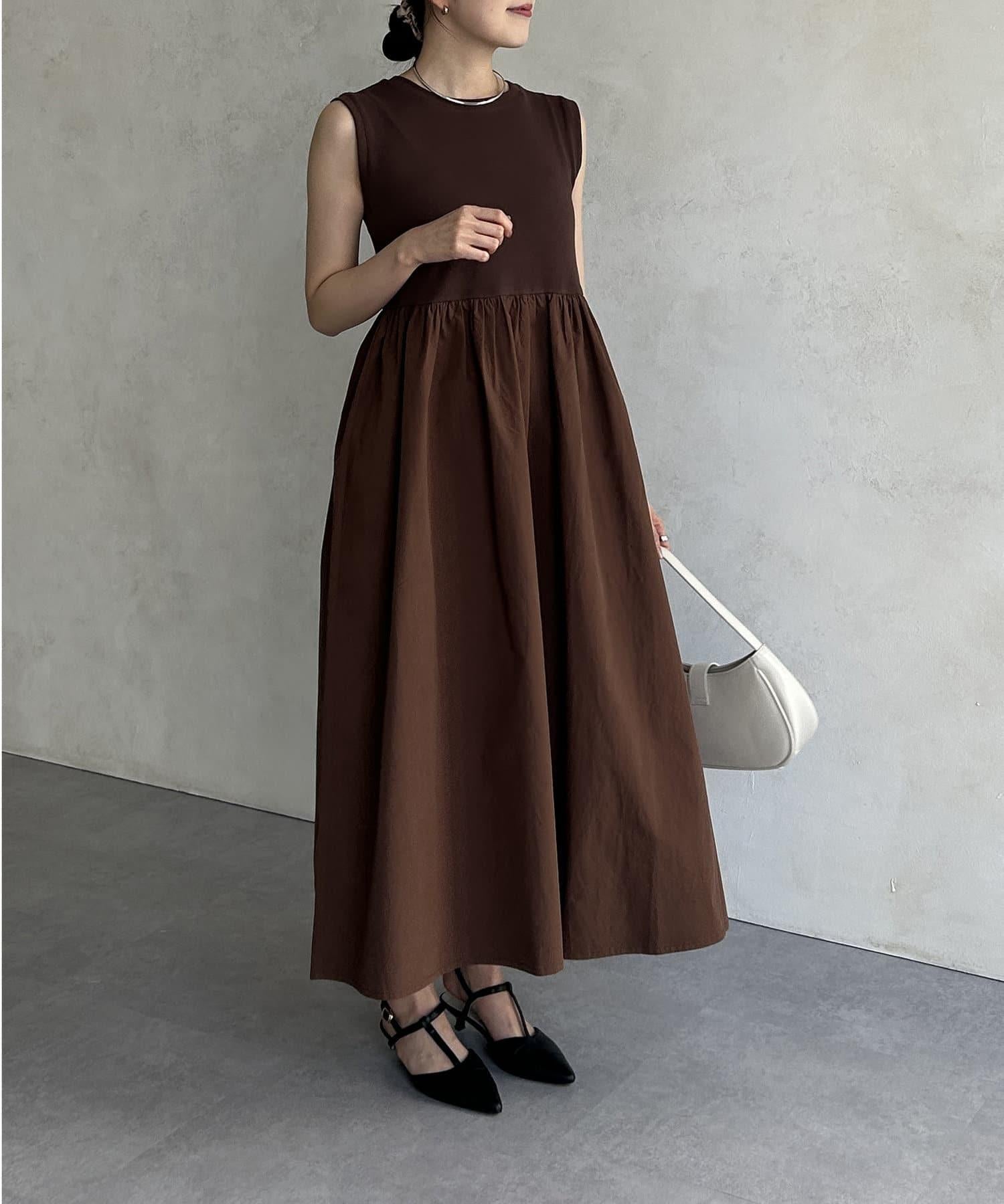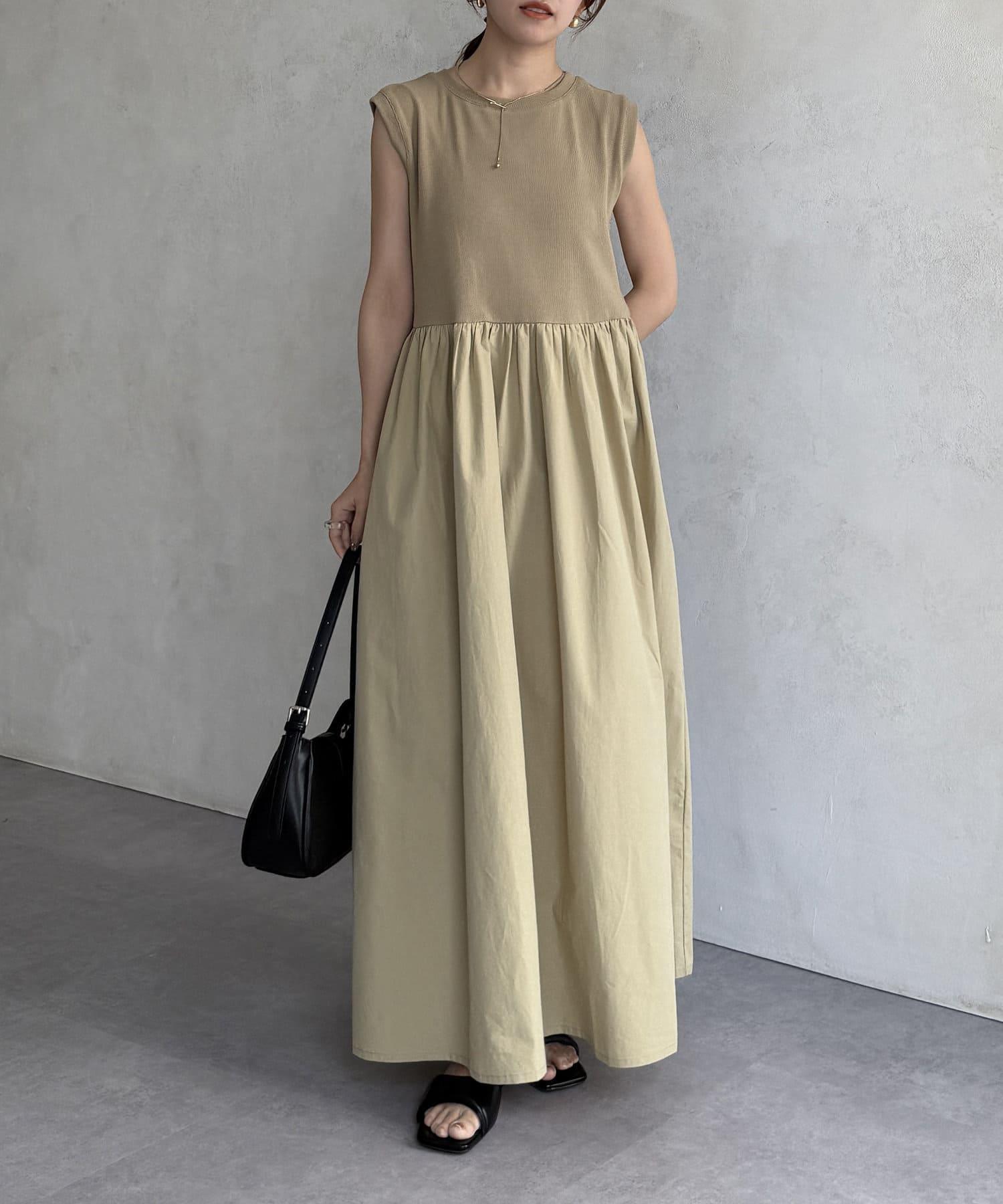 條紋×布料拼接無袖連衣裙
