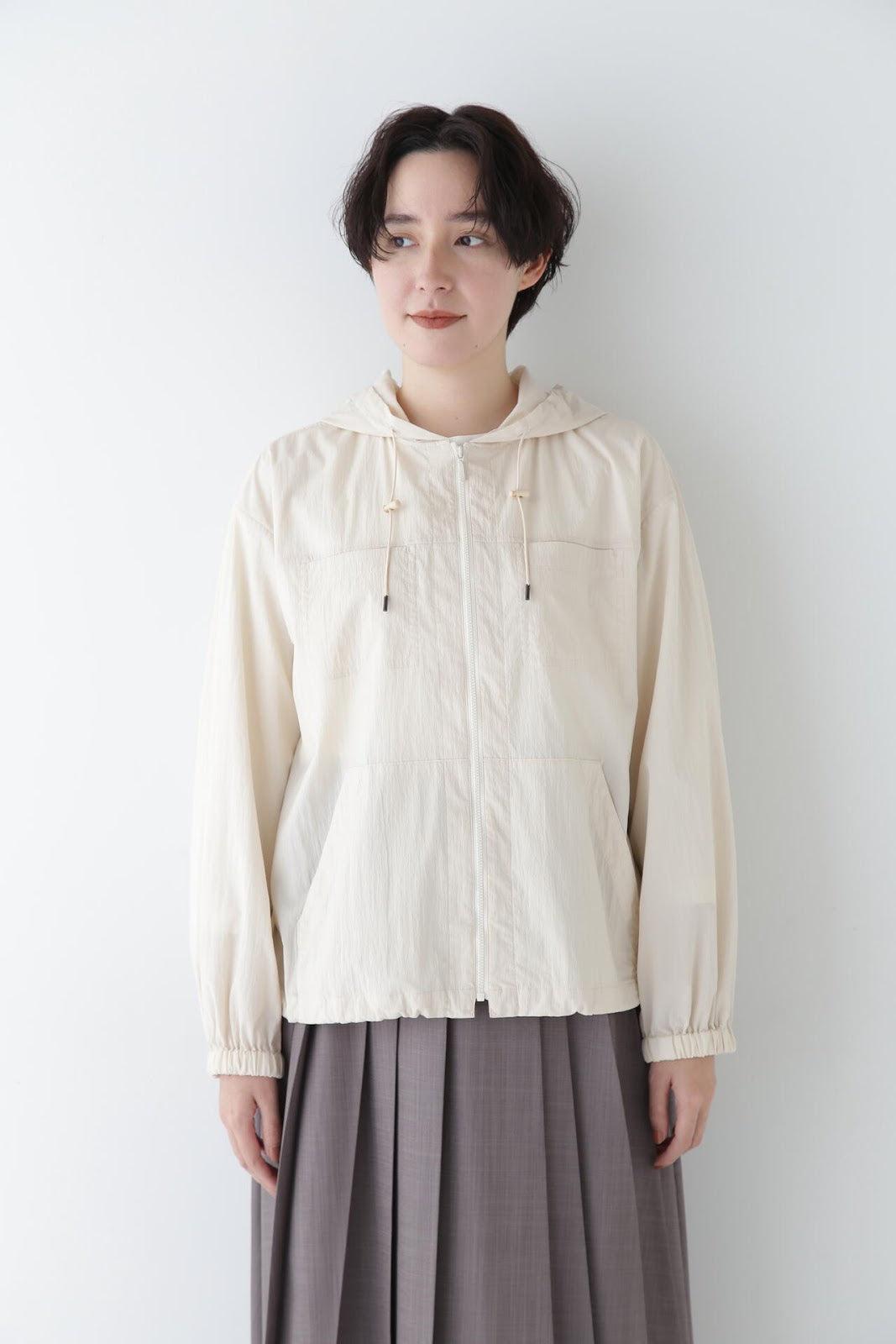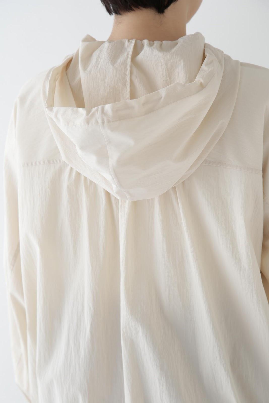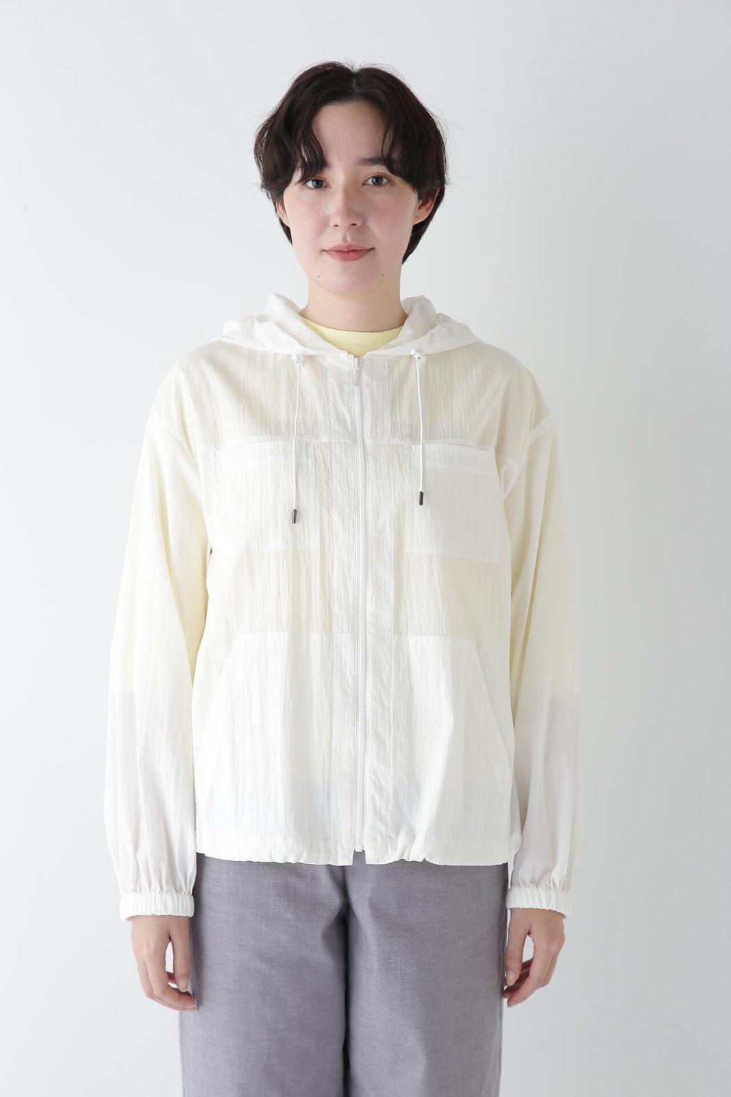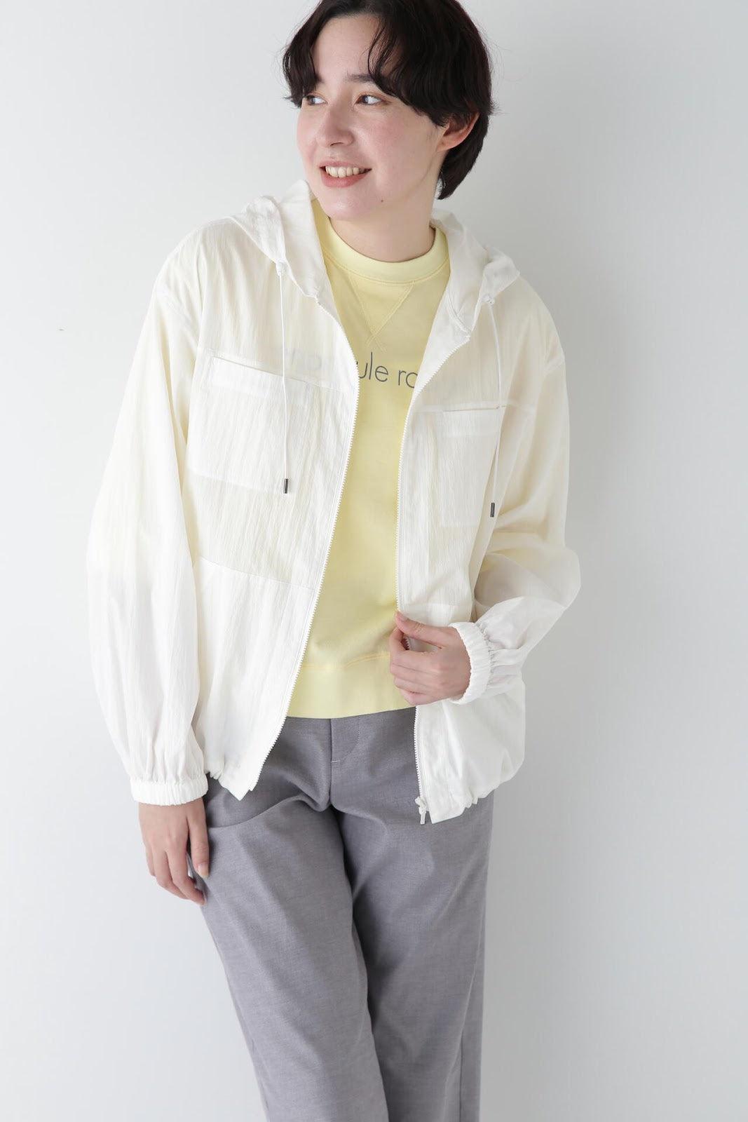 休閒又不失女人味的連帽衫 [設計特色] 薄款連帽衫,帶有揹帶褲細節。通過下襬抽繩,還可以瀏覽穿著。在這種情況下,塞子可以藏在裡面。面料是由棉和尼龍交織而成的透視面料,質感好、涼爽。這款罩衫是一款運動型罩衫,帶有優雅的光澤,成人也能輕鬆穿著。它還可以用作輕便的外衣,防曬效果很好。