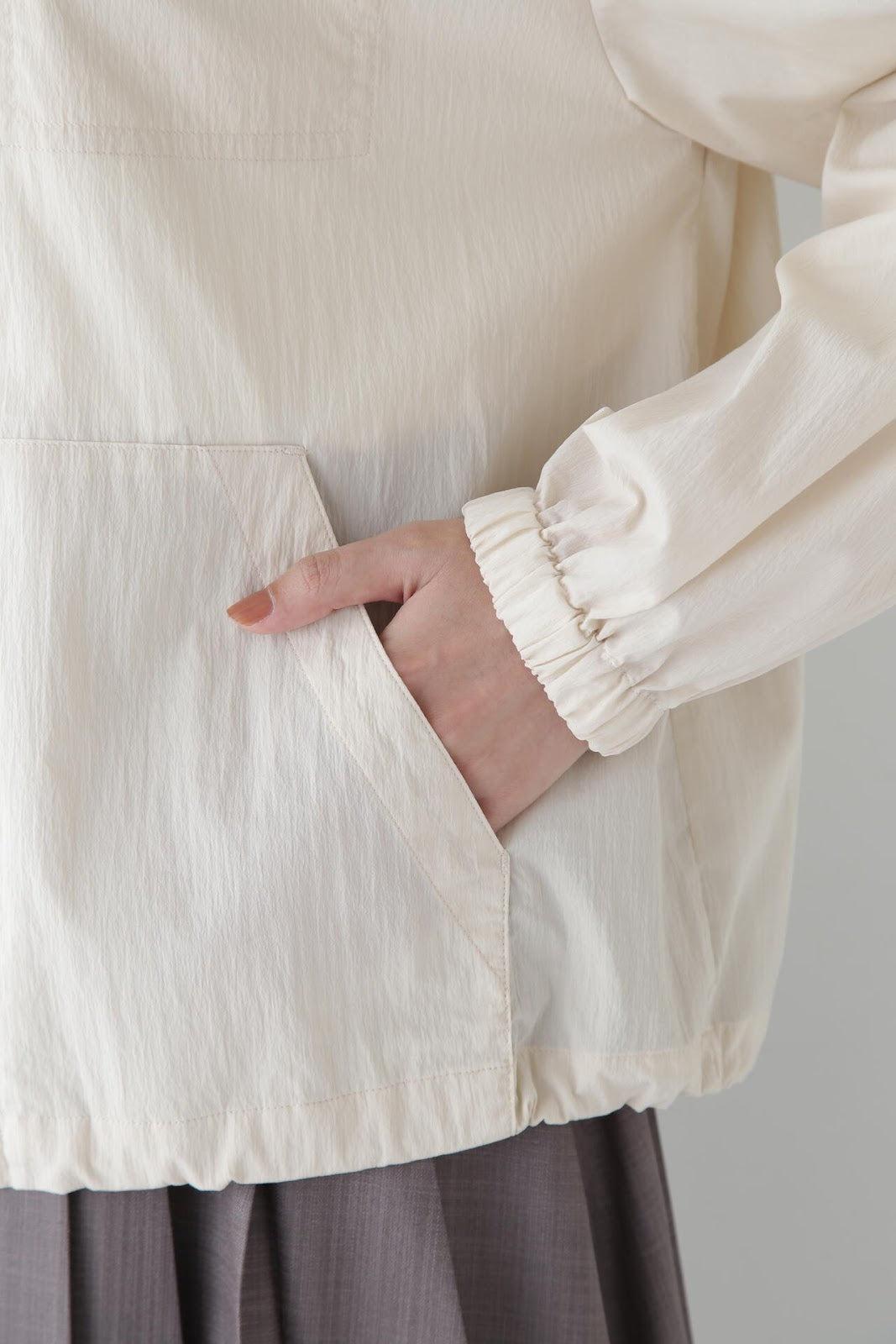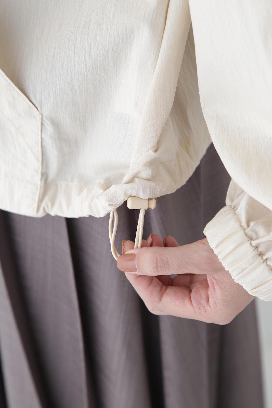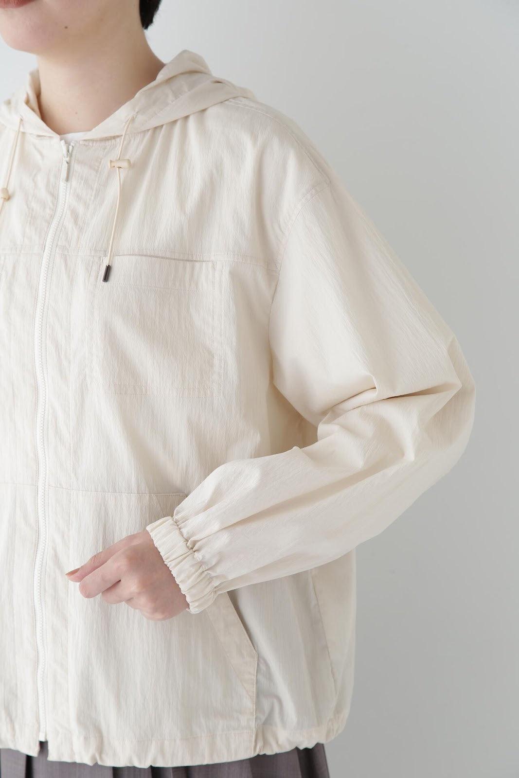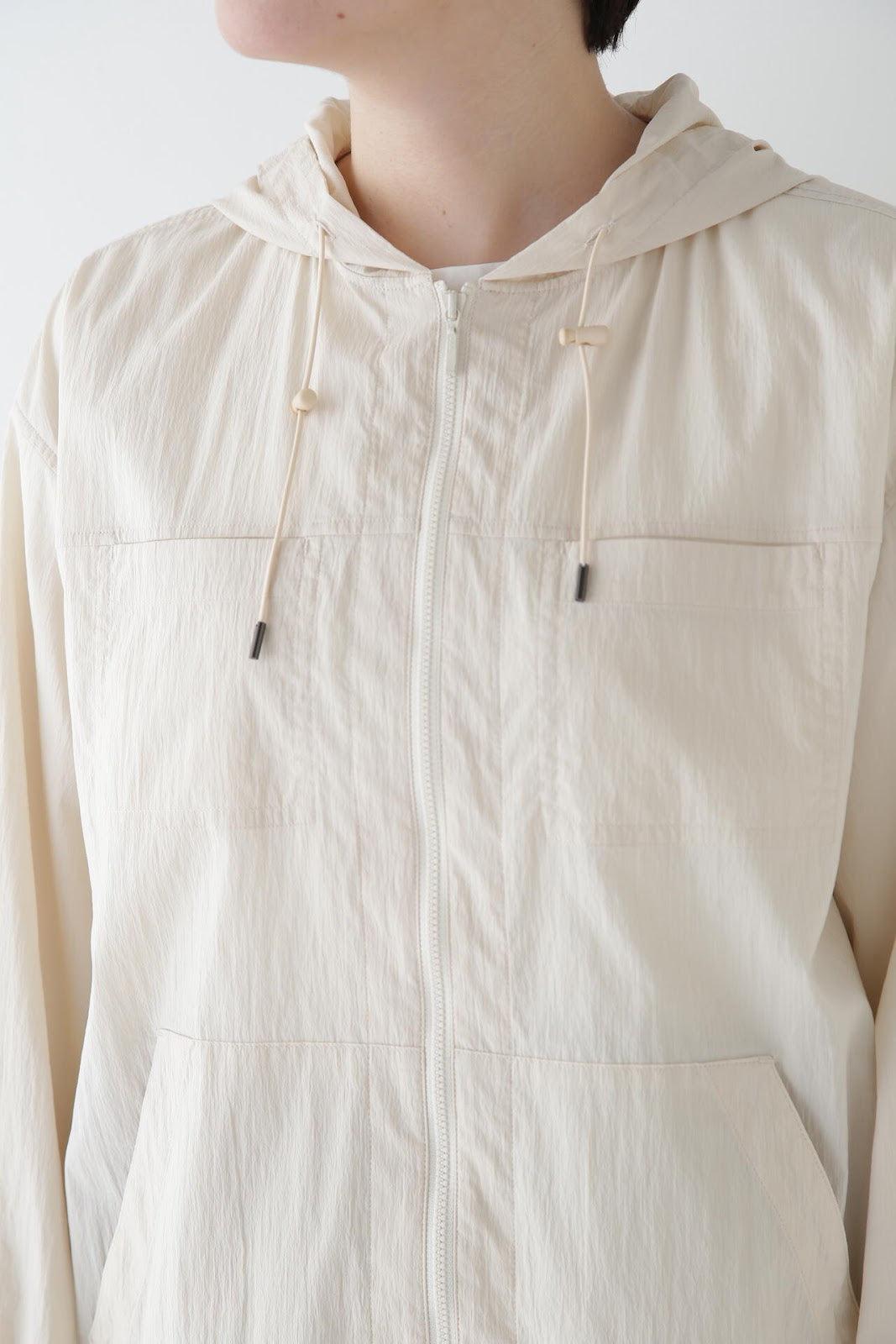 休閒又不失女人味的連帽衫 [設計特色] 薄款連帽衫,帶有揹帶褲細節。通過下襬抽繩,還可以瀏覽穿著。在這種情況下,塞子可以藏在裡面。面料是由棉和尼龍交織而成的透視面料,質感好、涼爽。這款罩衫是一款運動型罩衫,帶有優雅的光澤,成人也能輕鬆穿著。它還可以用作輕便的外衣,防曬效果很好。
