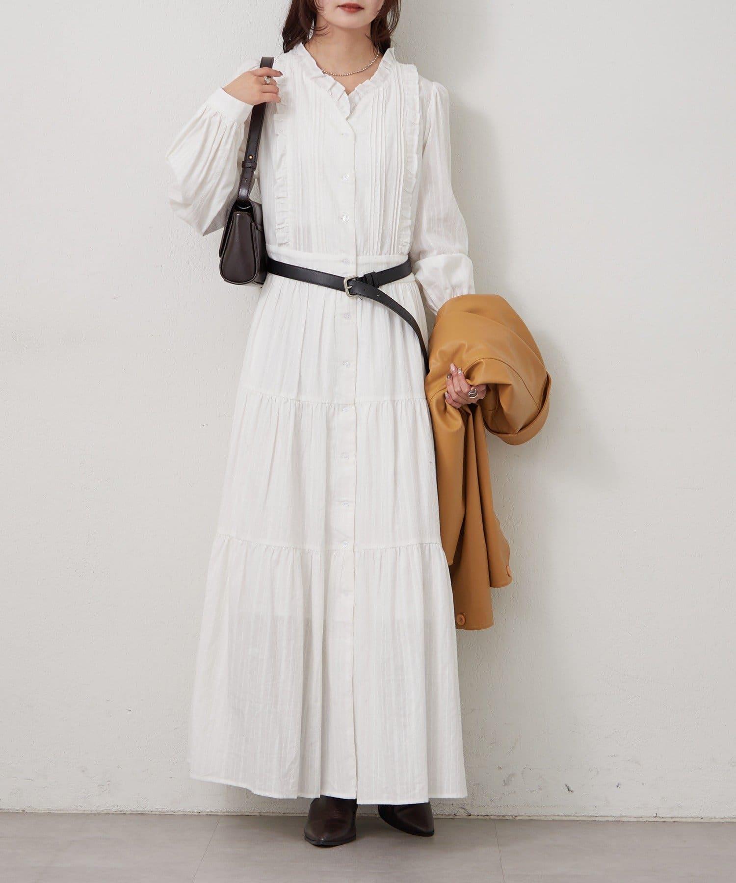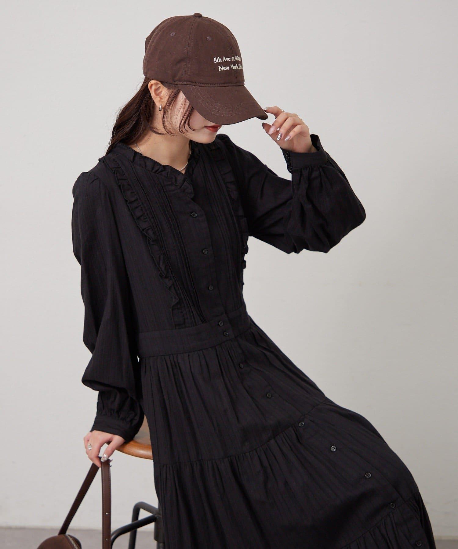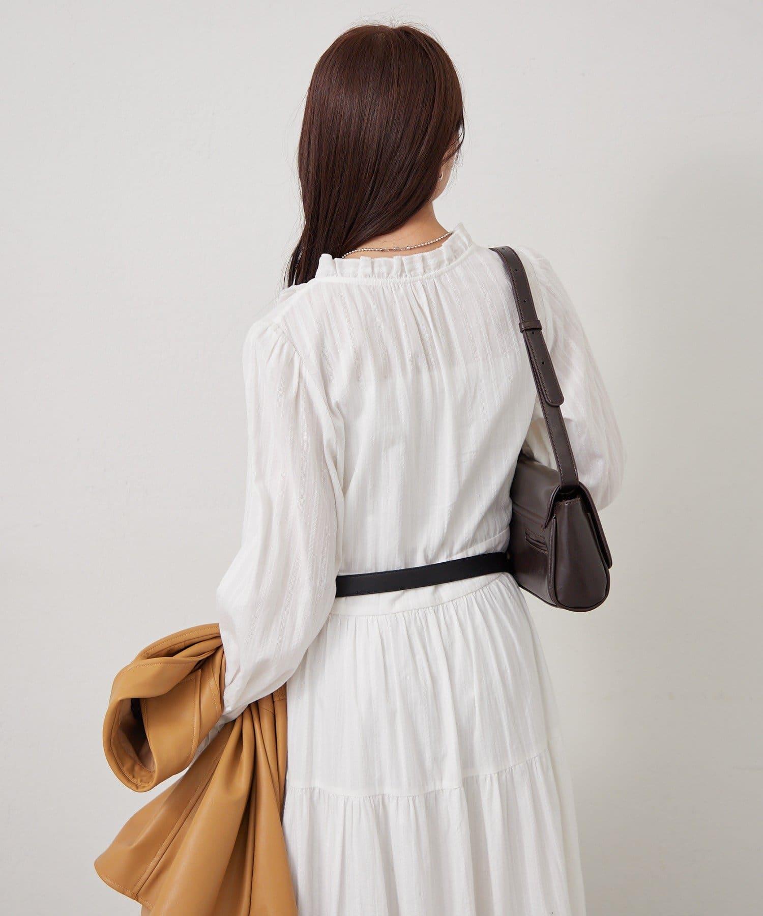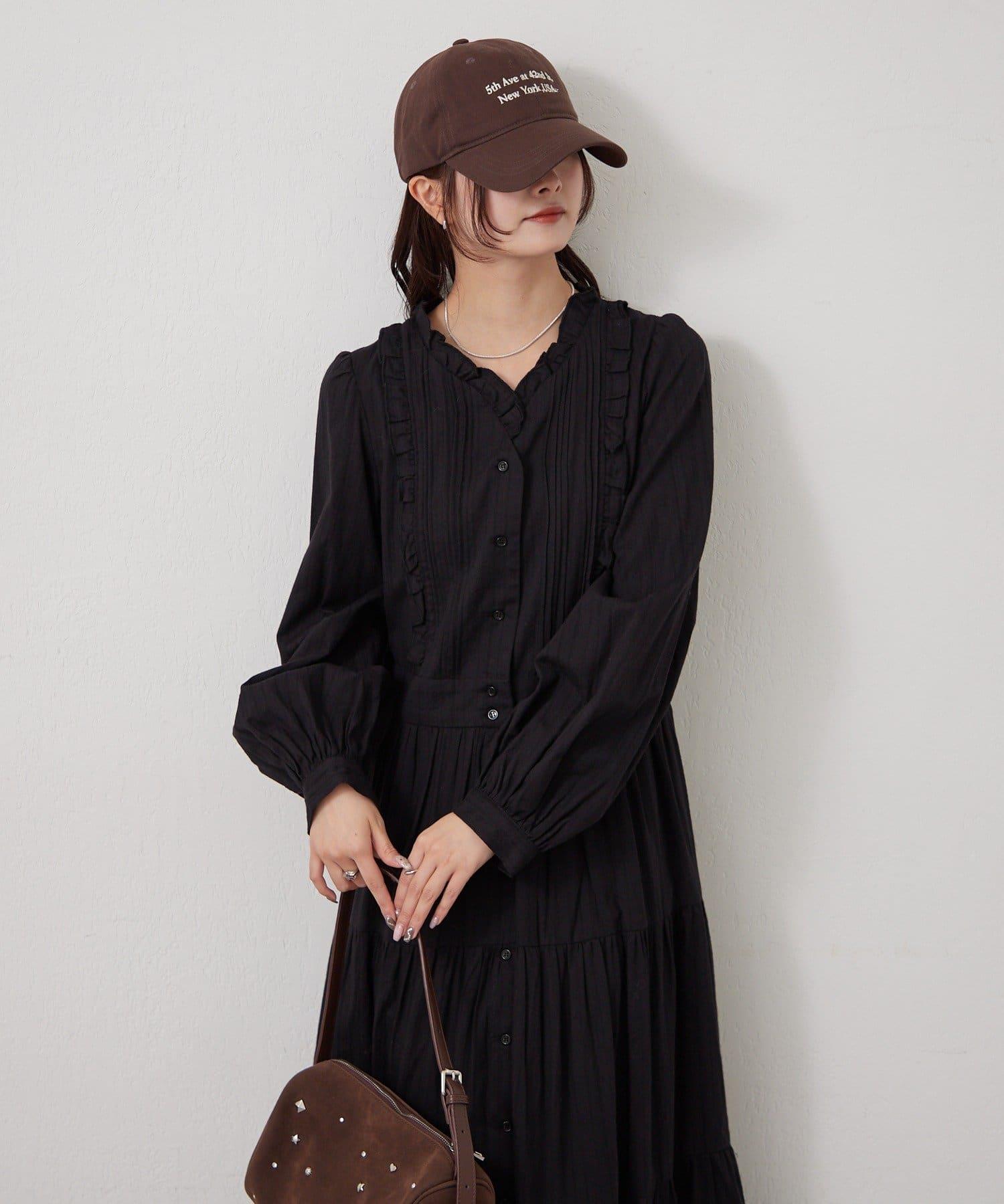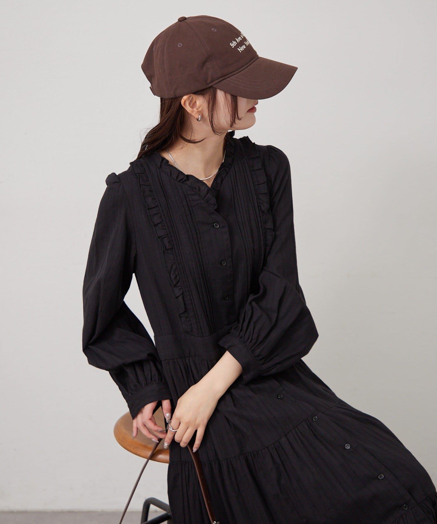 頸部和肩部的荷葉邊為這款連衣裙增添了柔和的色彩,使其看起來更加可愛、成熟。