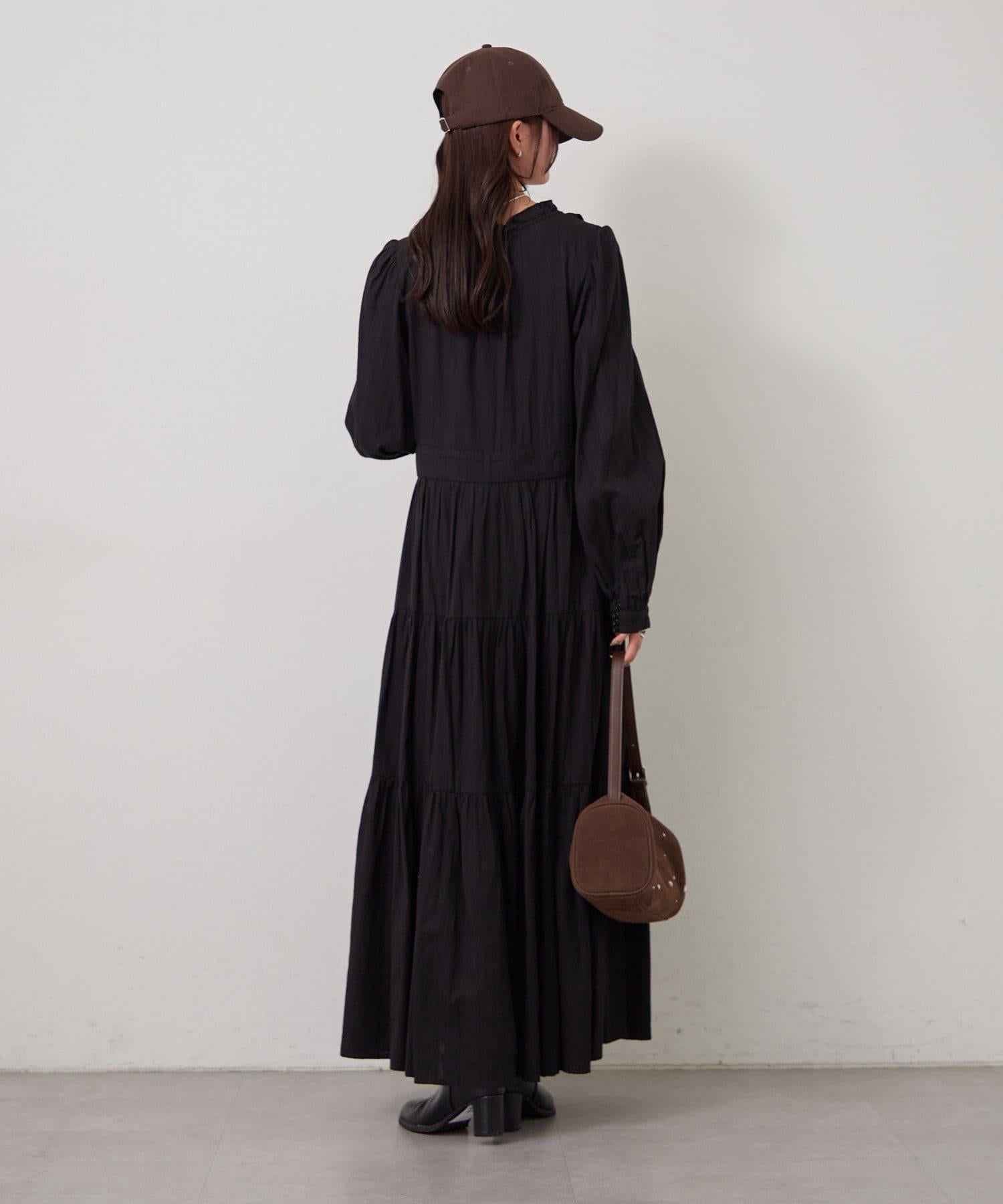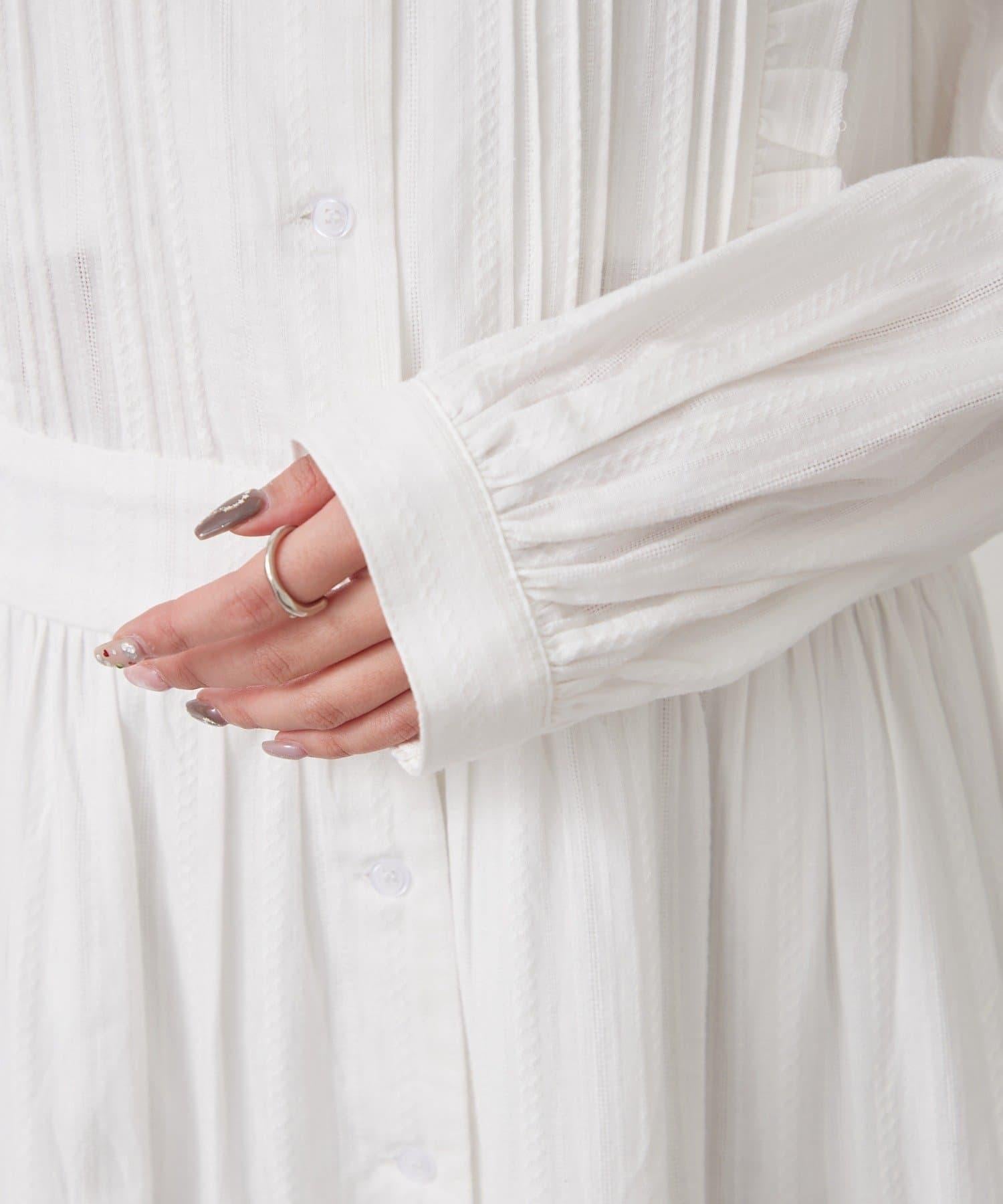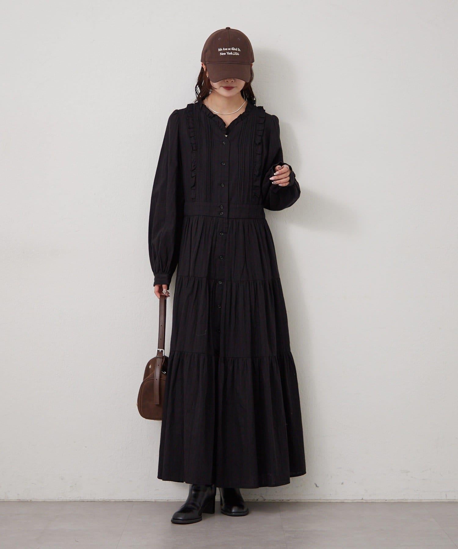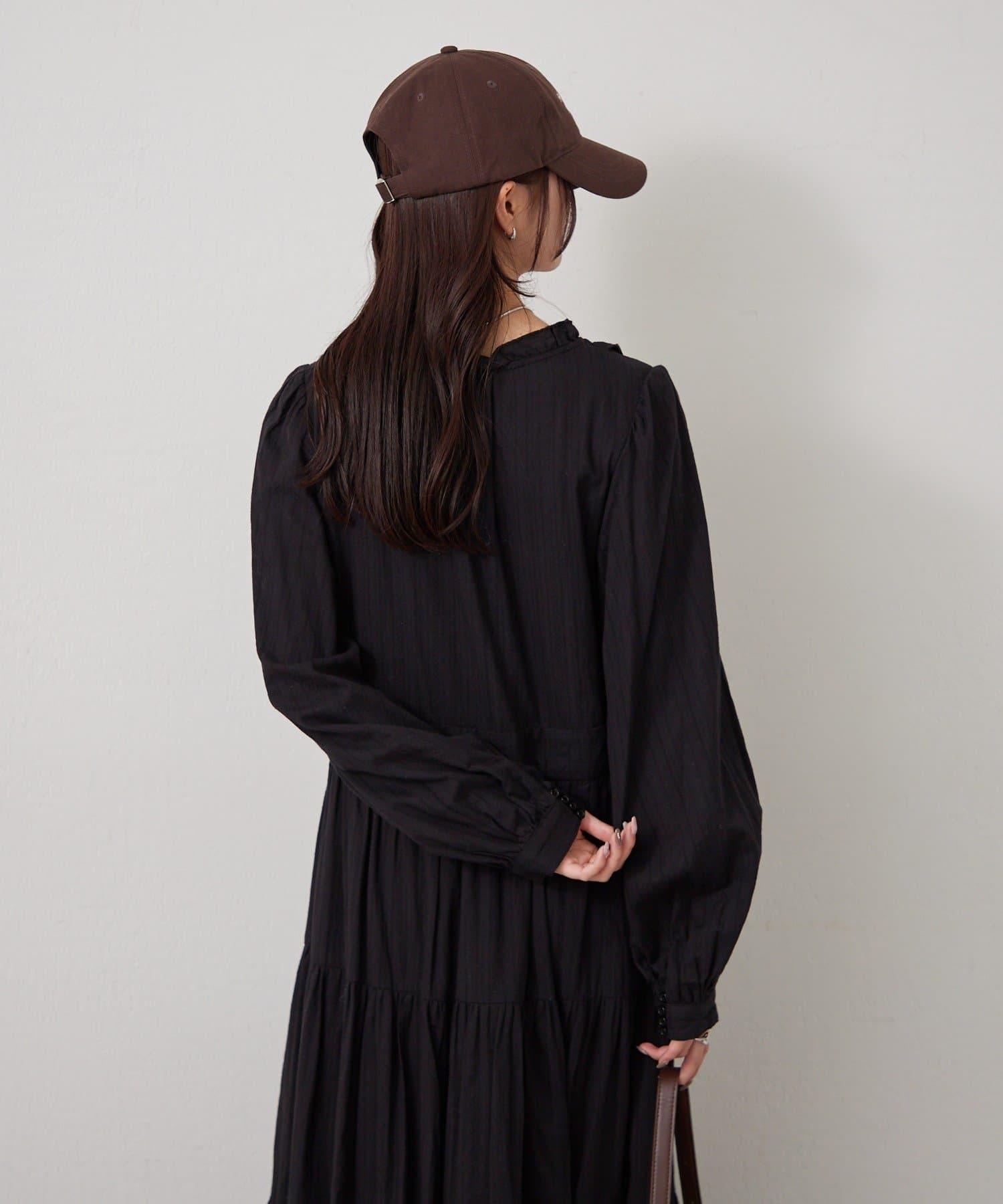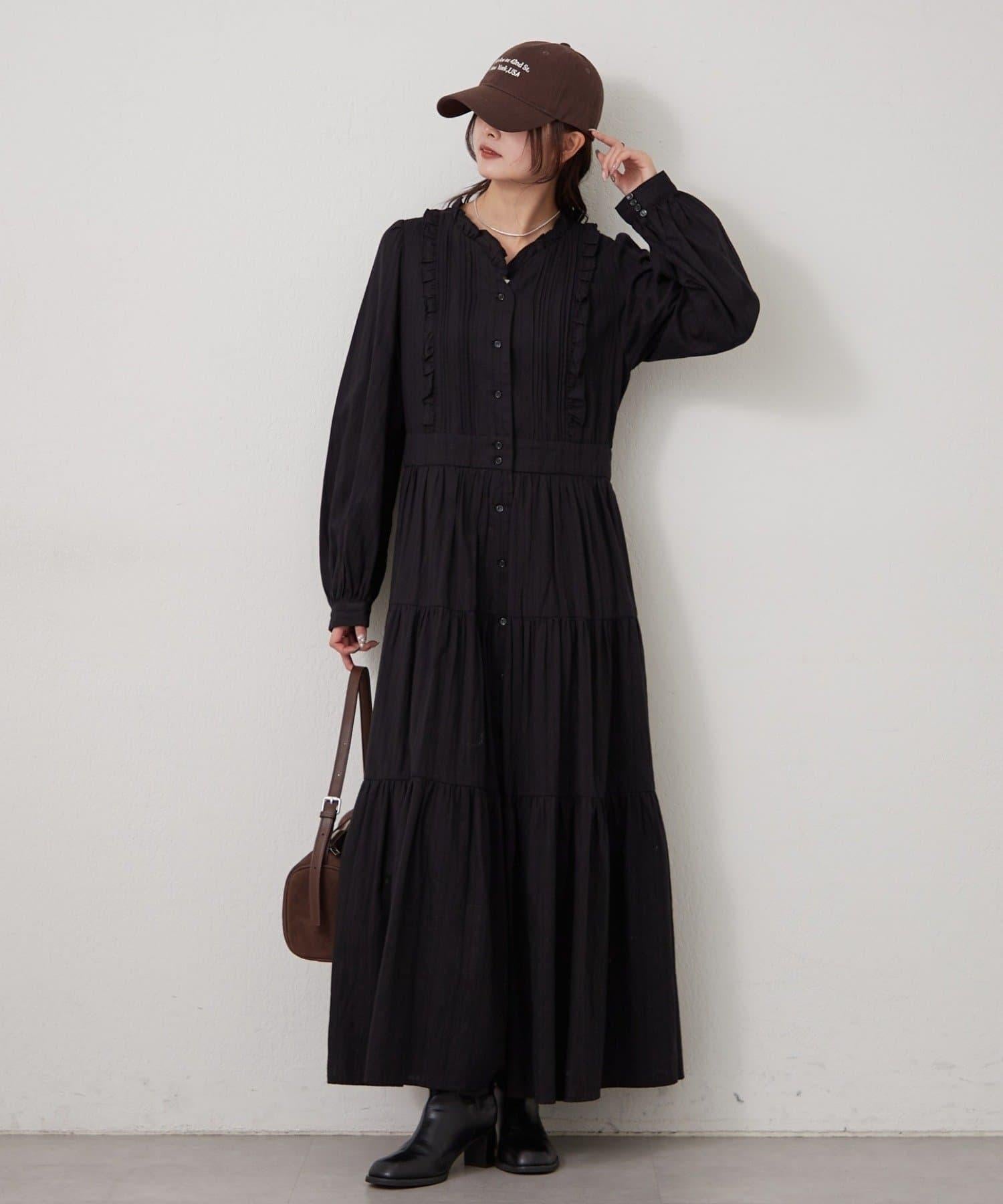 頸部和肩部的荷葉邊為這款連衣裙增添了柔和的色彩,使其看起來更加可愛、成熟。