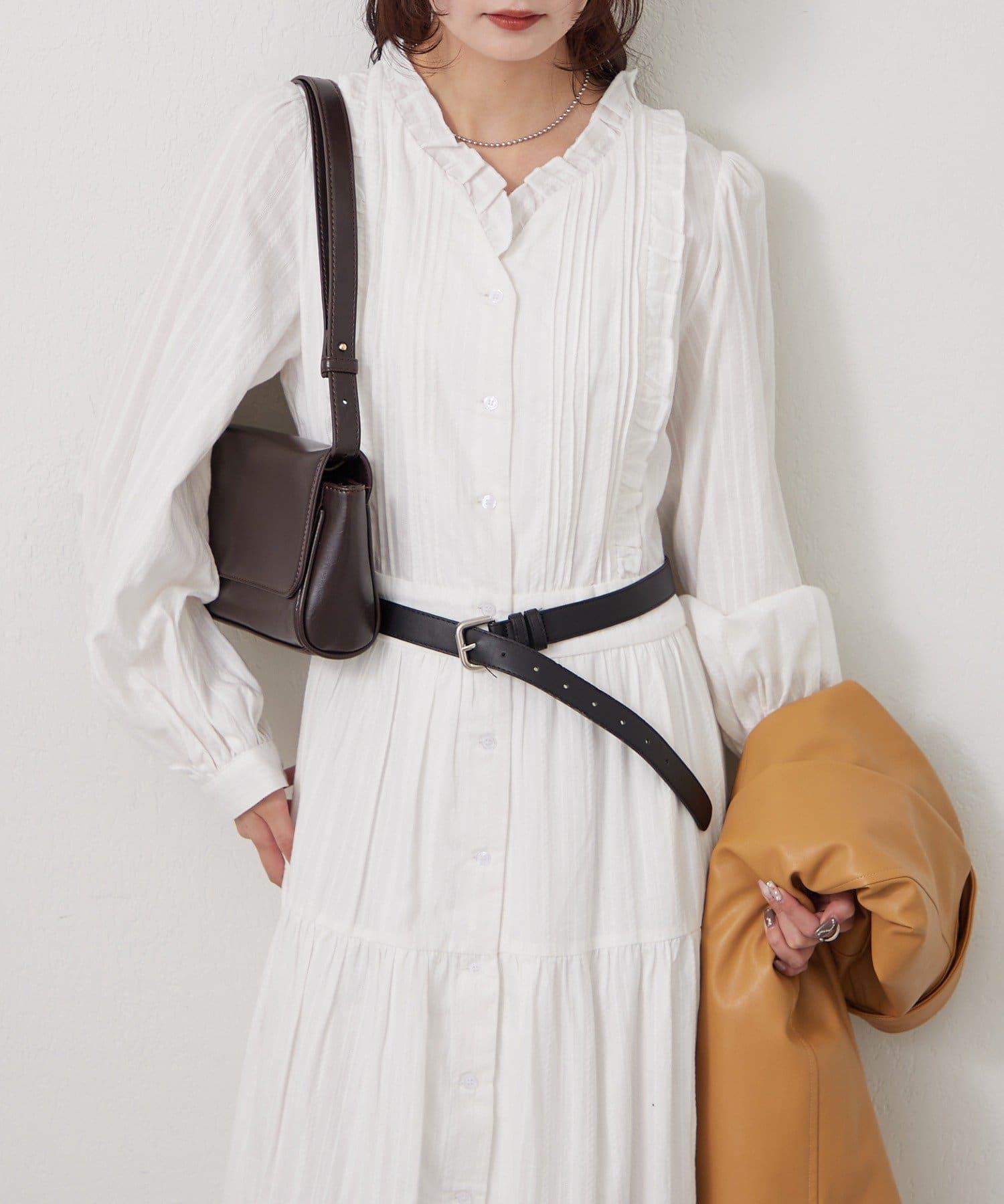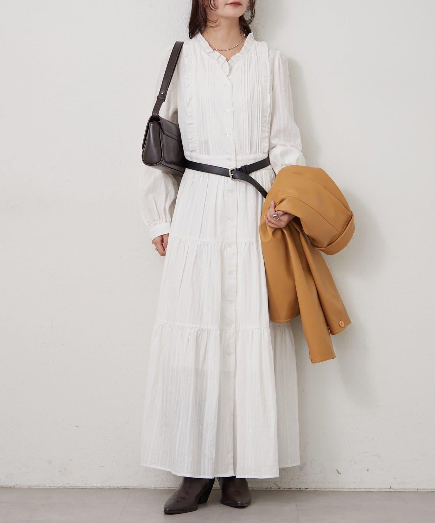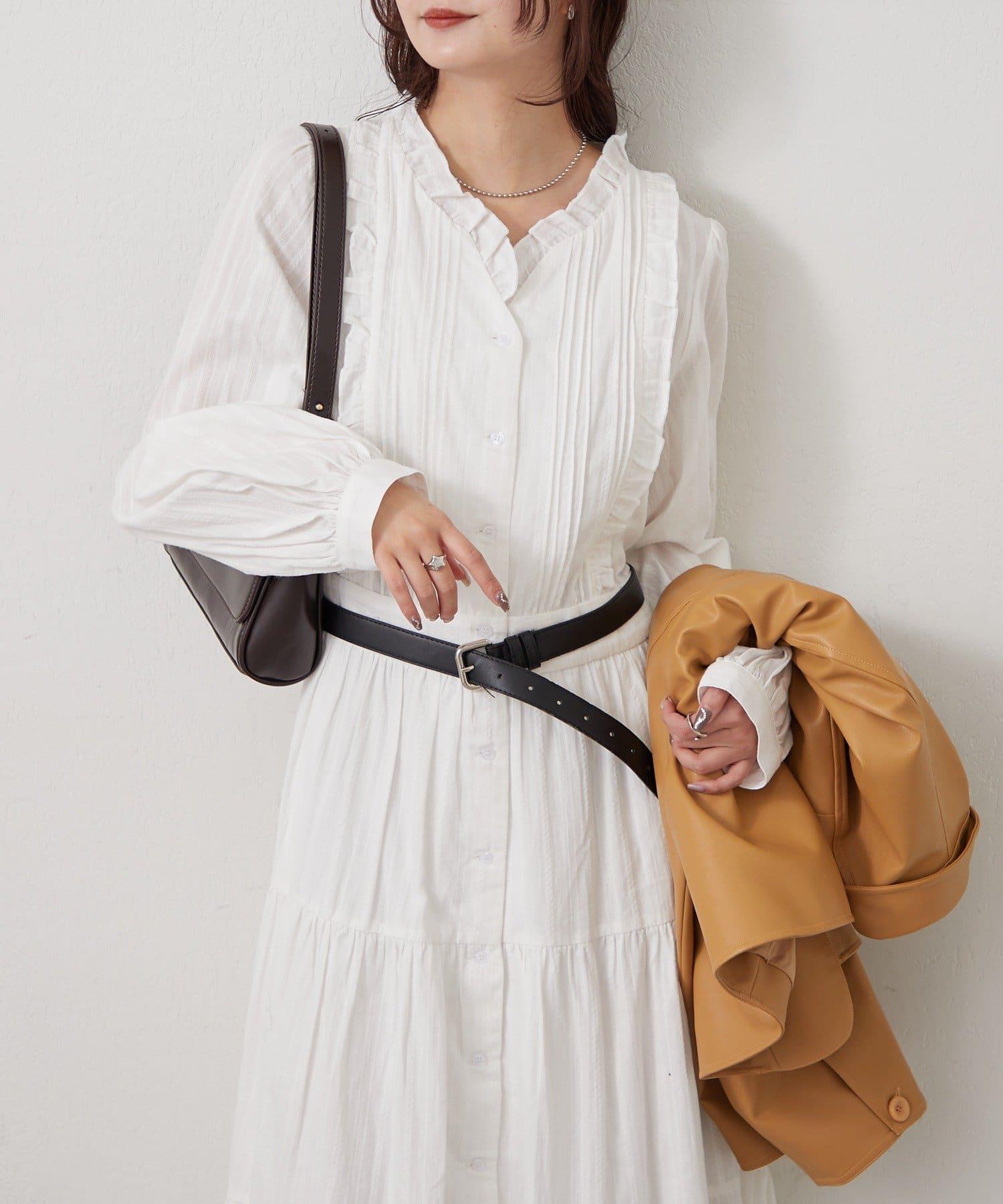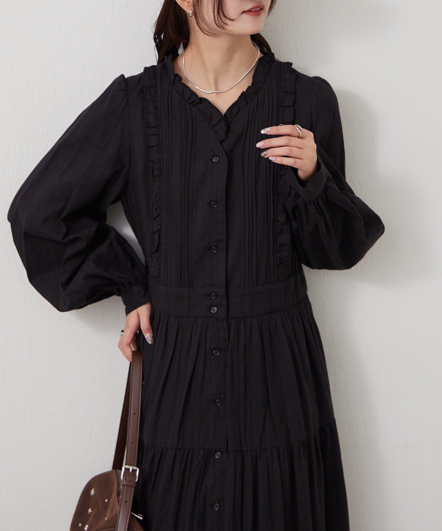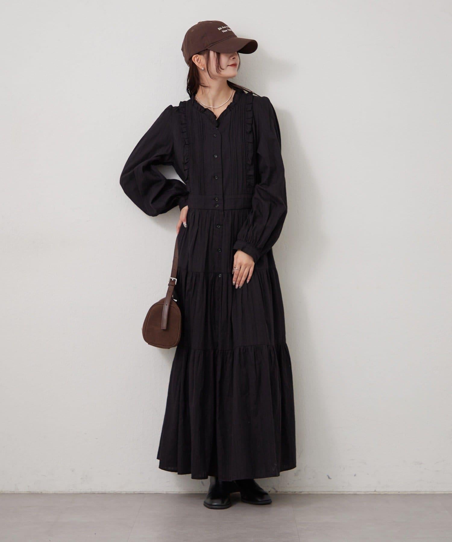 頸部和肩部的荷葉邊為這款連衣裙增添了柔和的色彩,使其看起來更加可愛、成熟。