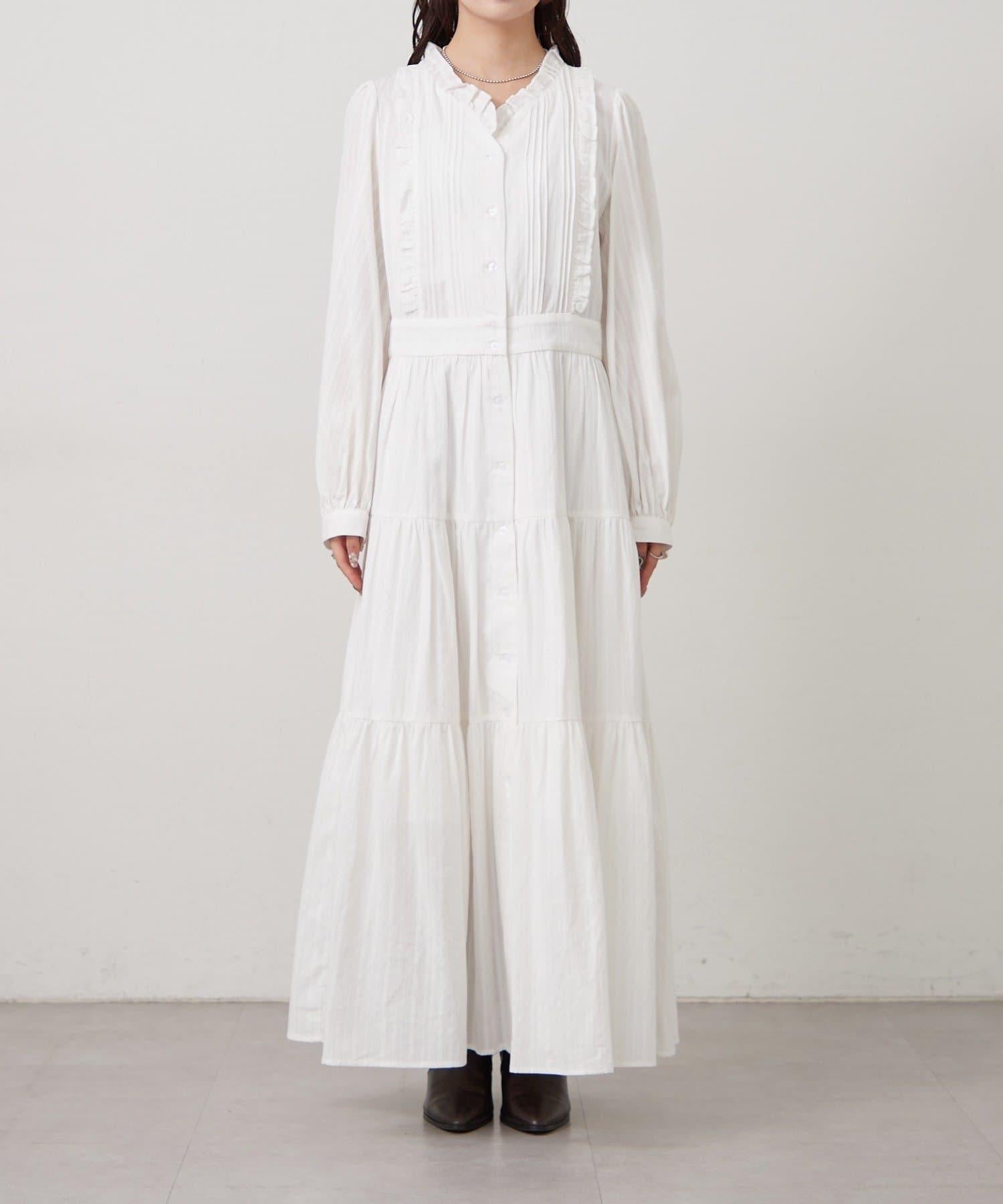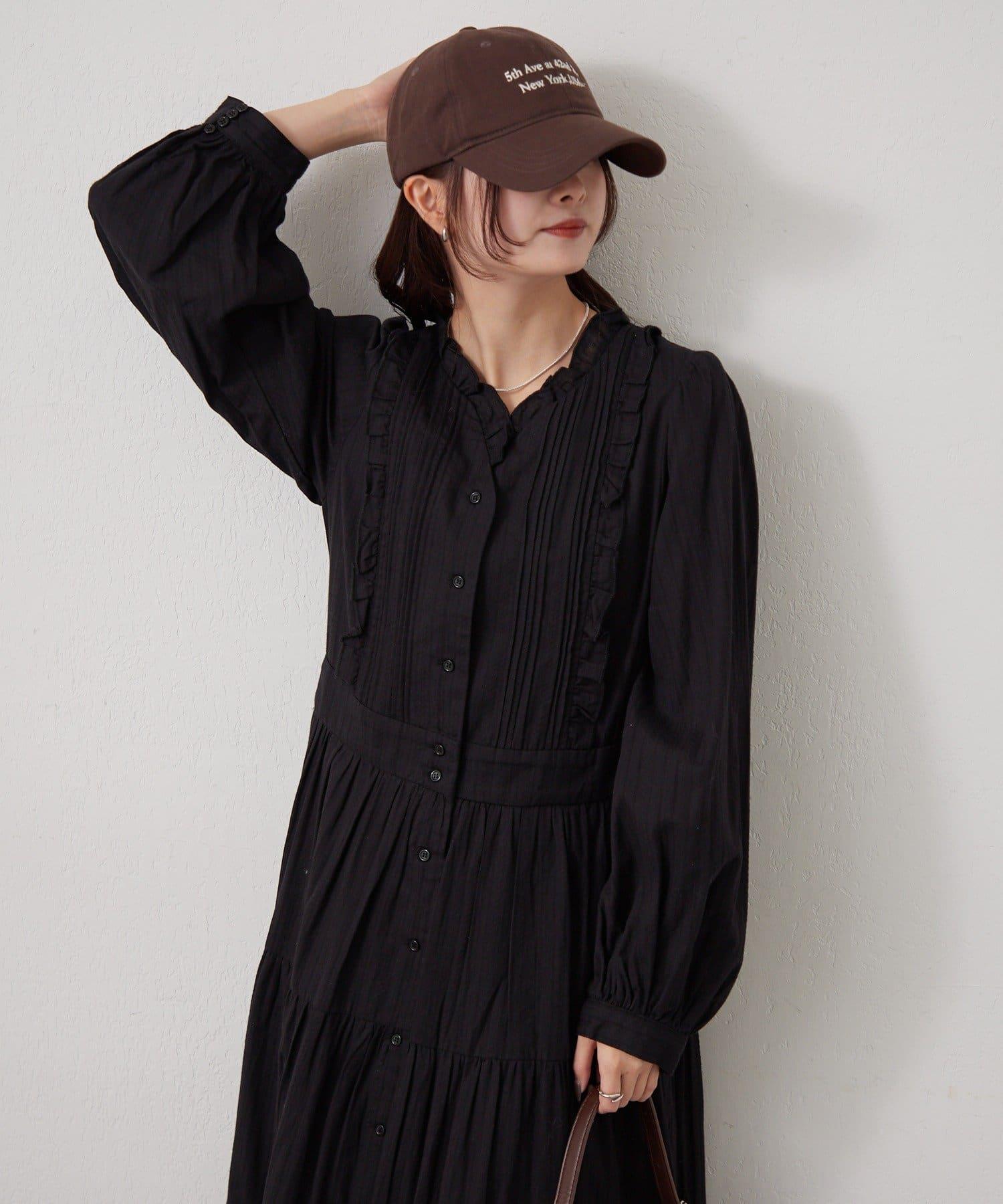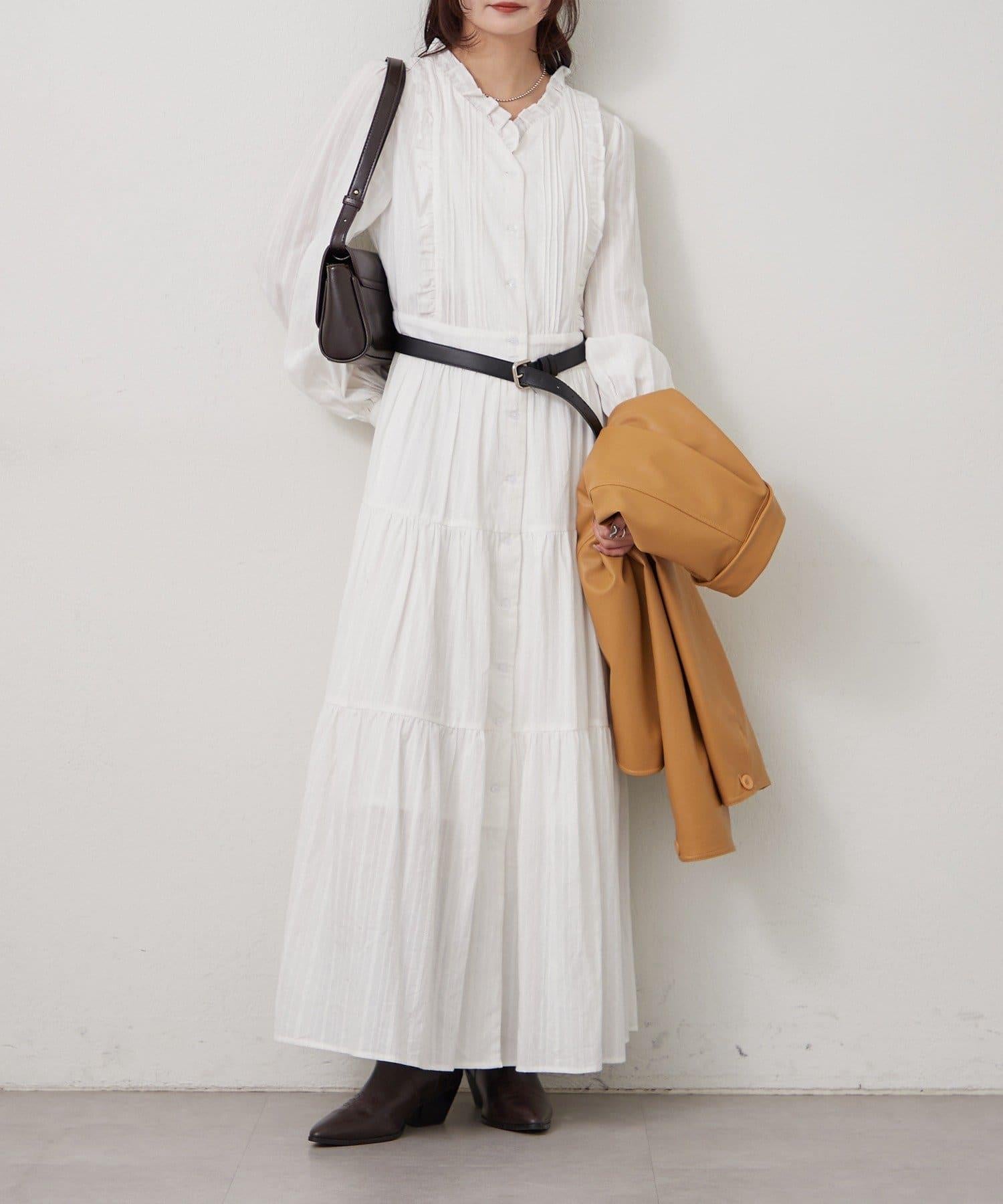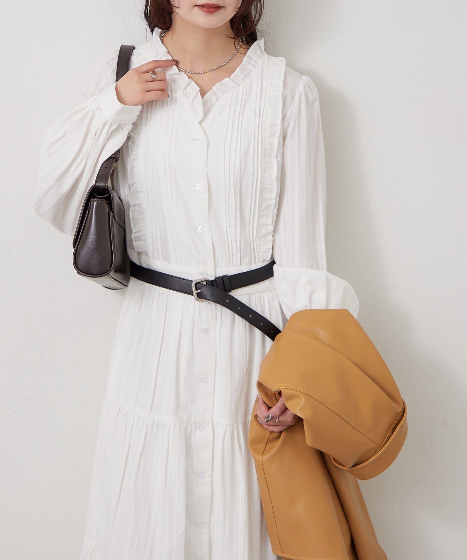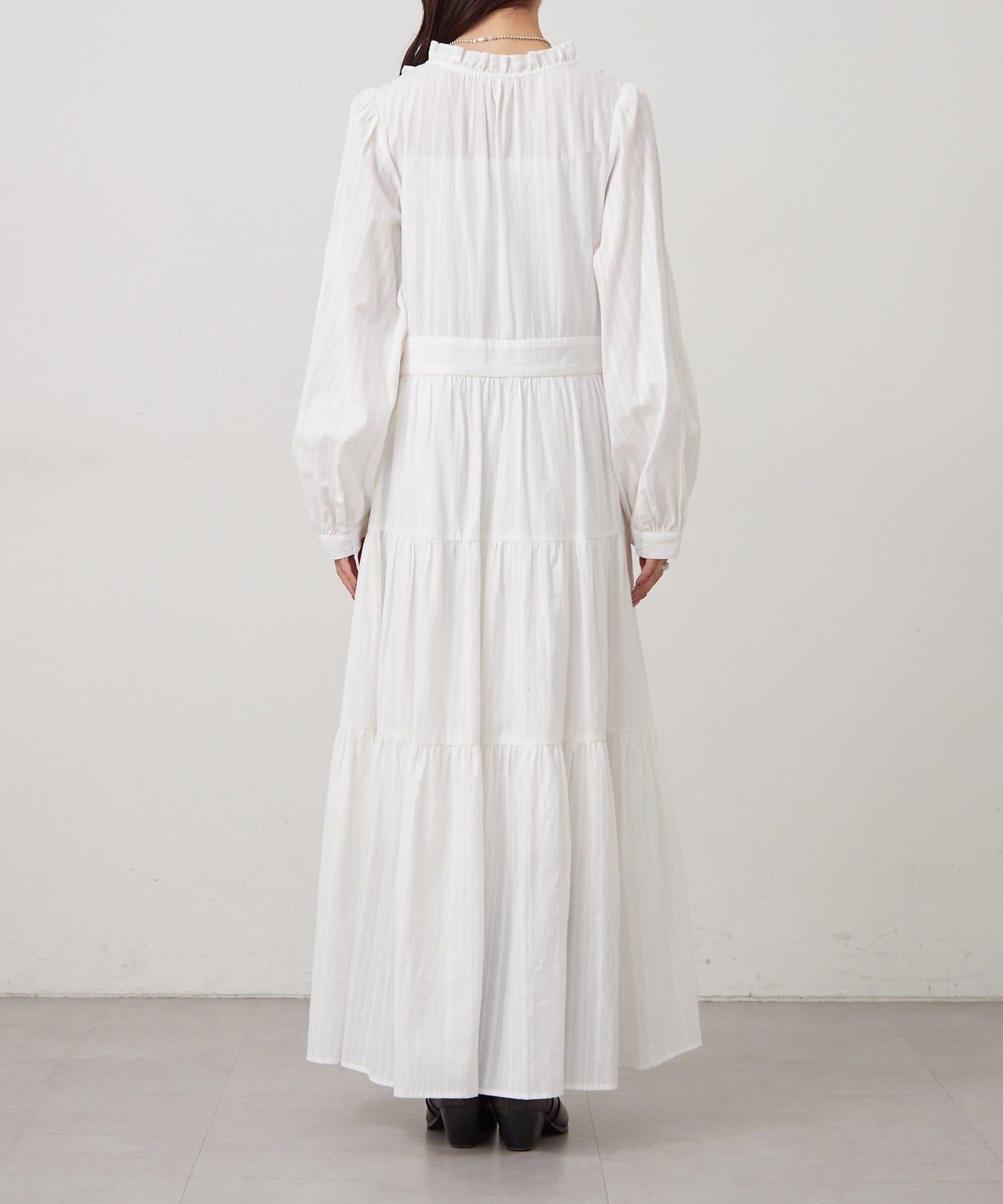 頸部和肩部的荷葉邊為這款連衣裙增添了柔和的色彩,使其看起來更加可愛、成熟。