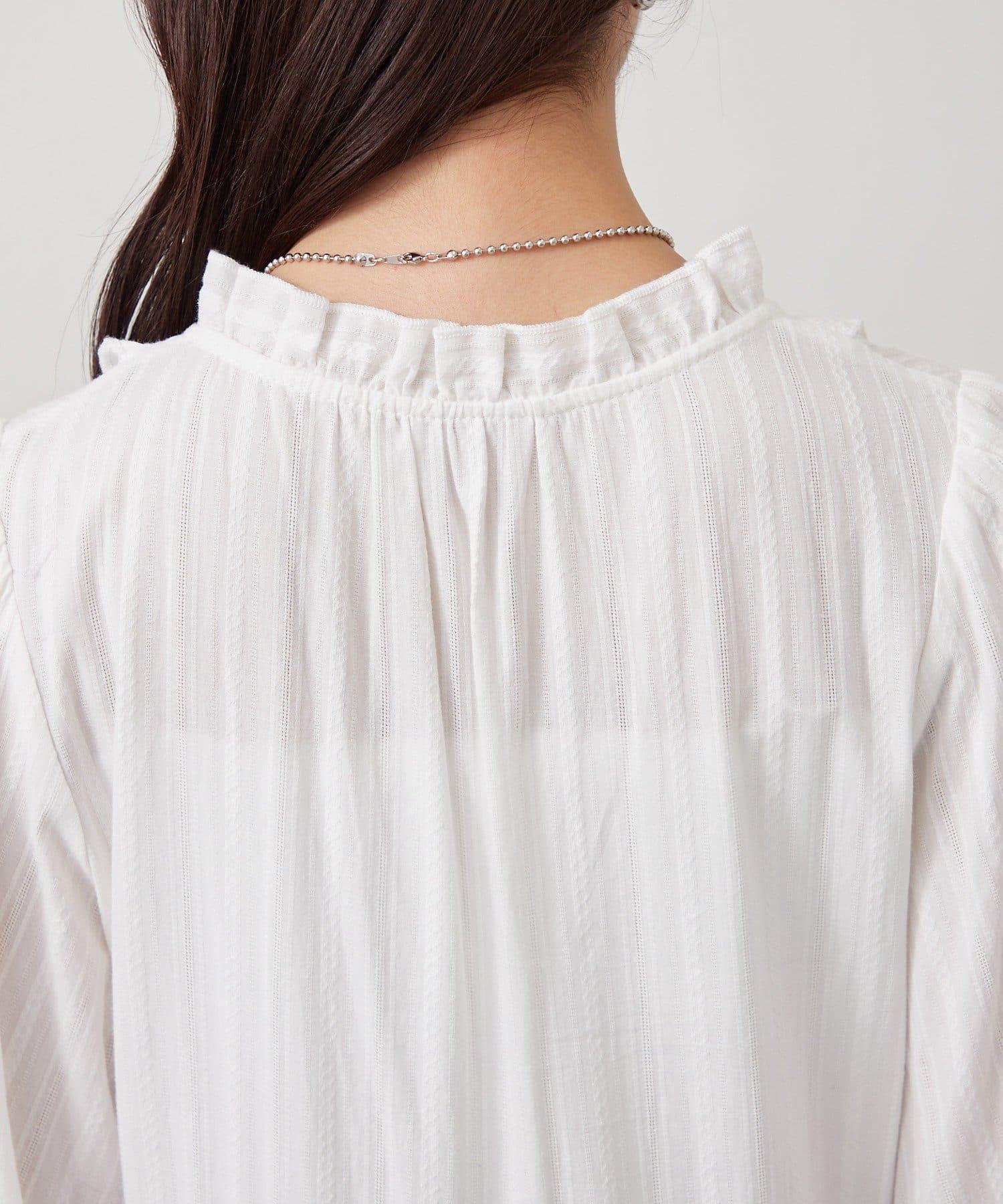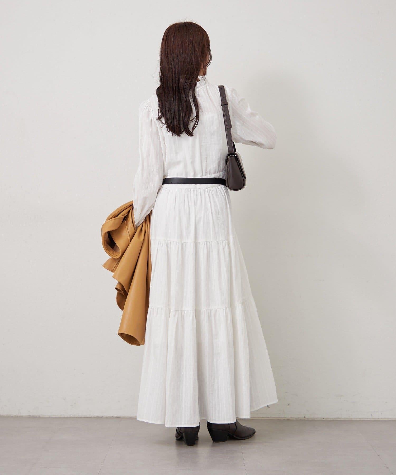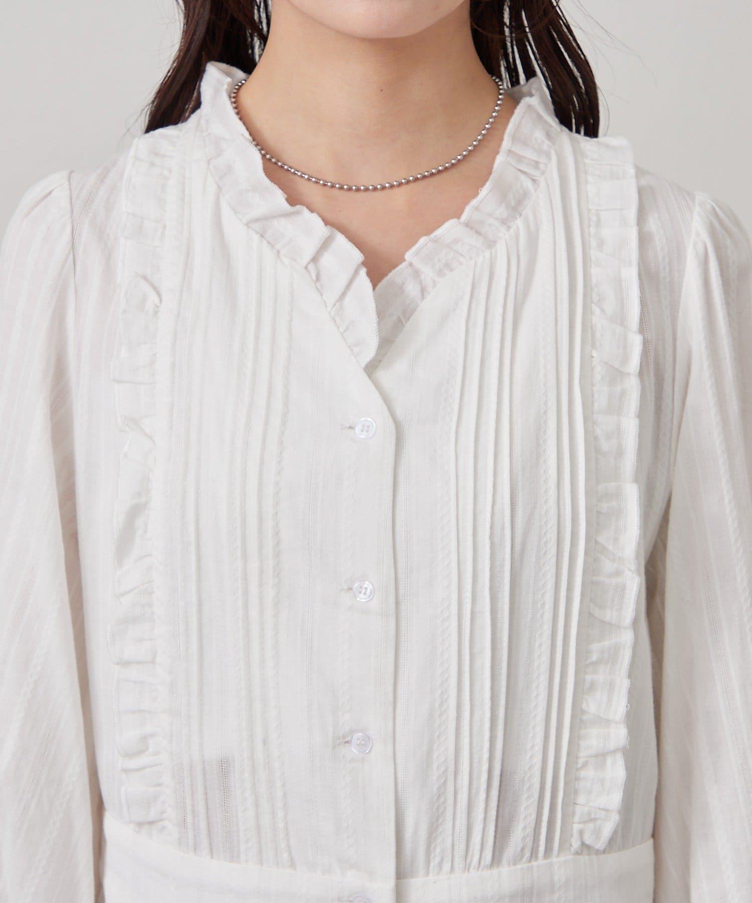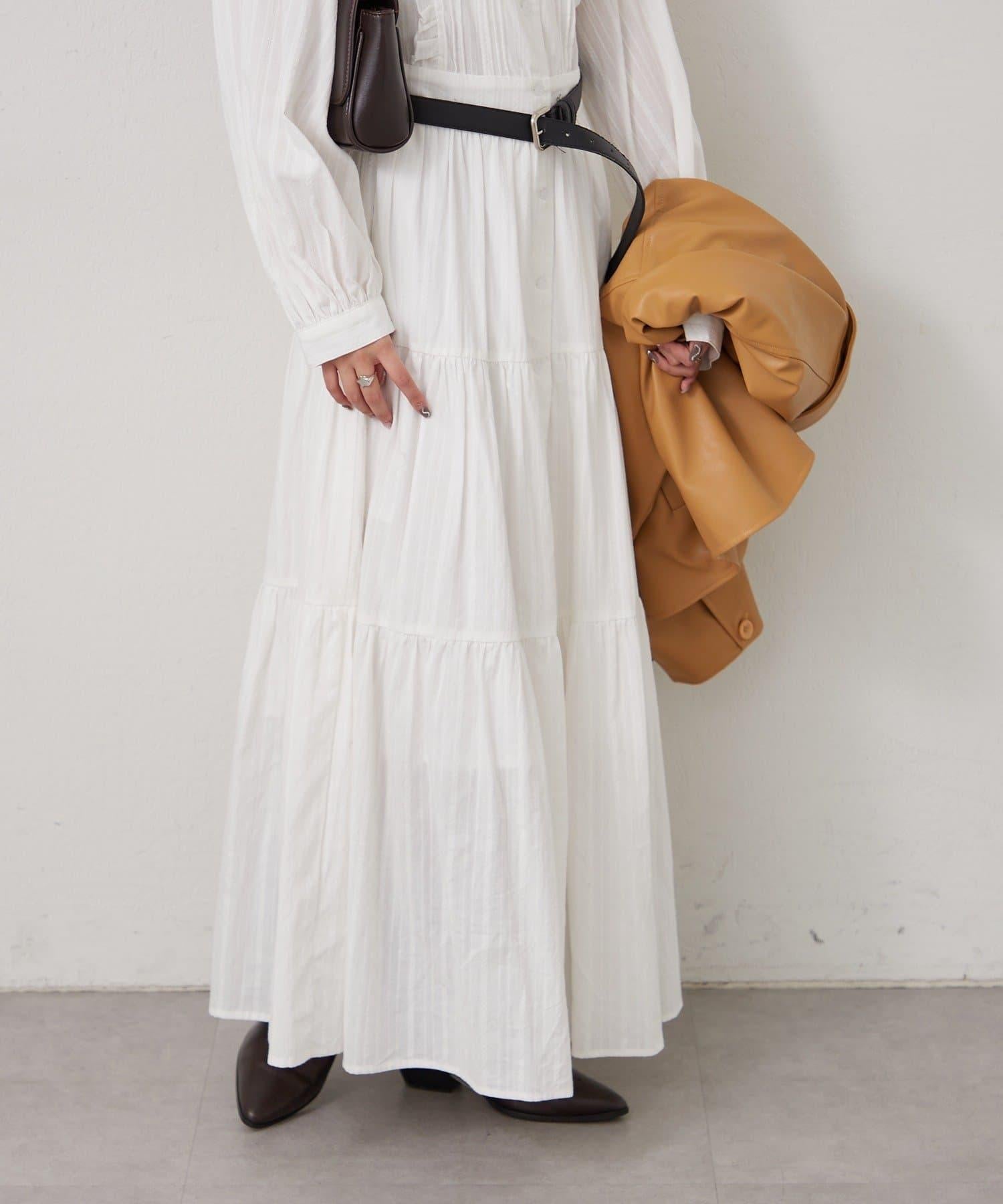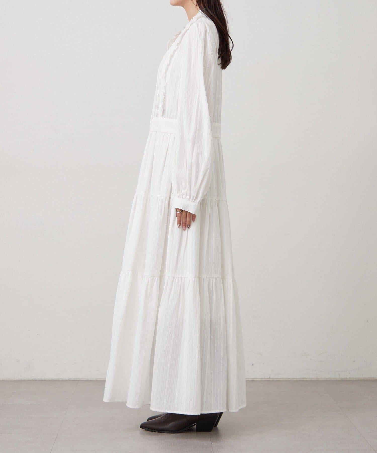 頸部和肩部的荷葉邊為這款連衣裙增添了柔和的色彩,使其看起來更加可愛、成熟。