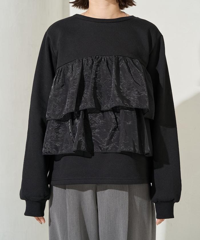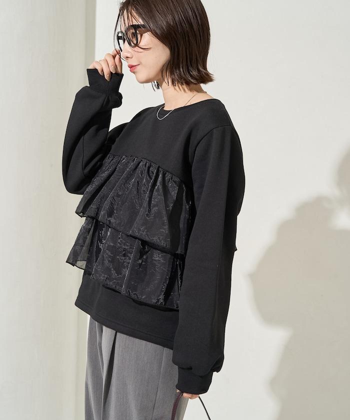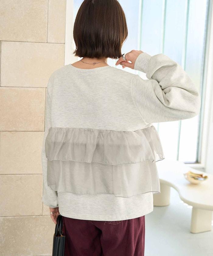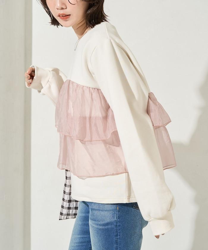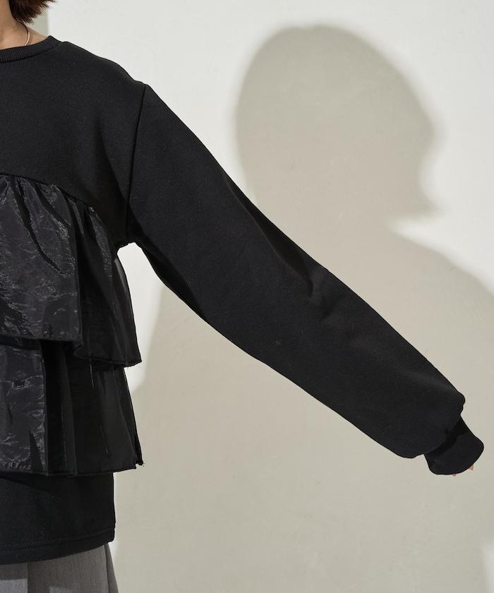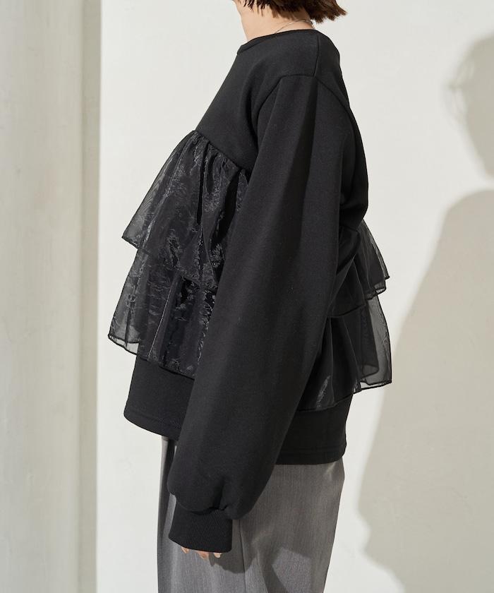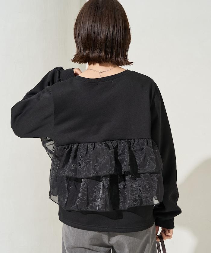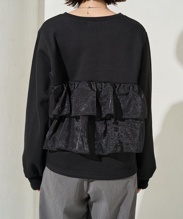 歐根紗拼接荷葉邊加絨衛衣套頭衫