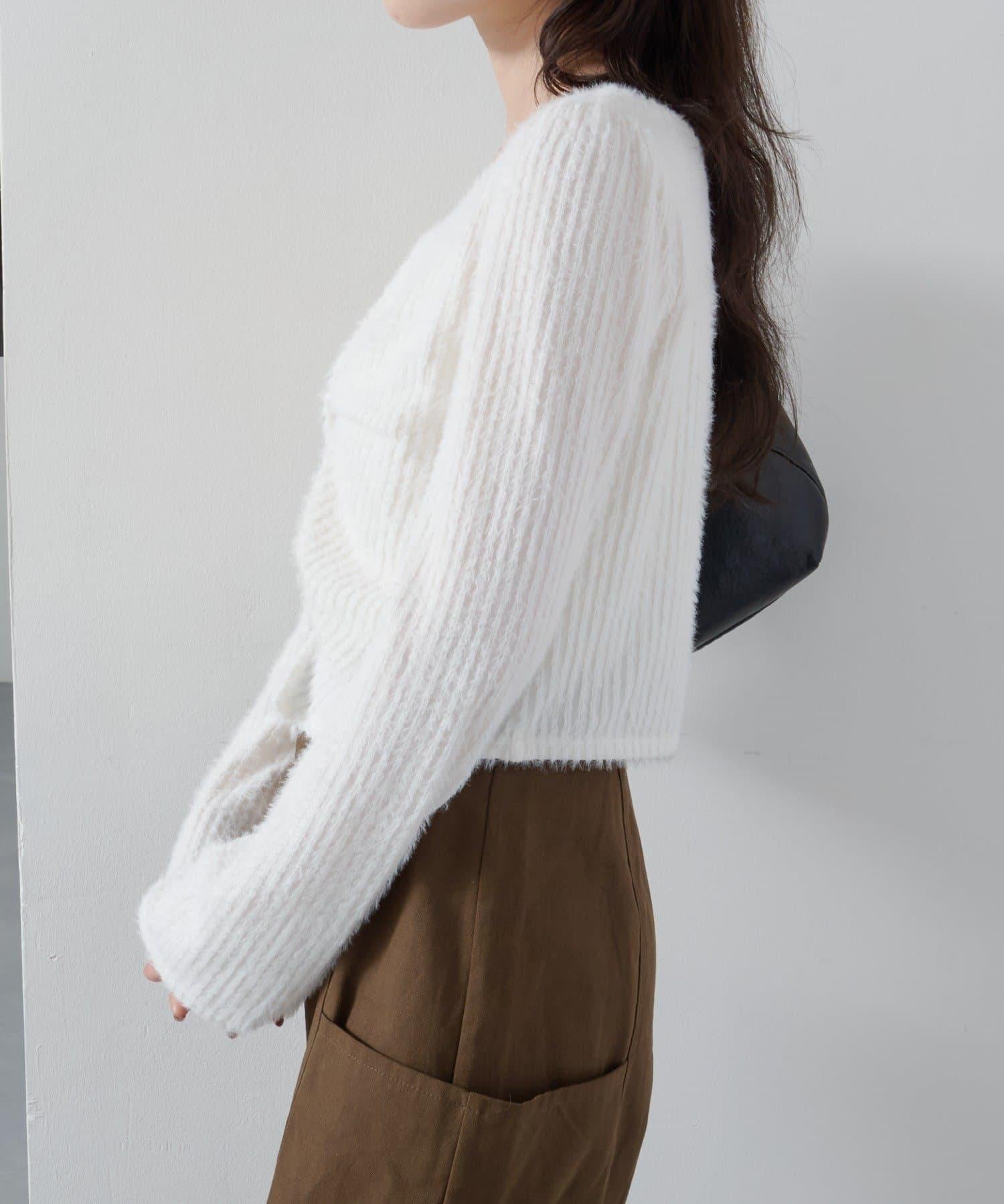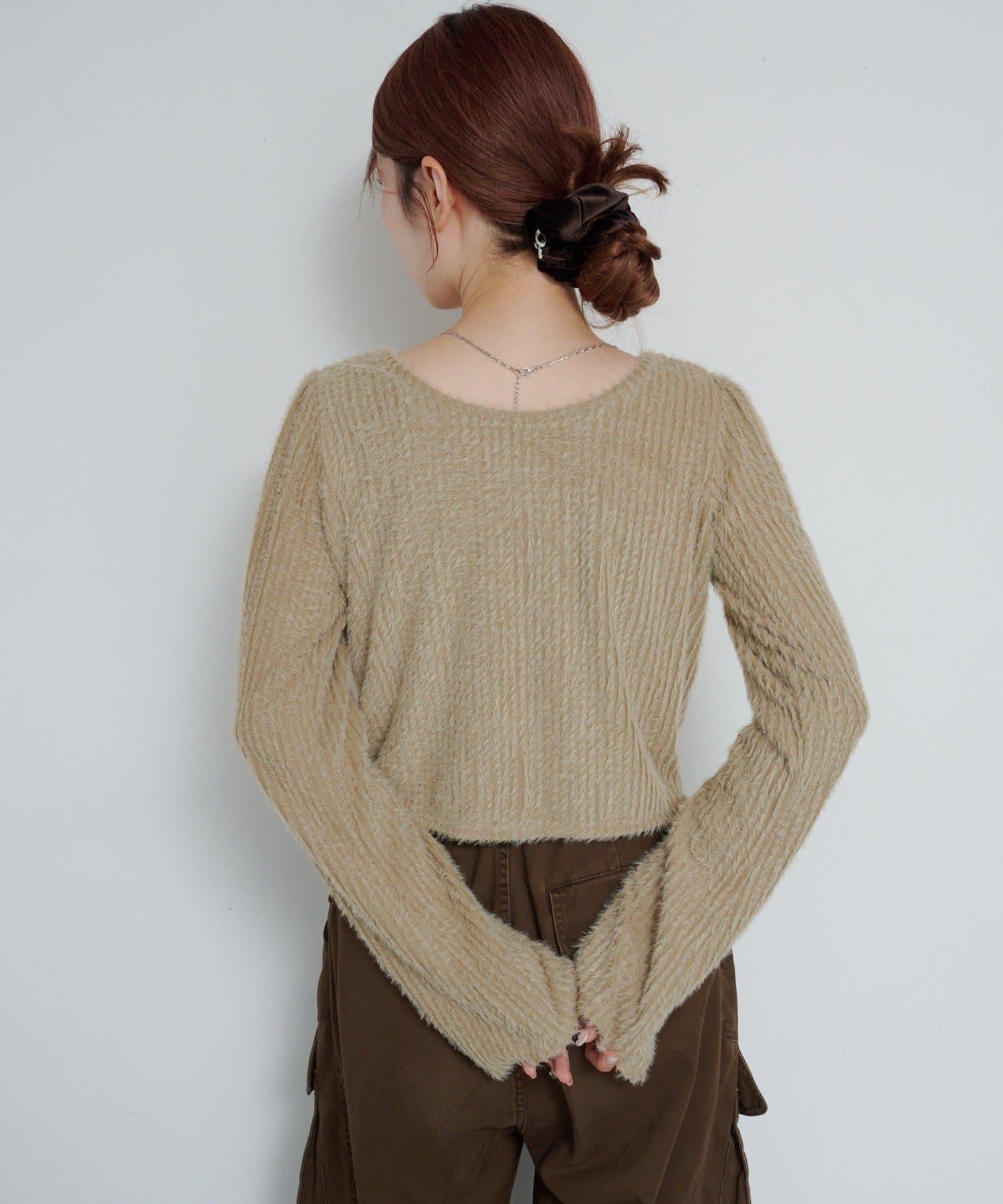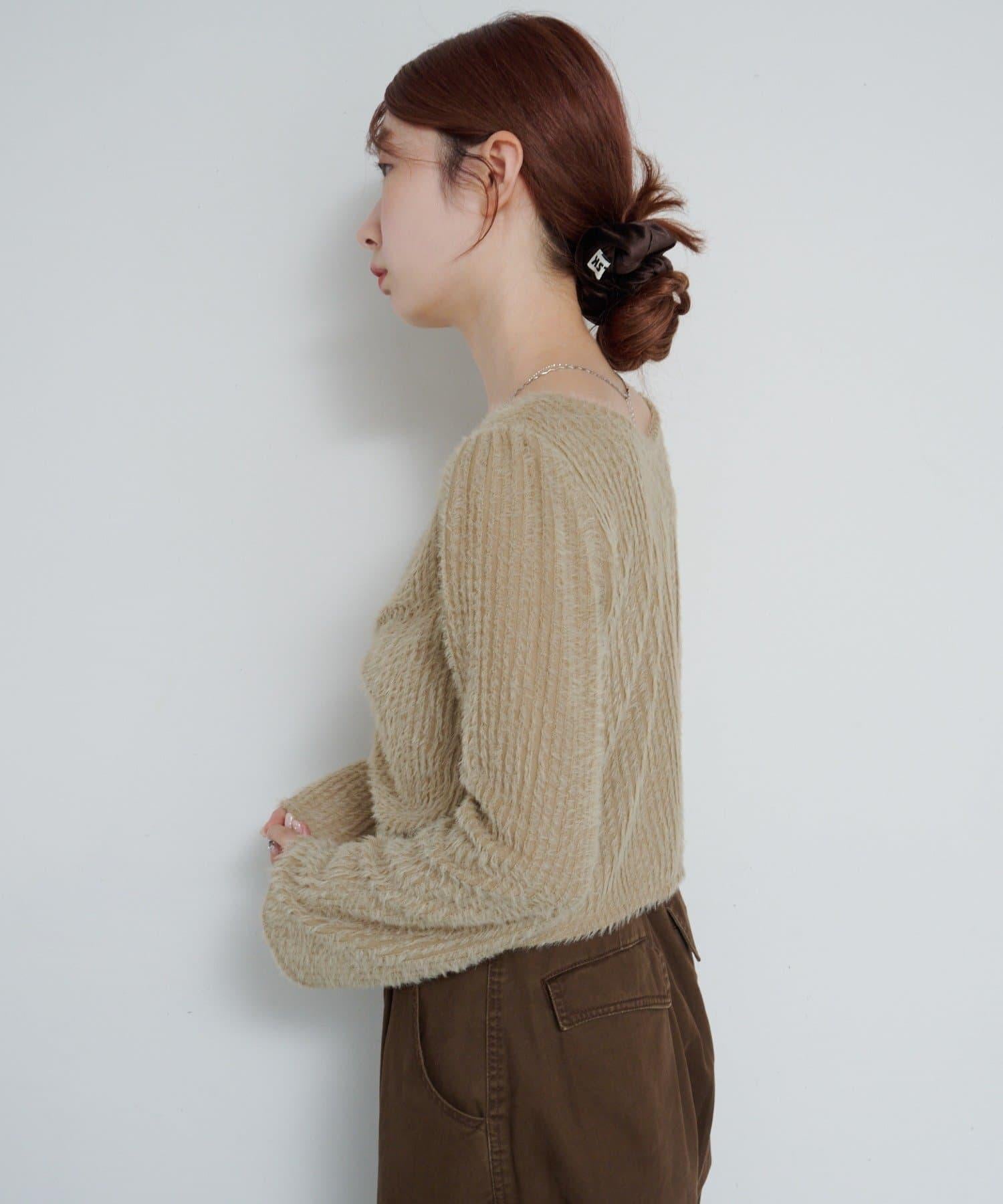這款扭結設計套頭衫採用蓬鬆的絨毛面料,增強了季節感。