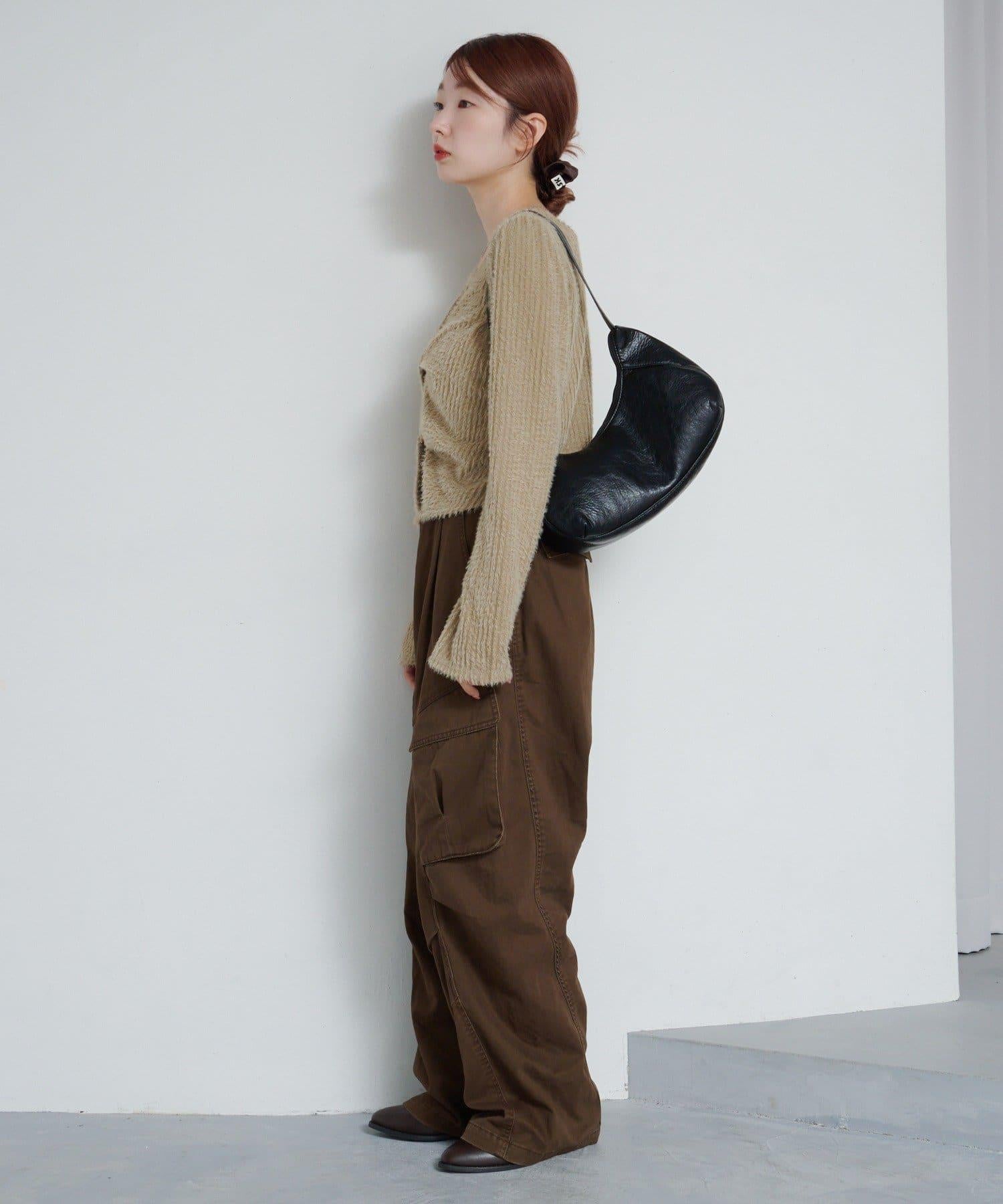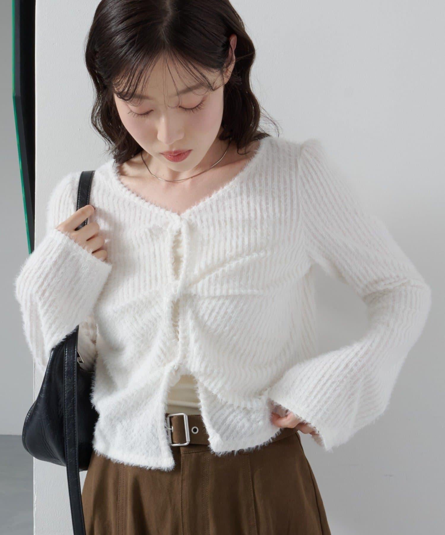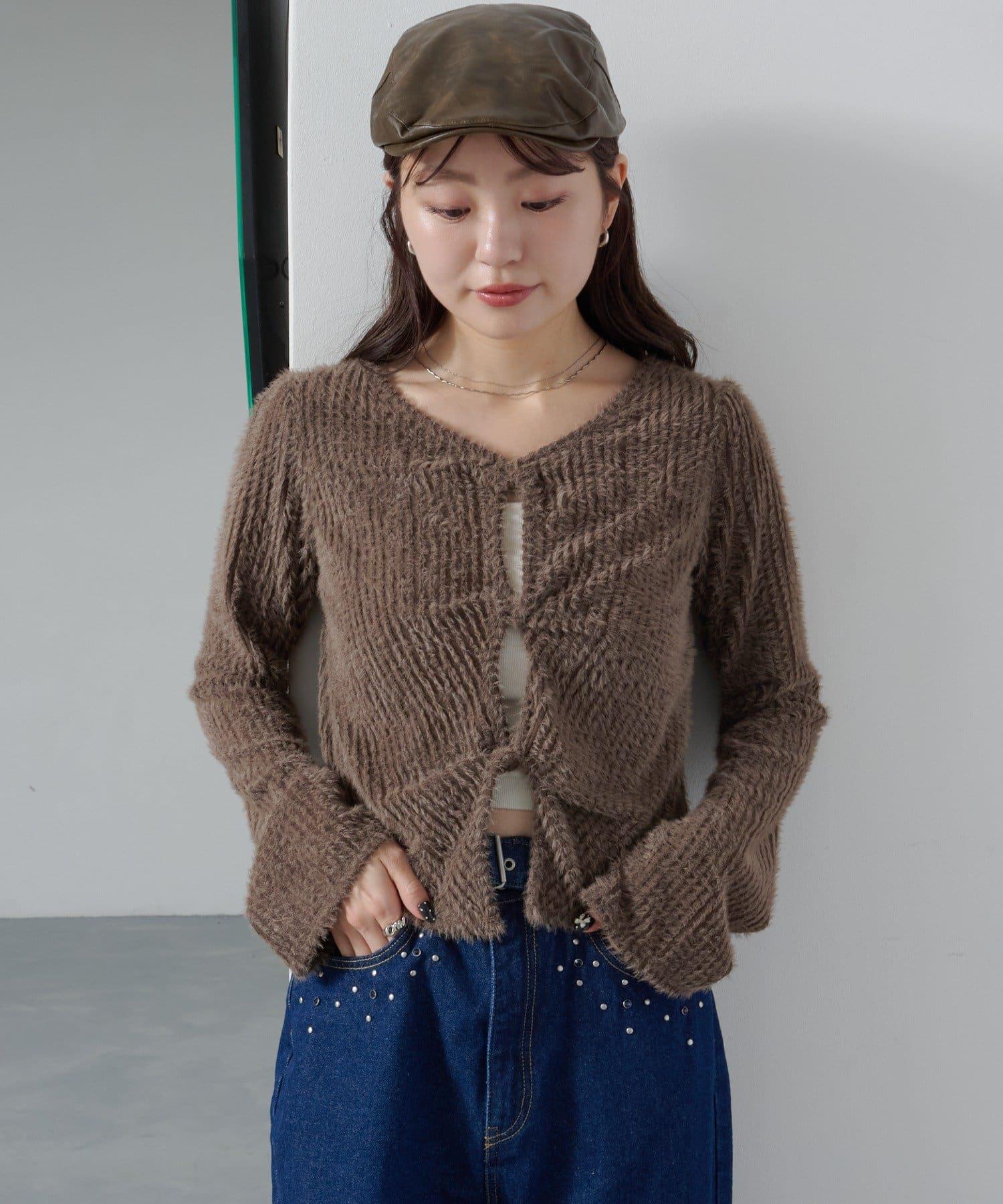 這款扭結設計套頭衫採用蓬鬆的絨毛面料,增強了季節感。