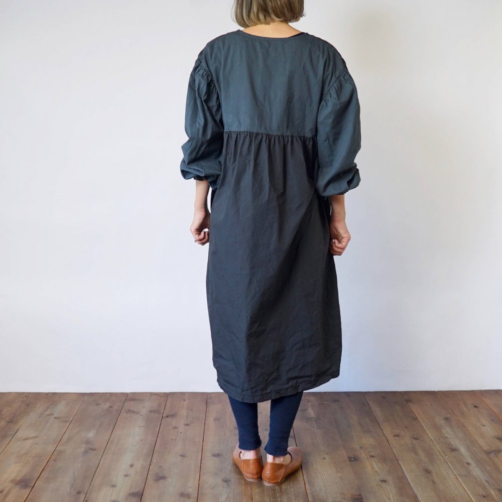 氣球袖聚攏拼接連衣裙/黑色/三河織物