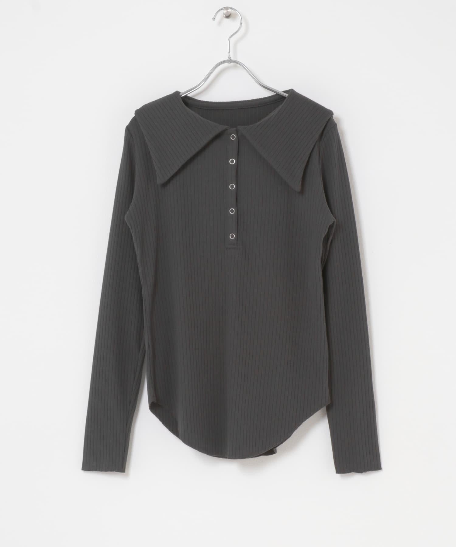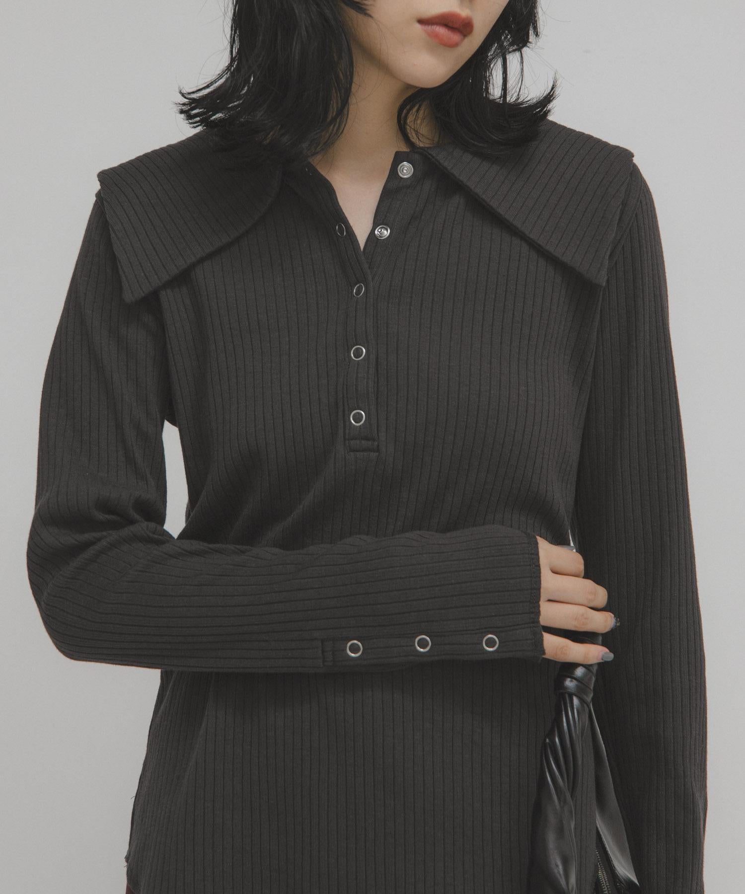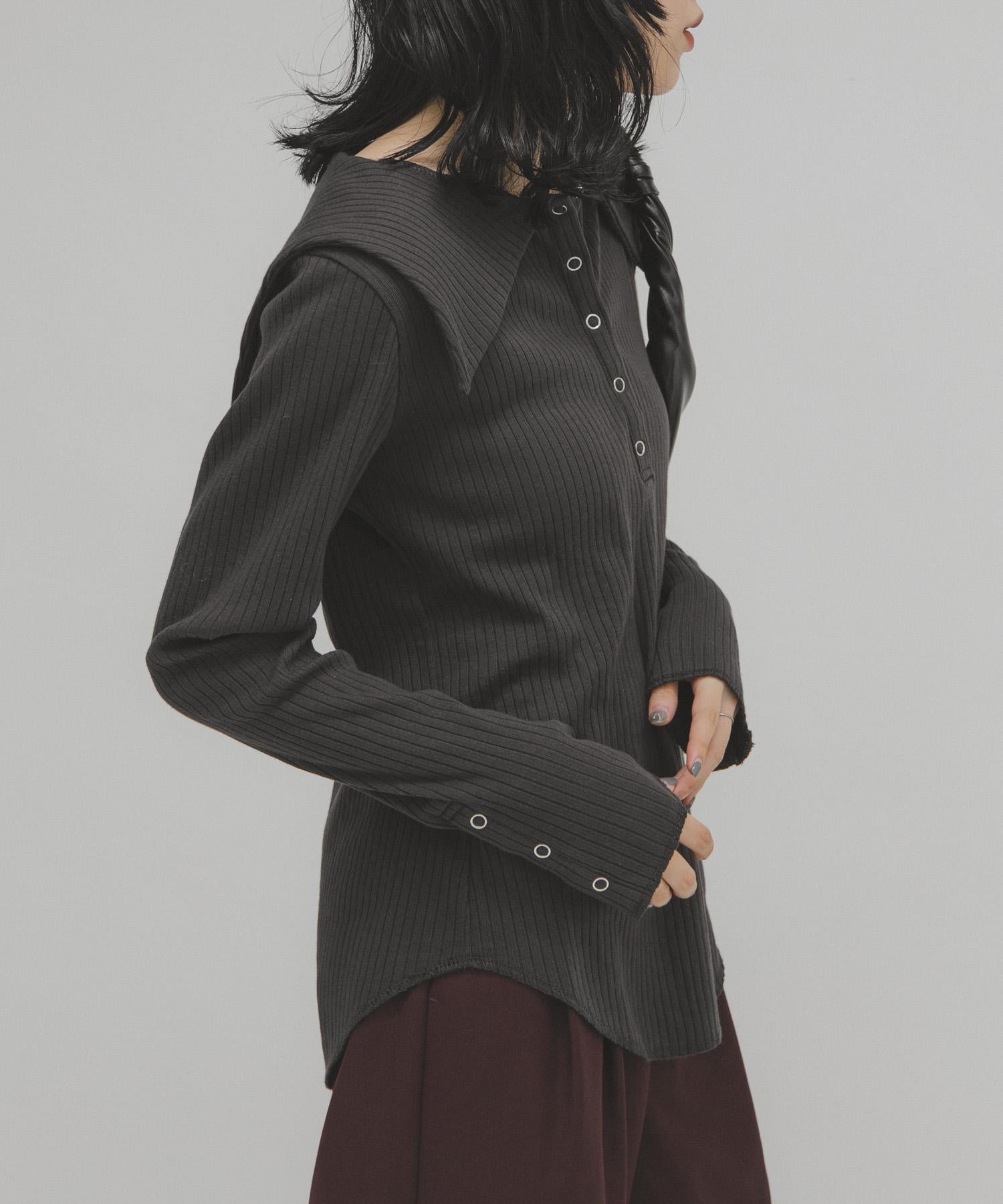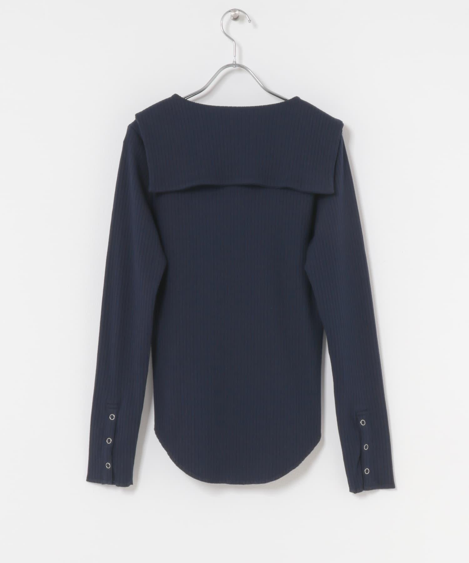 這件上衣由簡單的羅紋製成,並以水手領設計作為點綴。袖子也有類似襯衫的細節,帶有環形圓點紐扣的開放式規格。這款上衣合身適度,穿著舒適,盡顯女性魅力。
