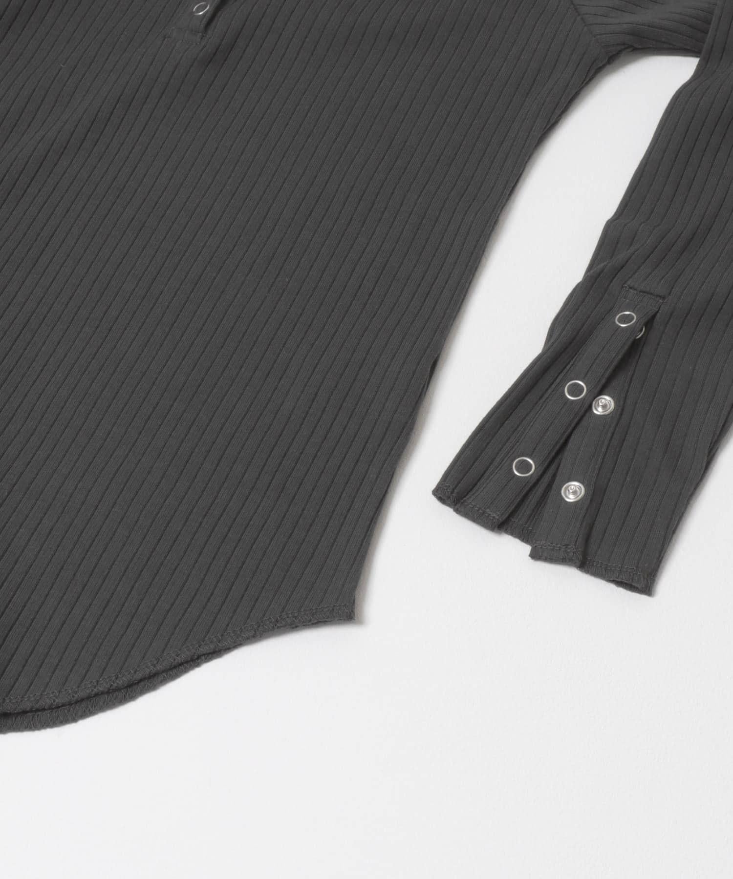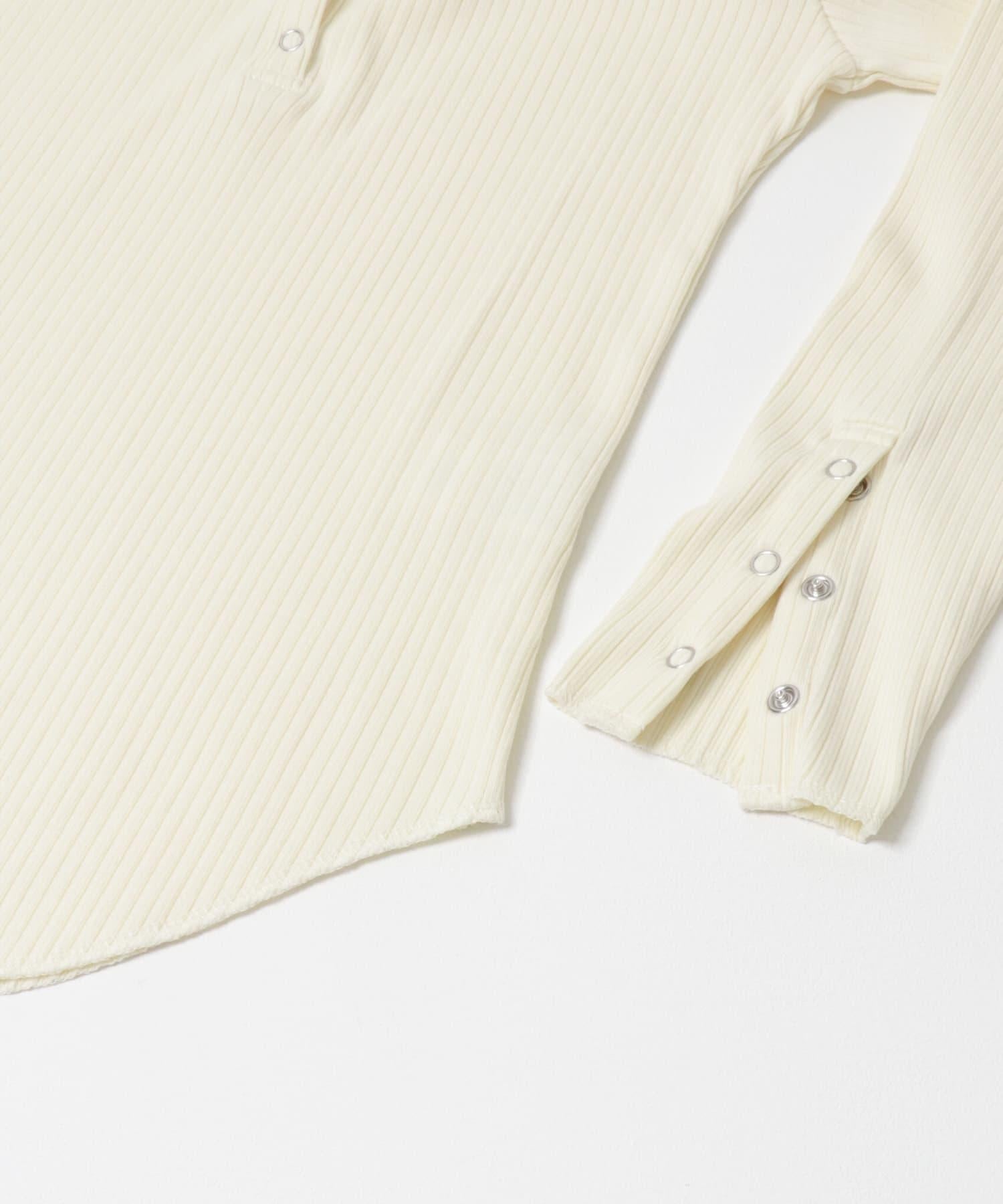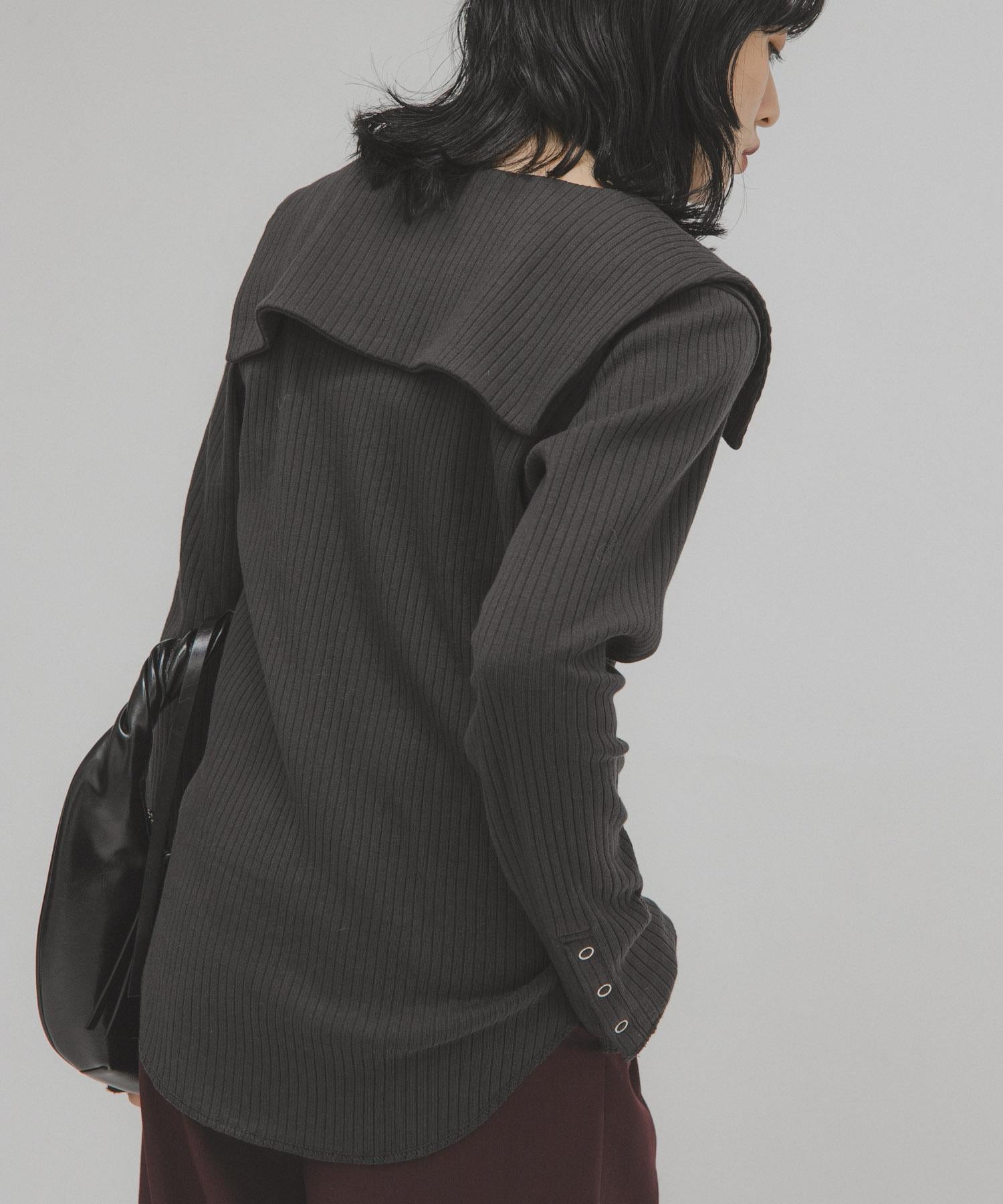 這件上衣由簡單的羅紋製成,並以水手領設計作為點綴。袖子也有類似襯衫的細節,帶有環形圓點紐扣的開放式規格。這款上衣合身適度,穿著舒適,盡顯女性魅力。