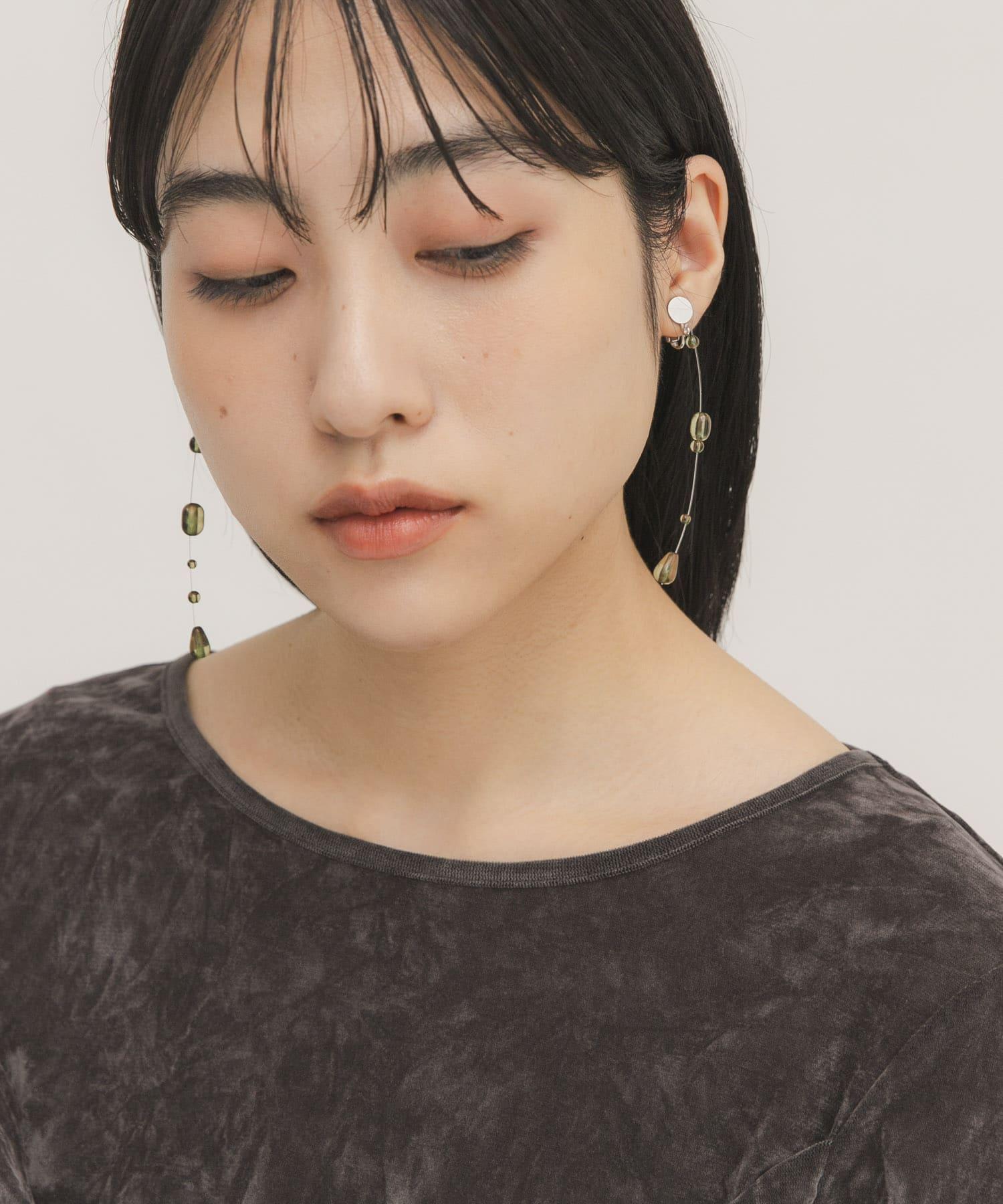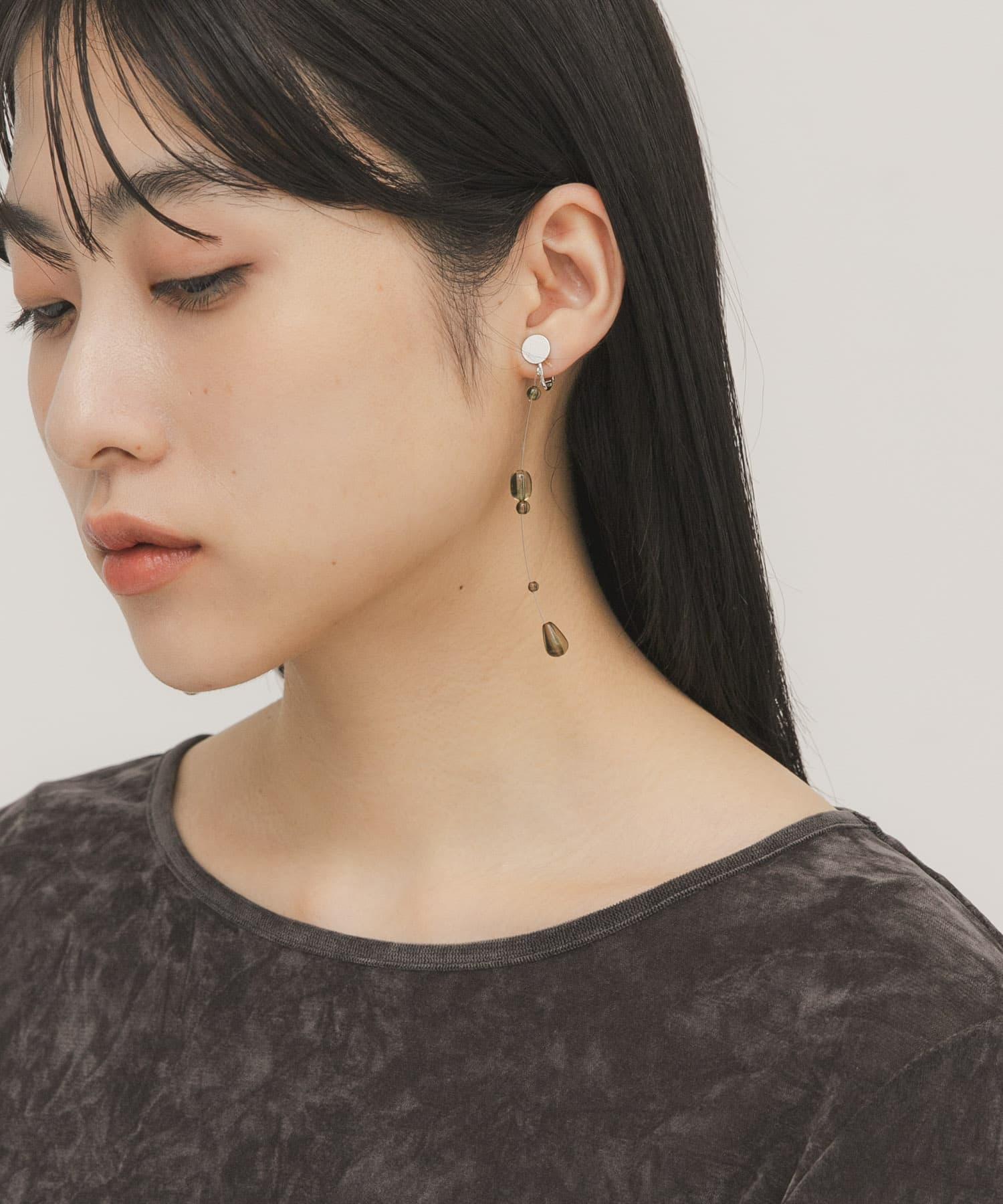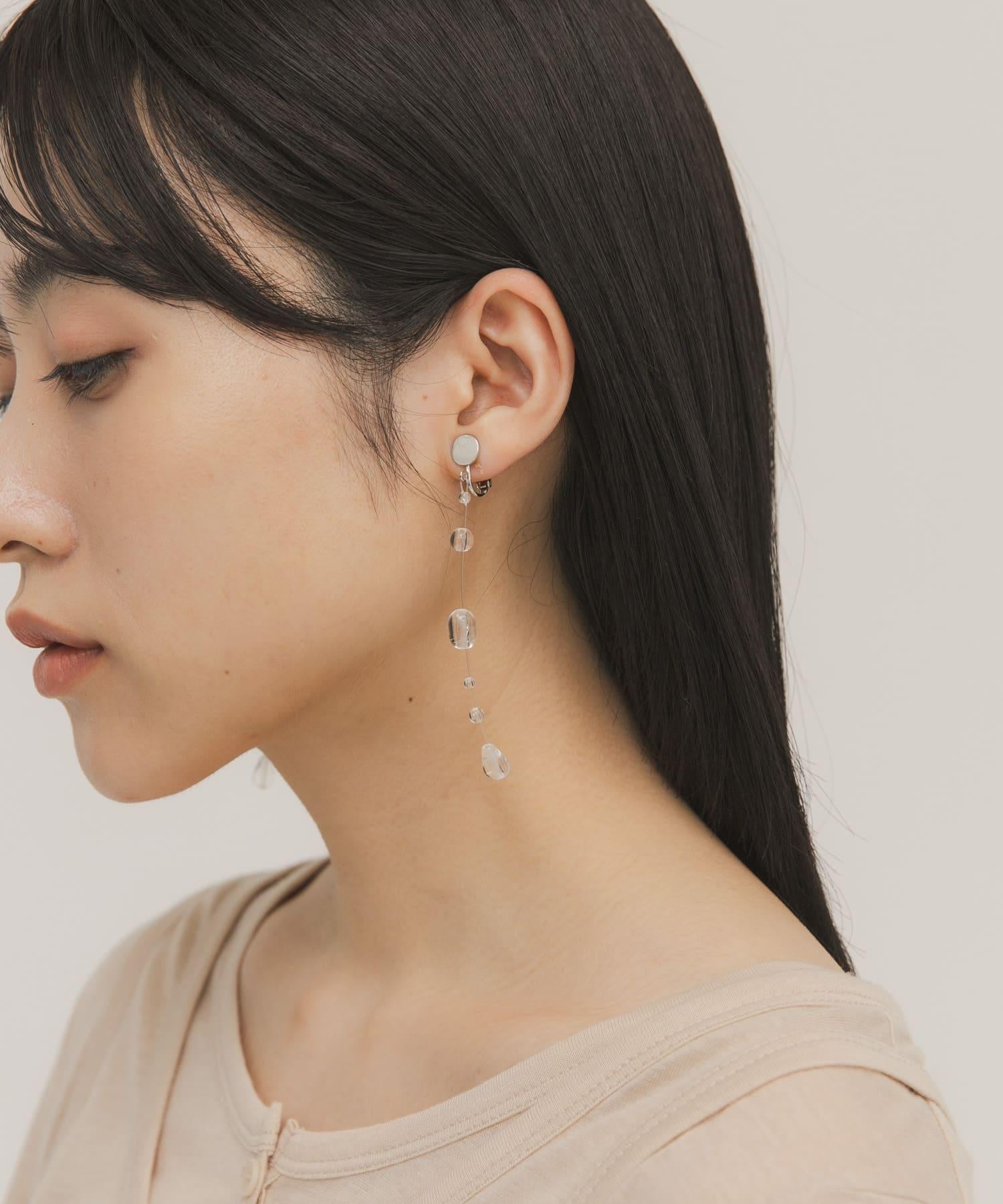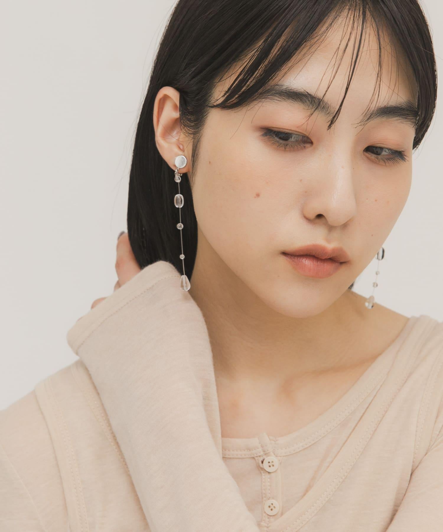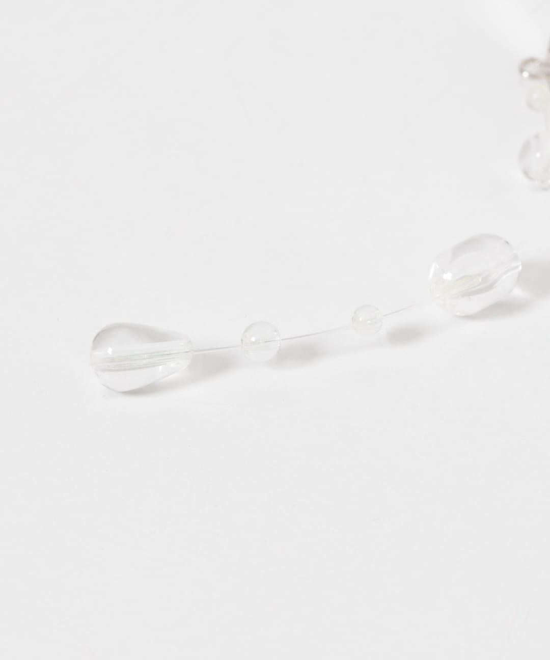 這款耳環利用各種形狀的丙烯酸部件創造出水滴的形象。左右兩邊的位置和部件都不一樣,繩子也是透明的,使整個作品清晰可見。建議作為衣服的參照物。