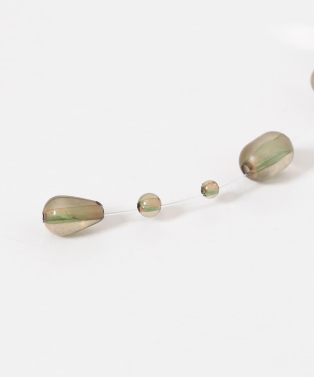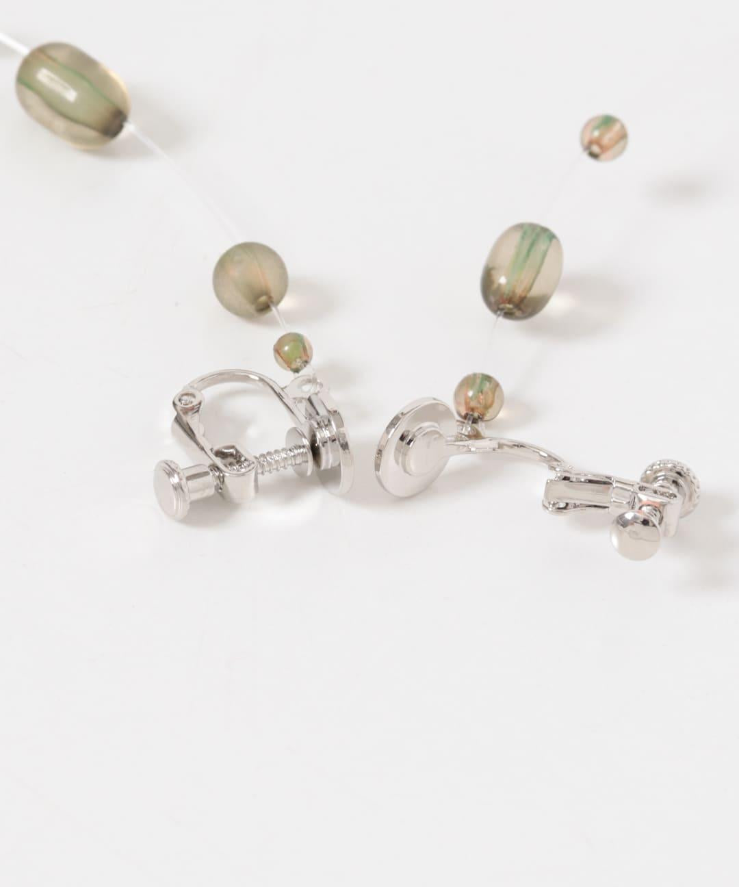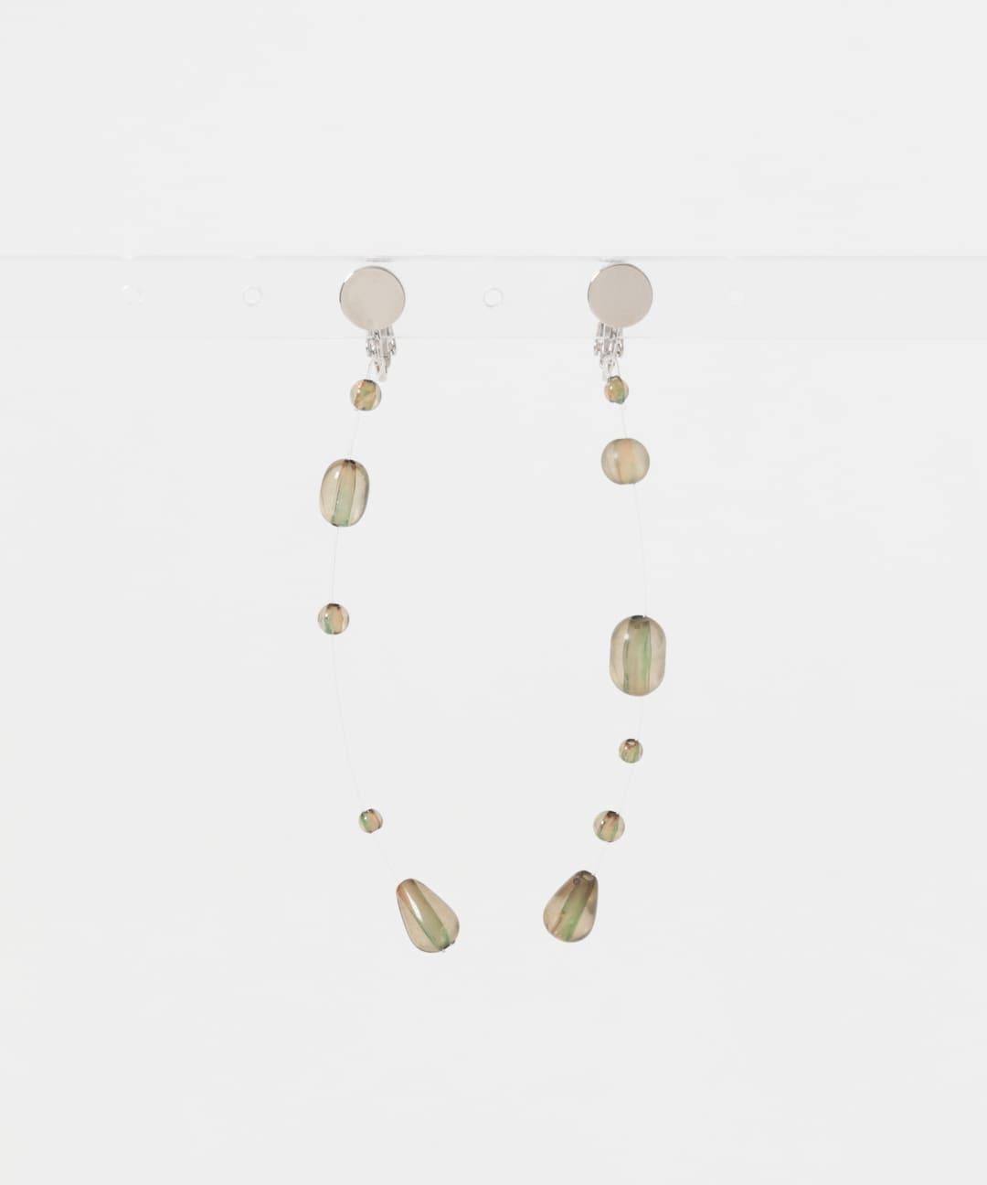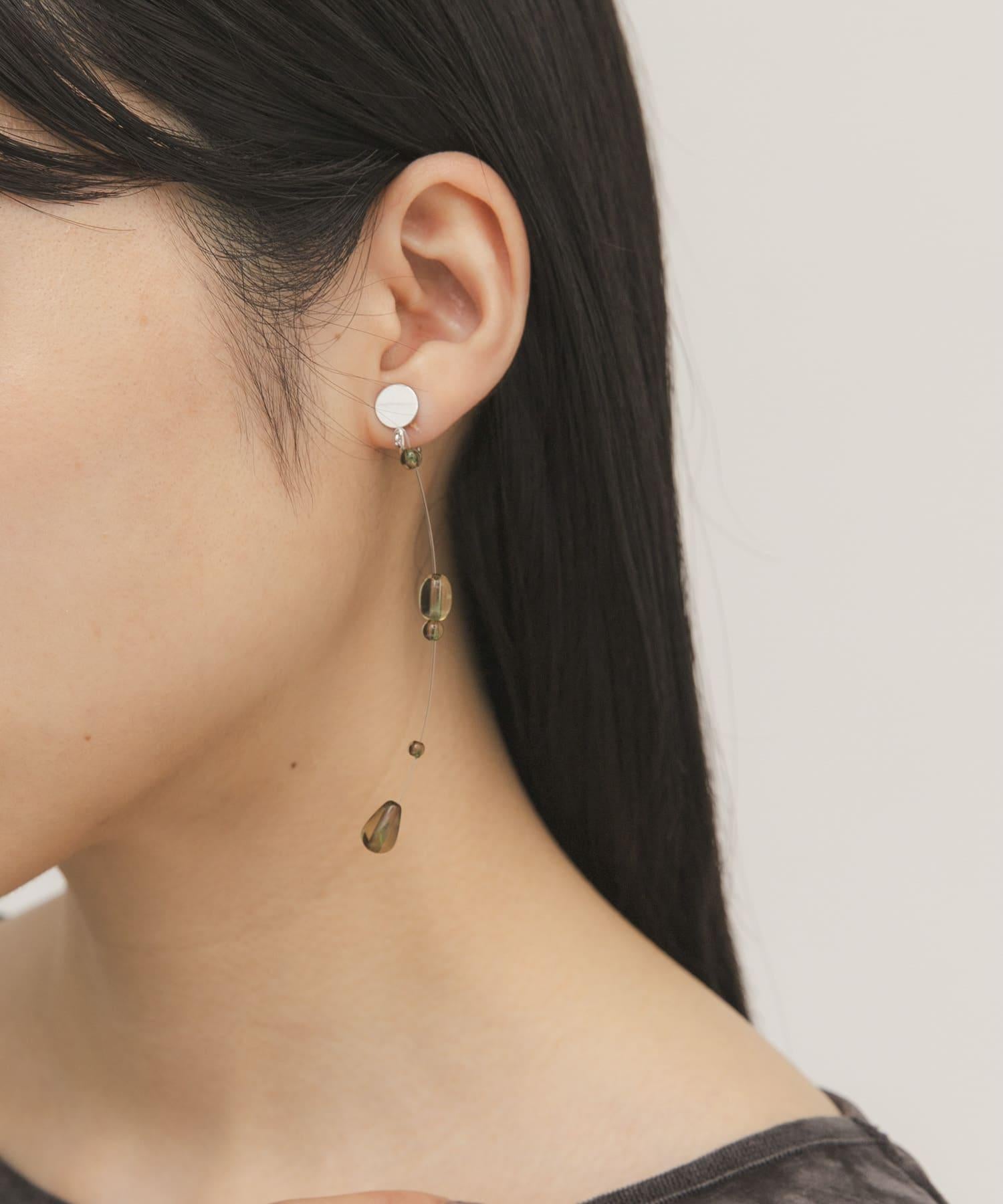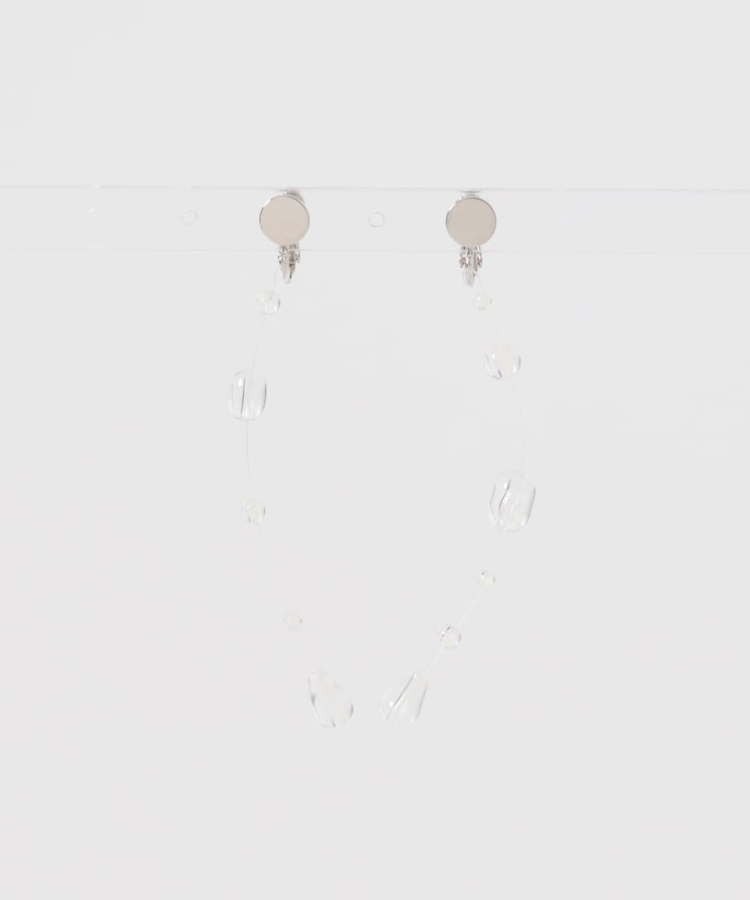 這款耳環利用各種形狀的丙烯酸部件創造出水滴的形象。左右兩邊的位置和部件都不一樣,繩子也是透明的,使整個作品清晰可見。建議作為衣服的參照物。