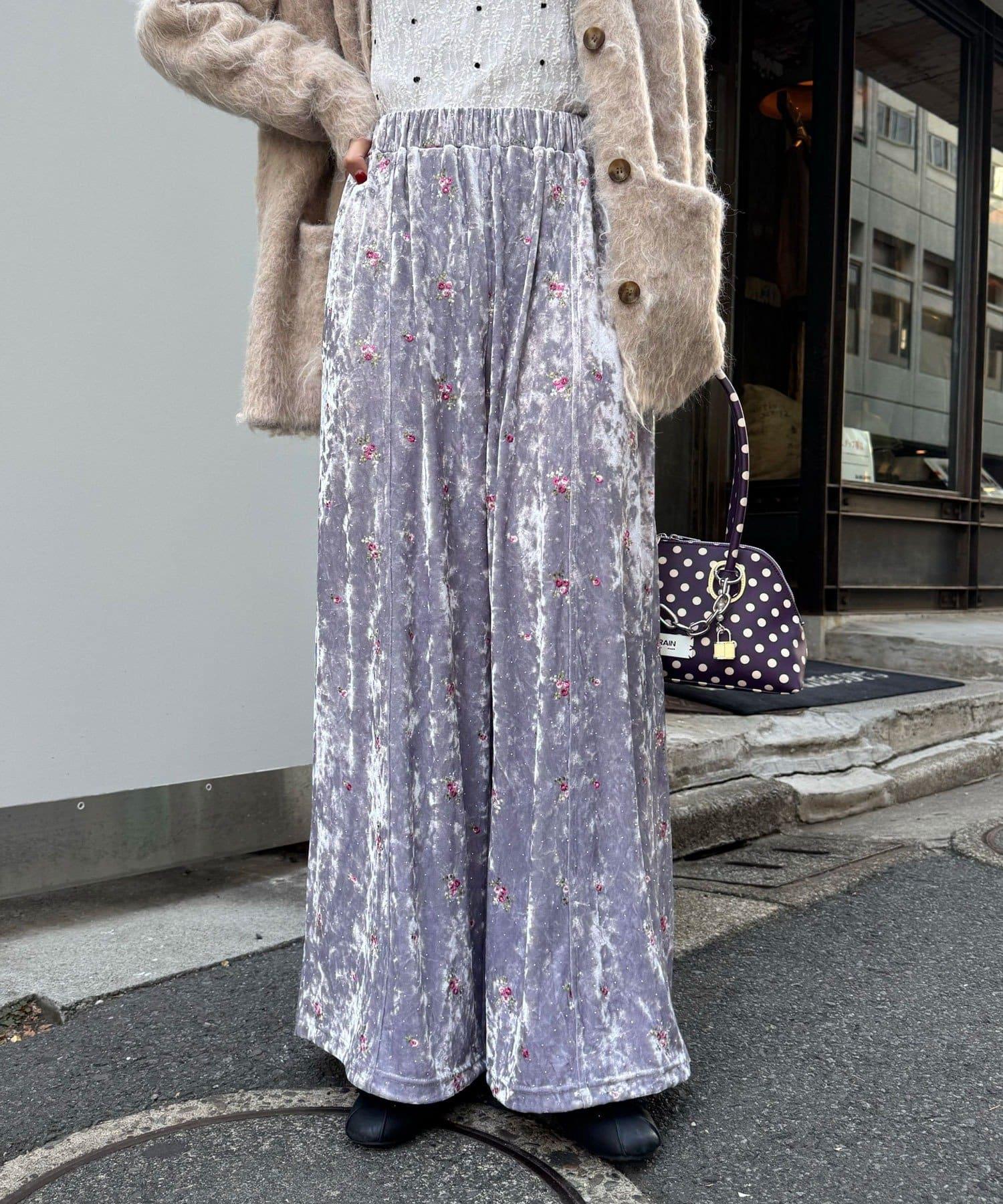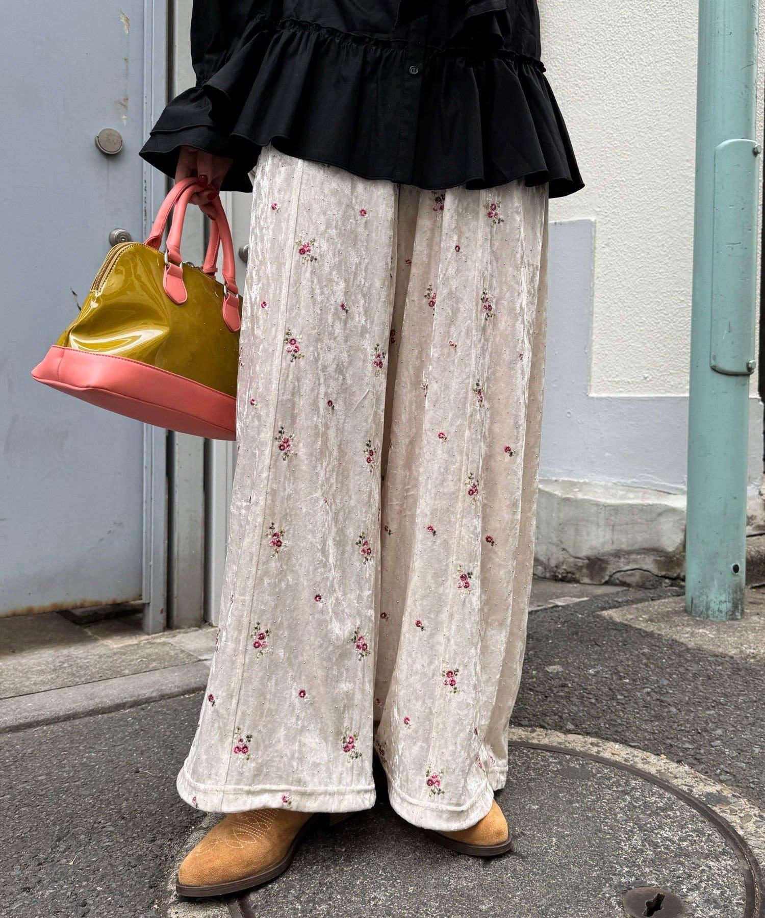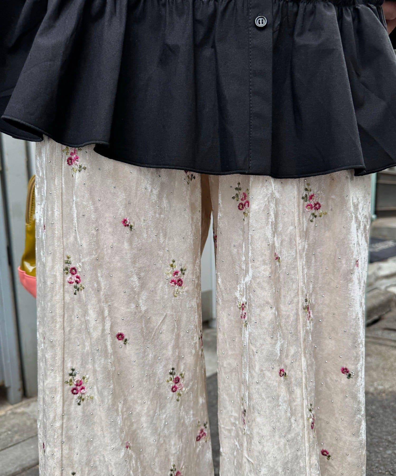 寬鬆長褲的亮面絲絨上繡有花朵和閃閃發光的水鑽。