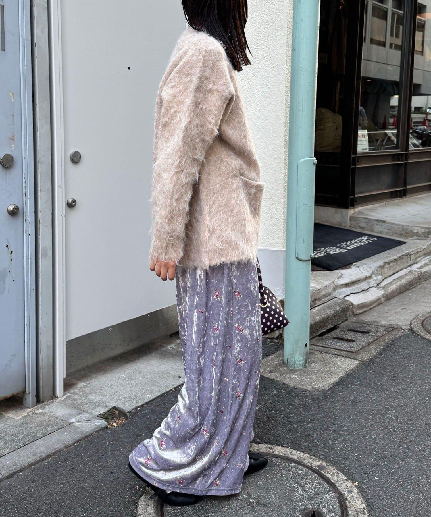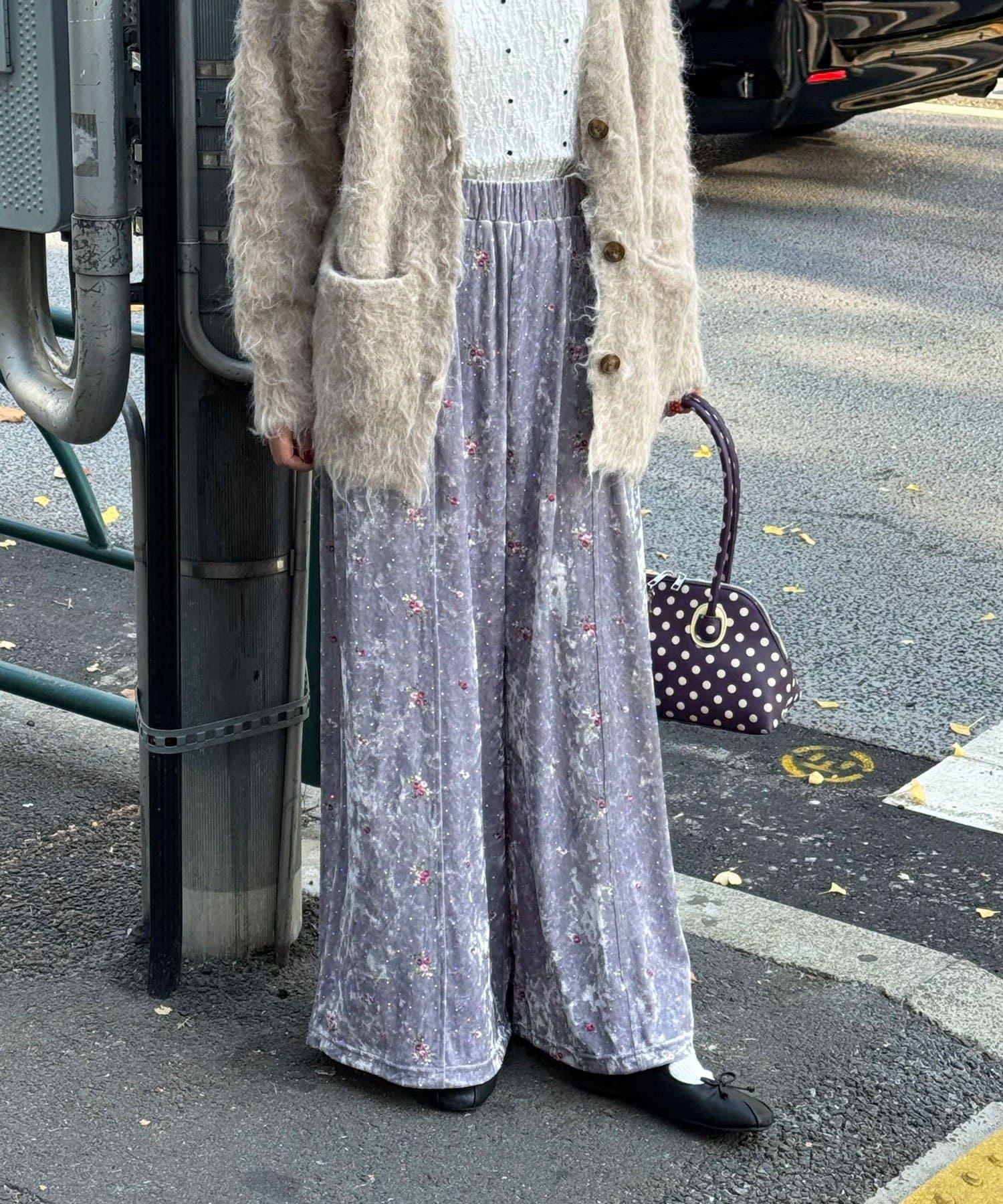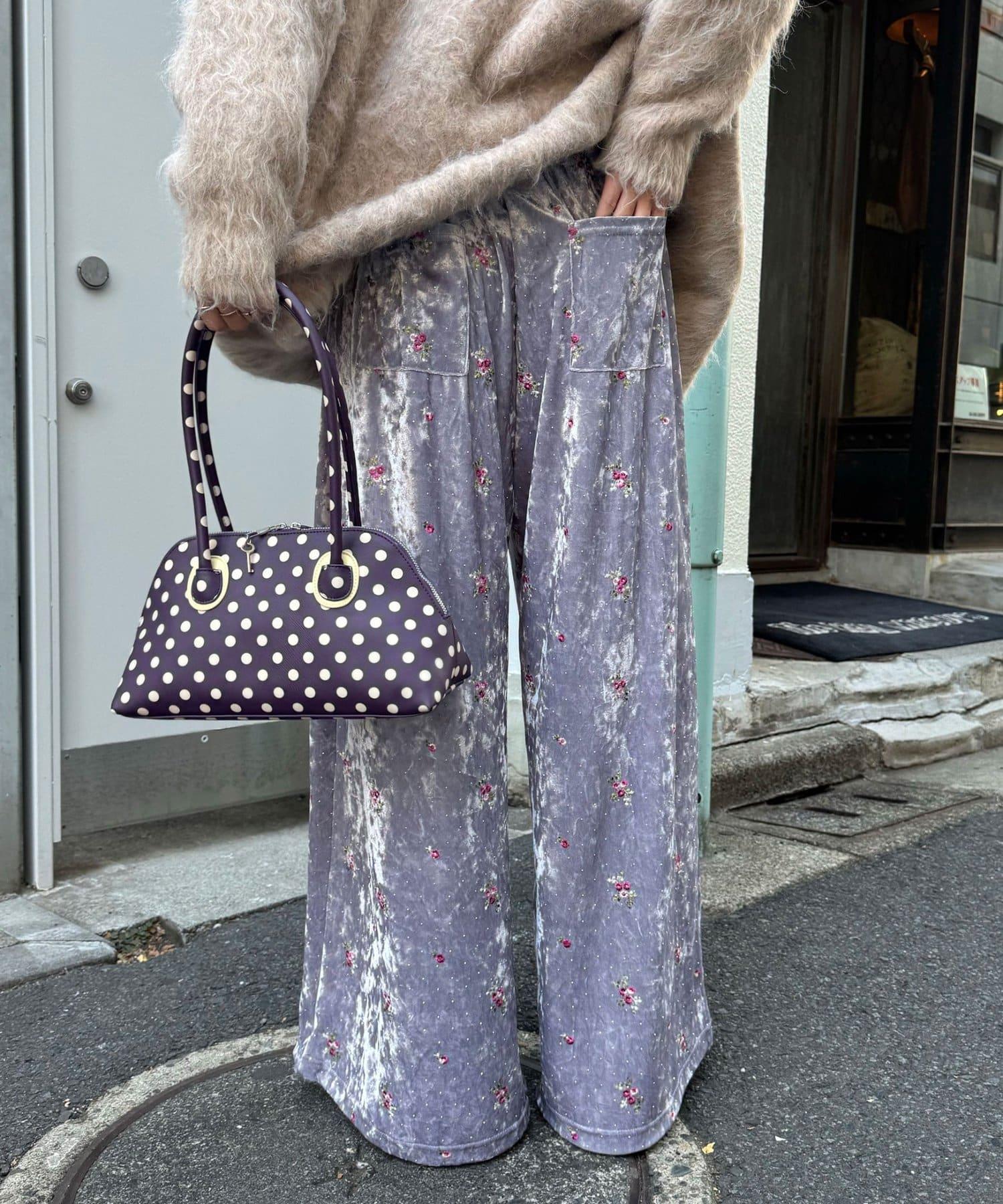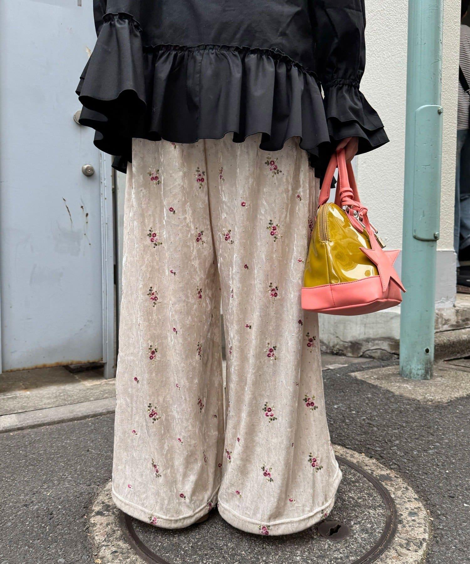 寬鬆長褲的亮面絲絨上繡有花朵和閃閃發光的水鑽。