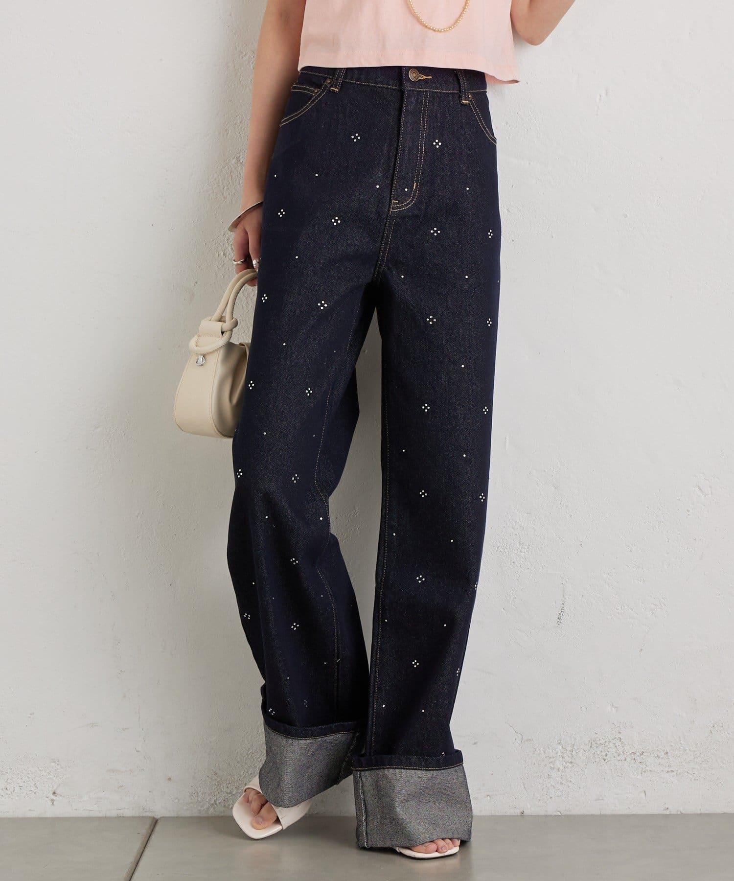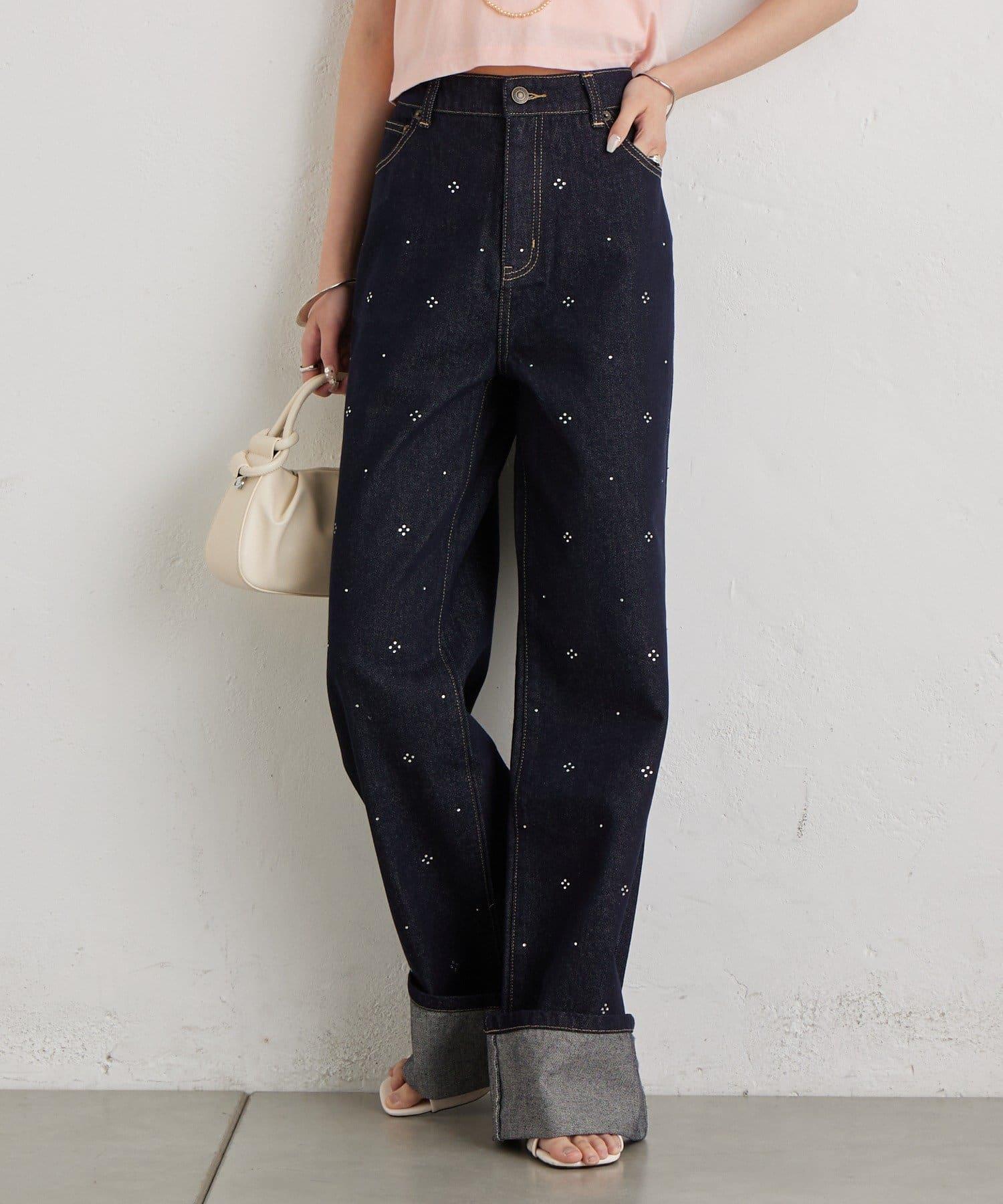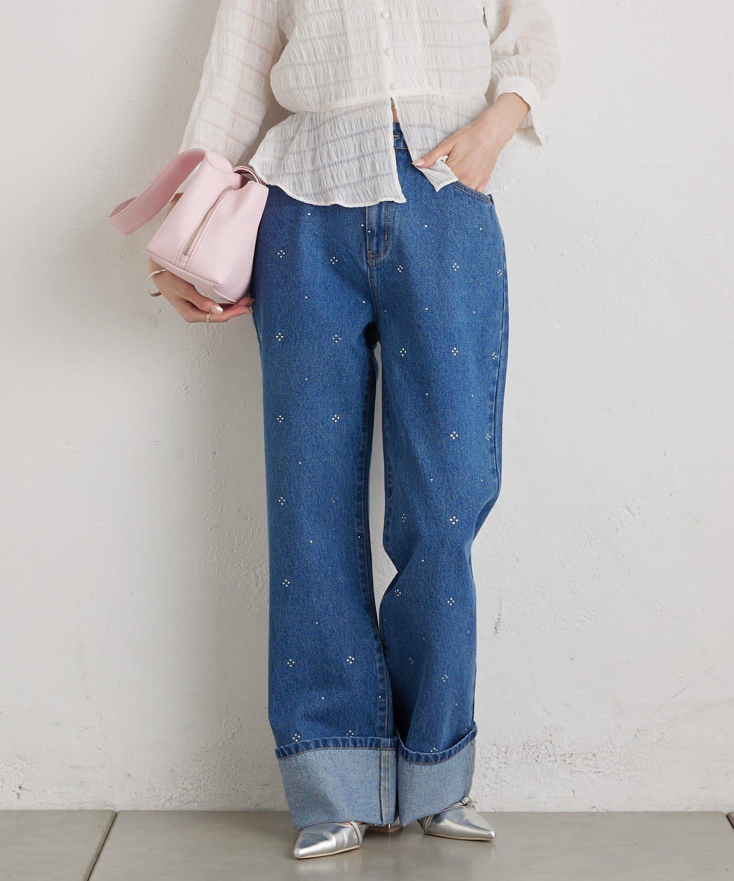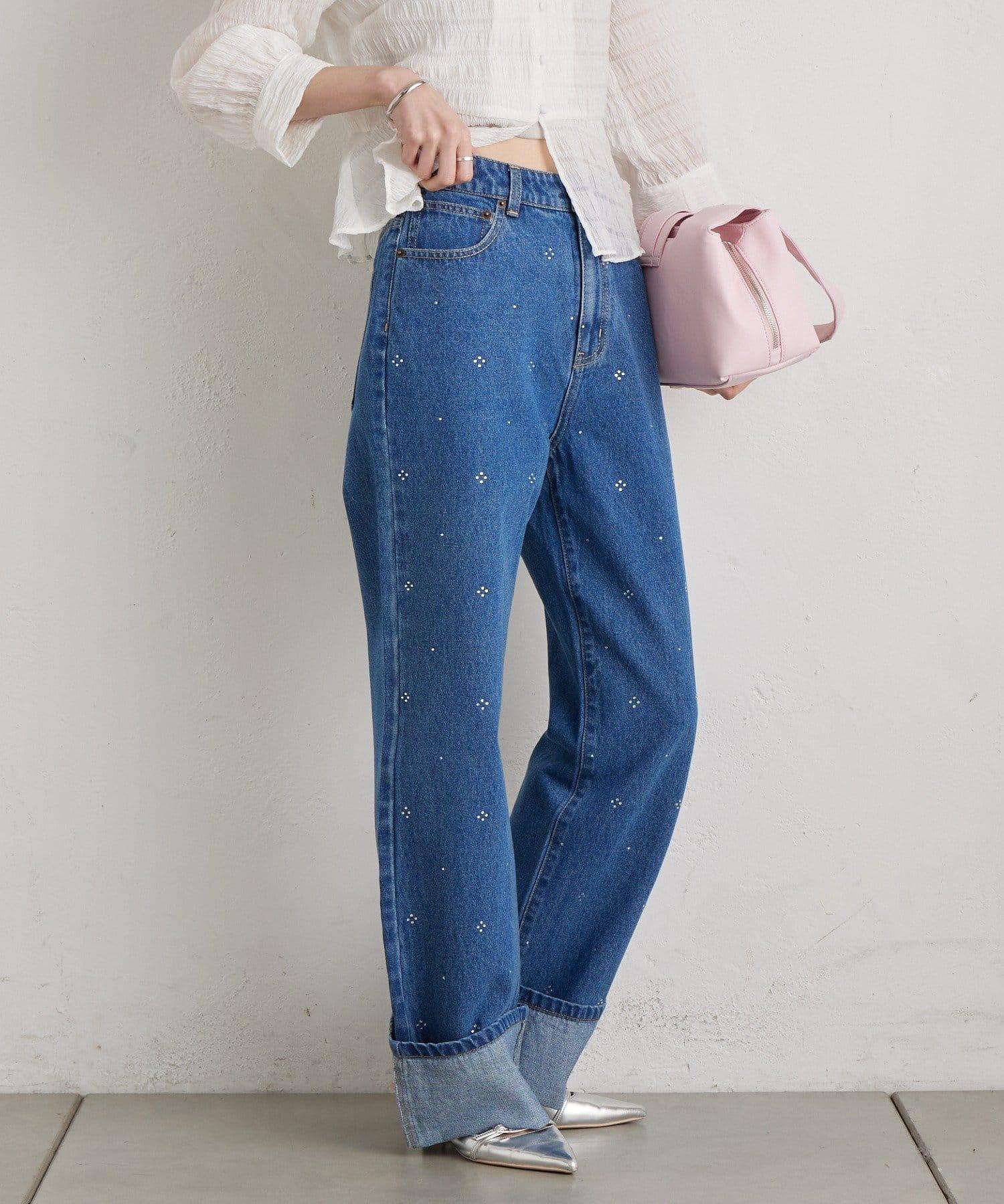 這款牛仔長褲既華麗又休閒,水鑽散落各處,恰到好處。