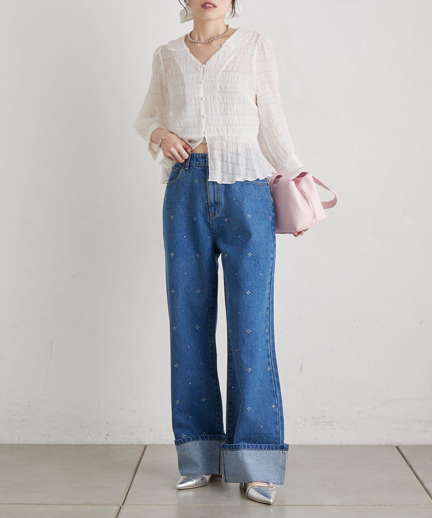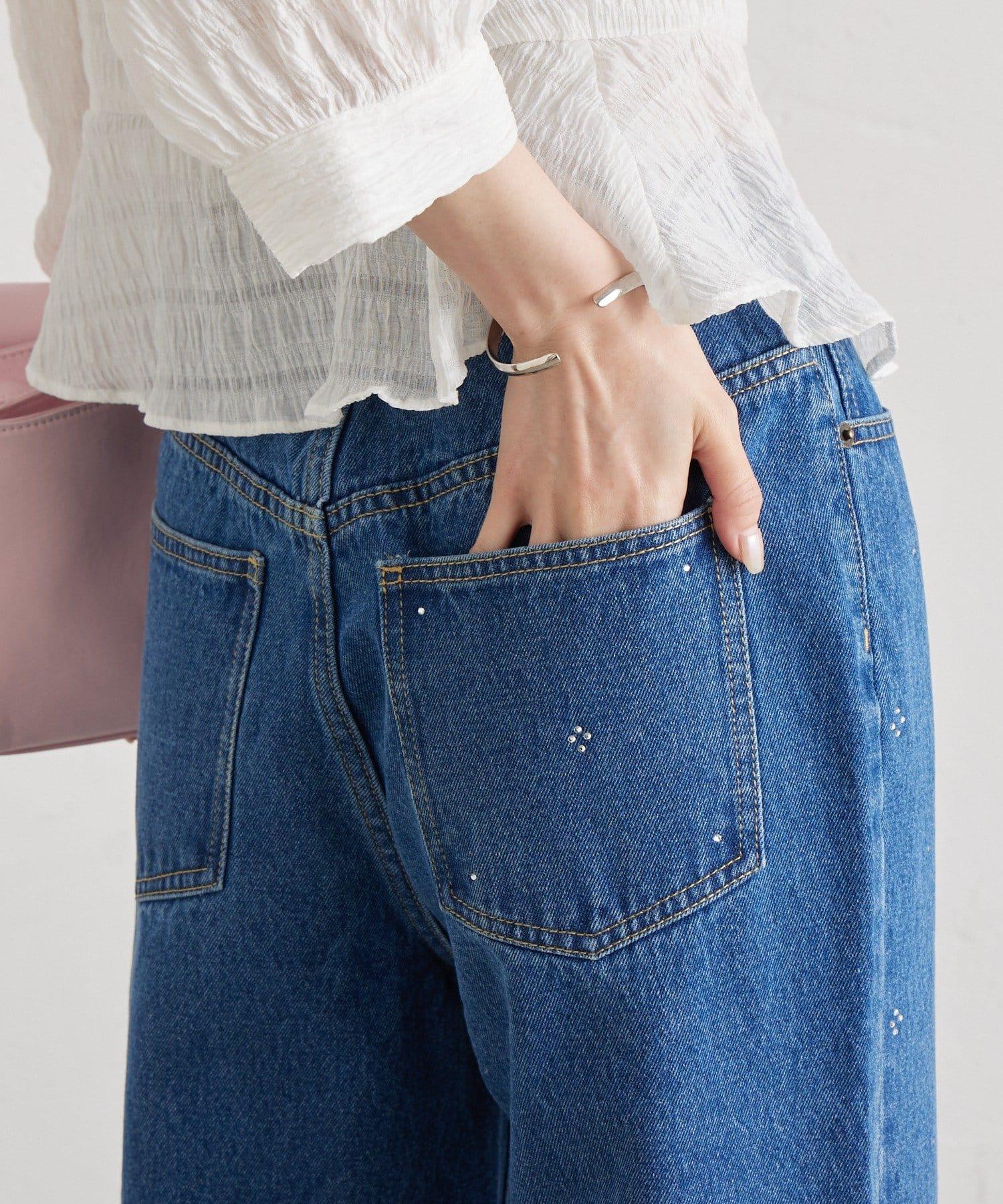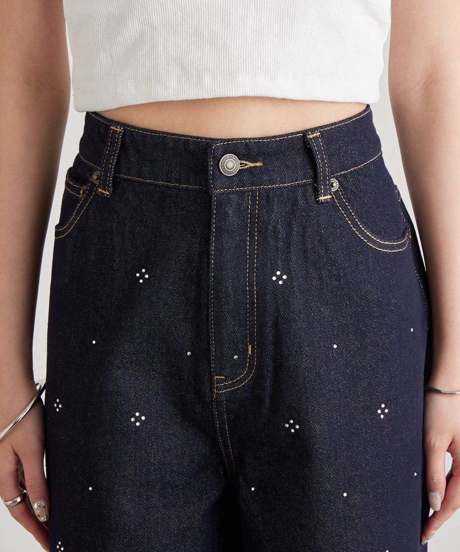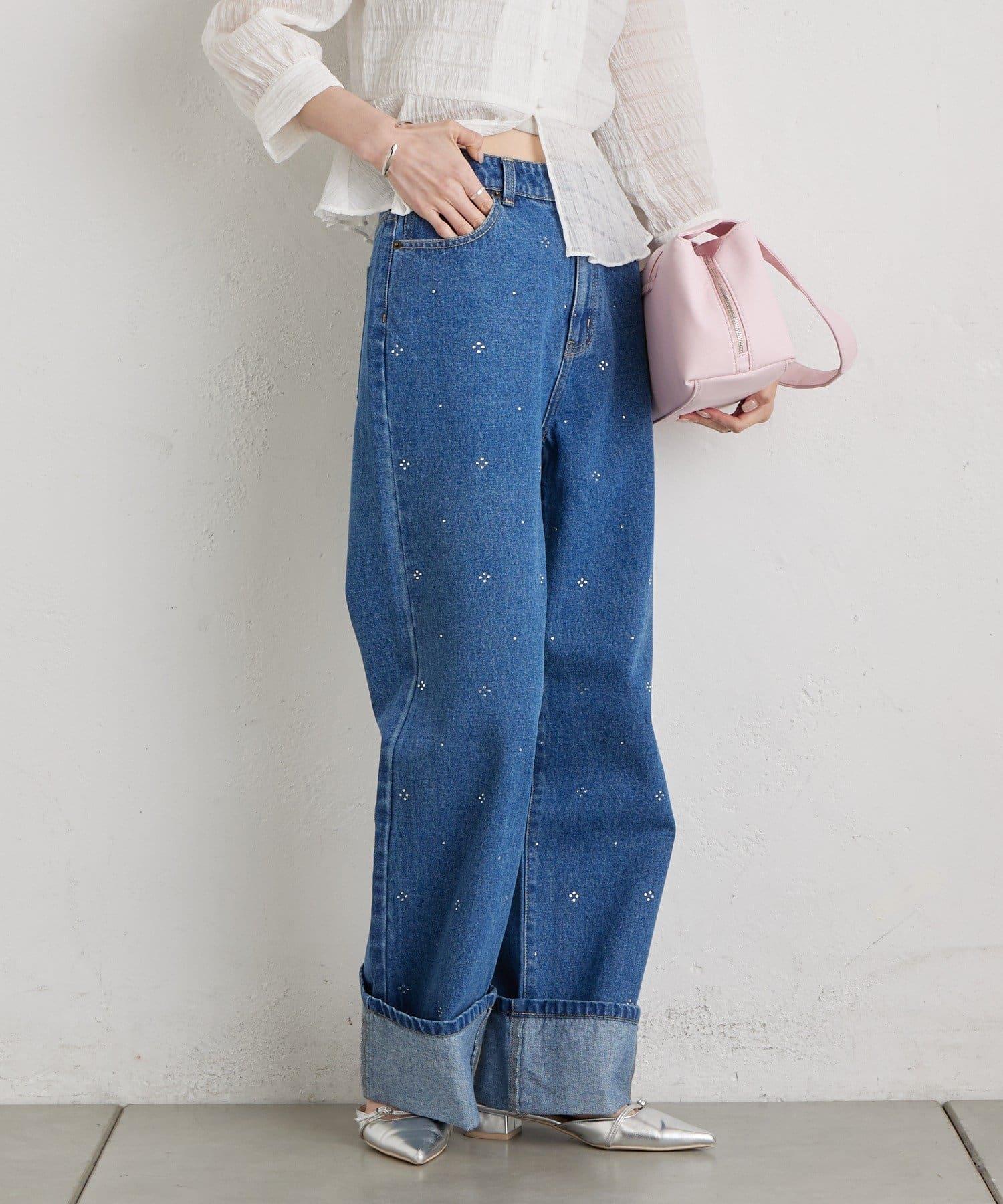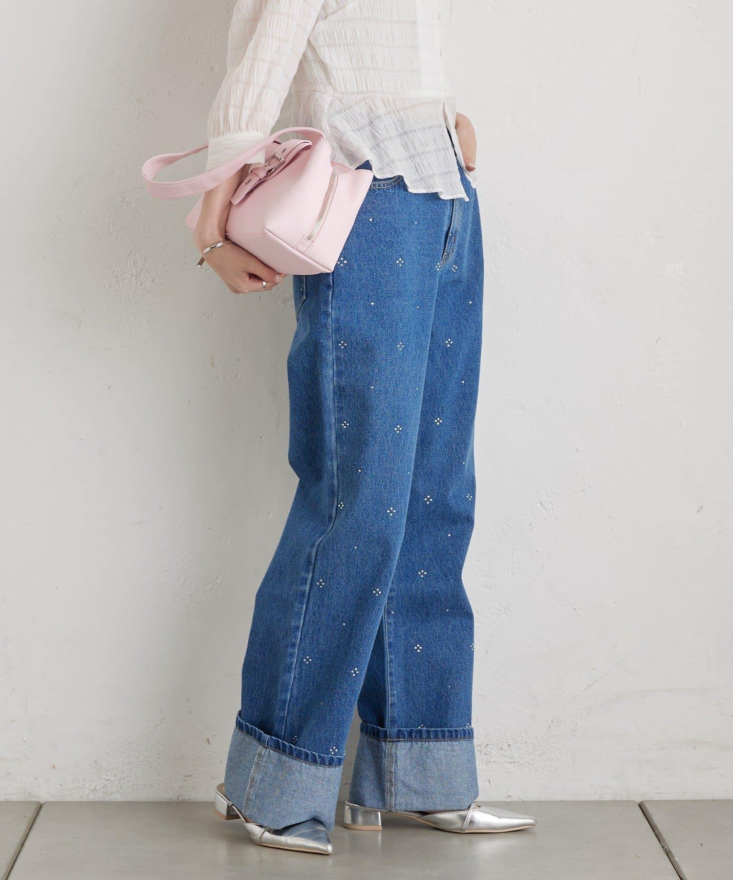 這款牛仔長褲既華麗又休閒,水鑽散落各處,恰到好處。