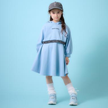 連帽衫長度較短,與連衣裙疊穿時更顯勻稱。