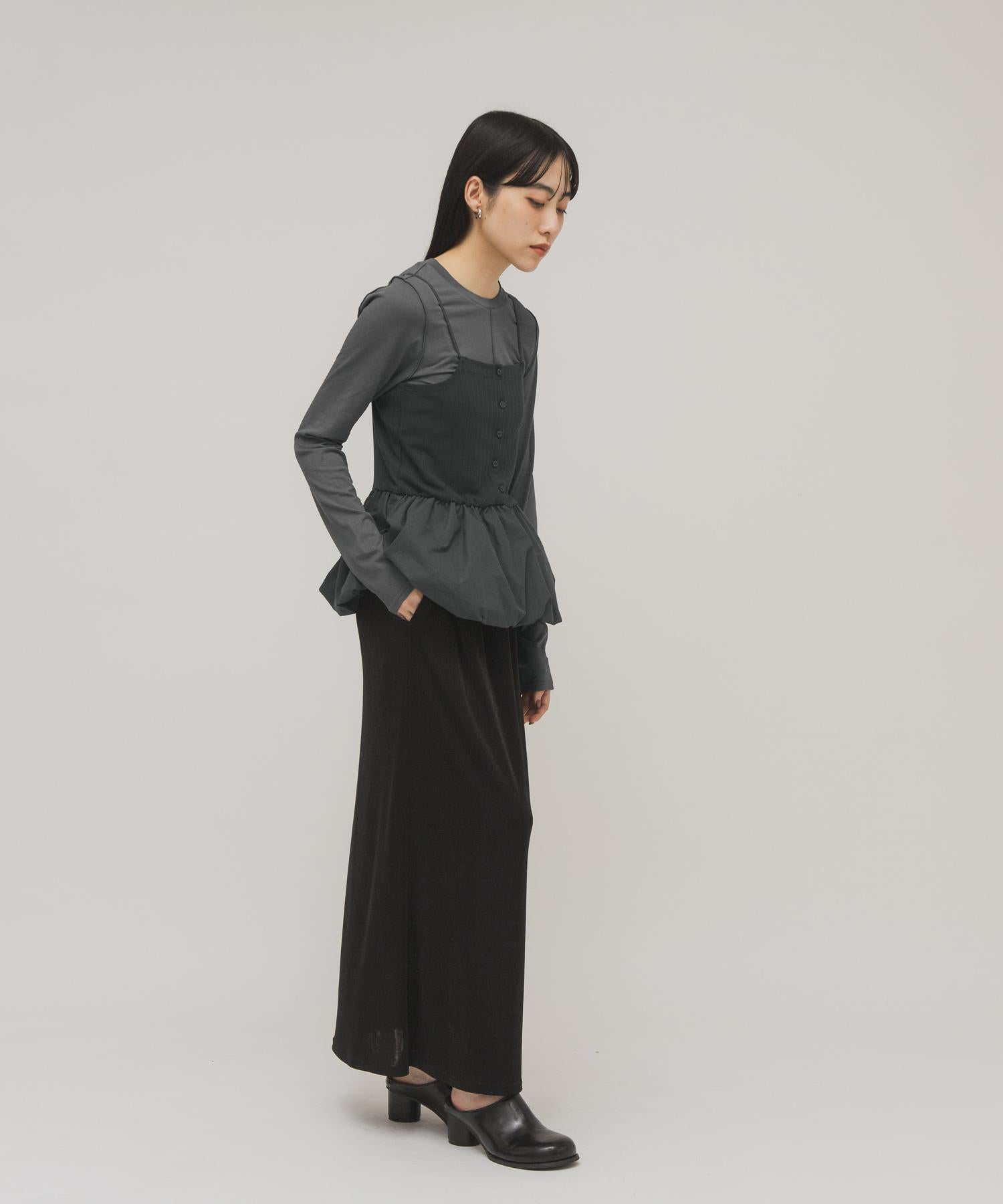 這是一款完美的女性風格單品,既可作為套裝穿著,也可單獨穿著。套裝包括一件透明度適中的基本款長 T 恤和一件氣球輪廓的半身裙,穿在身上非常好看。半身裙穿脫方便,褶皺可調節,平衡利落。