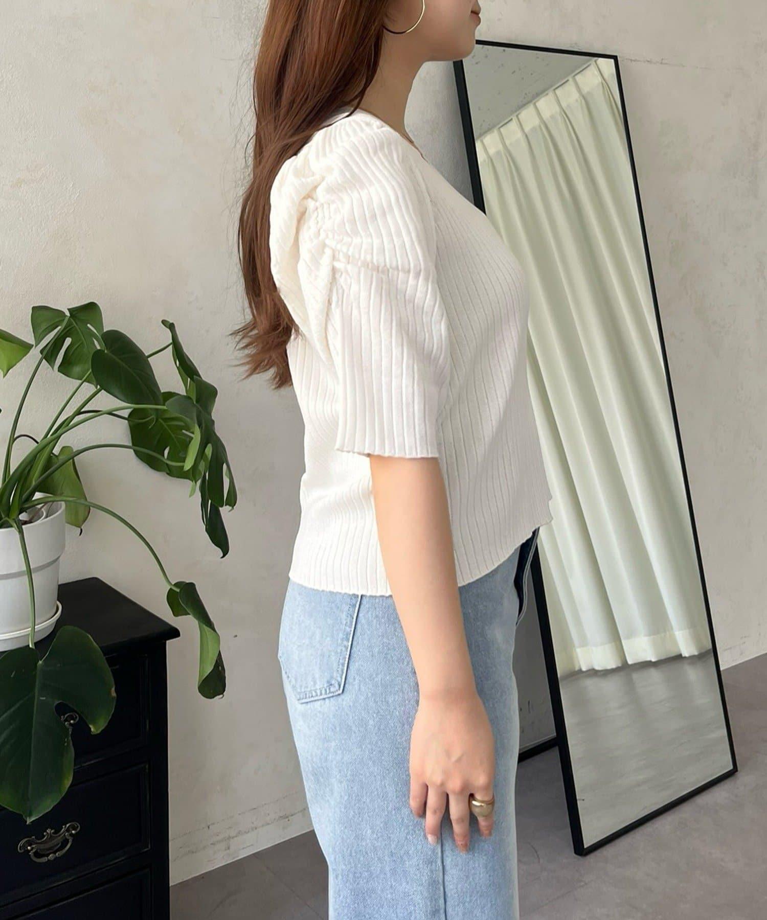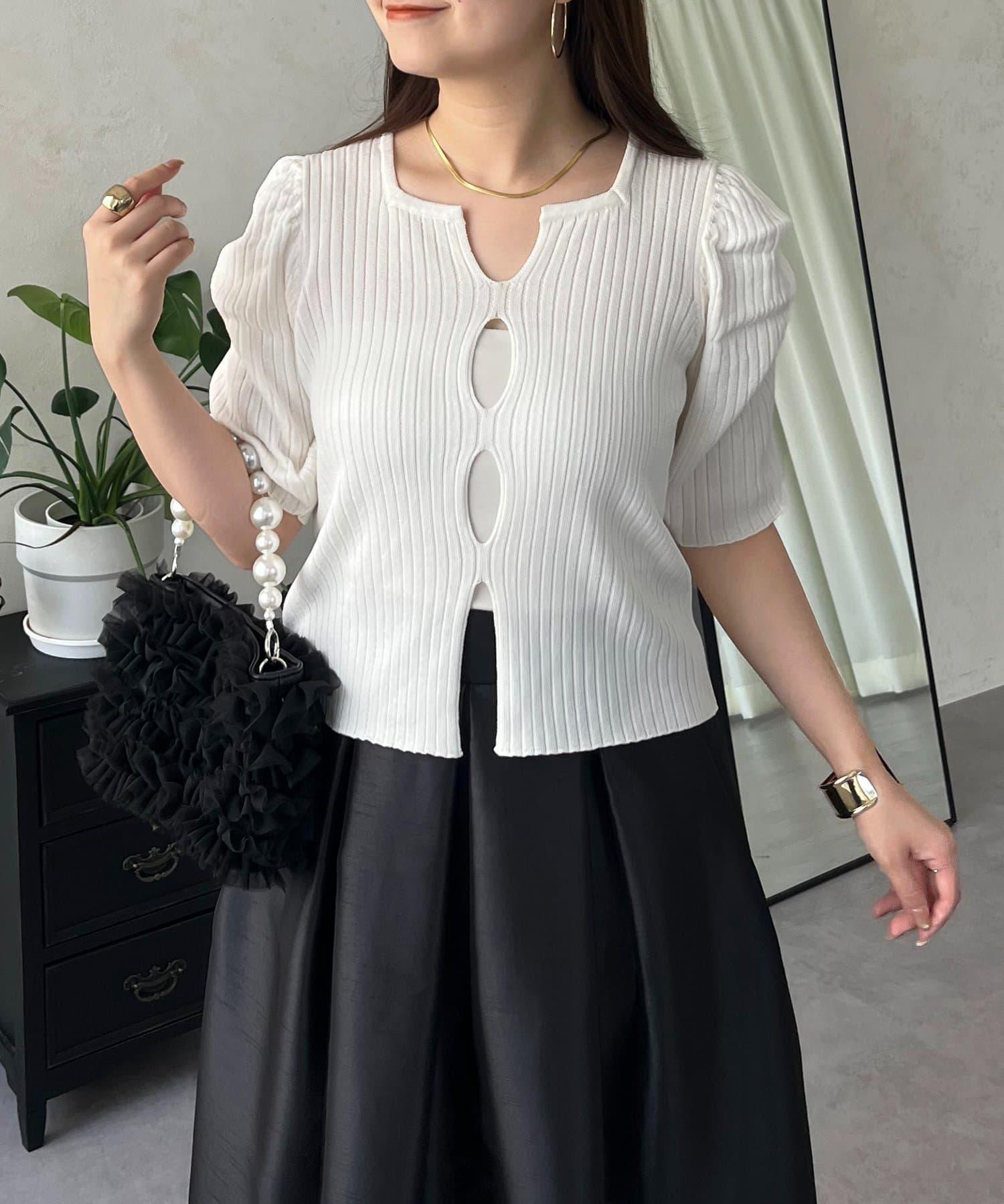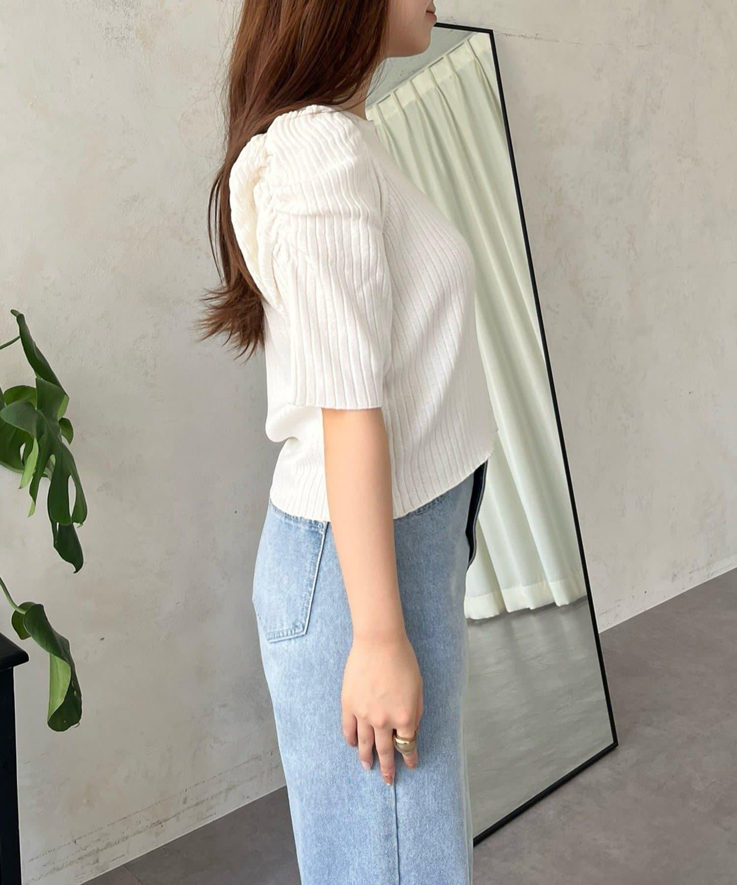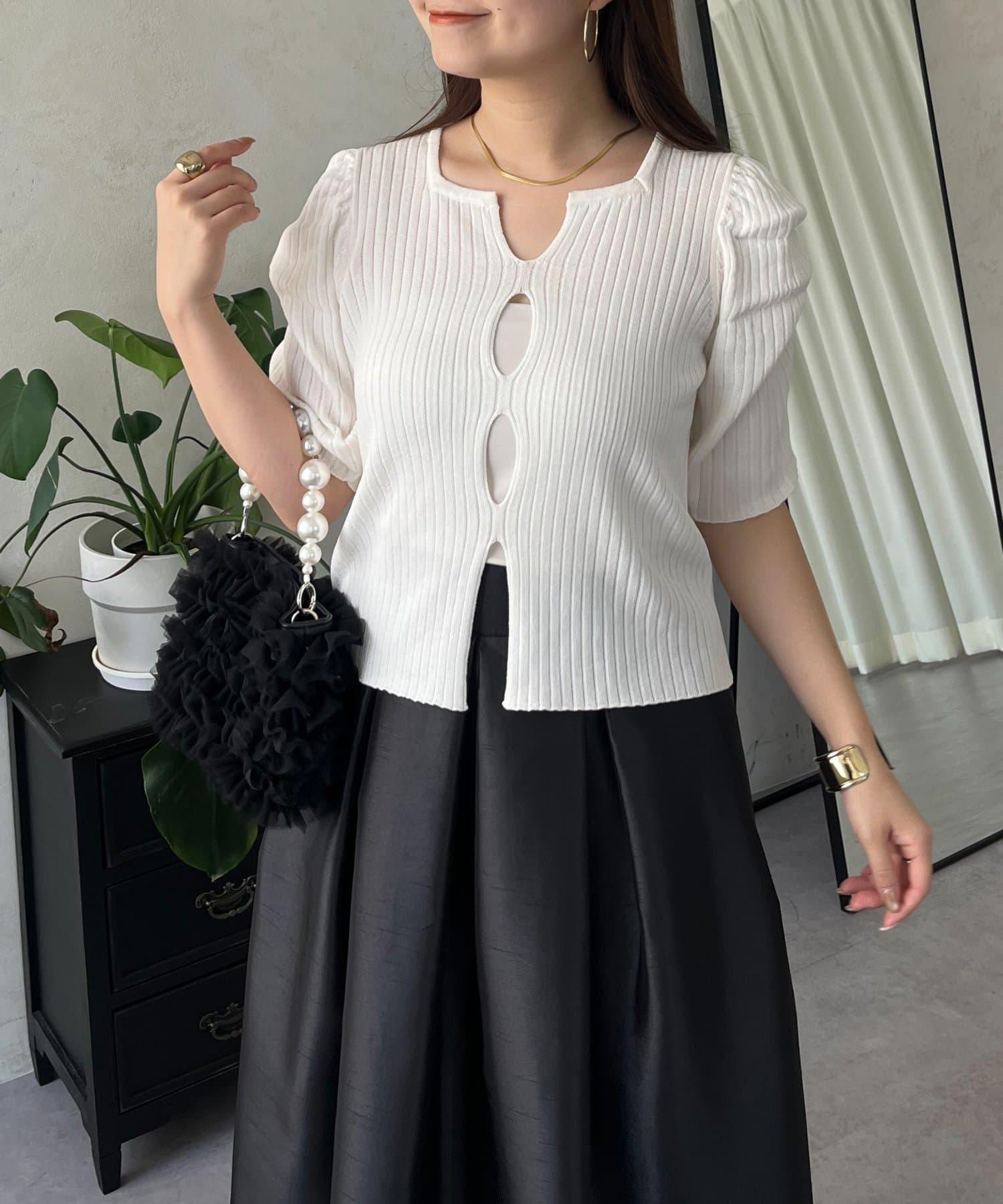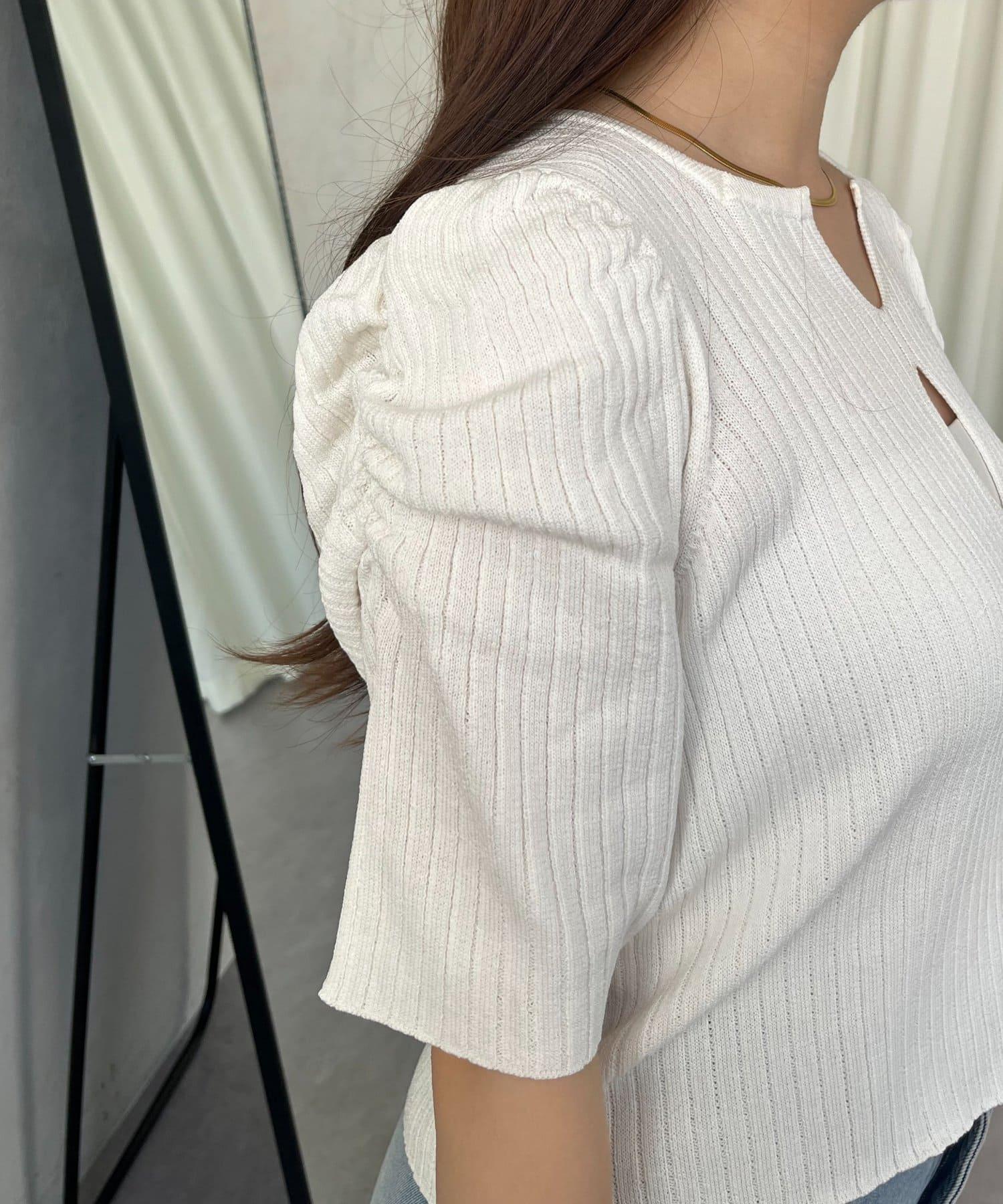 泡泡袖前開口條紋針織衫