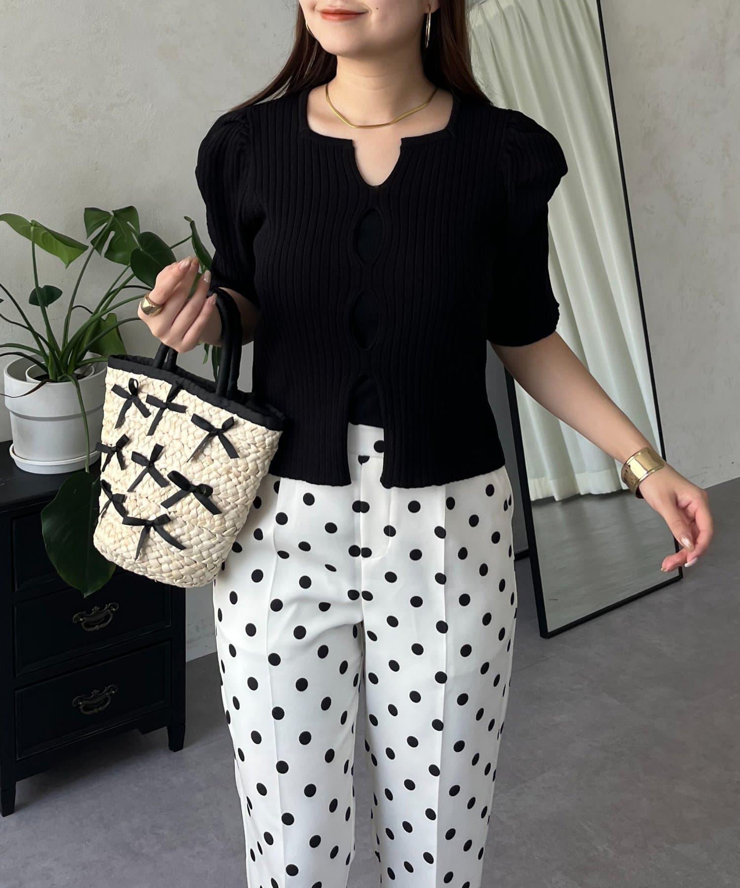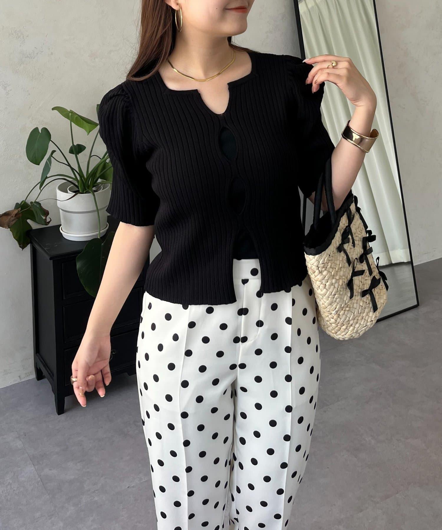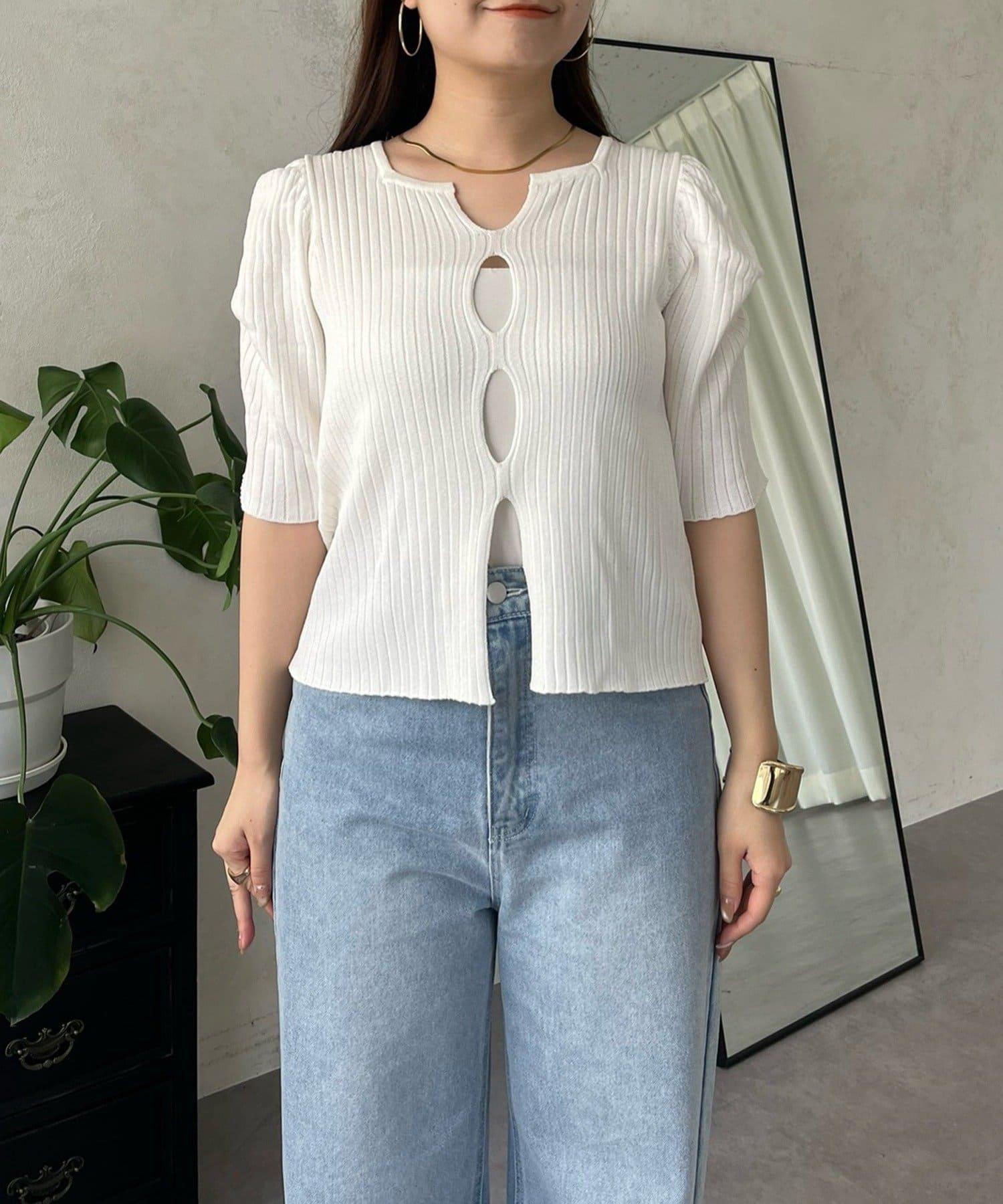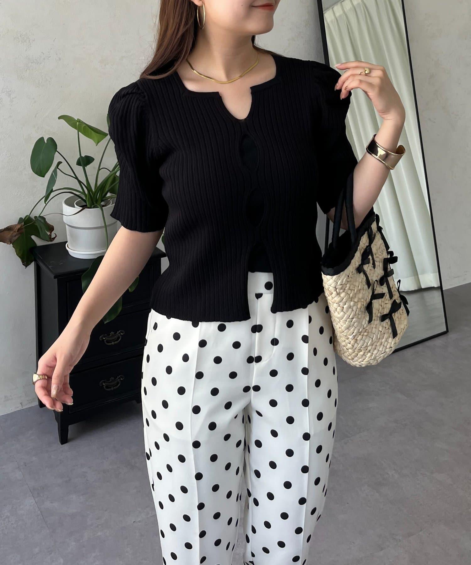 泡泡袖前開口條紋針織衫