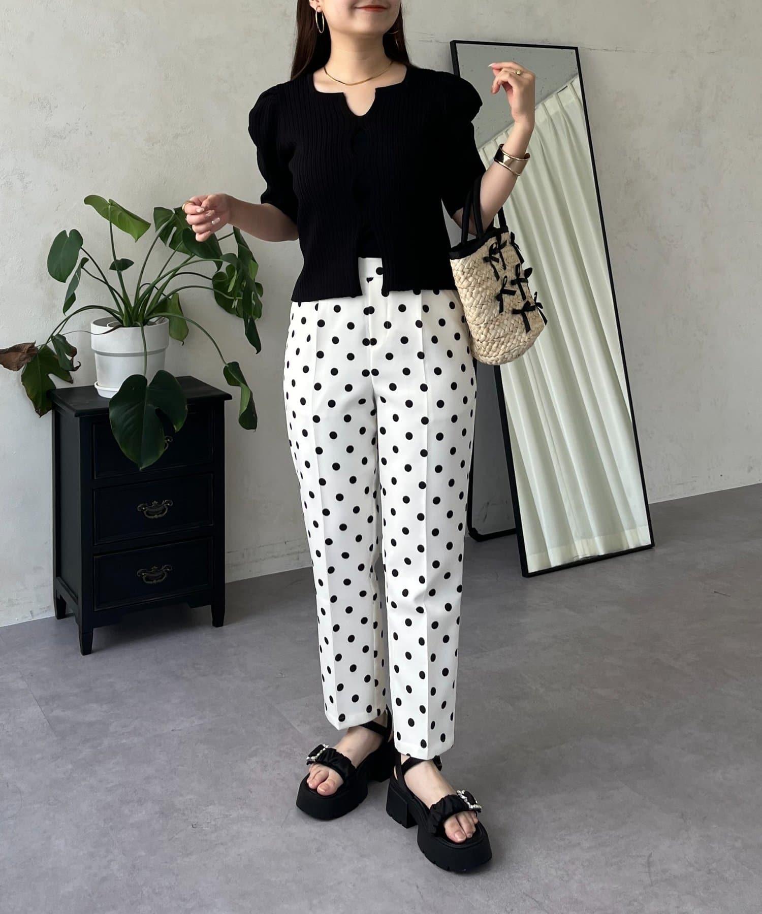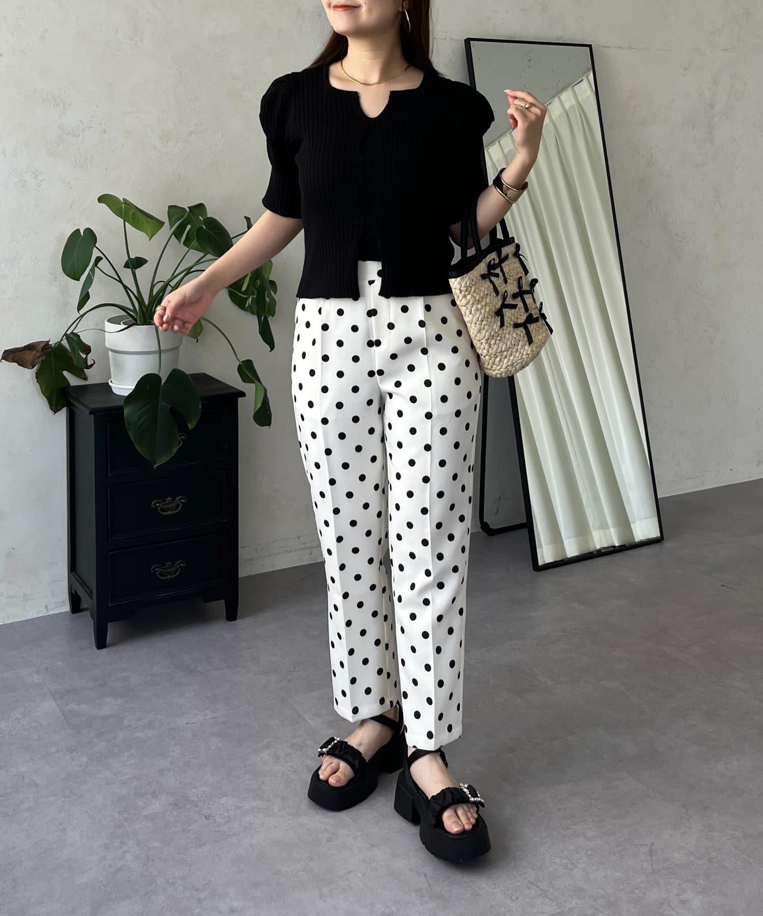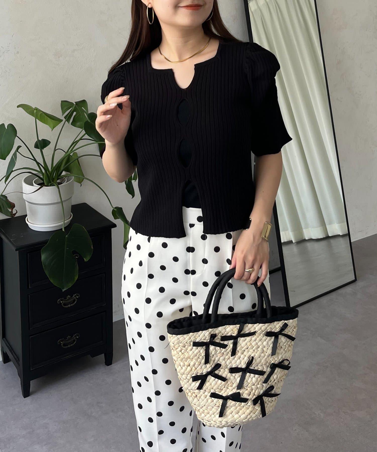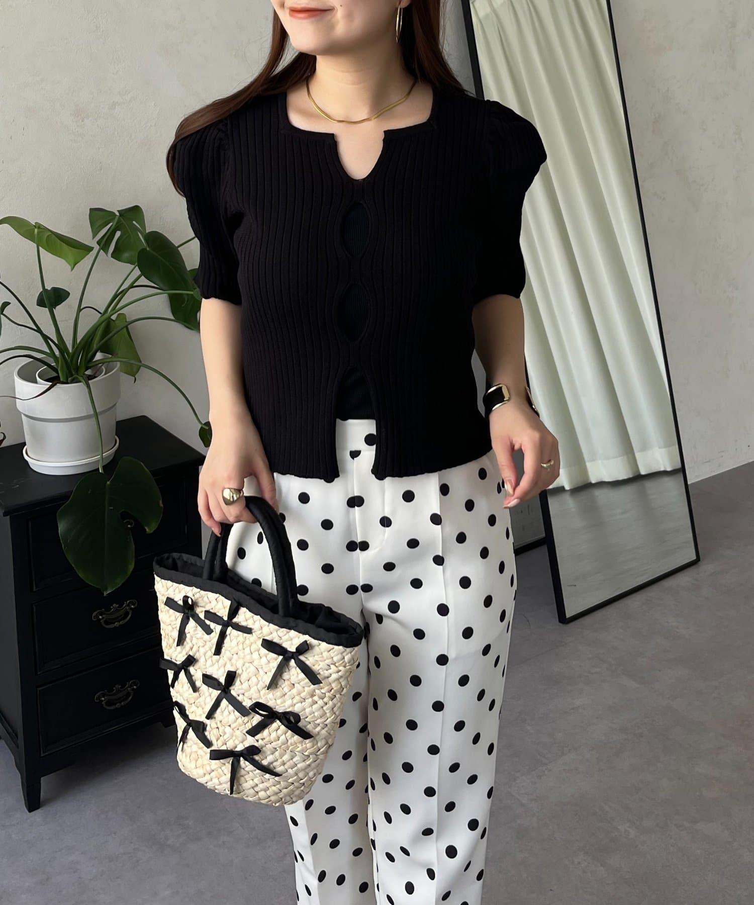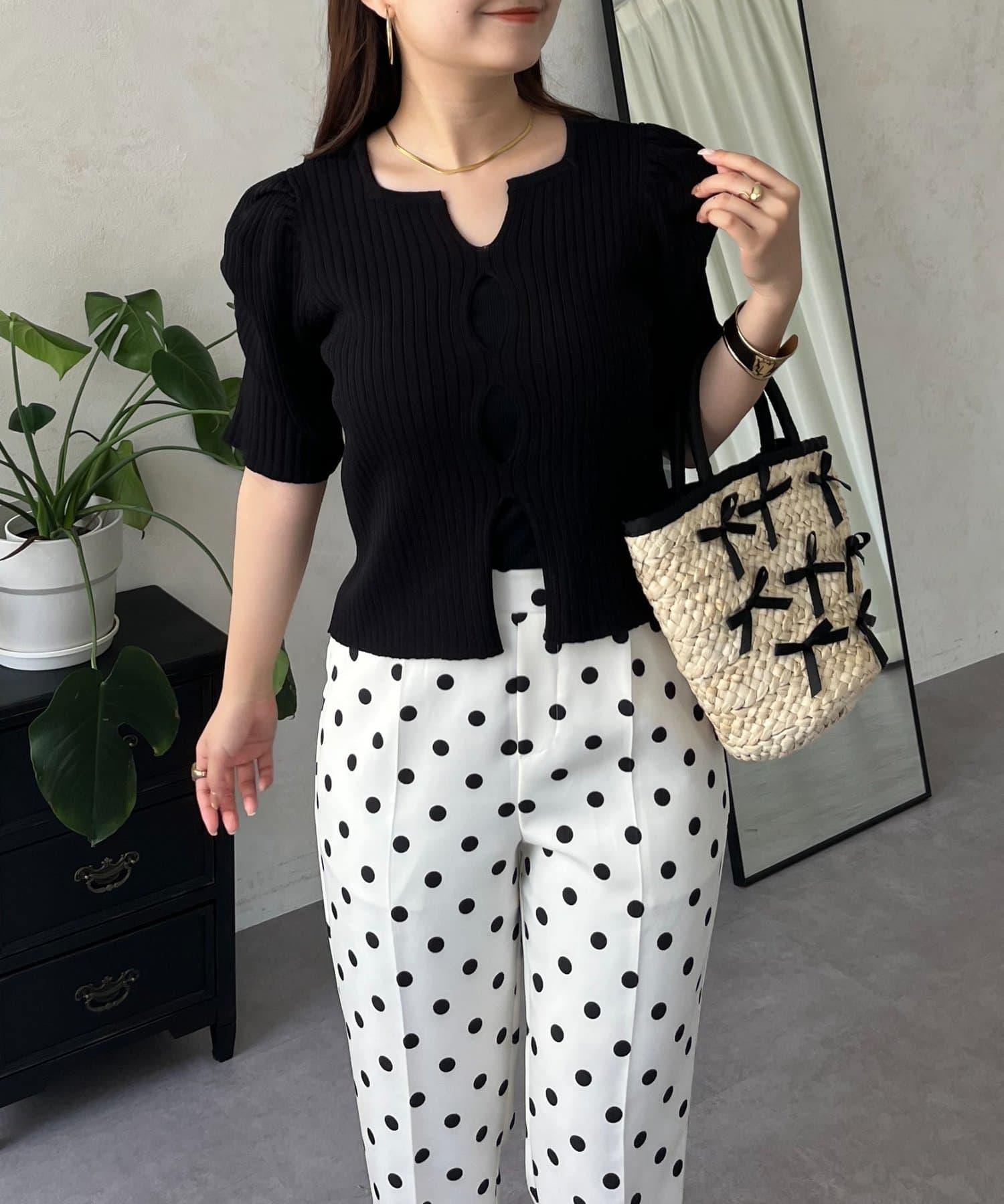 泡泡袖前開口條紋針織衫