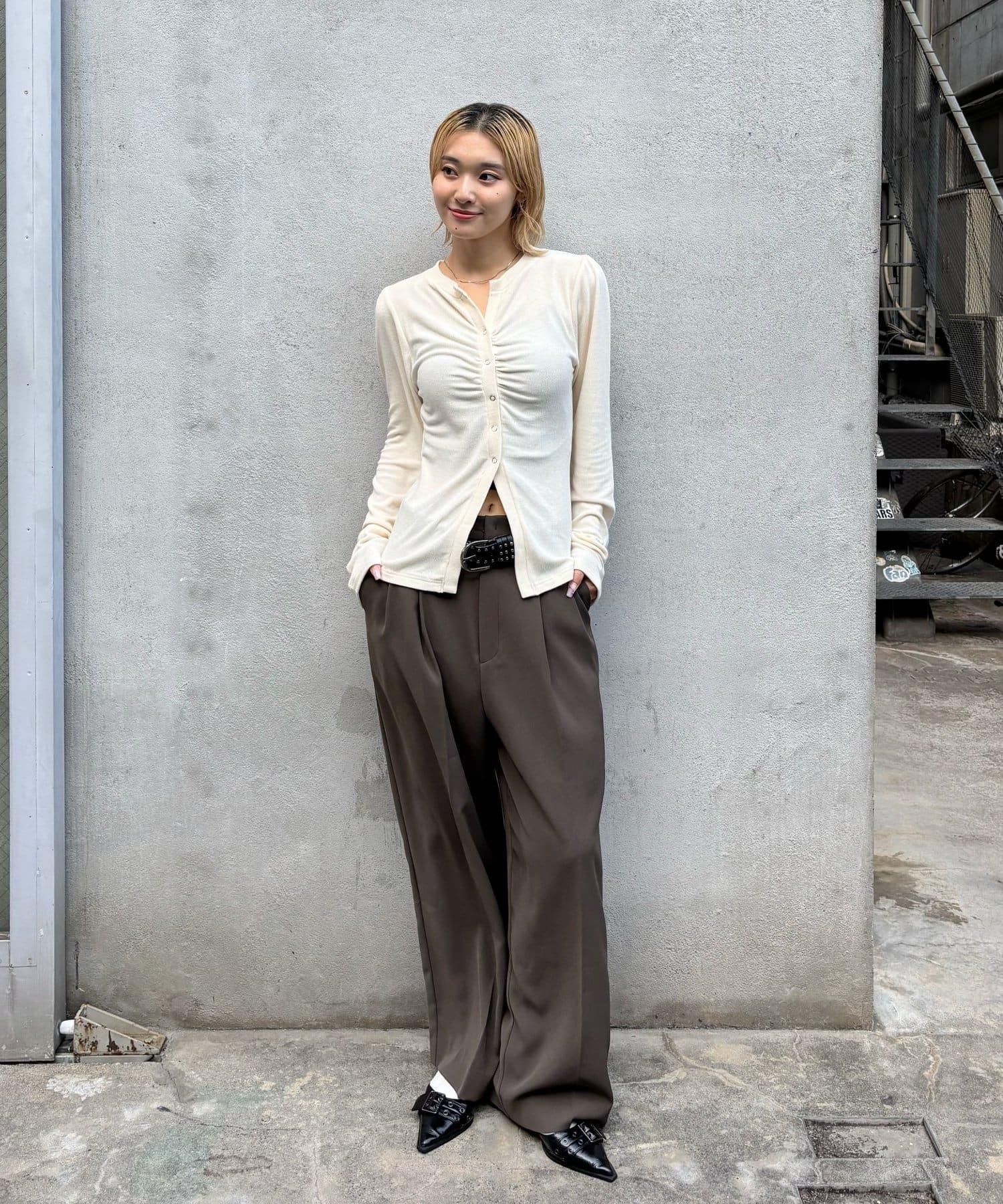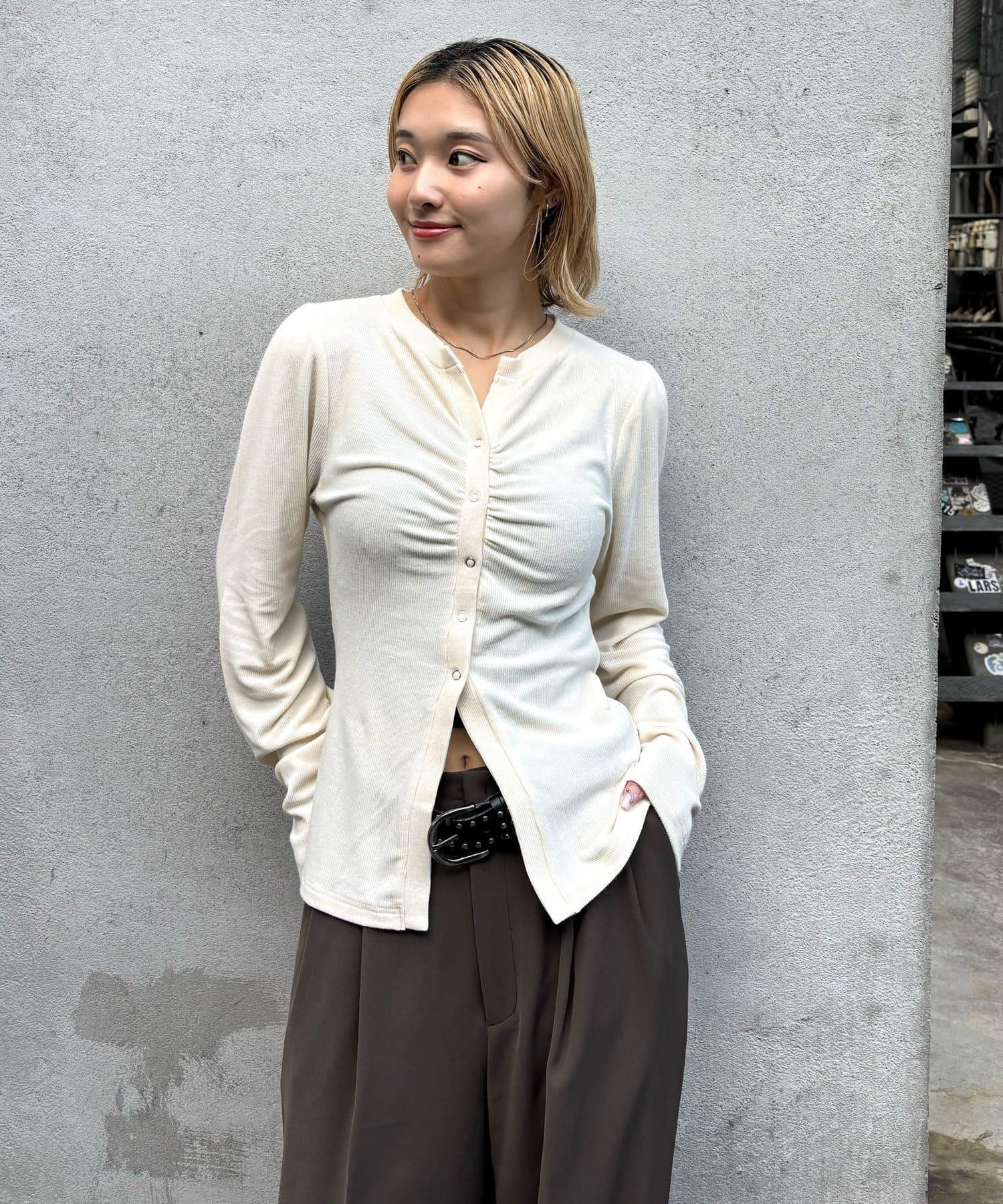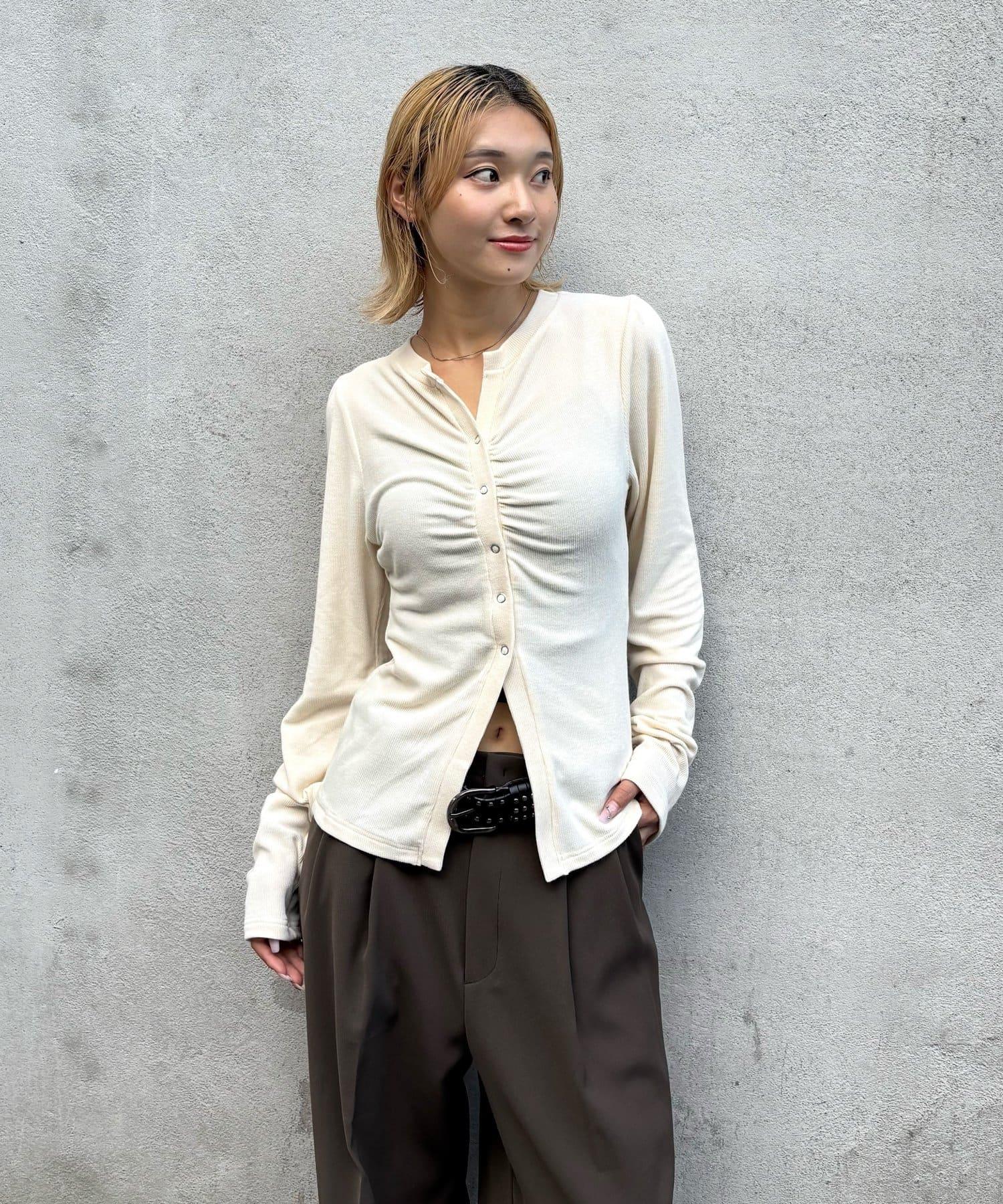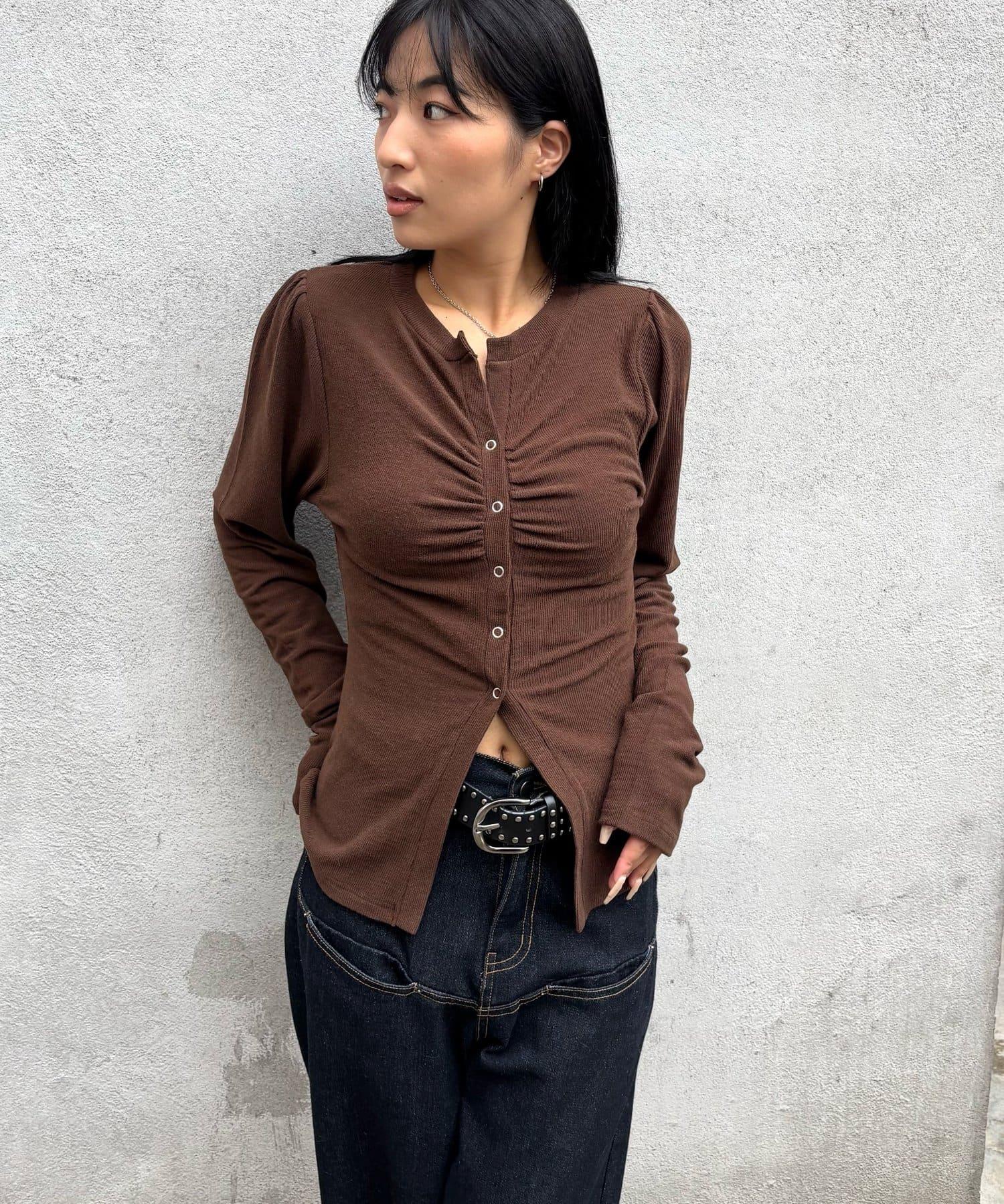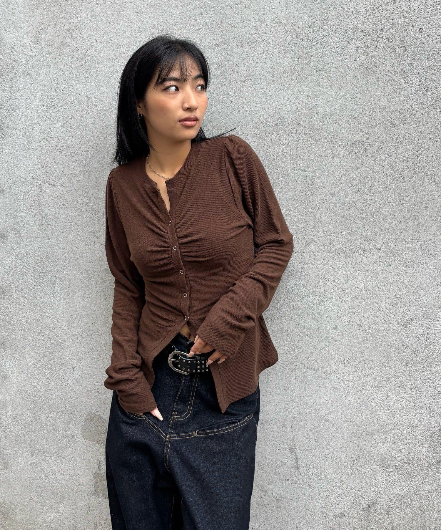 女性化的開襟羊毛衫,蓬鬆的袖子和前部的褶皺設計。