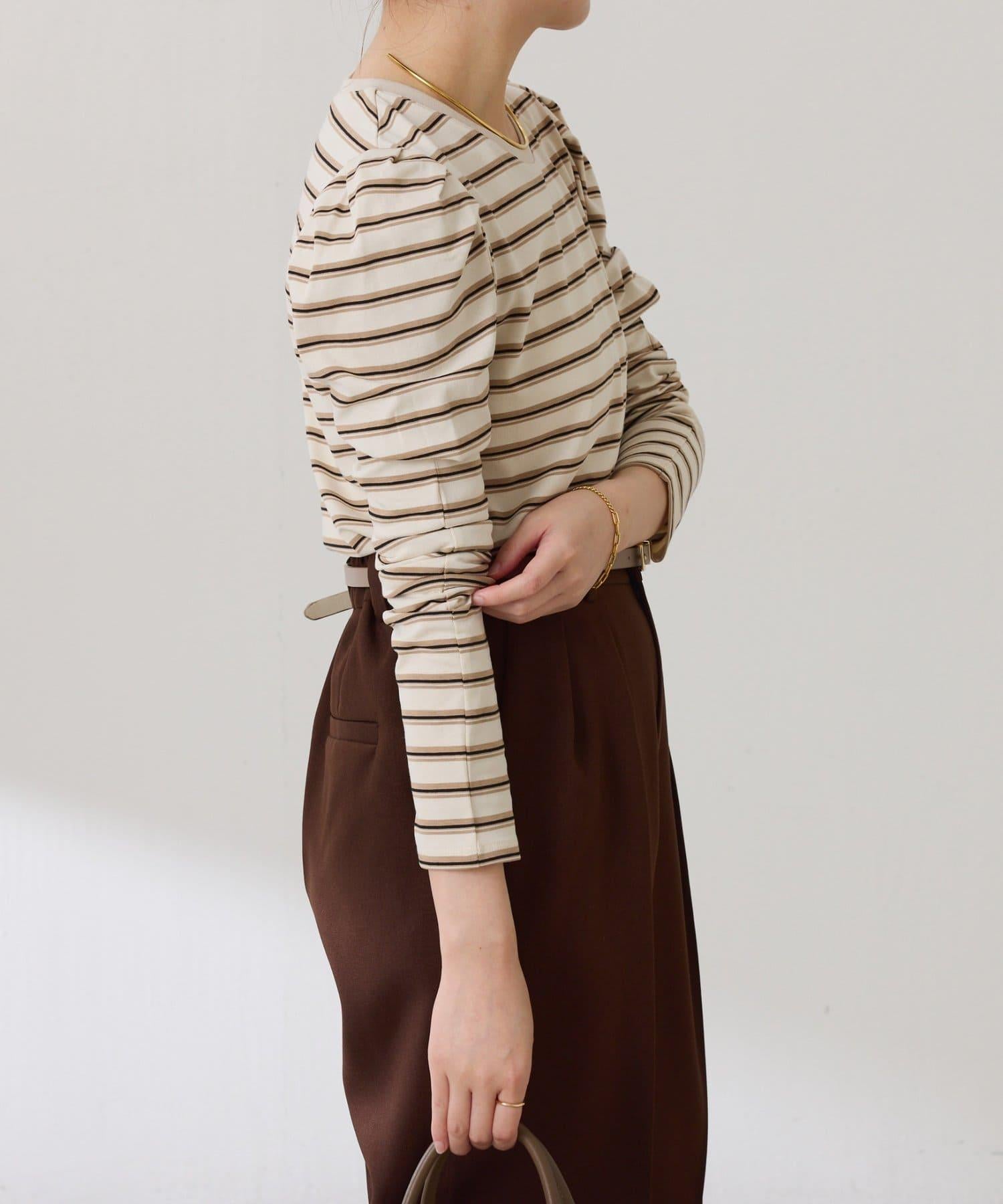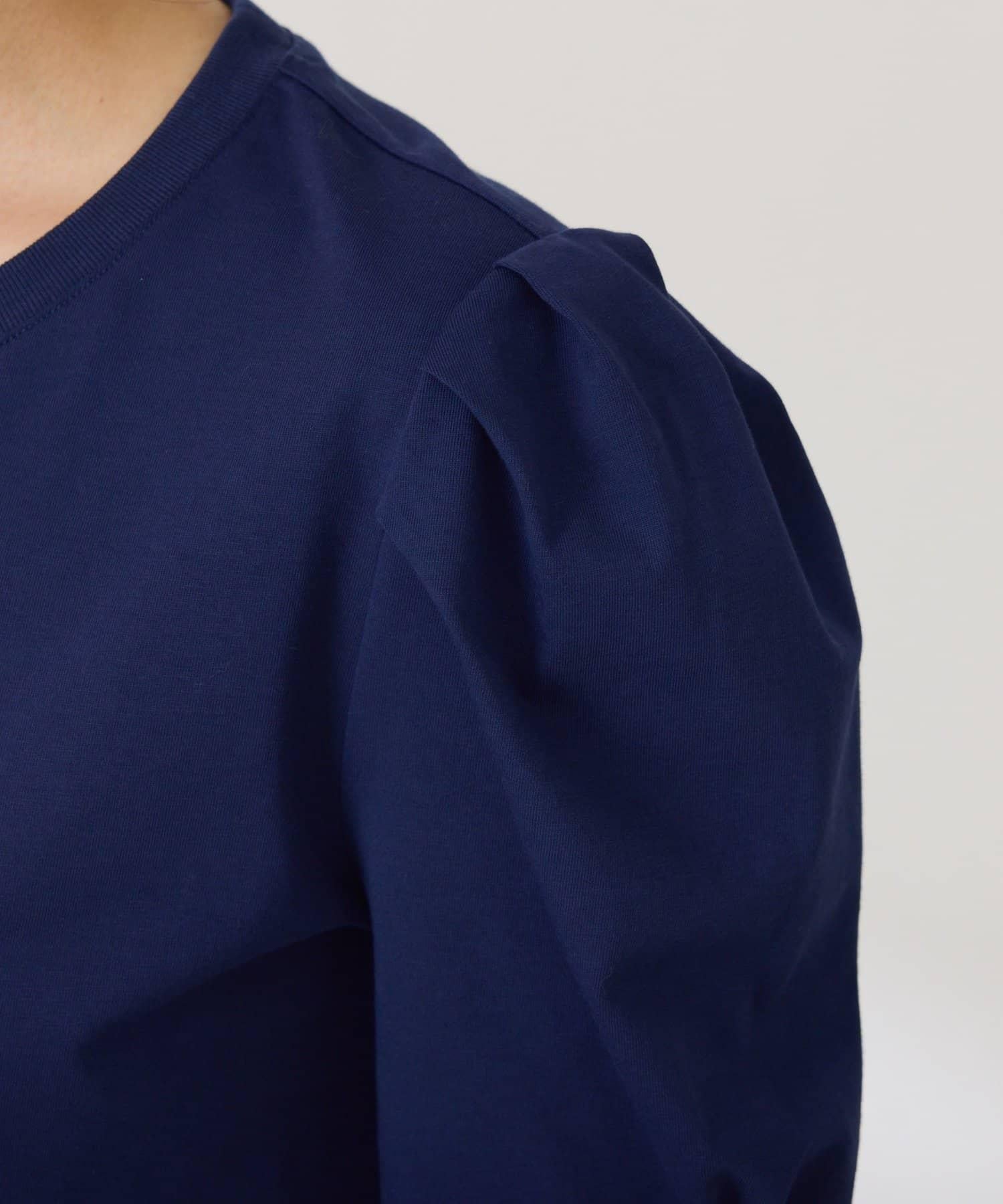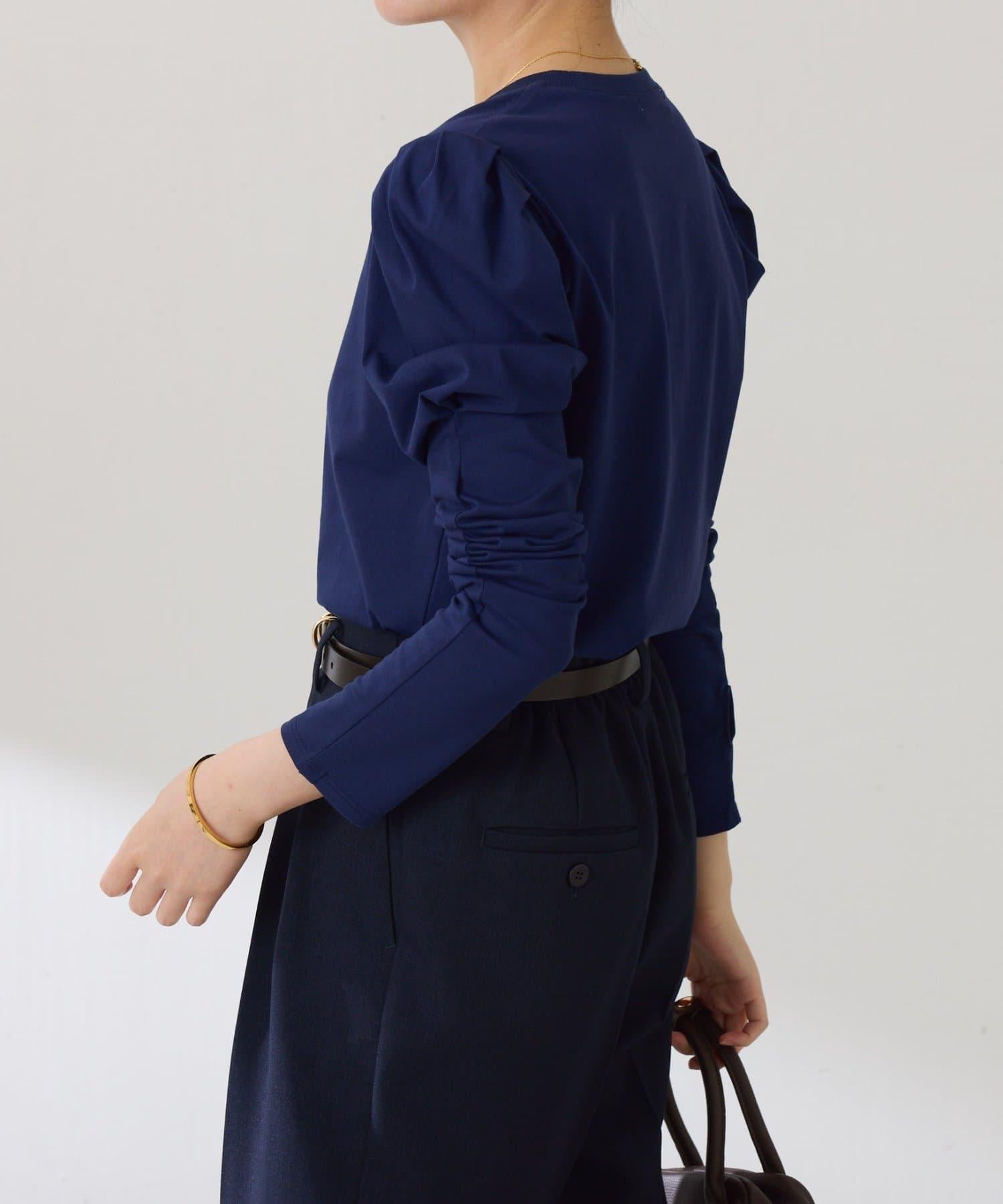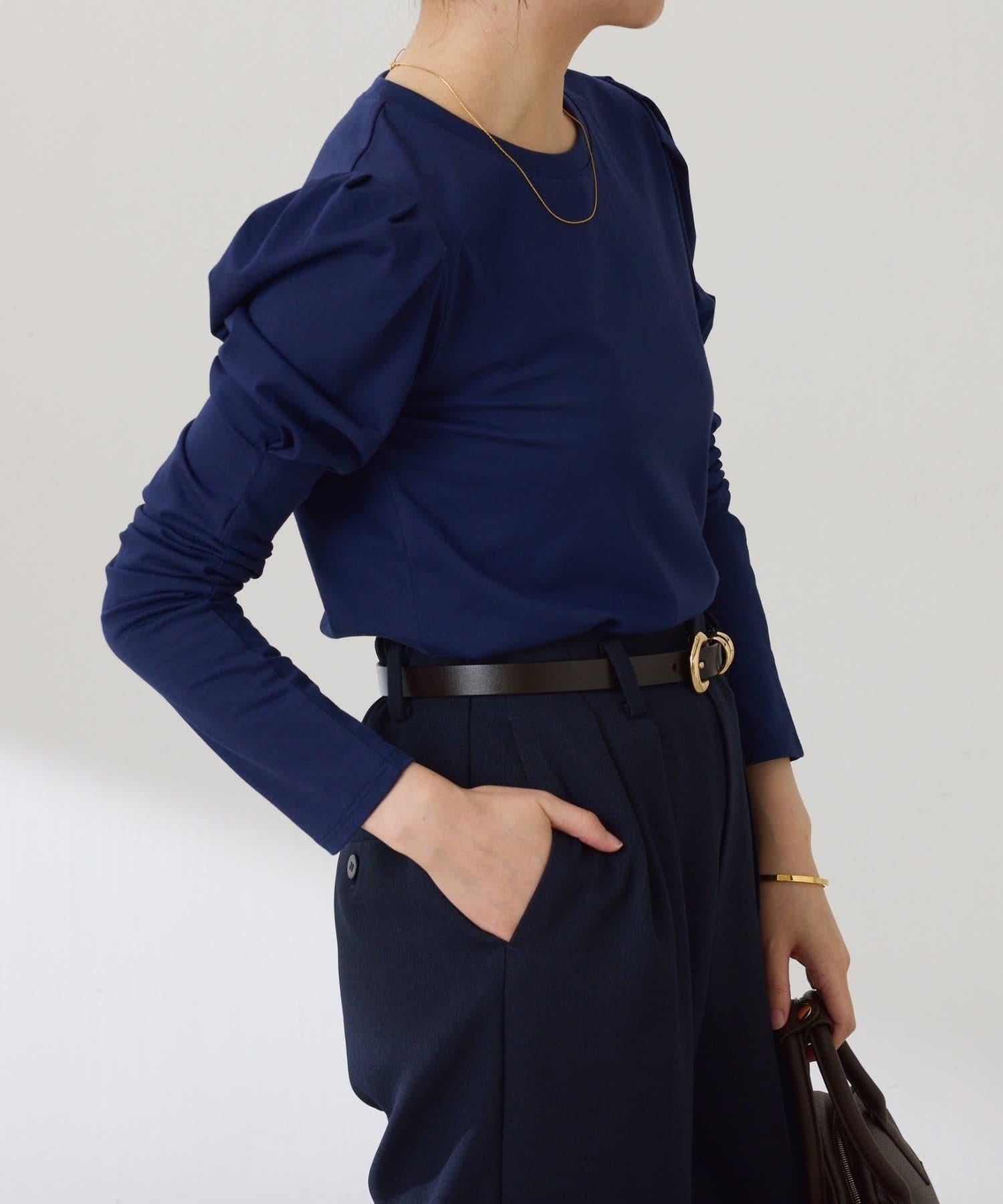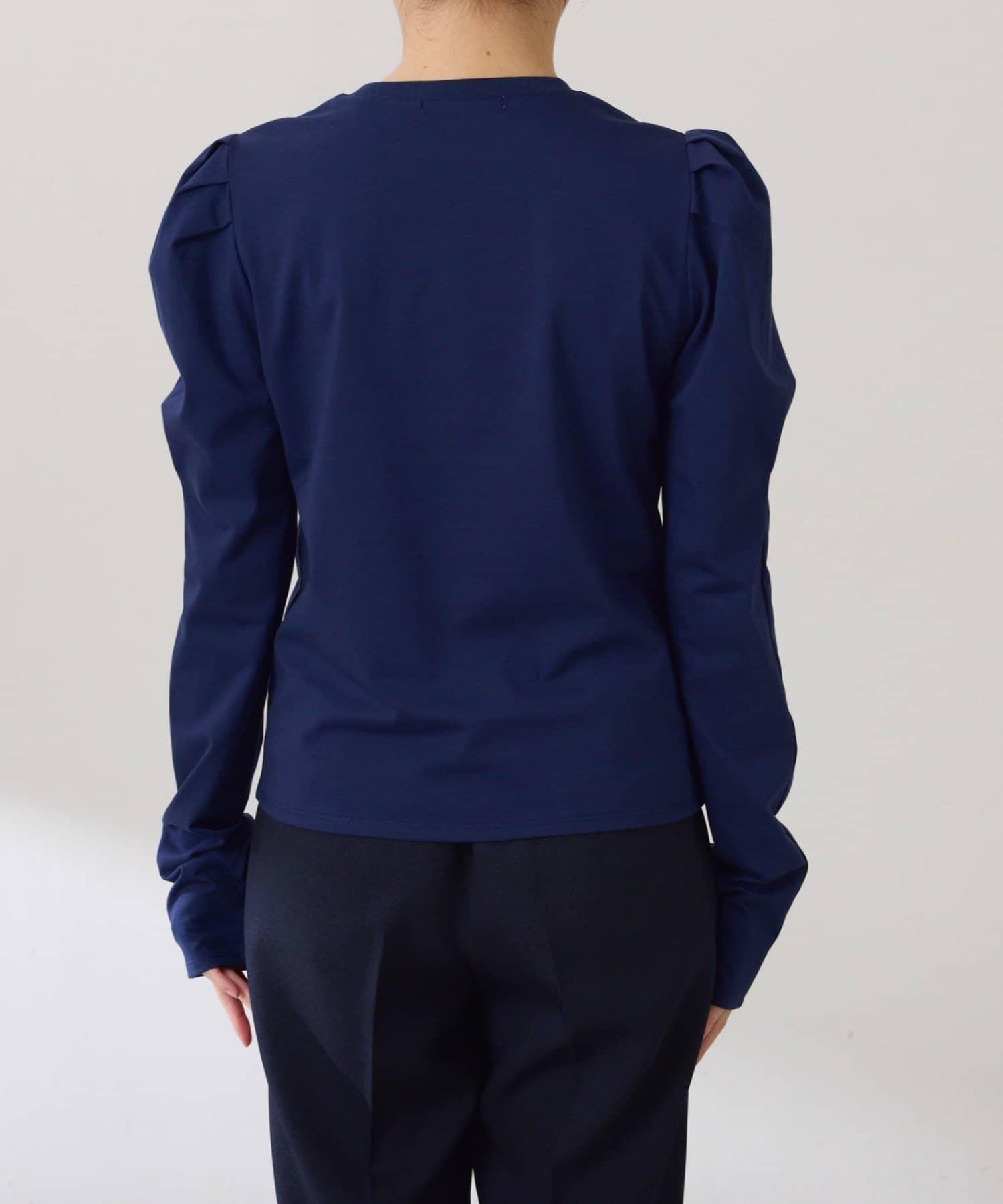這款剪裁縫製的上衣肩部蓬鬆,體積適中。