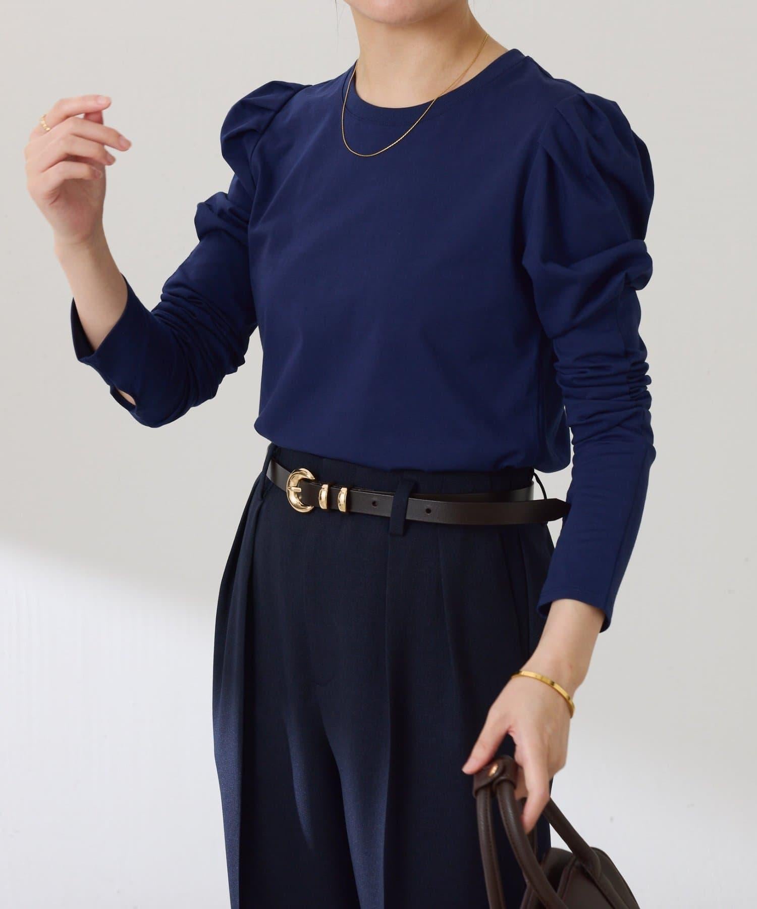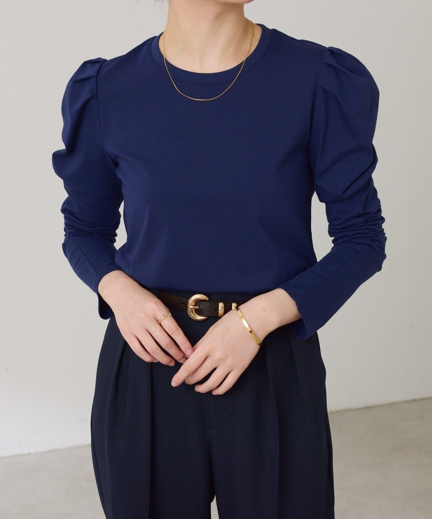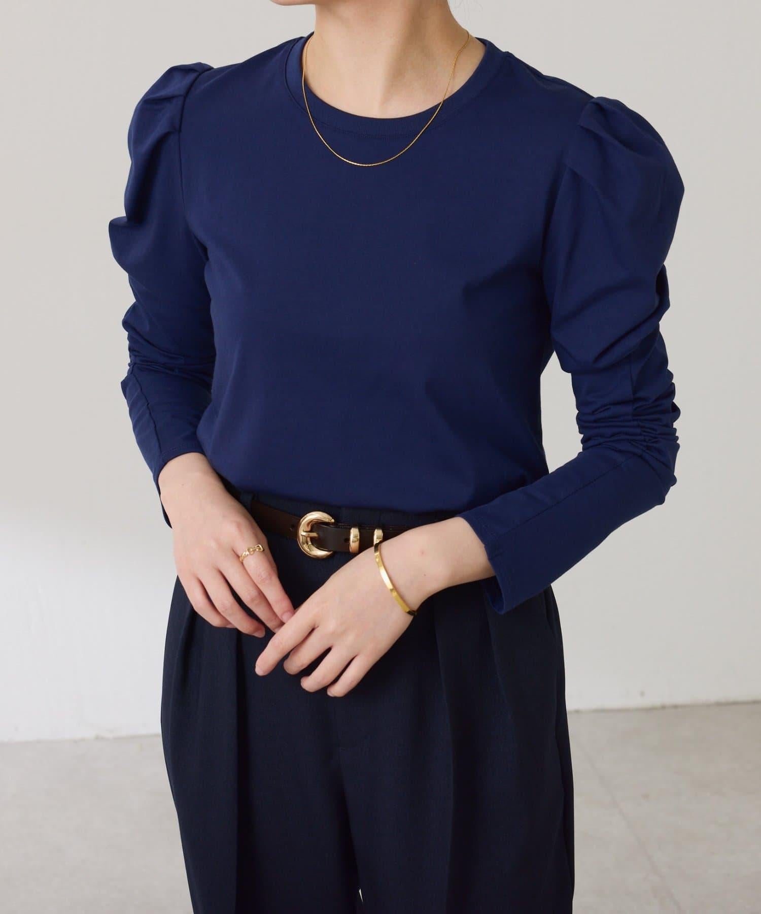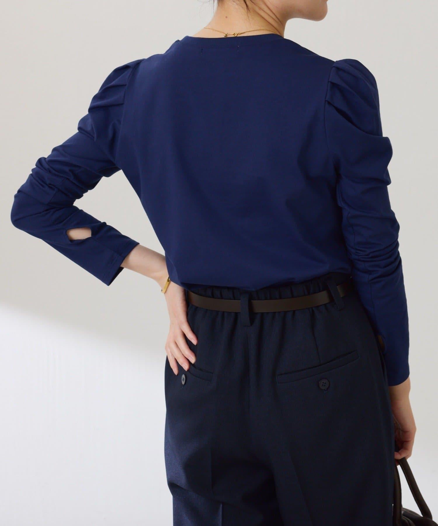 這款剪裁縫製的上衣肩部蓬鬆,體積適中。