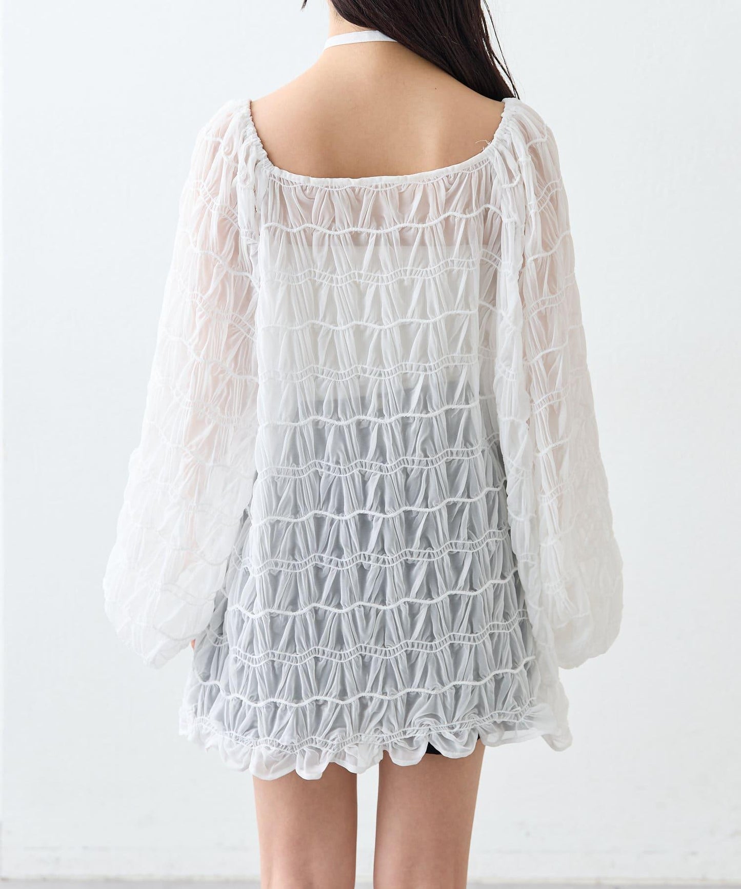 這款上衣的輪廓寬鬆,但薄紗材質給人一種可愛、寬鬆的感覺。