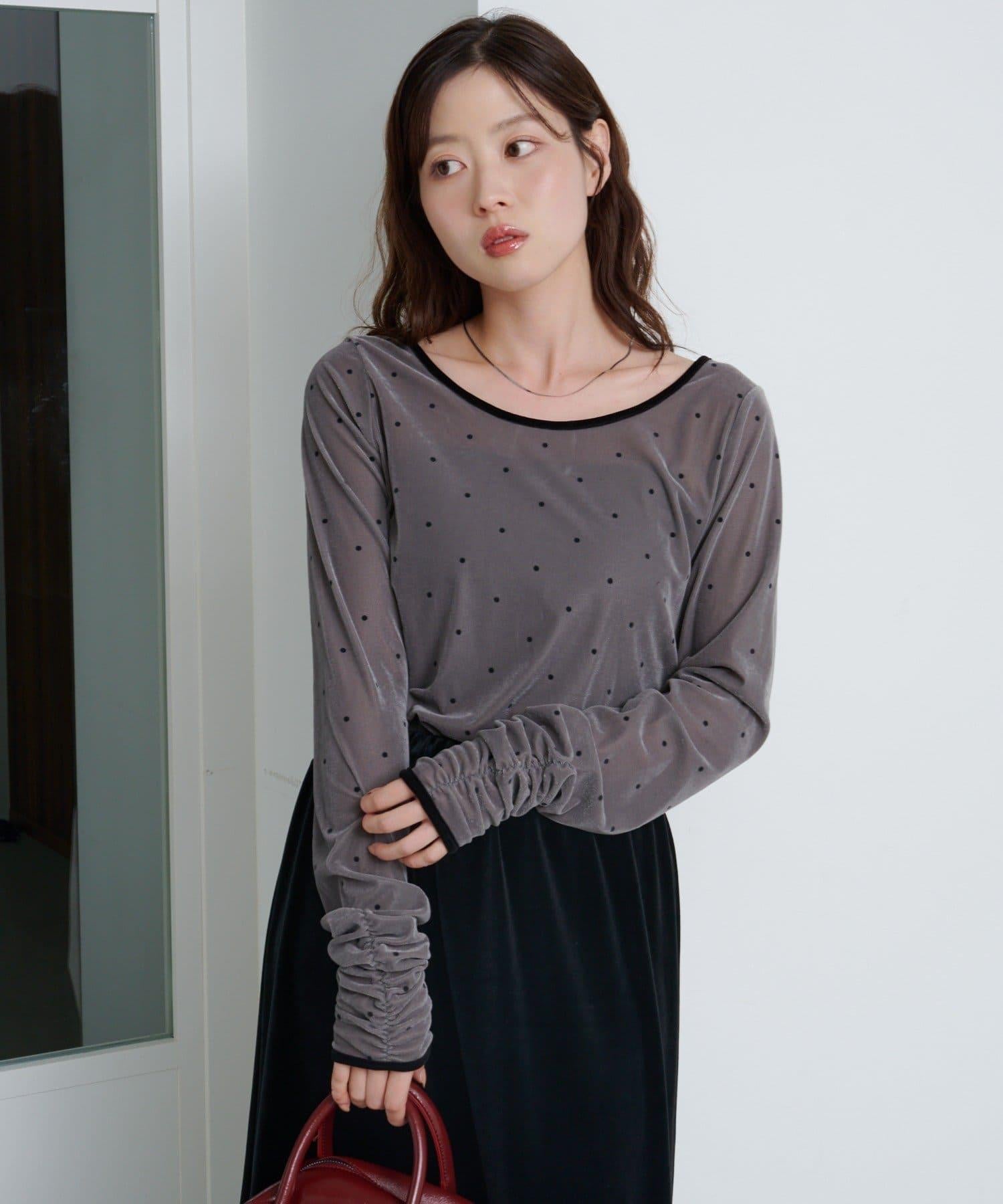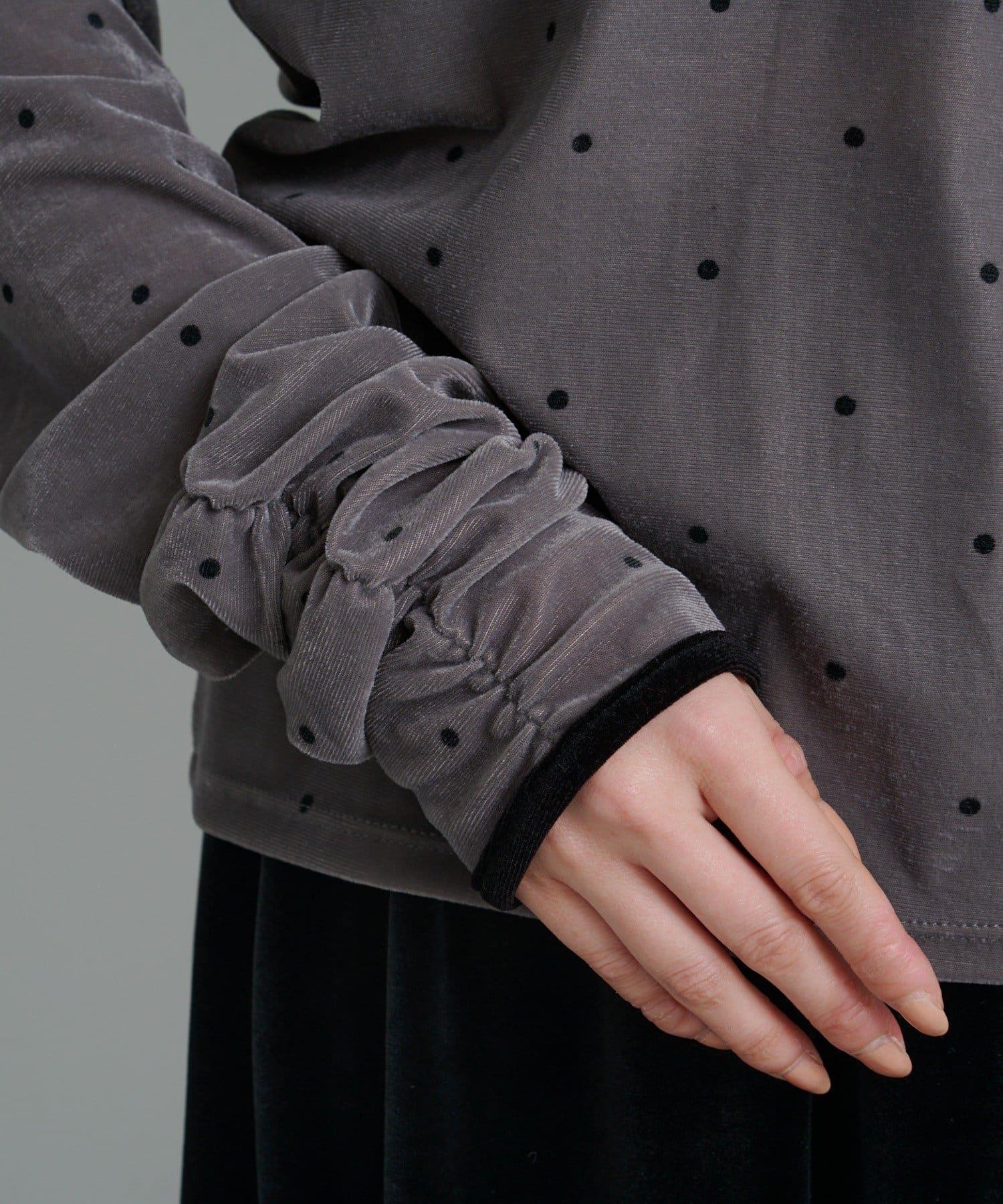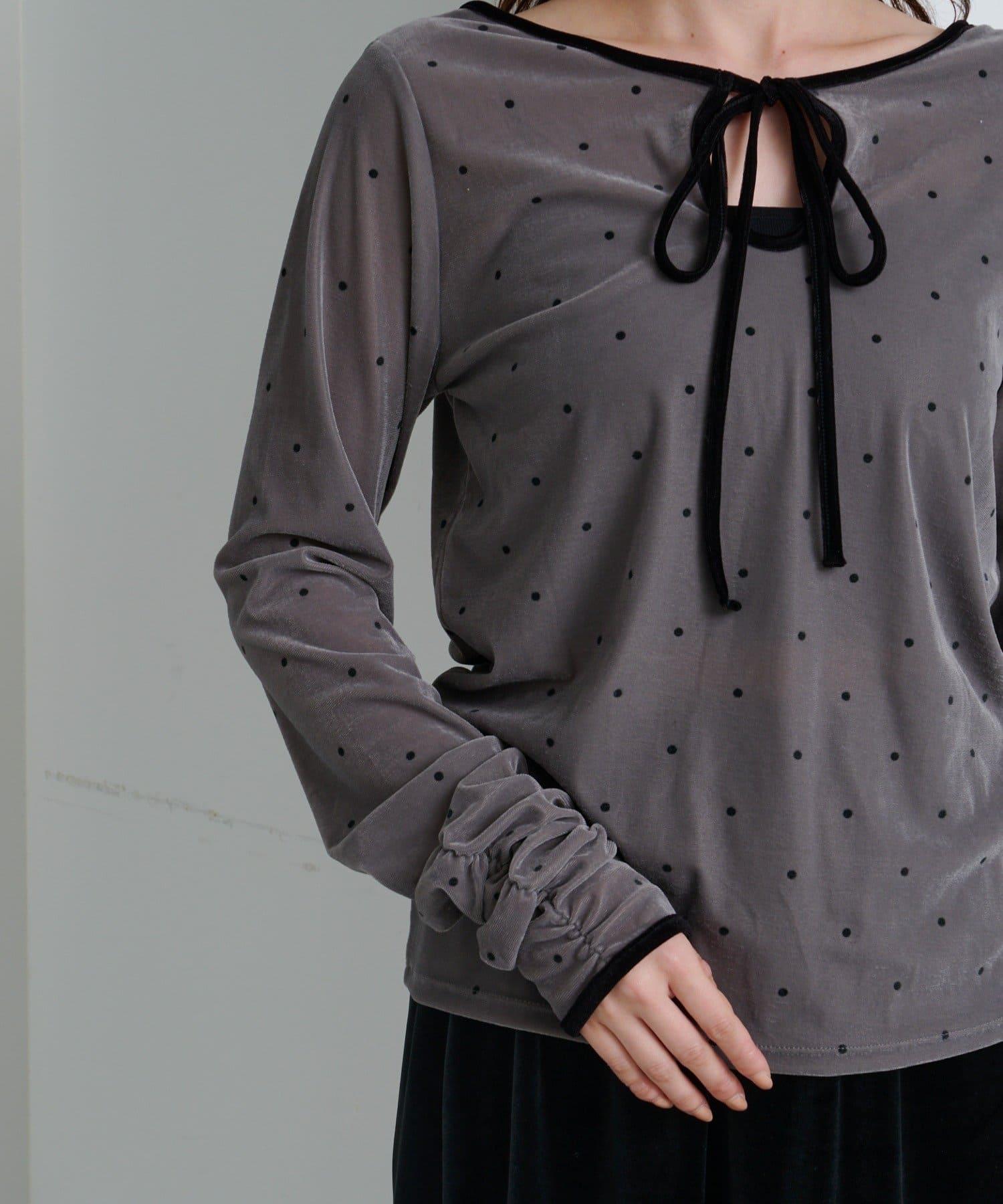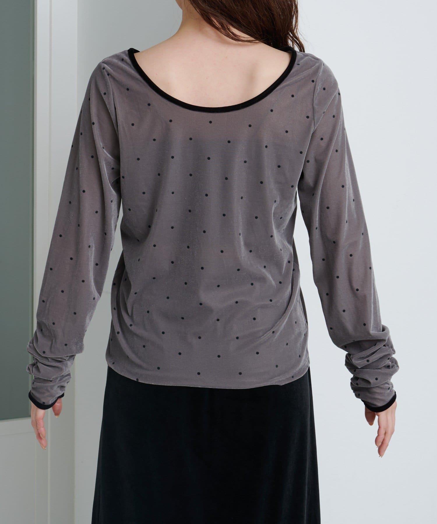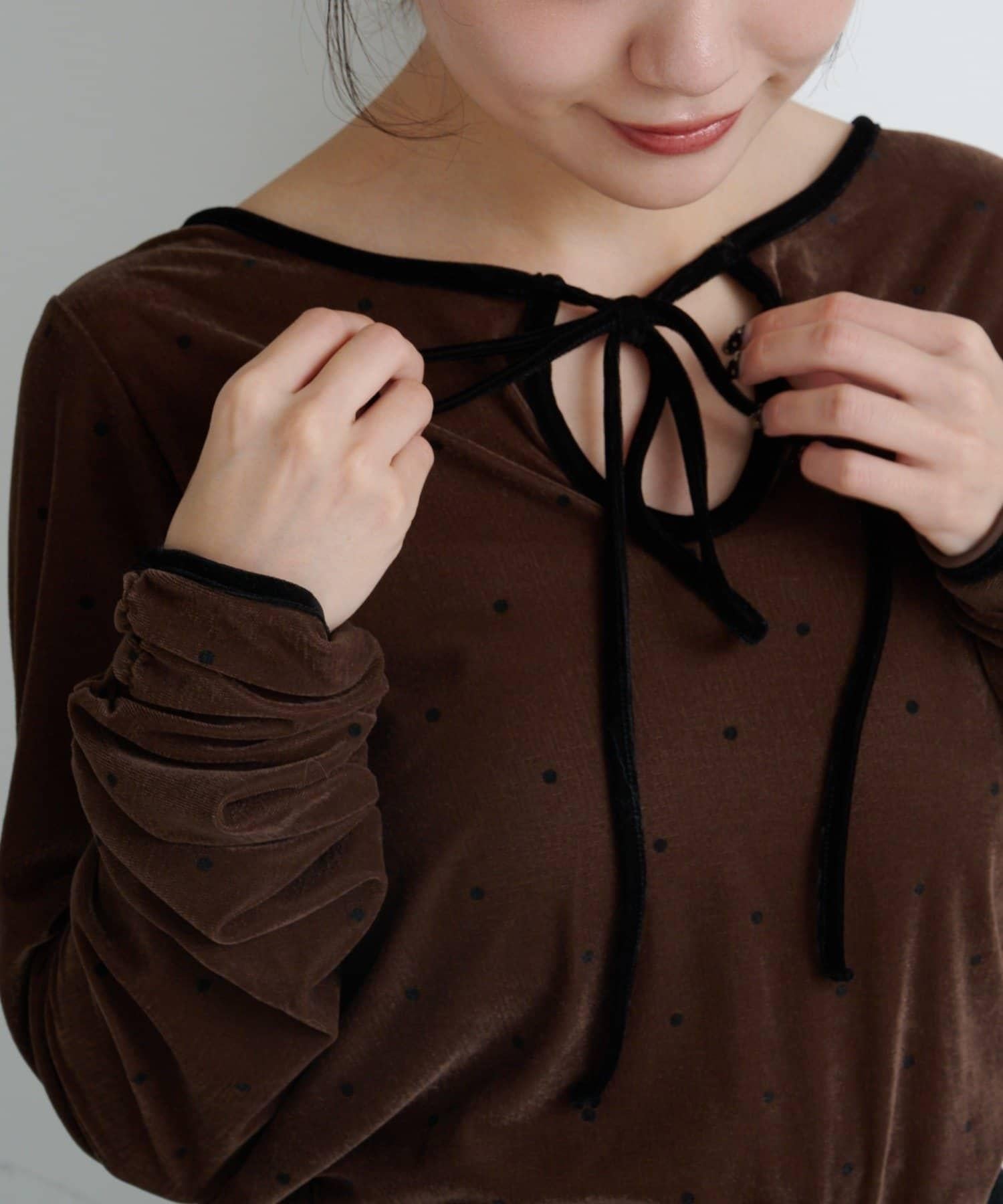 天鵝絨套頭衫,帶有醒目的圓點圖案和彩色滾邊。