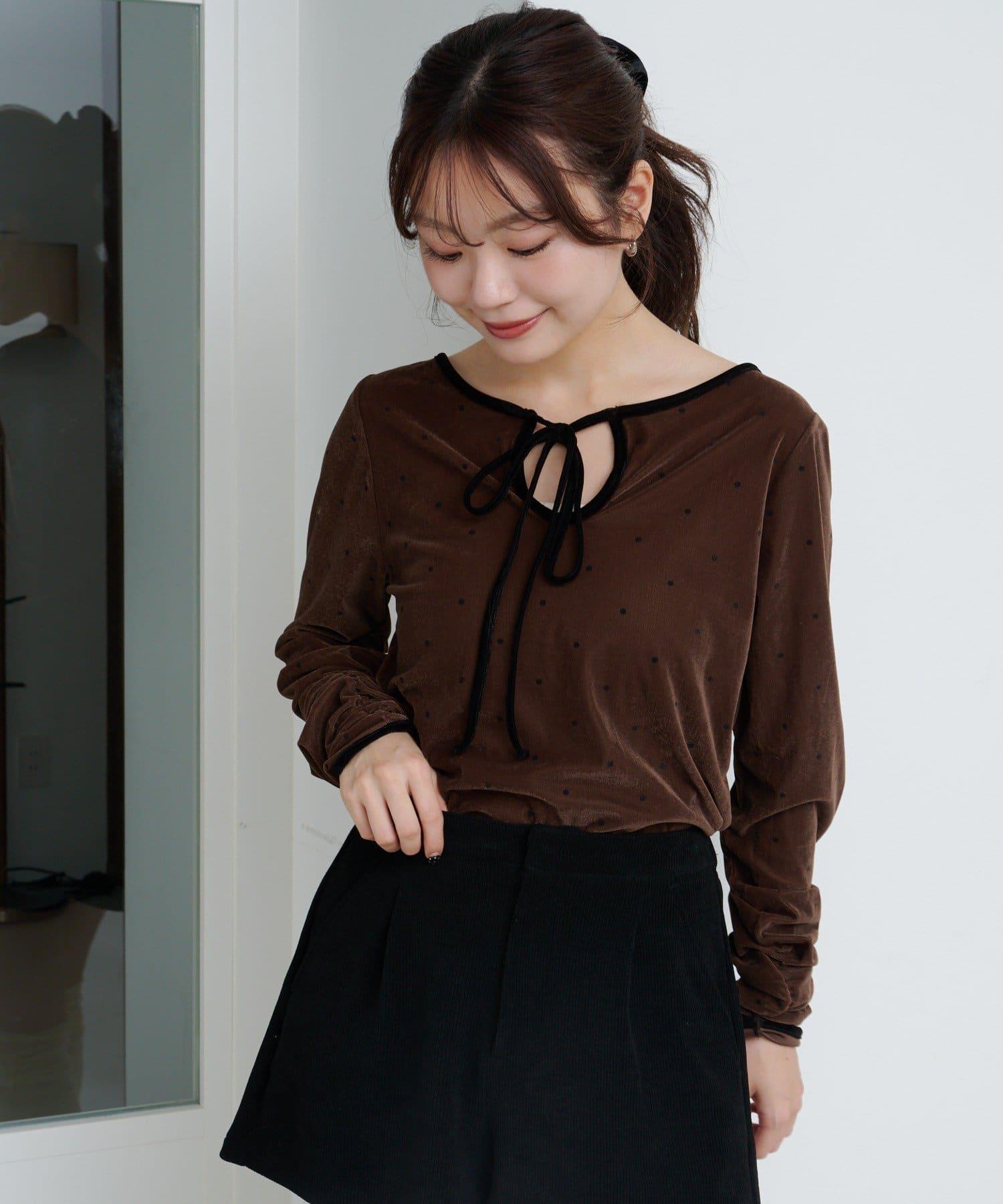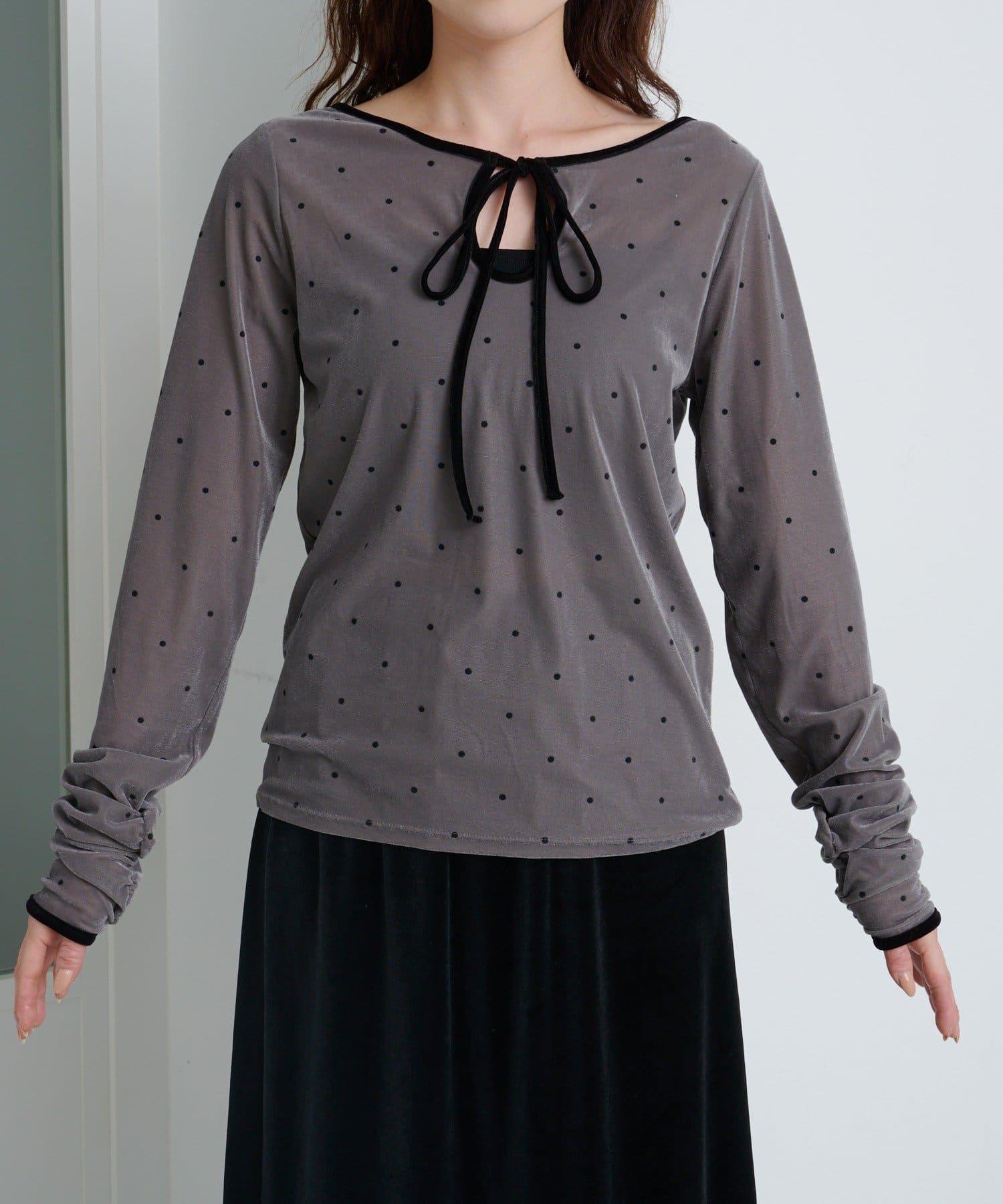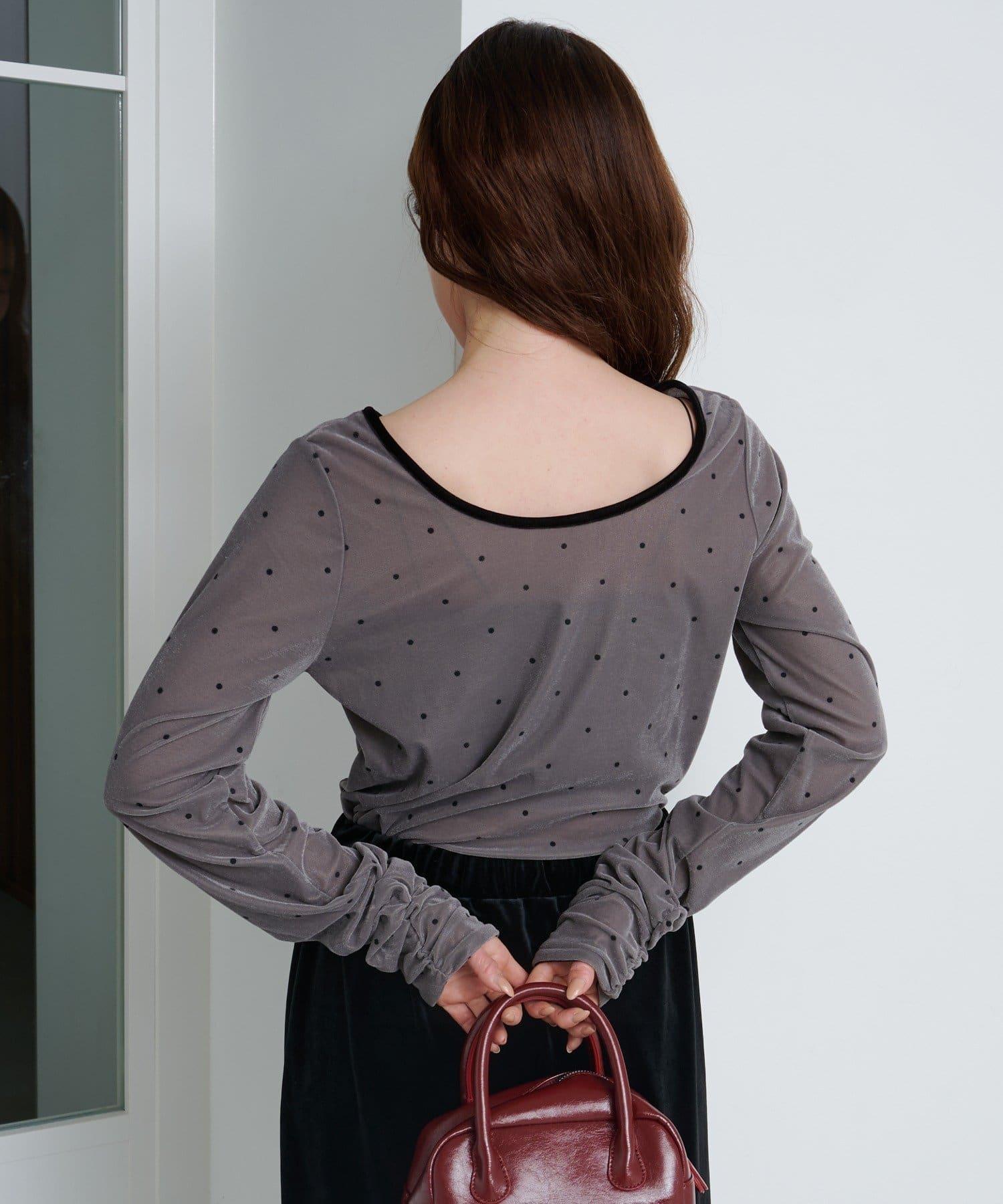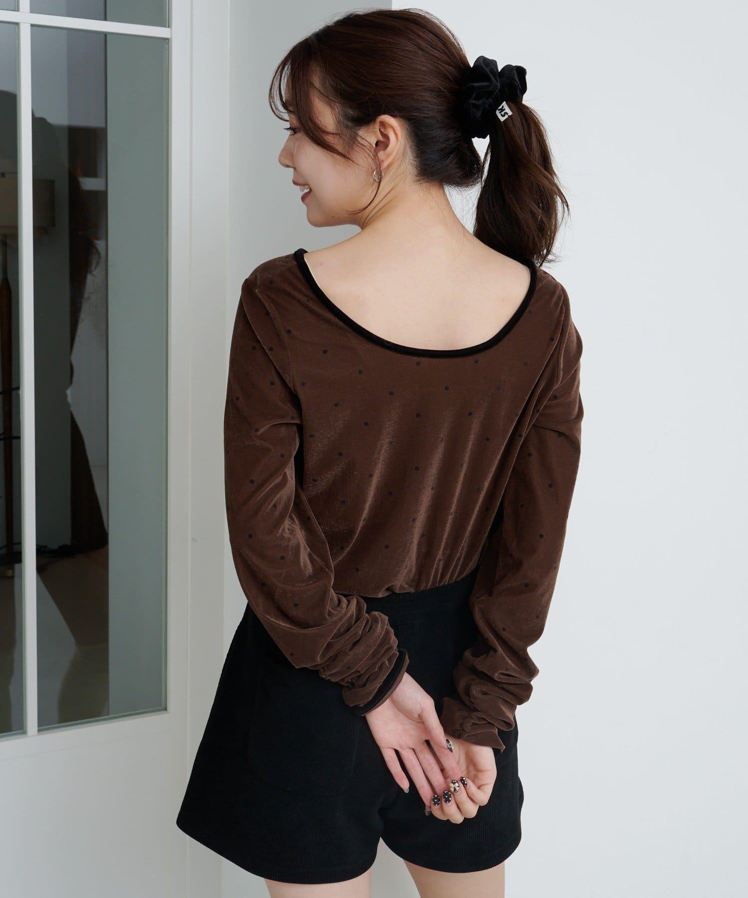 天鵝絨套頭衫,帶有醒目的圓點圖案和彩色滾邊。