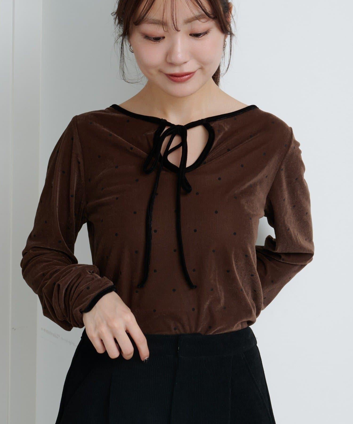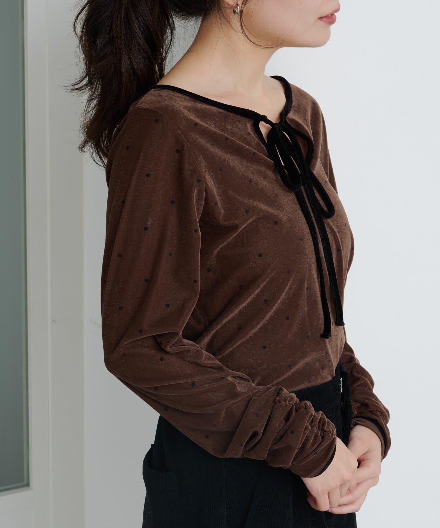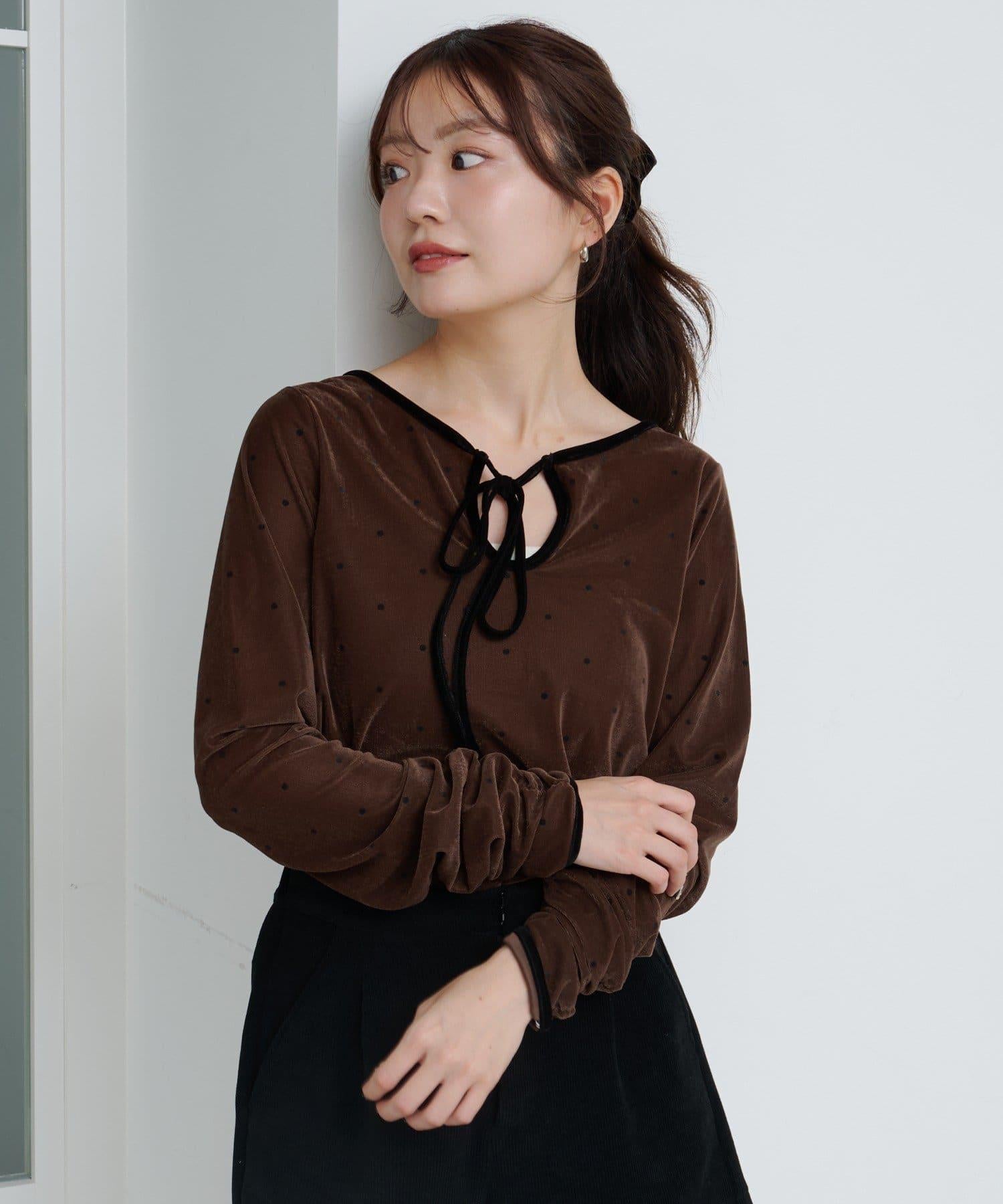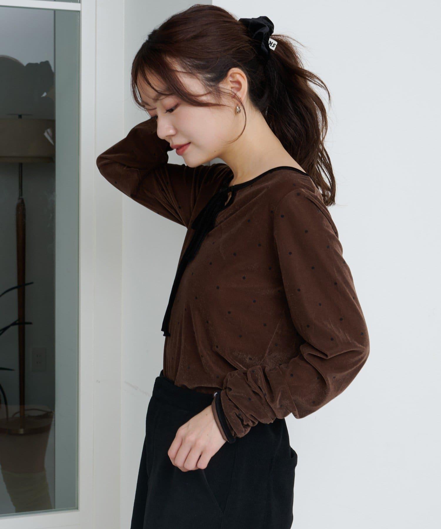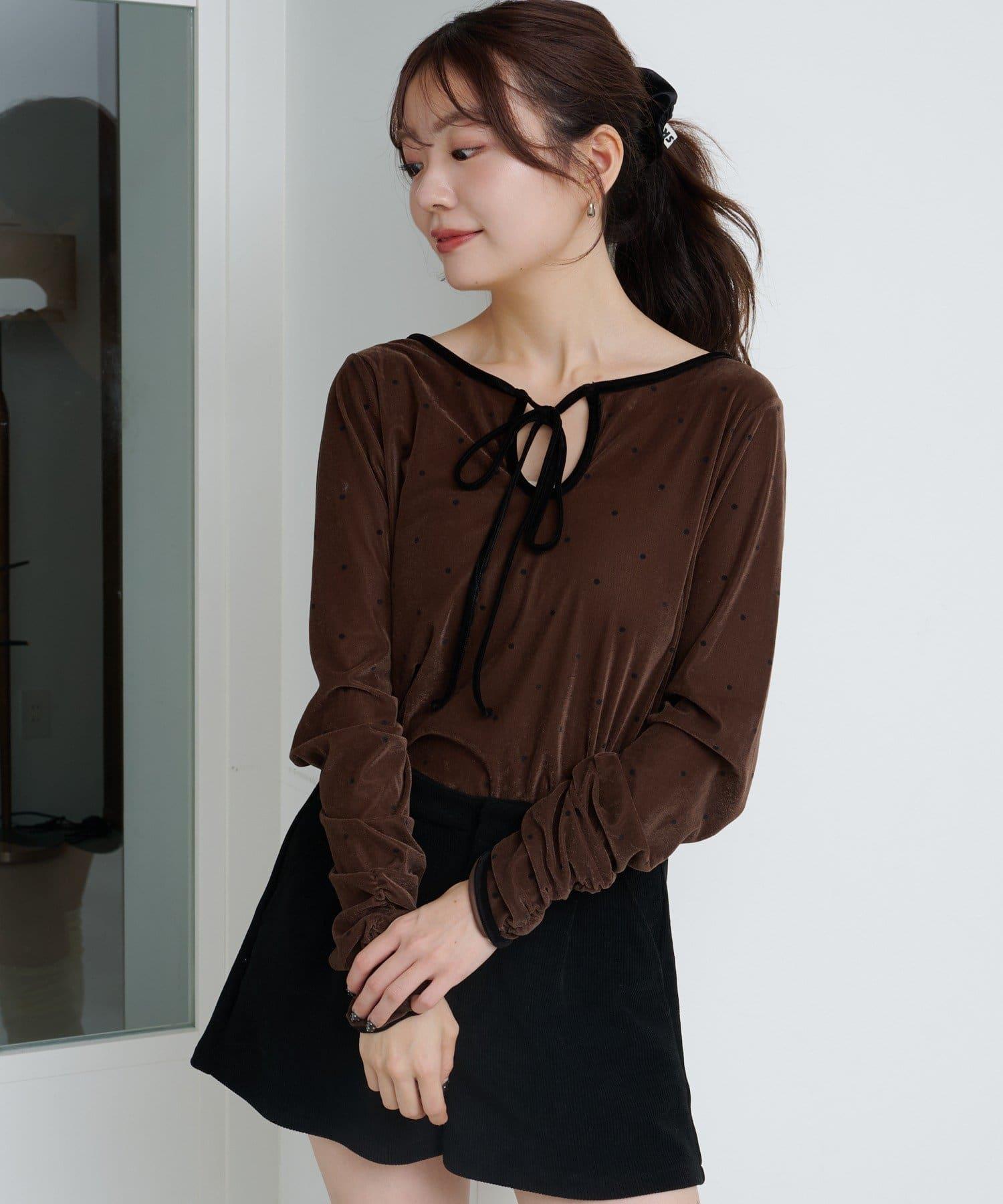 天鵝絨套頭衫,帶有醒目的圓點圖案和彩色滾邊。