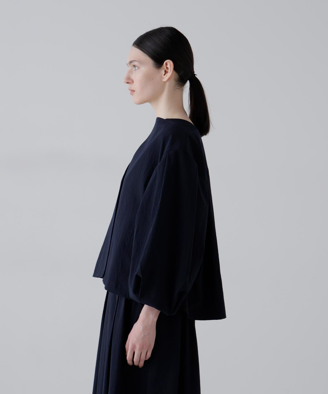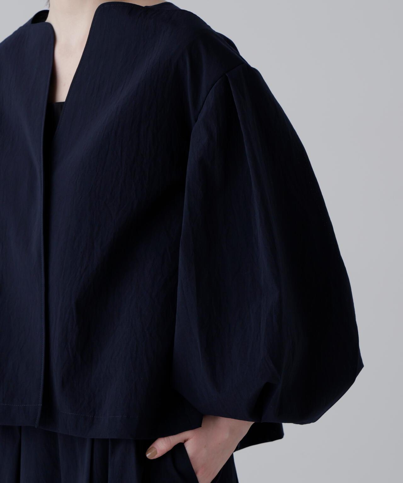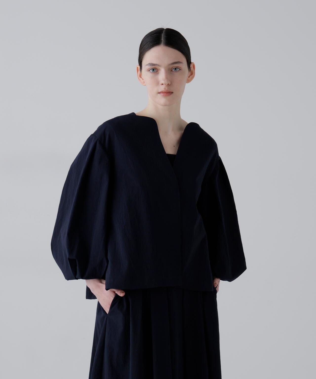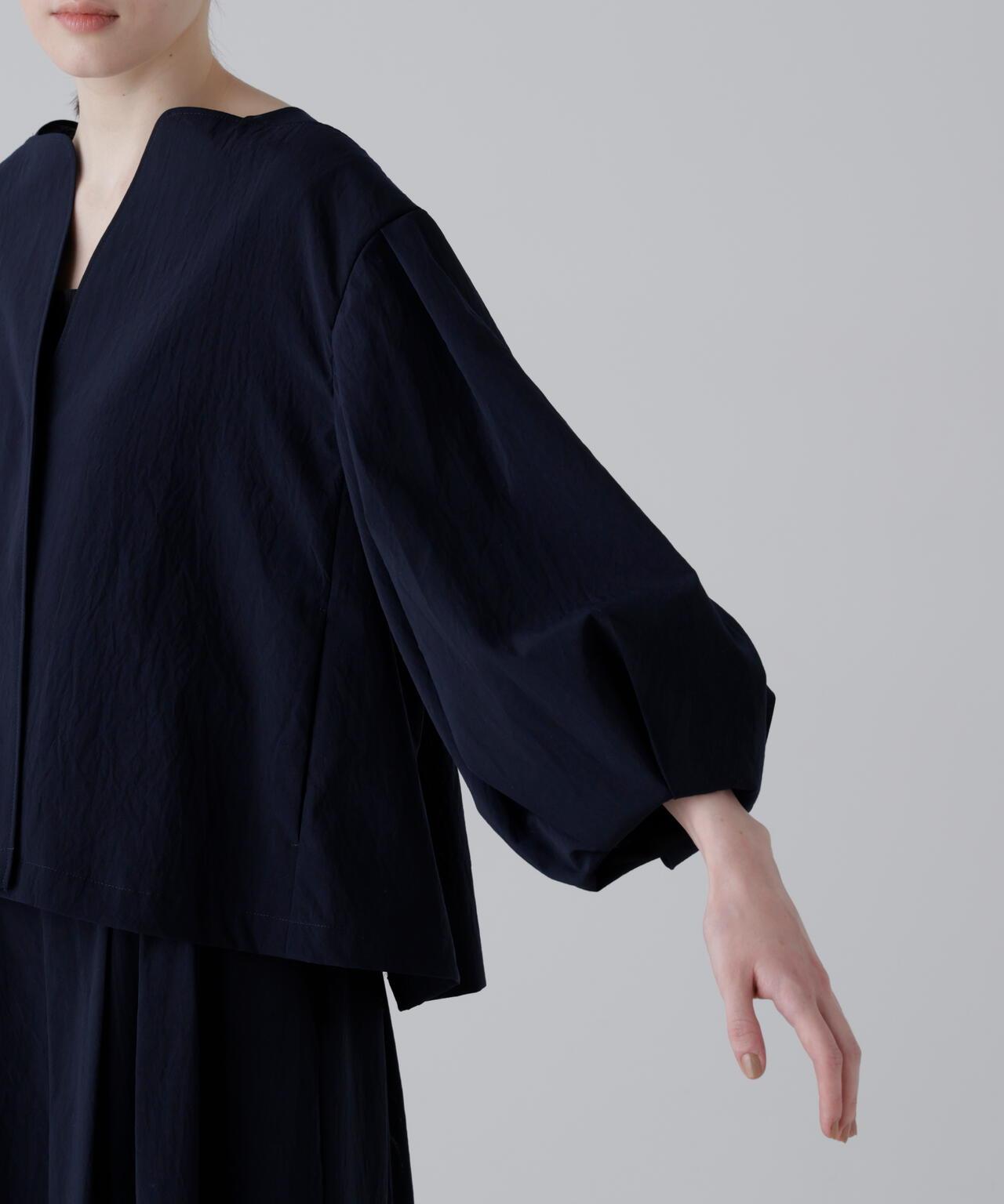 點狀網眼無領夾克,採用輕盈柔軟的面料製成。衣袖採用氣球式設計,衣身後部也採用了褶襉設計。東麗開發了高度透氣和輕質的 "Dot Air"。這種面料採用梭織,但設計有細密的網眼狀孔洞,並經過滾筒處理,使其具有自然的皺褶和蓬鬆感。