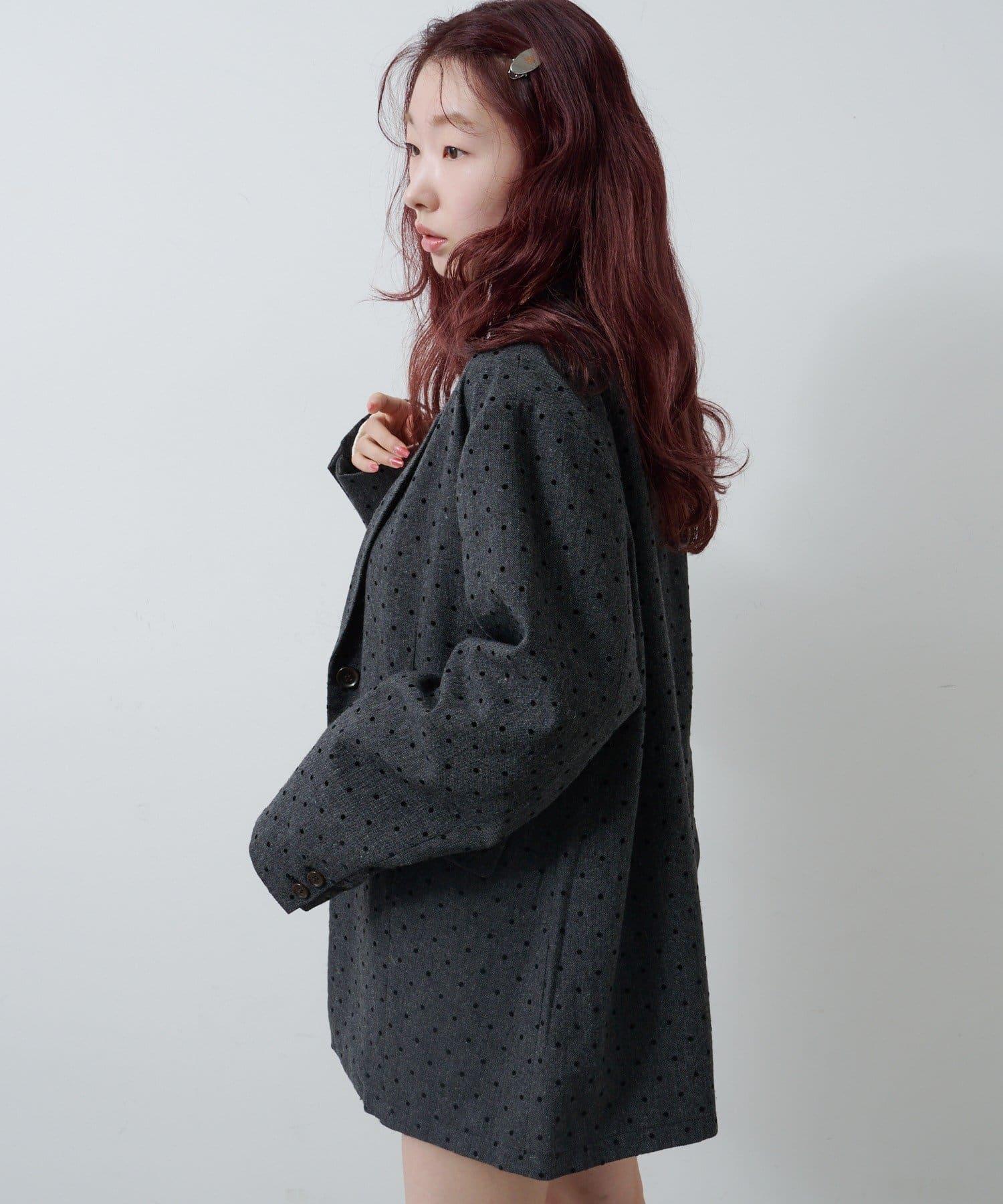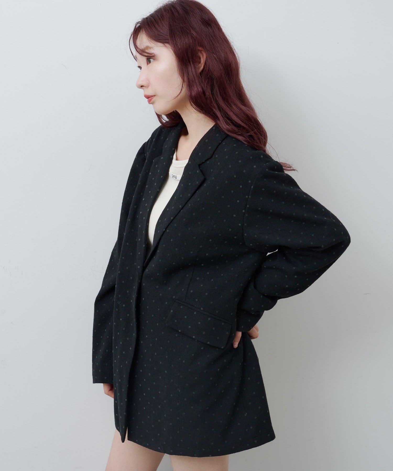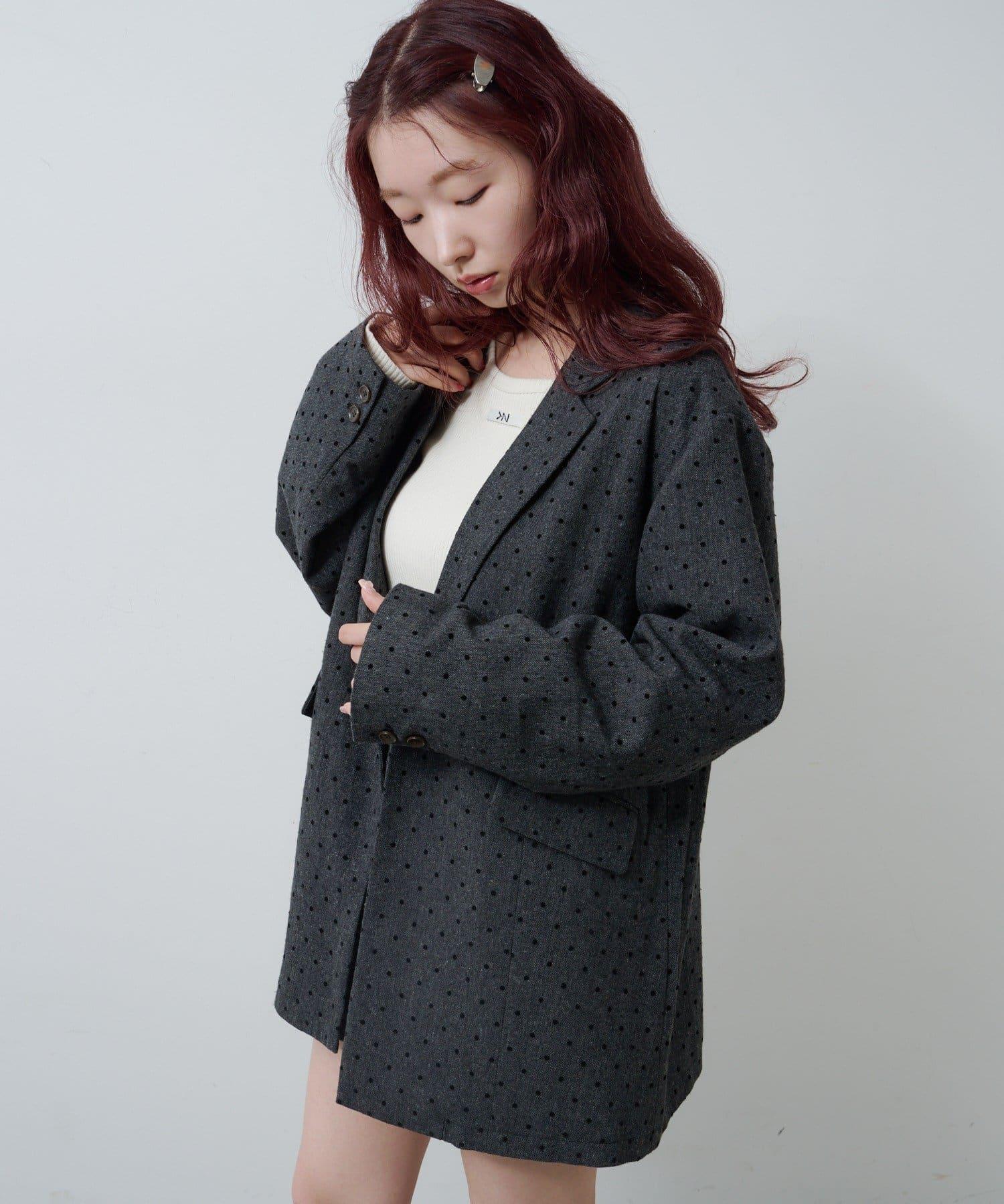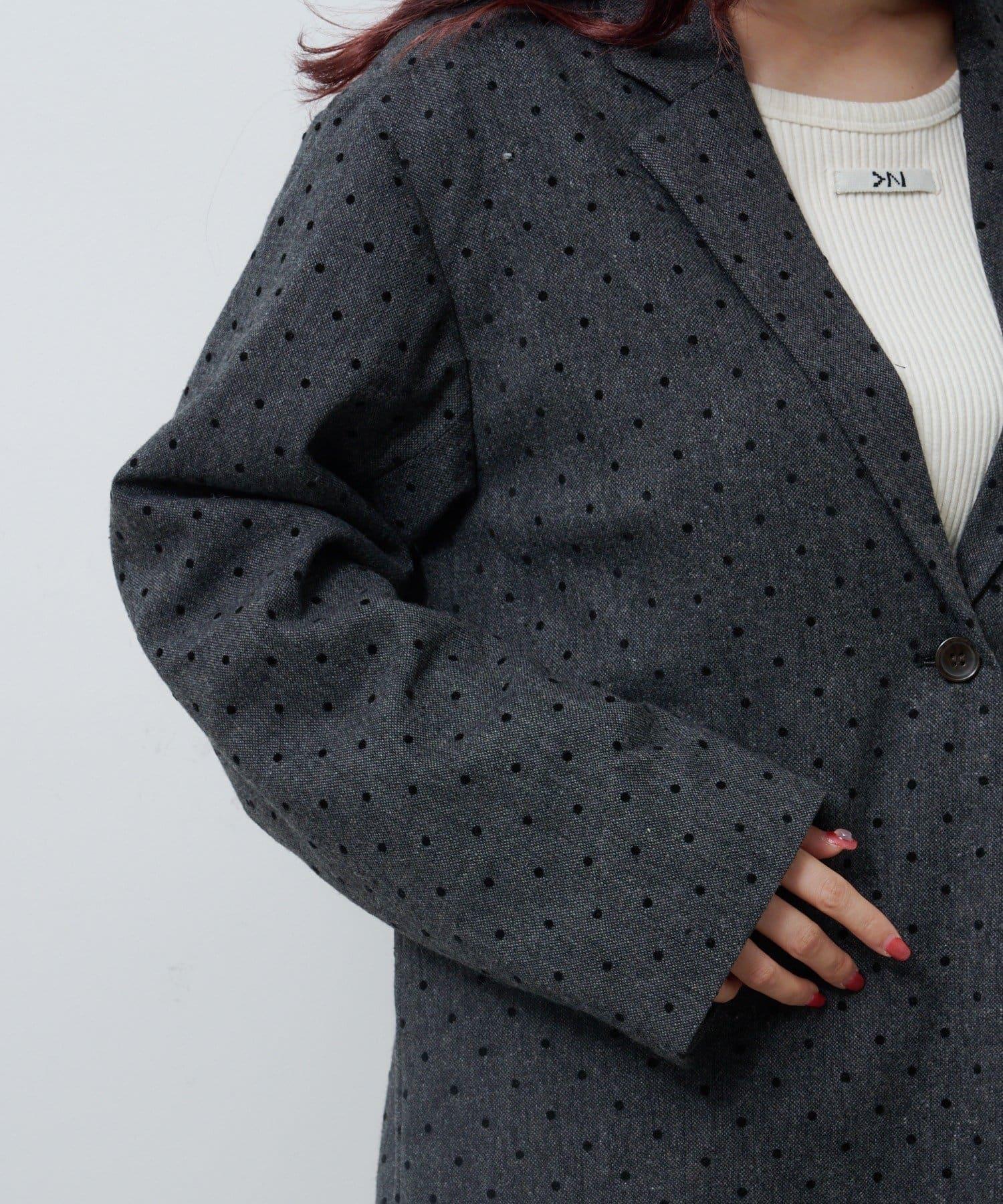 點狀圖案為男性化的剪裁設計增添了女性的柔美。
