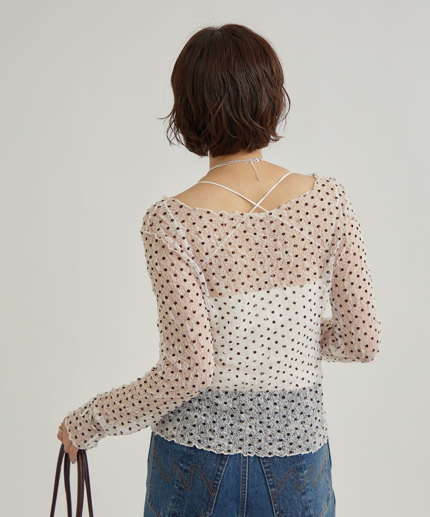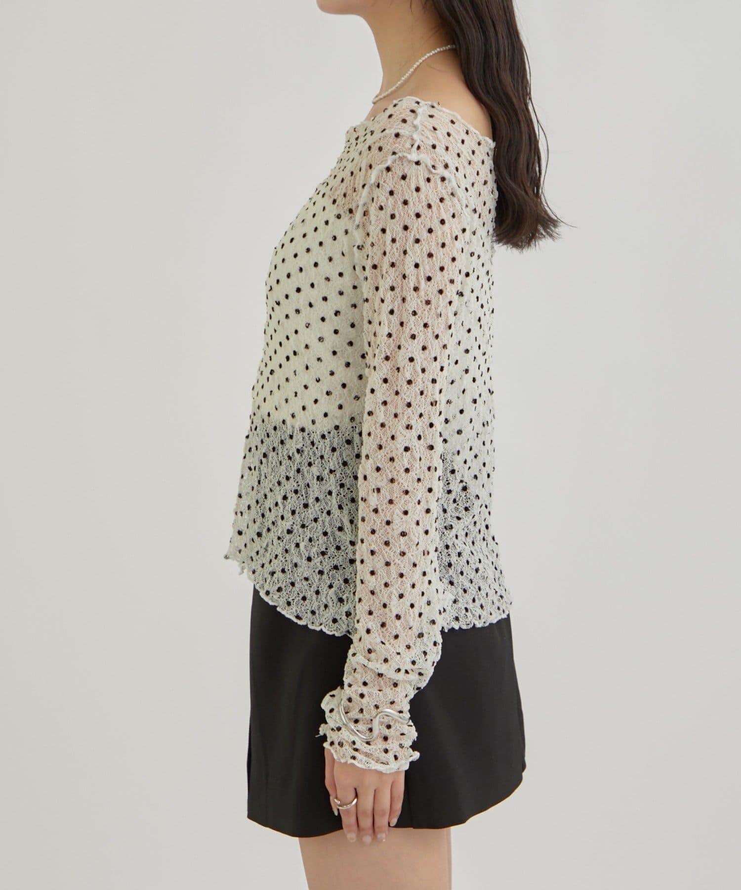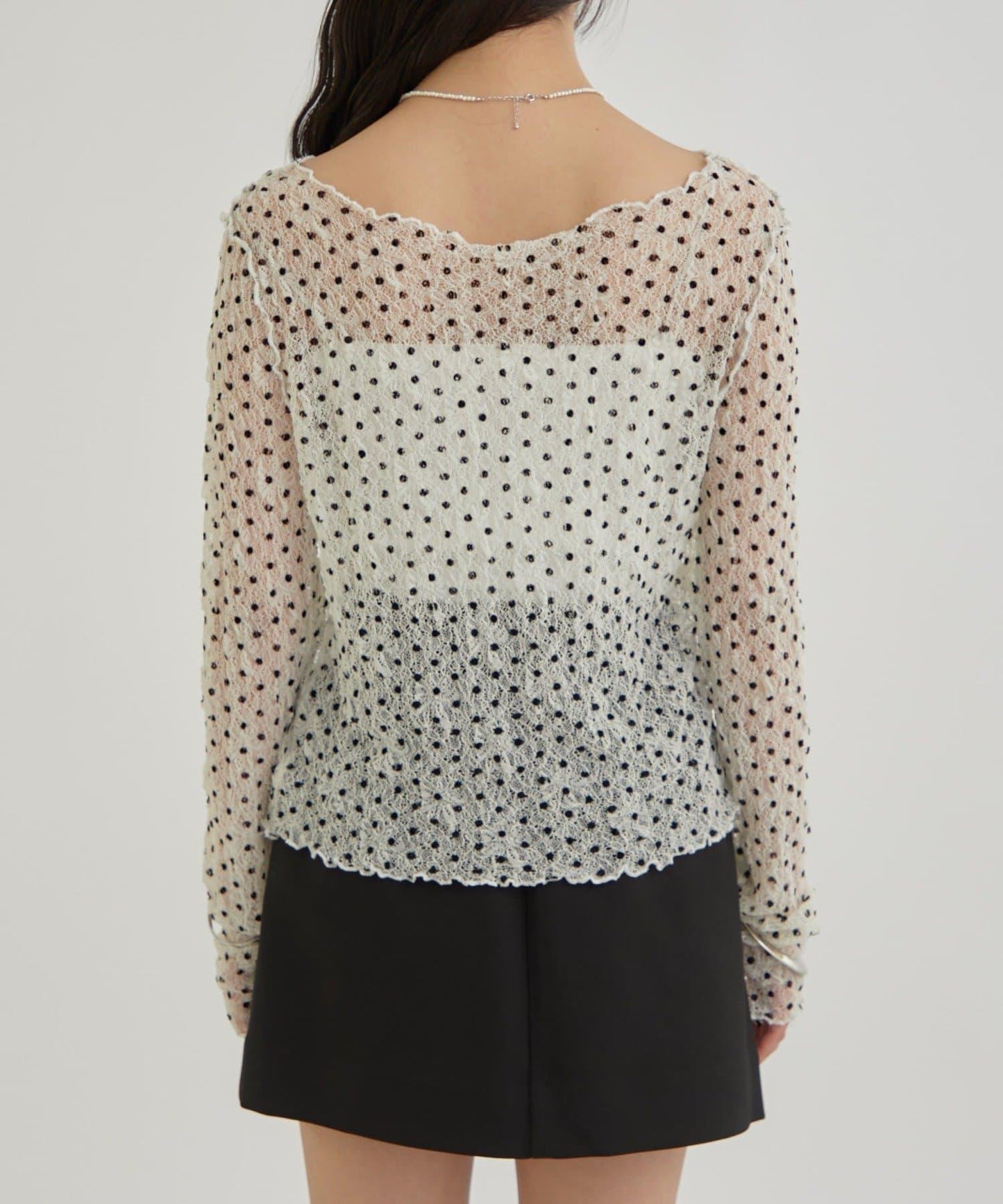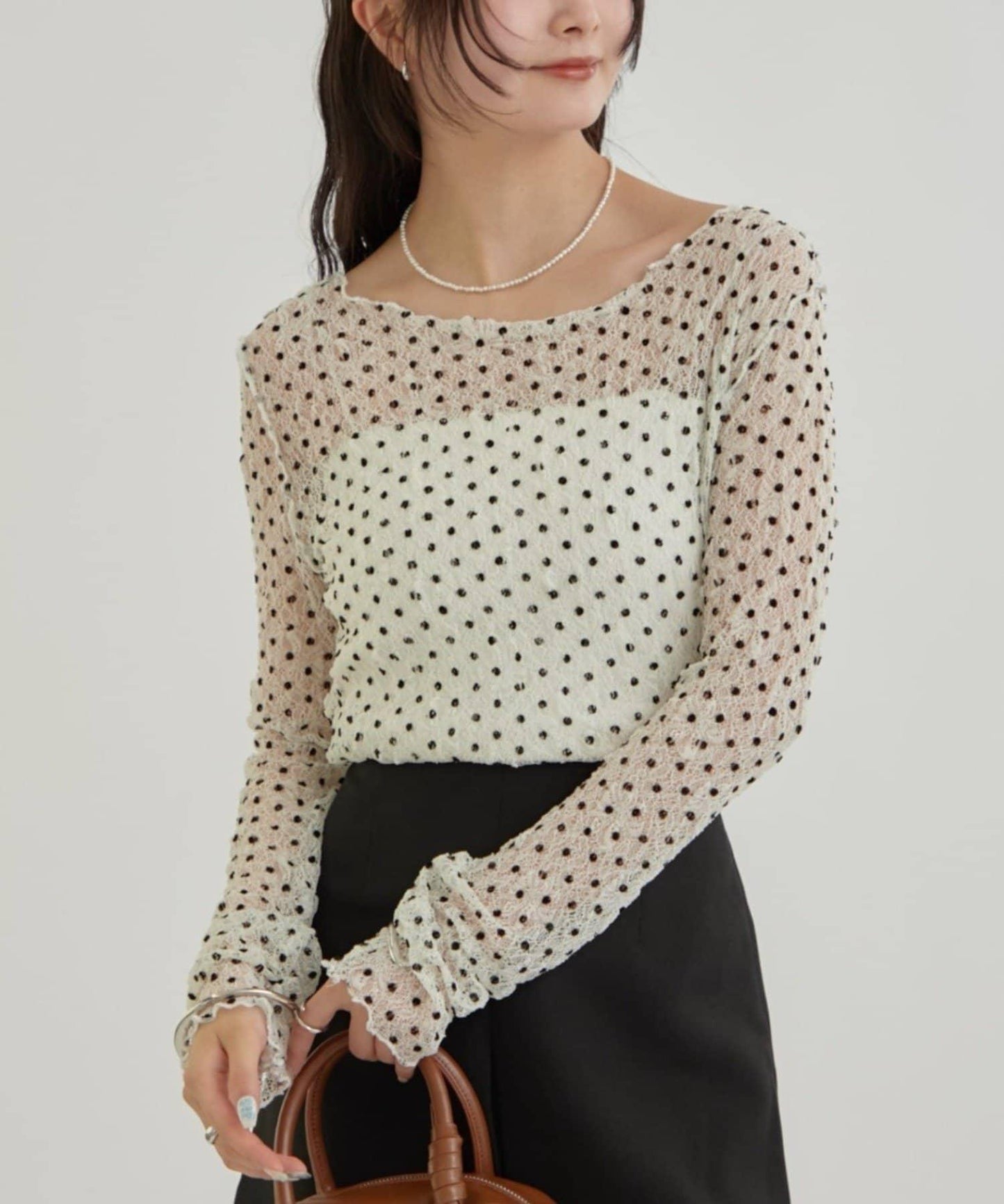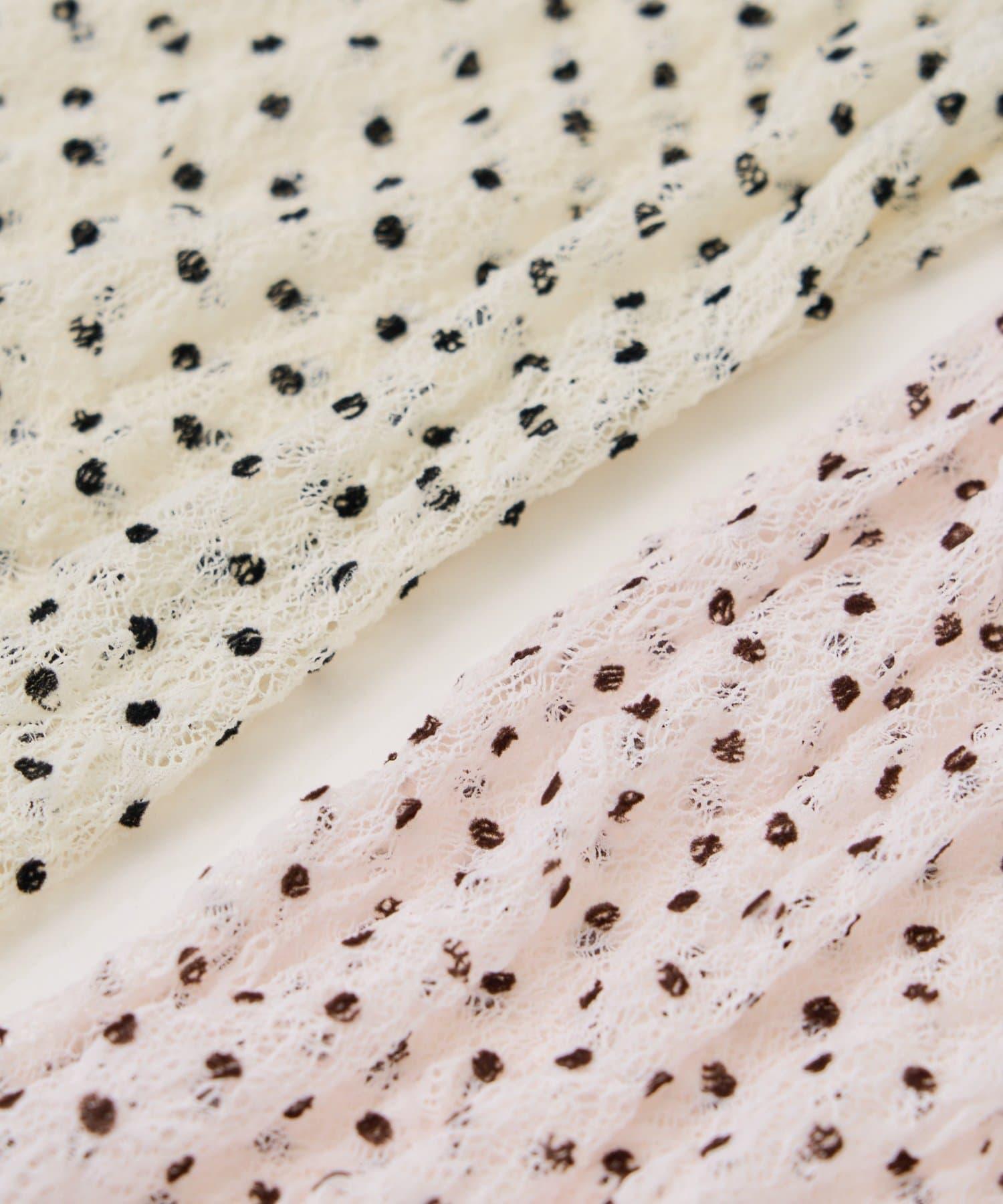 這件上衣有輕盈蓬鬆的圓點圖案。透視面料的透明度增加了輕盈感和舒適感。