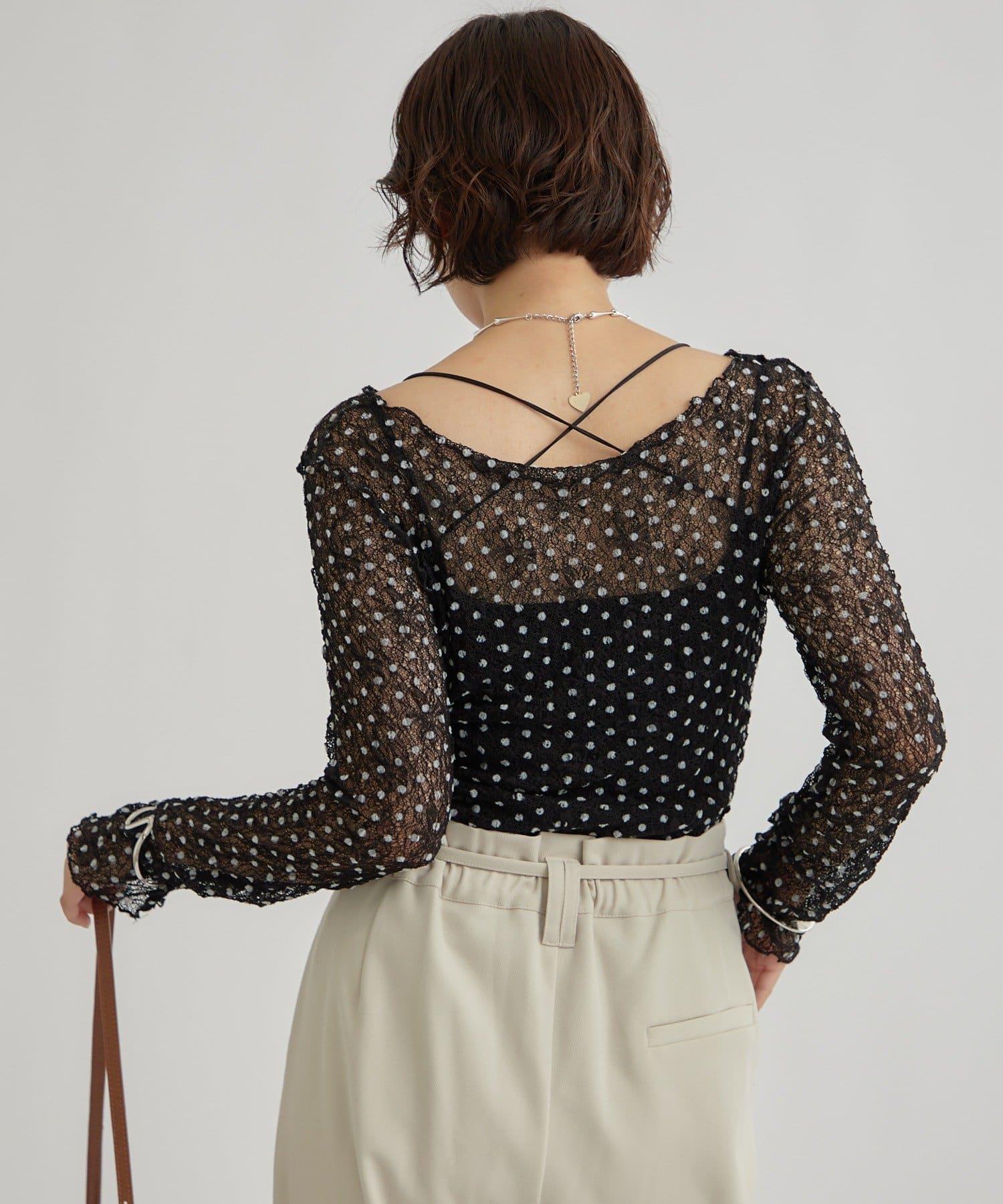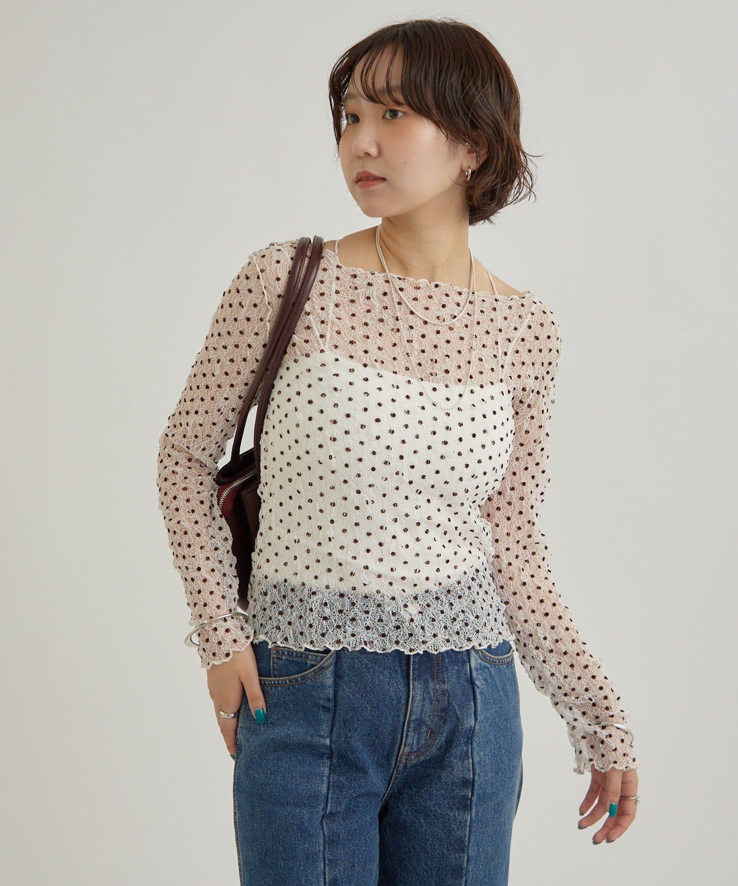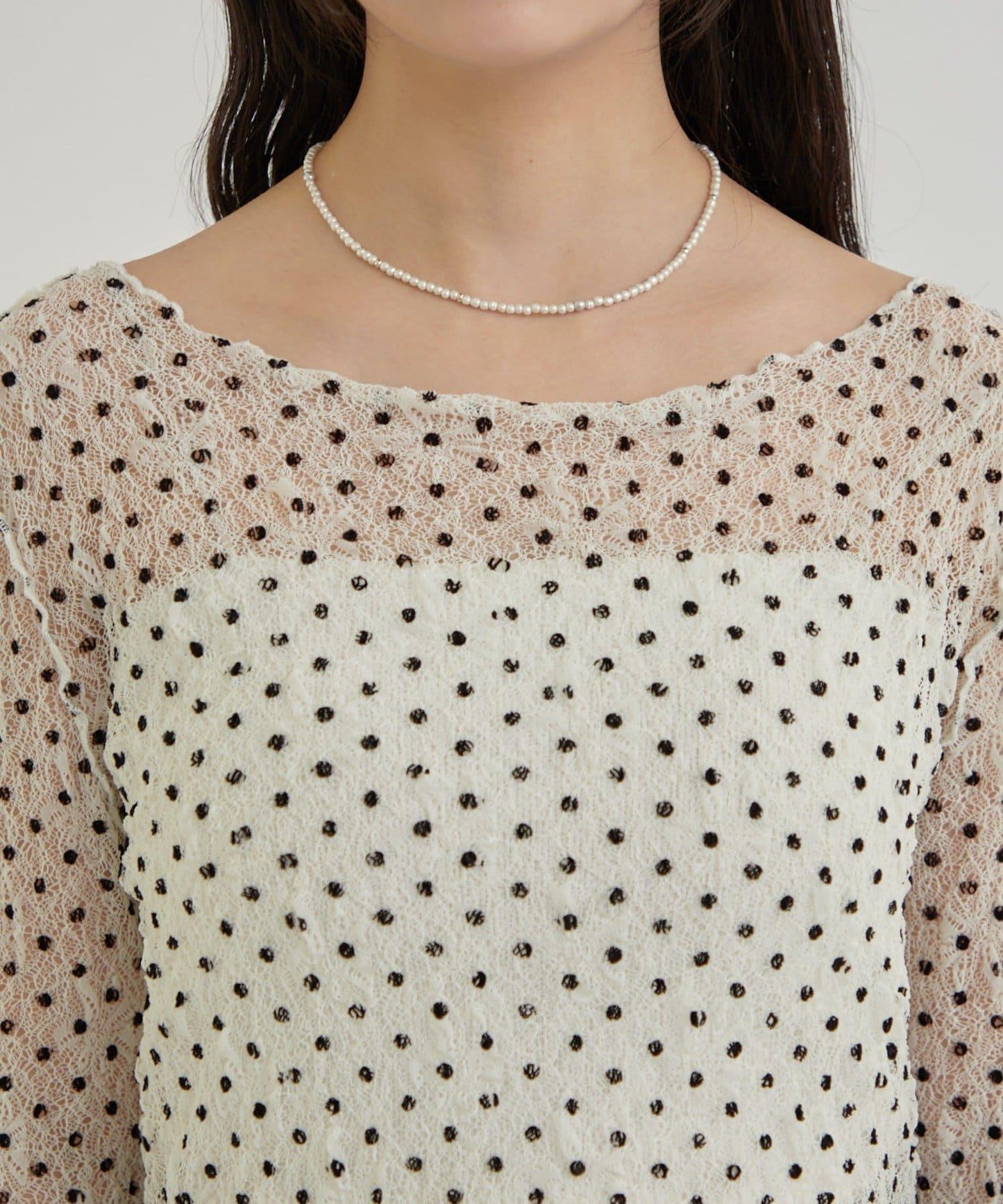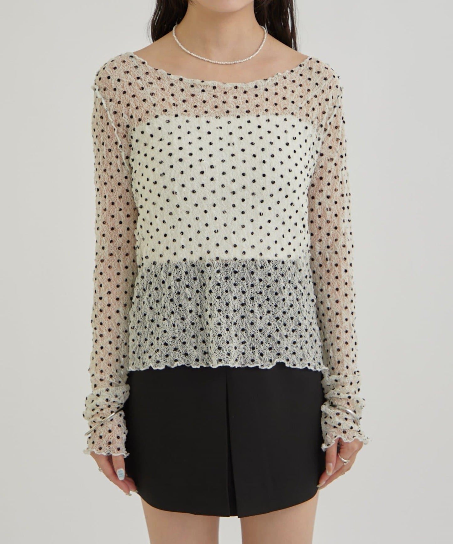 這件上衣有輕盈蓬鬆的圓點圖案。透視面料的透明度增加了輕盈感和舒適感。