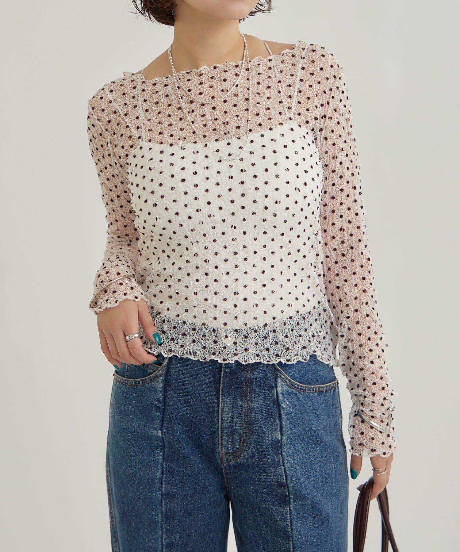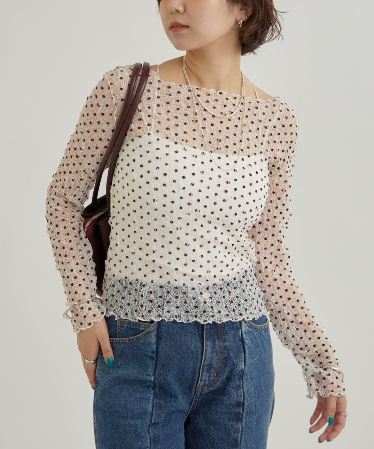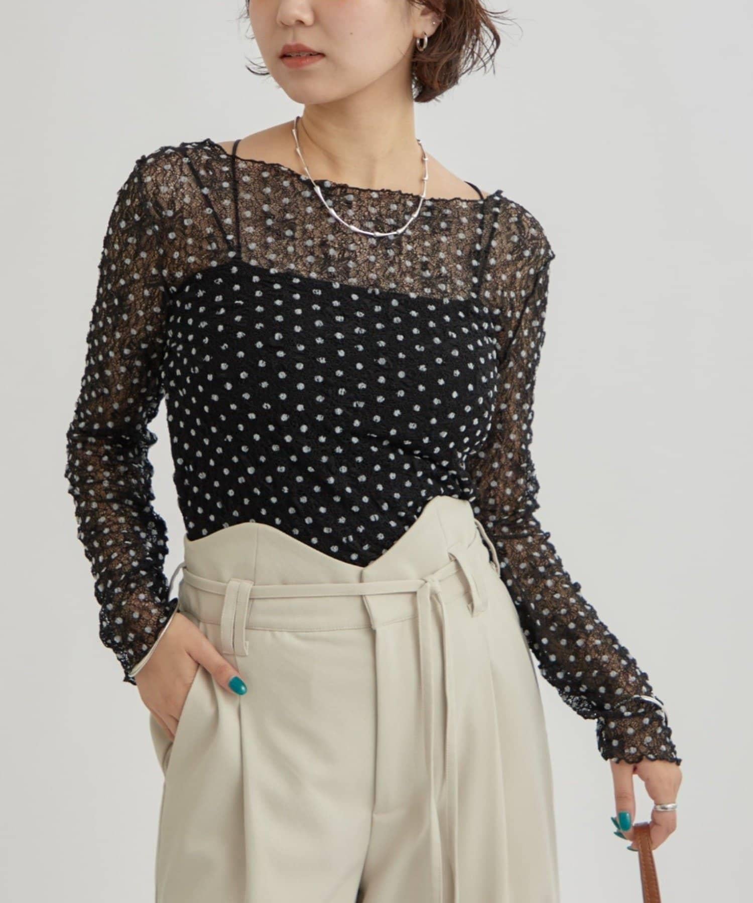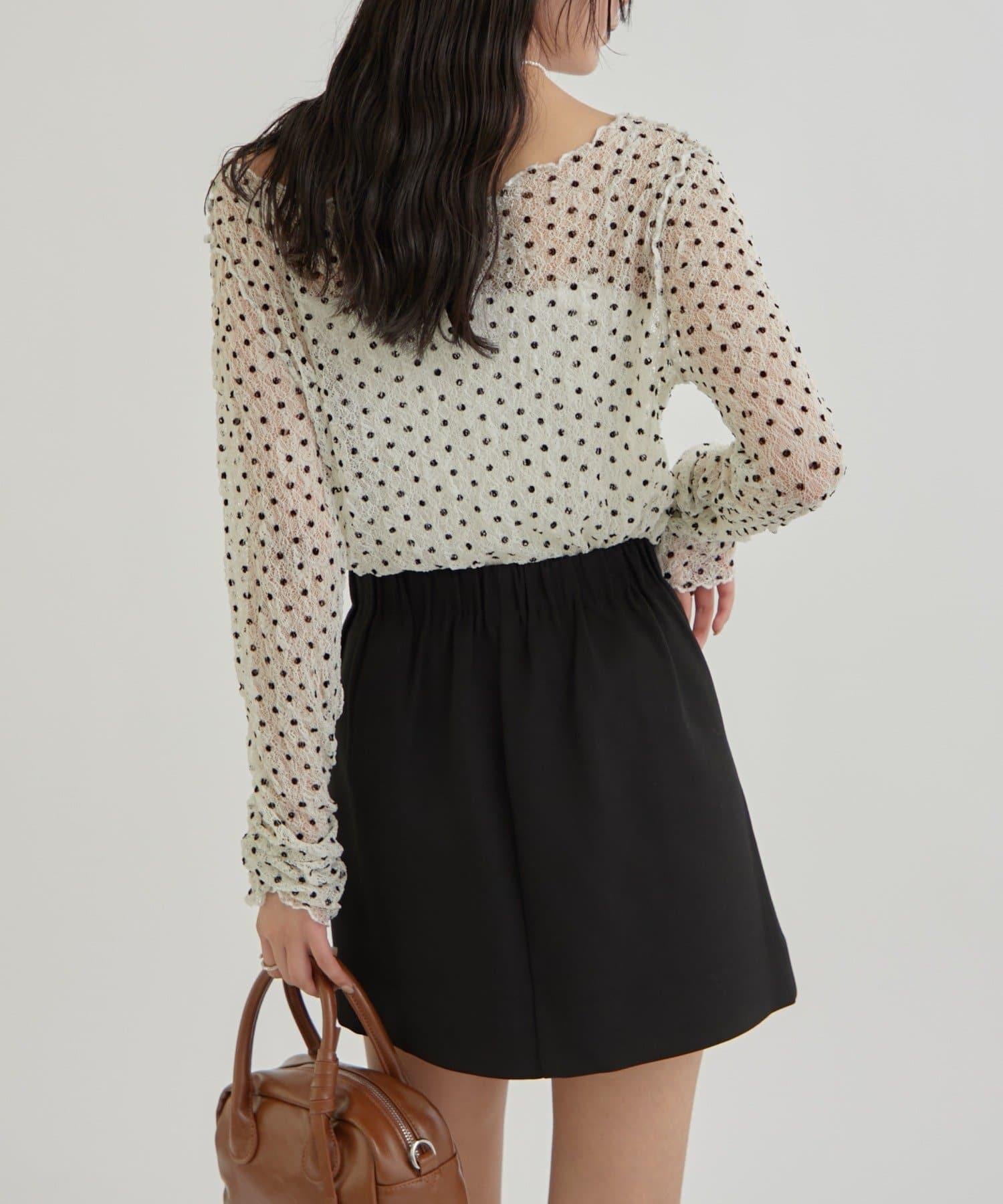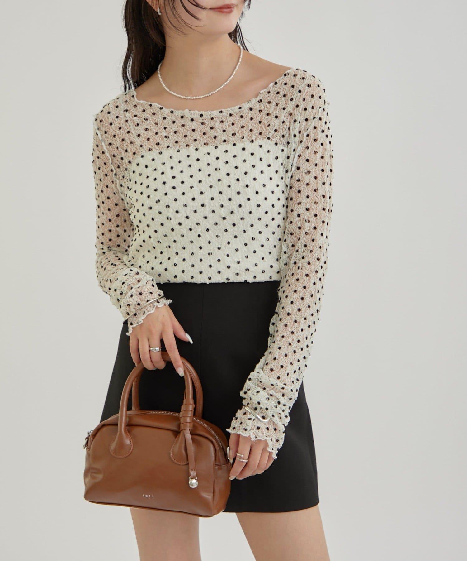 這件上衣有輕盈蓬鬆的圓點圖案。透視面料的透明度增加了輕盈感和舒適感。