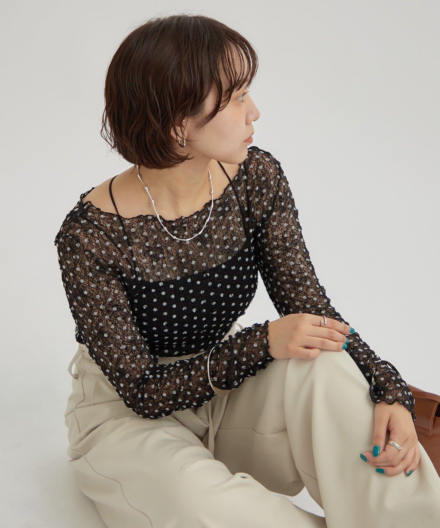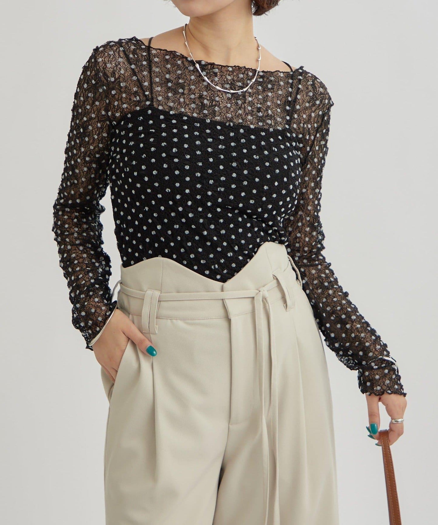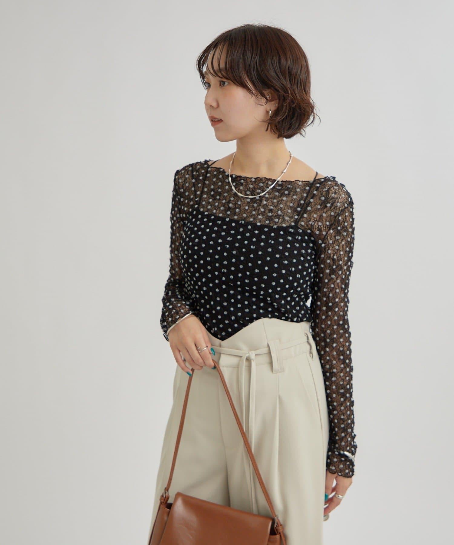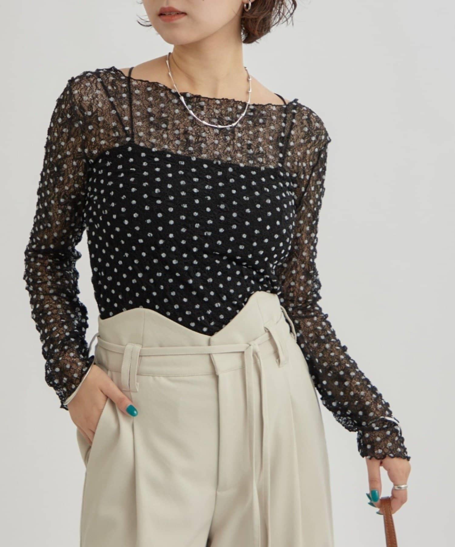 這件上衣有輕盈蓬鬆的圓點圖案。透視面料的透明度增加了輕盈感和舒適感。