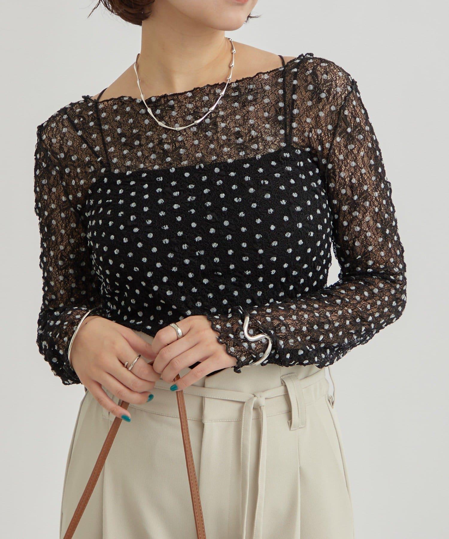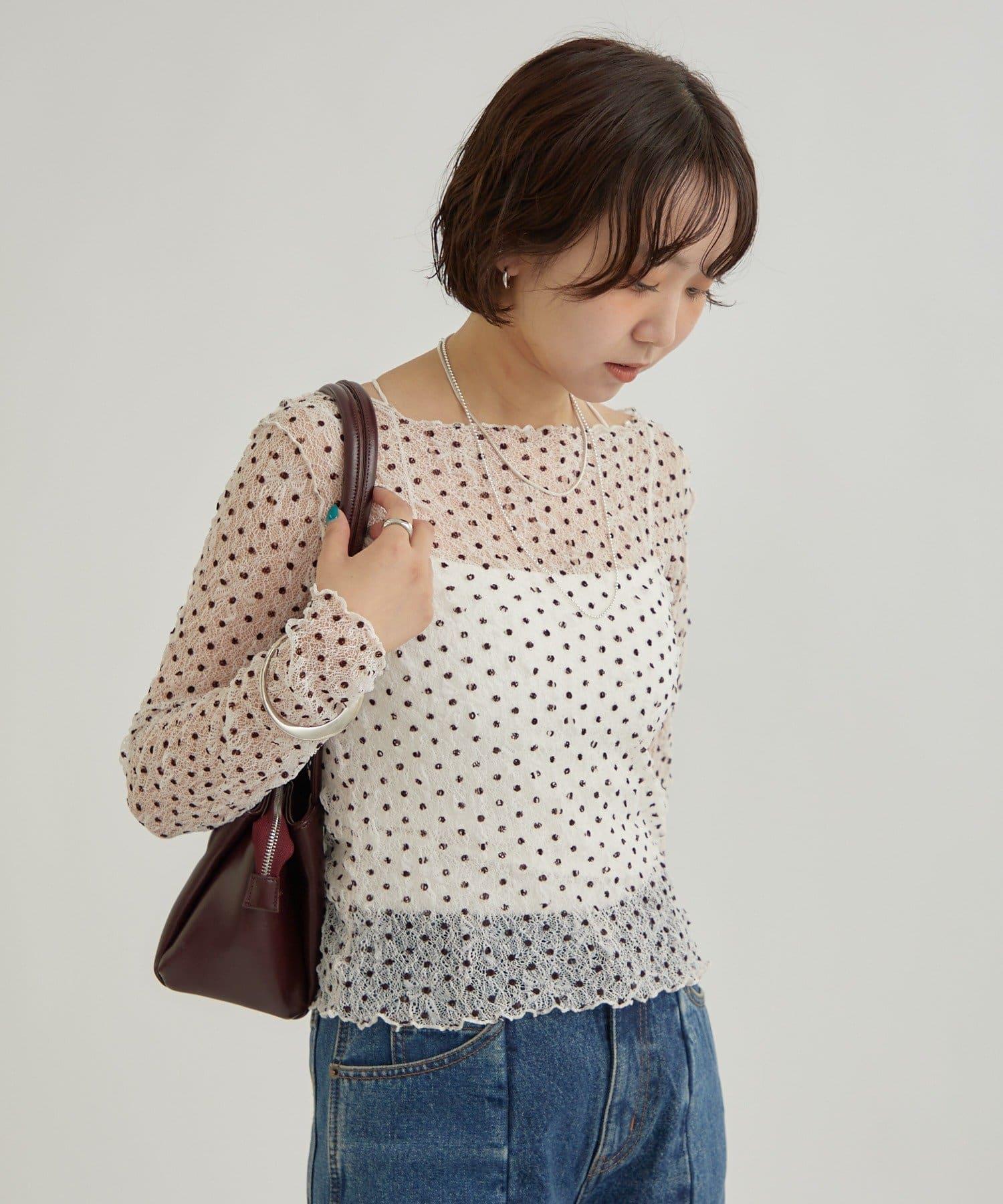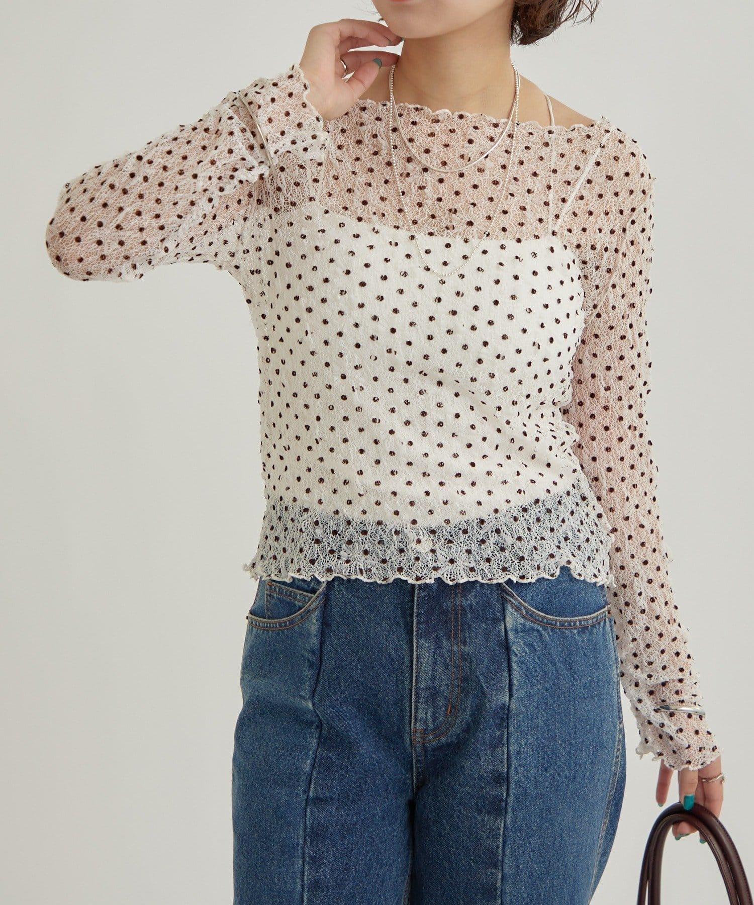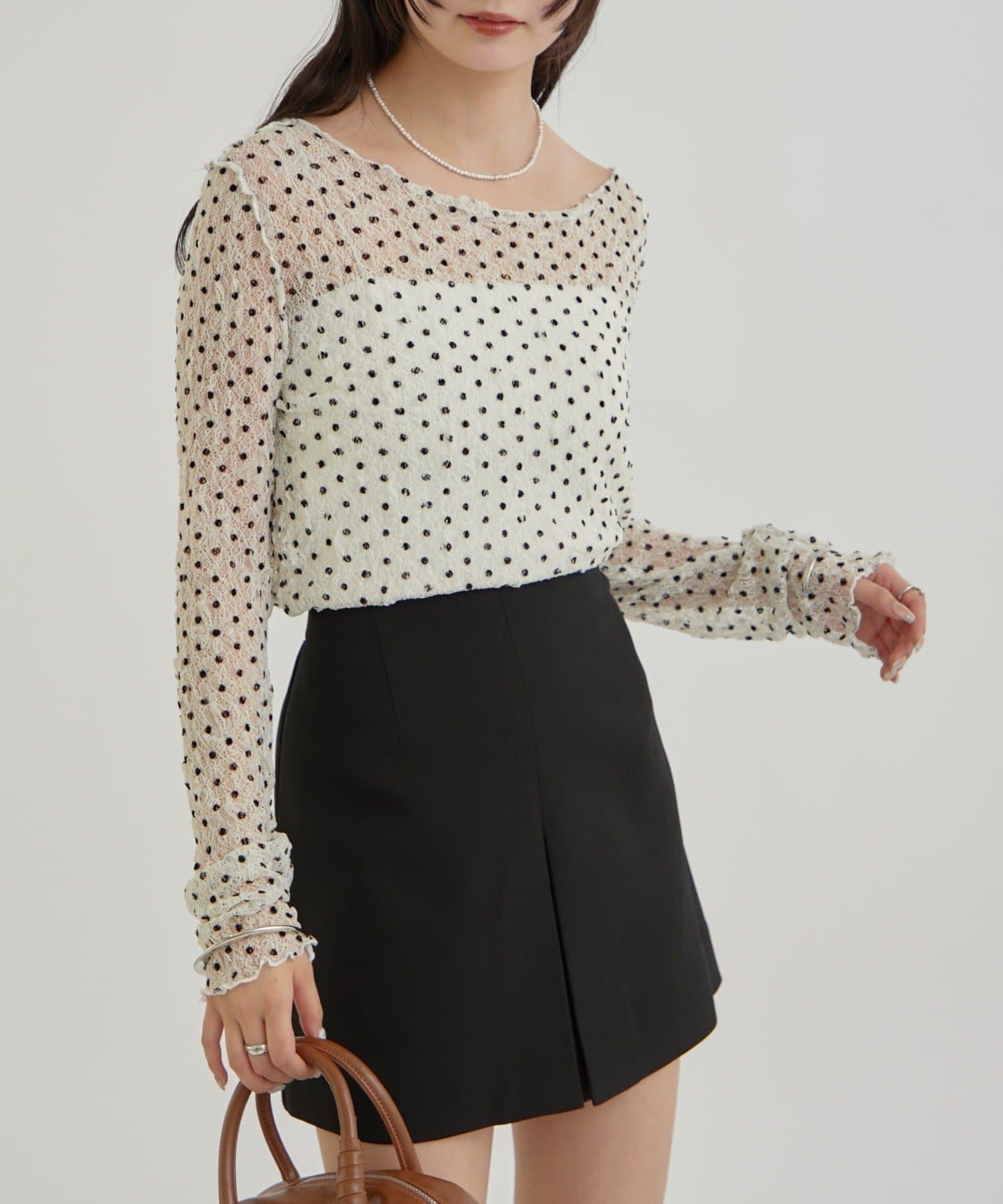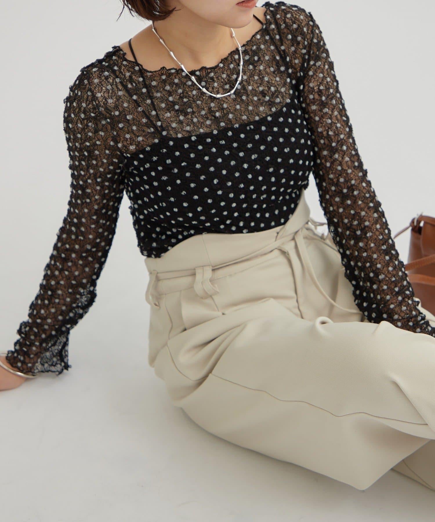 這件上衣有輕盈蓬鬆的圓點圖案。透視面料的透明度增加了輕盈感和舒適感。