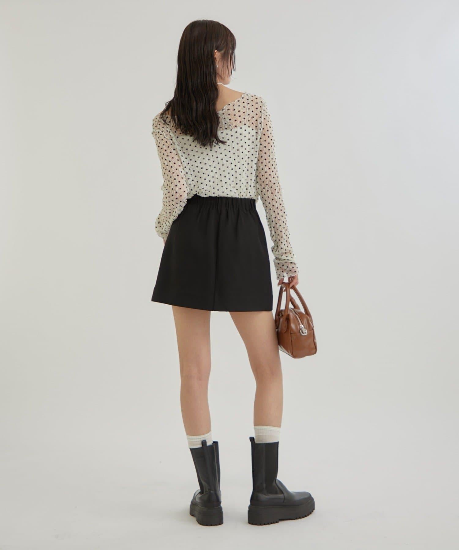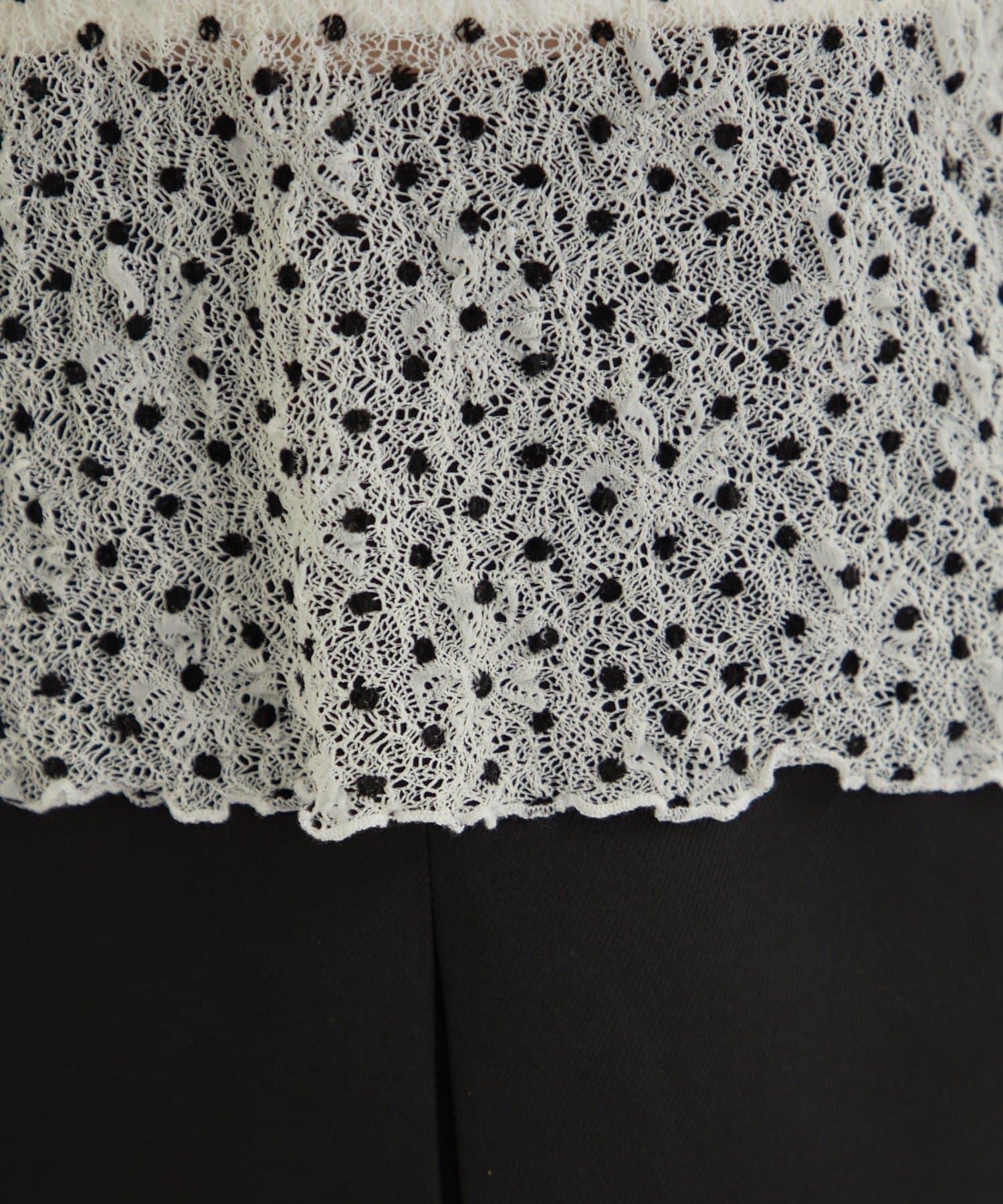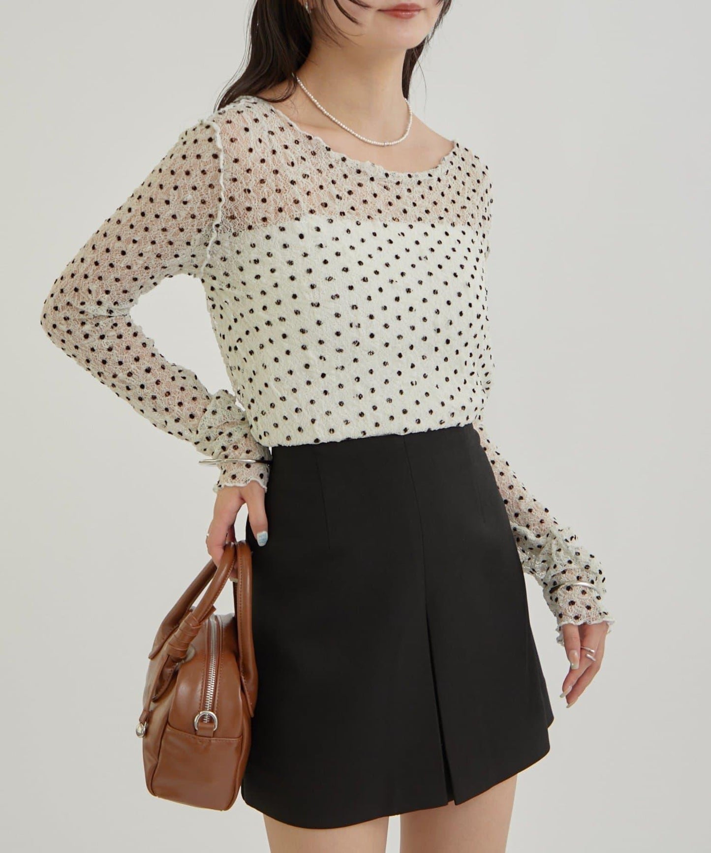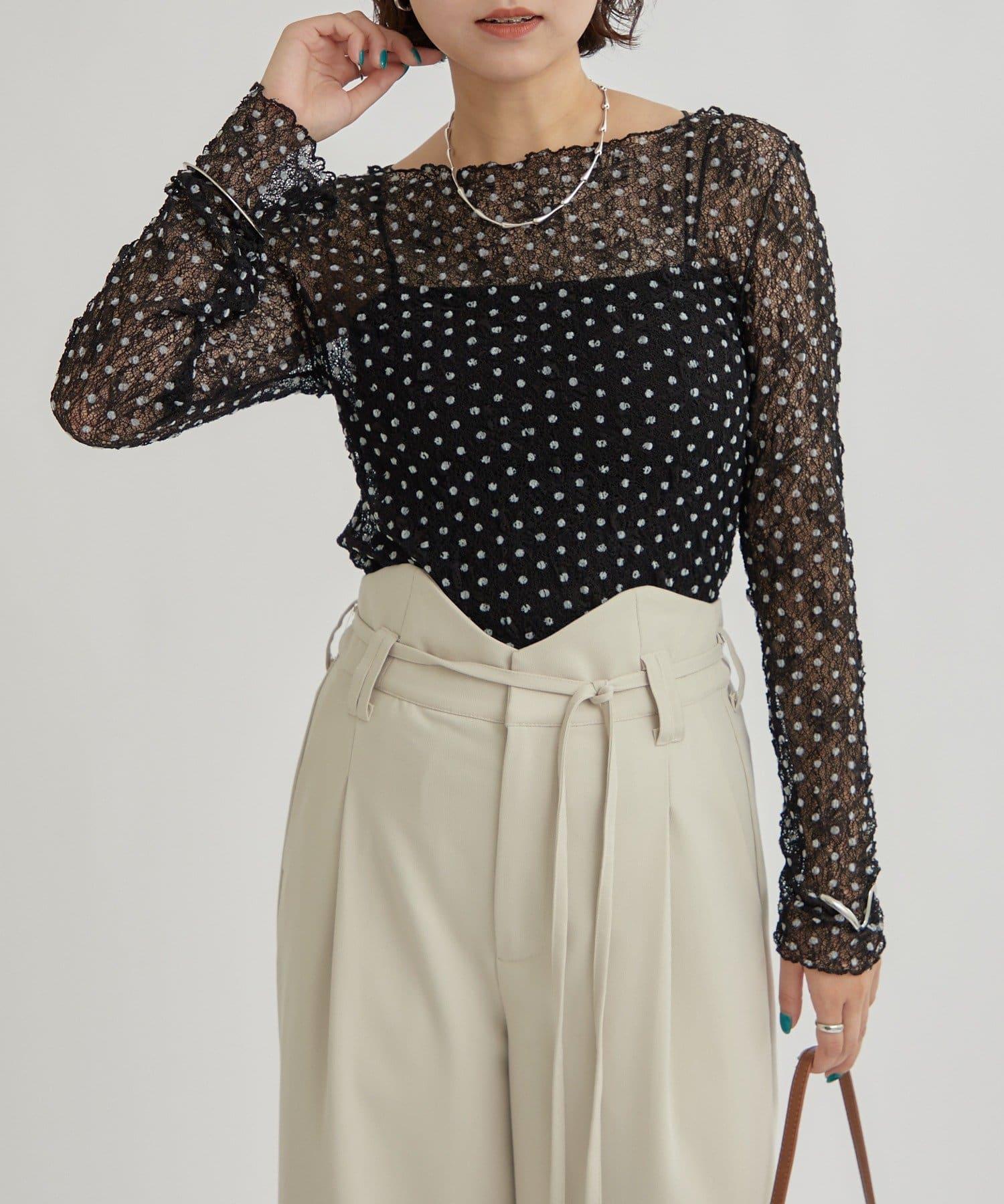 這件上衣有輕盈蓬鬆的圓點圖案。透視面料的透明度增加了輕盈感和舒適感。