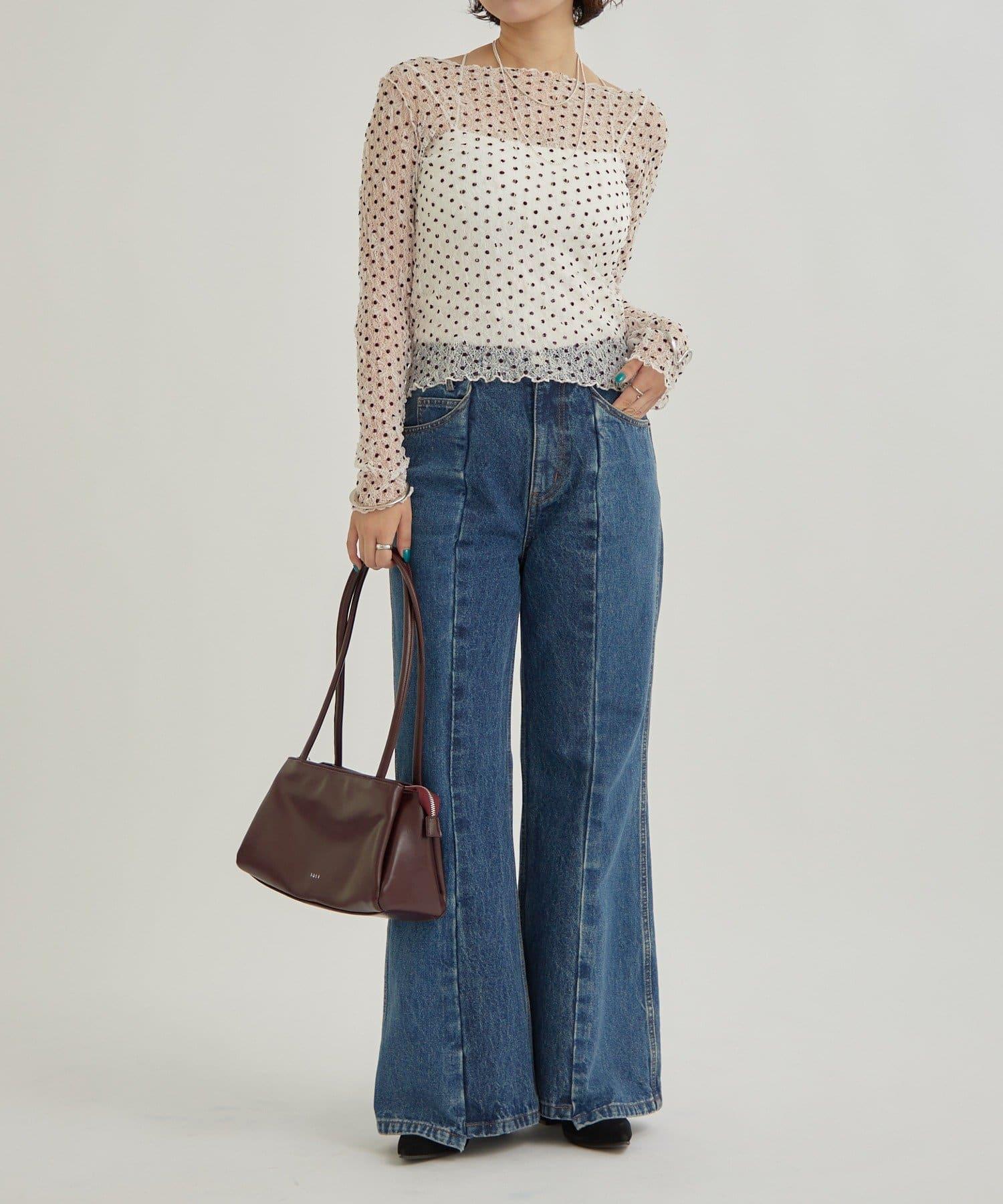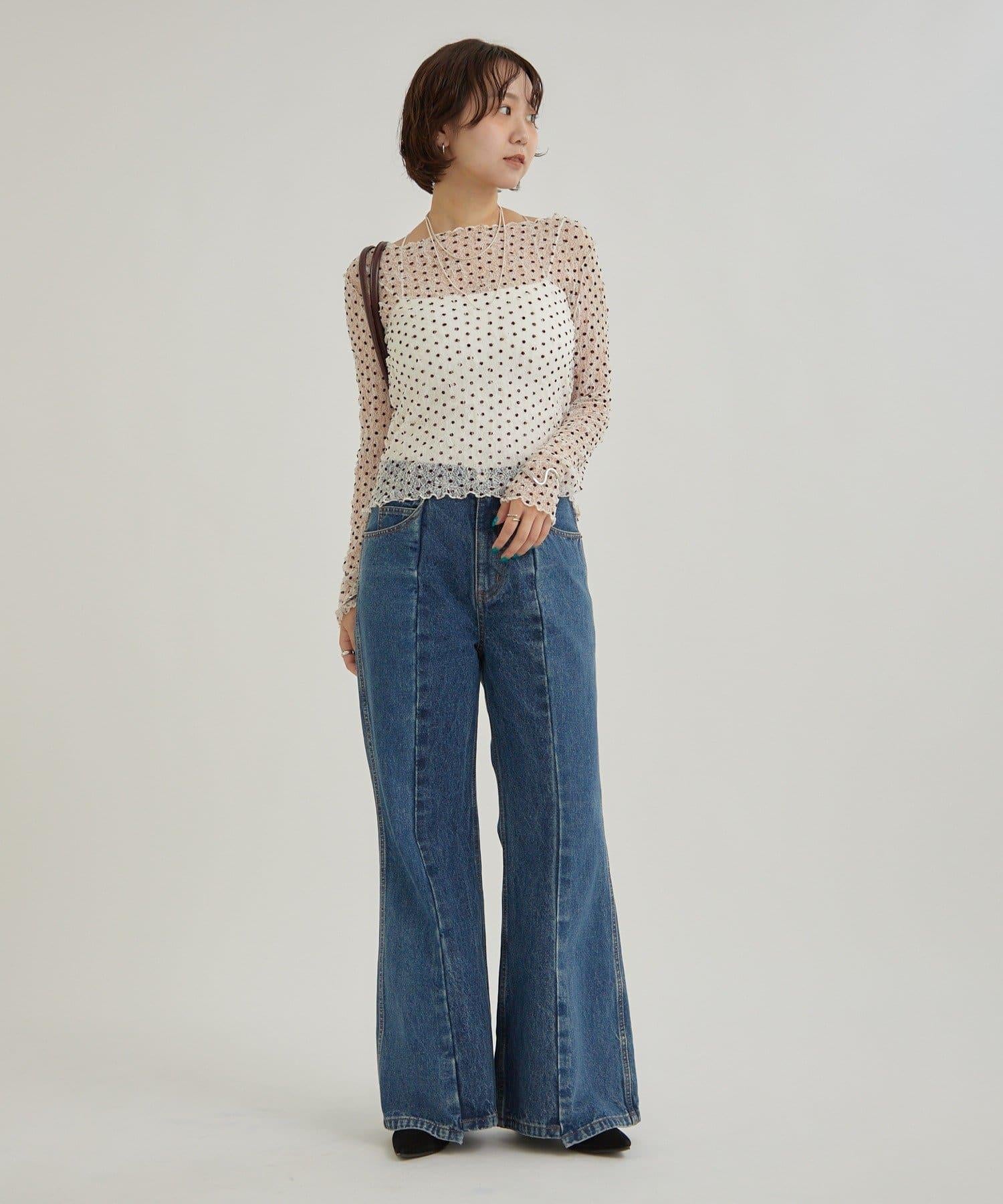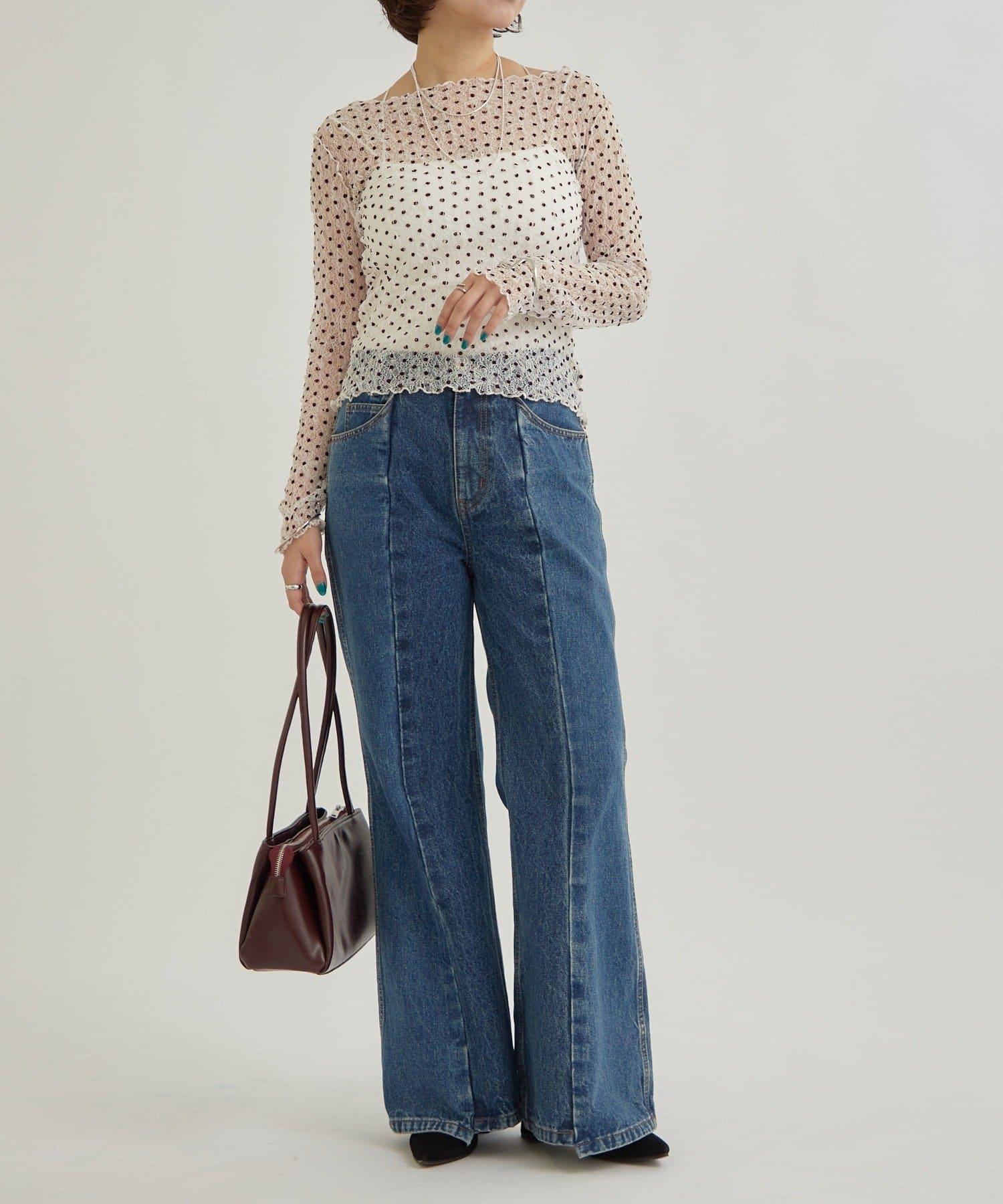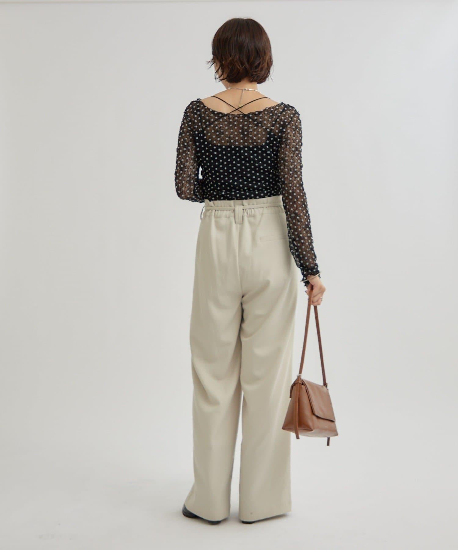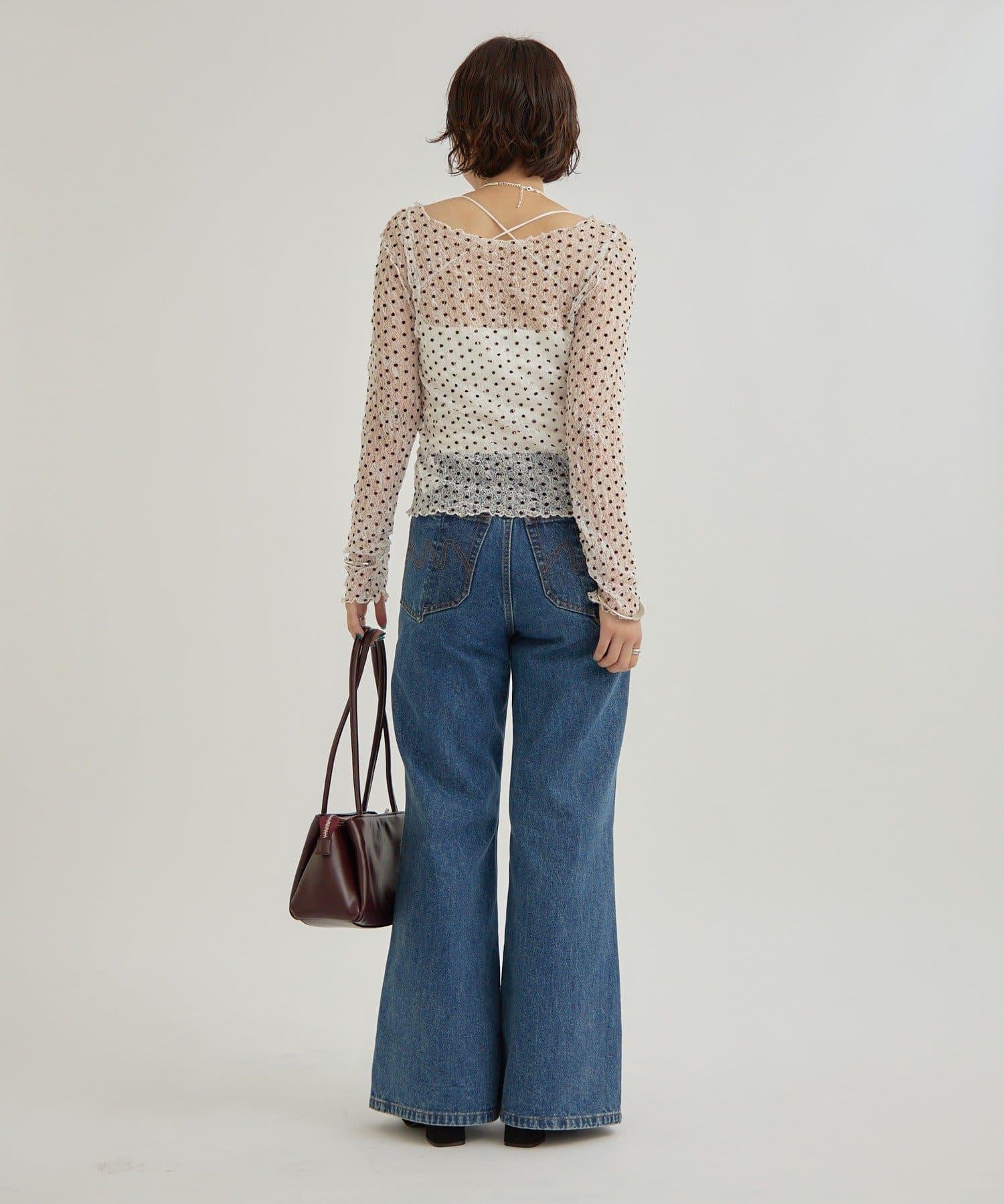 這件上衣有輕盈蓬鬆的圓點圖案。透視面料的透明度增加了輕盈感和舒適感。