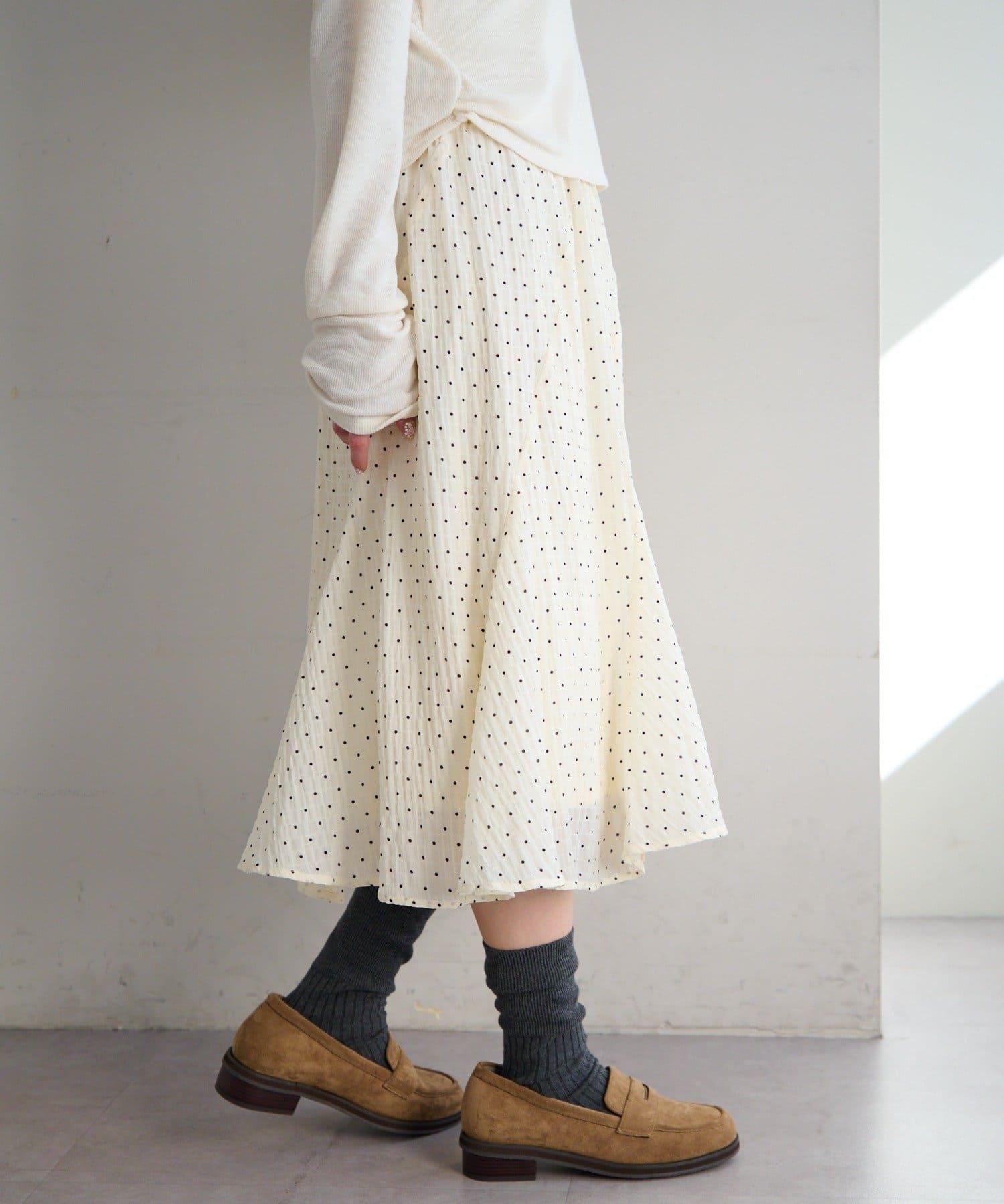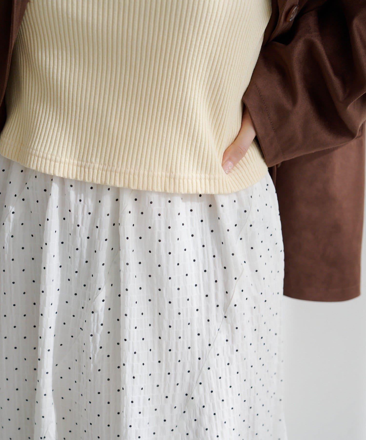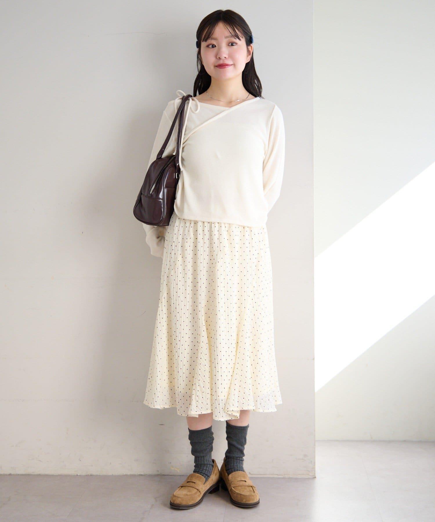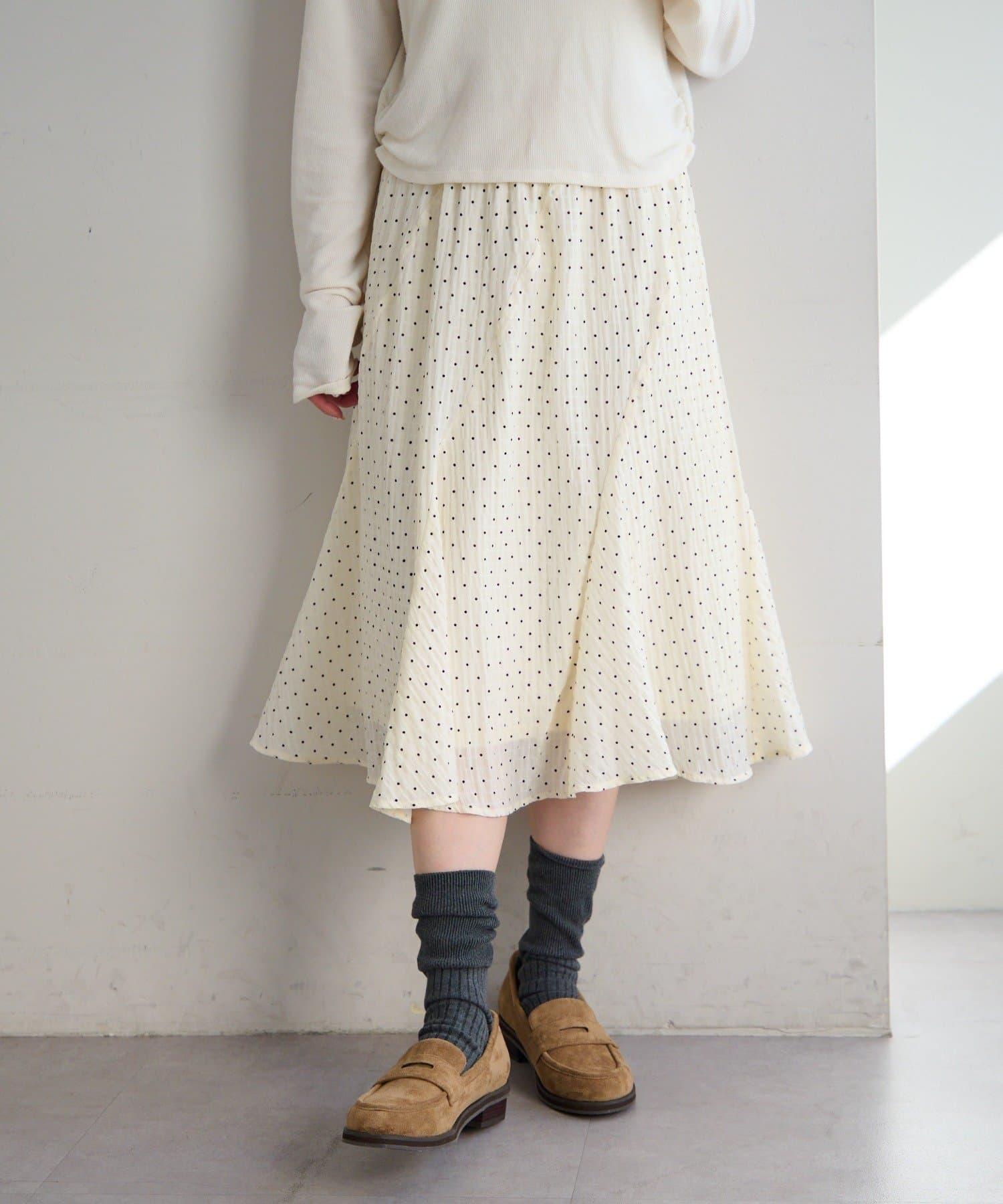 這款薄紗中裙採用基本的圓點圖案,春夏兩季均可穿著,也適合長季節穿著。