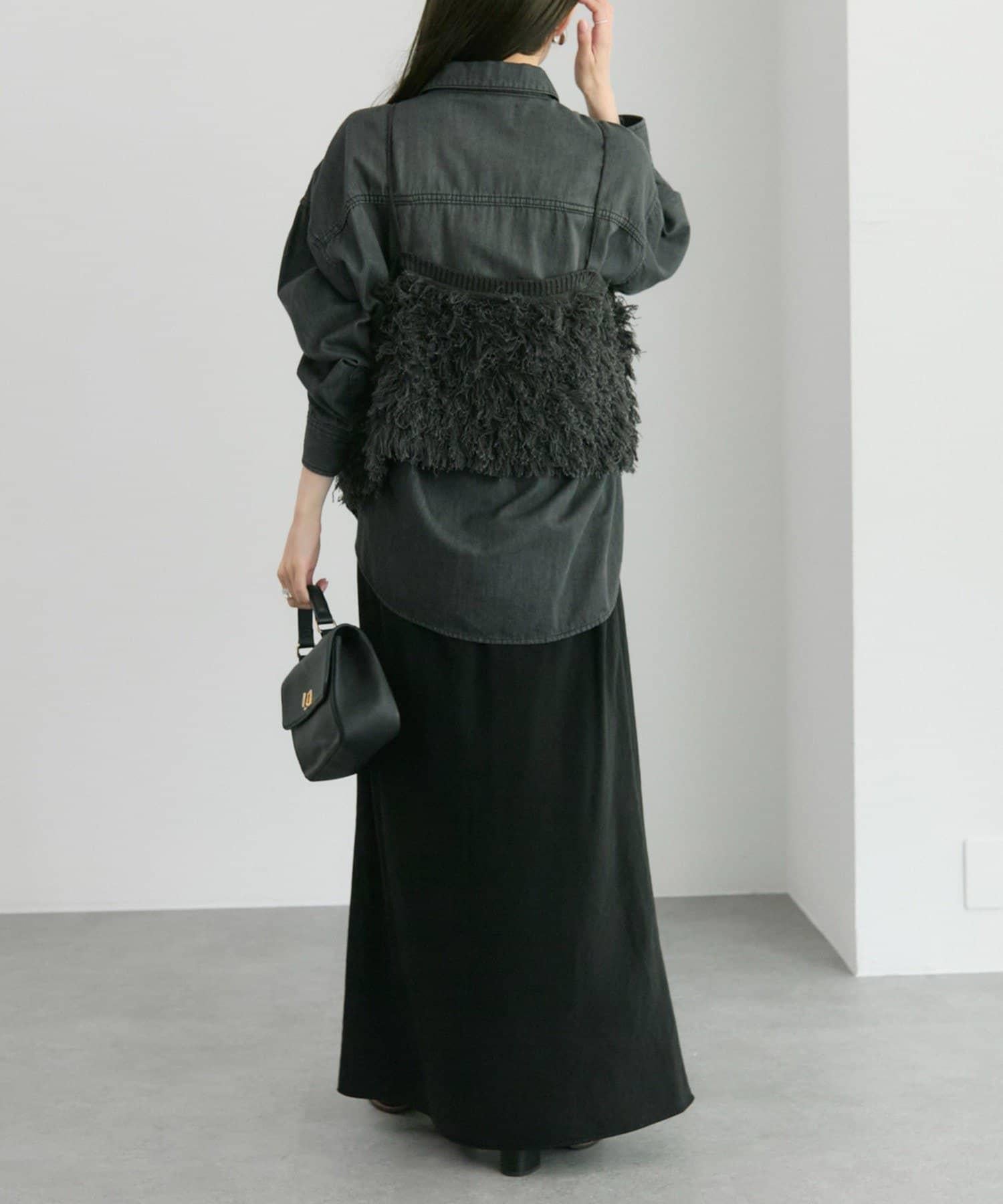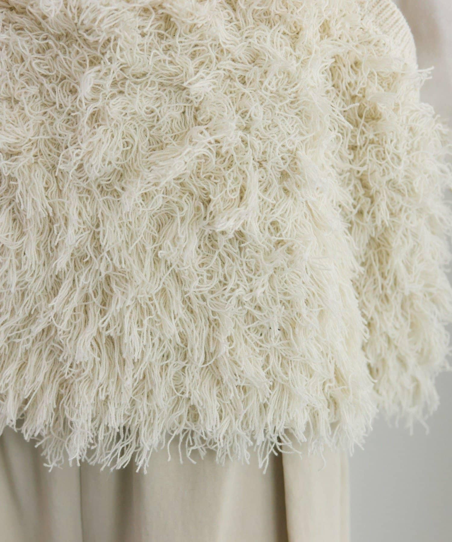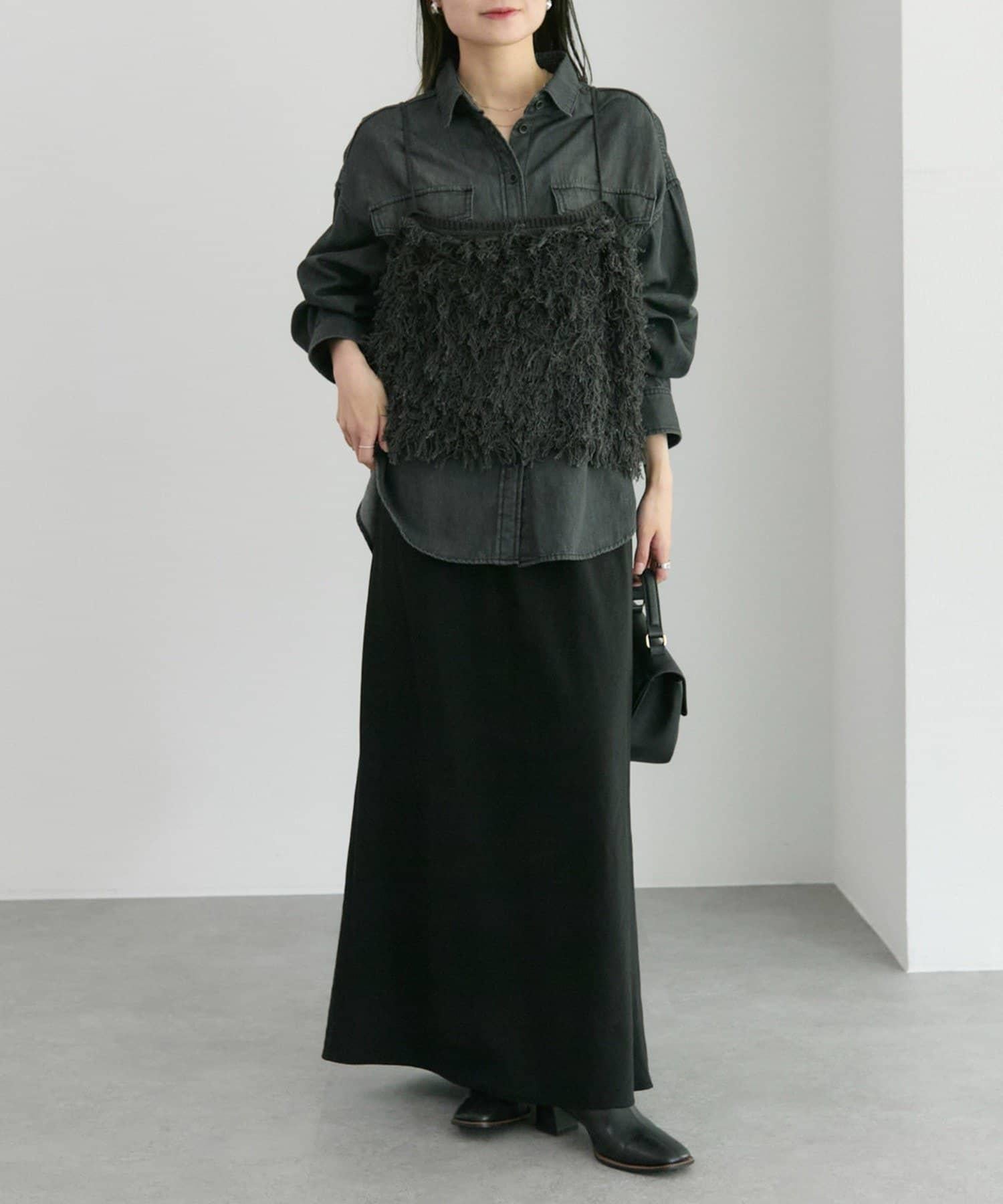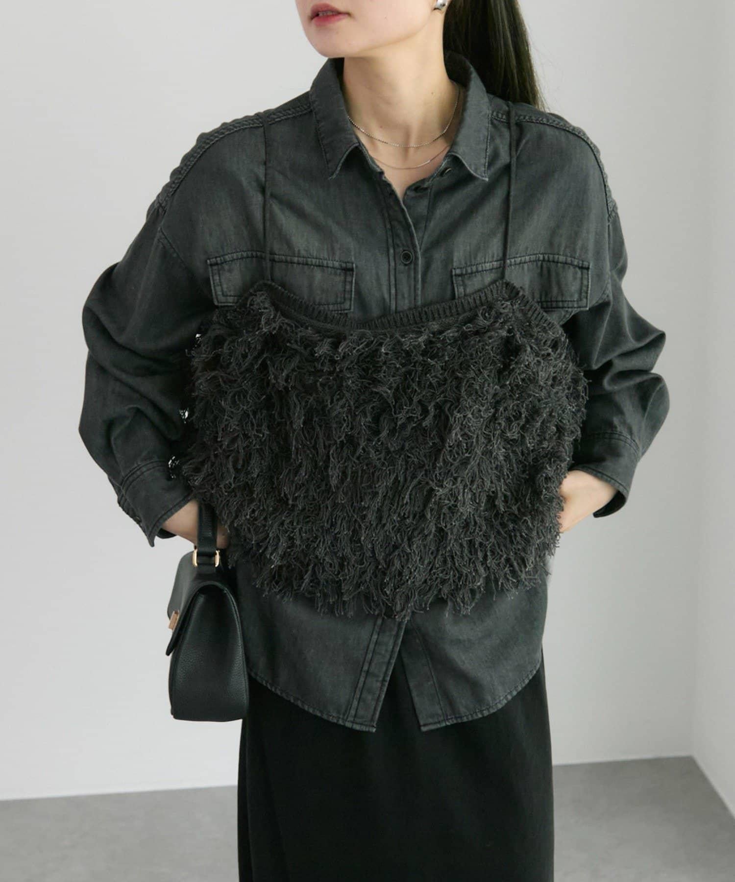 採用流蘇設計的針織半身裙,長長的毛皮賦予其極富表現力的質感。