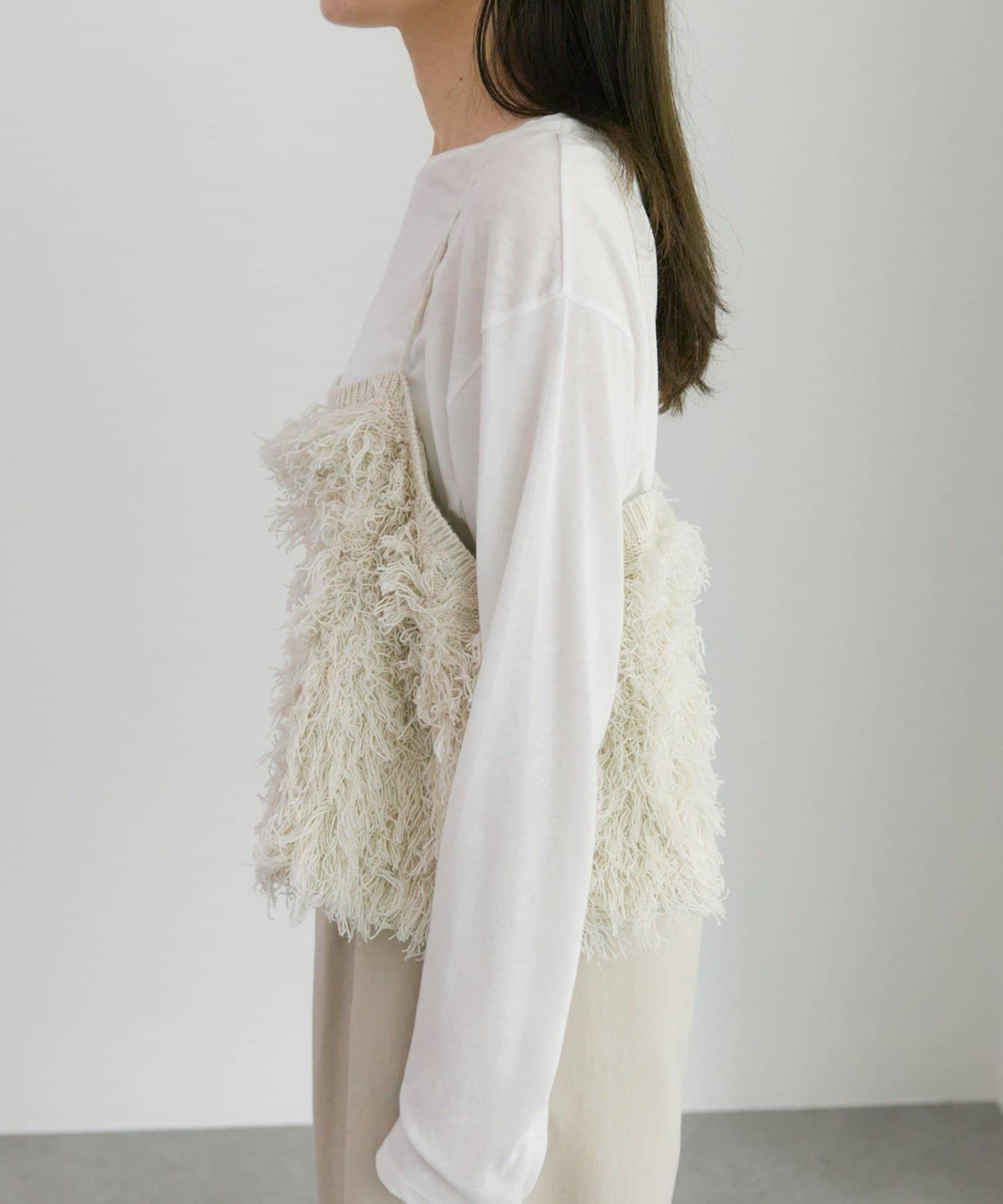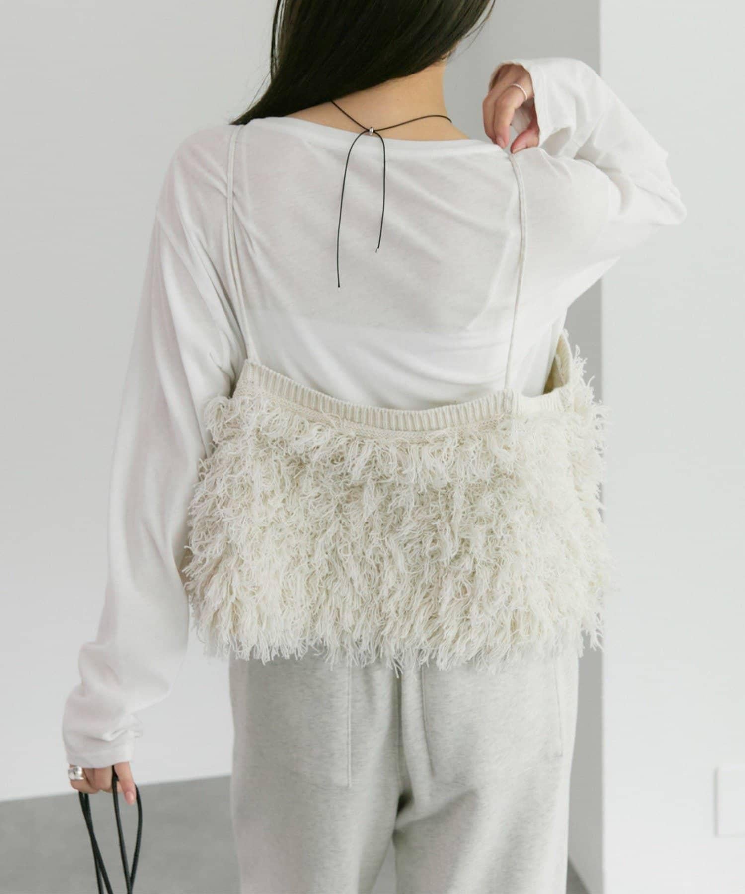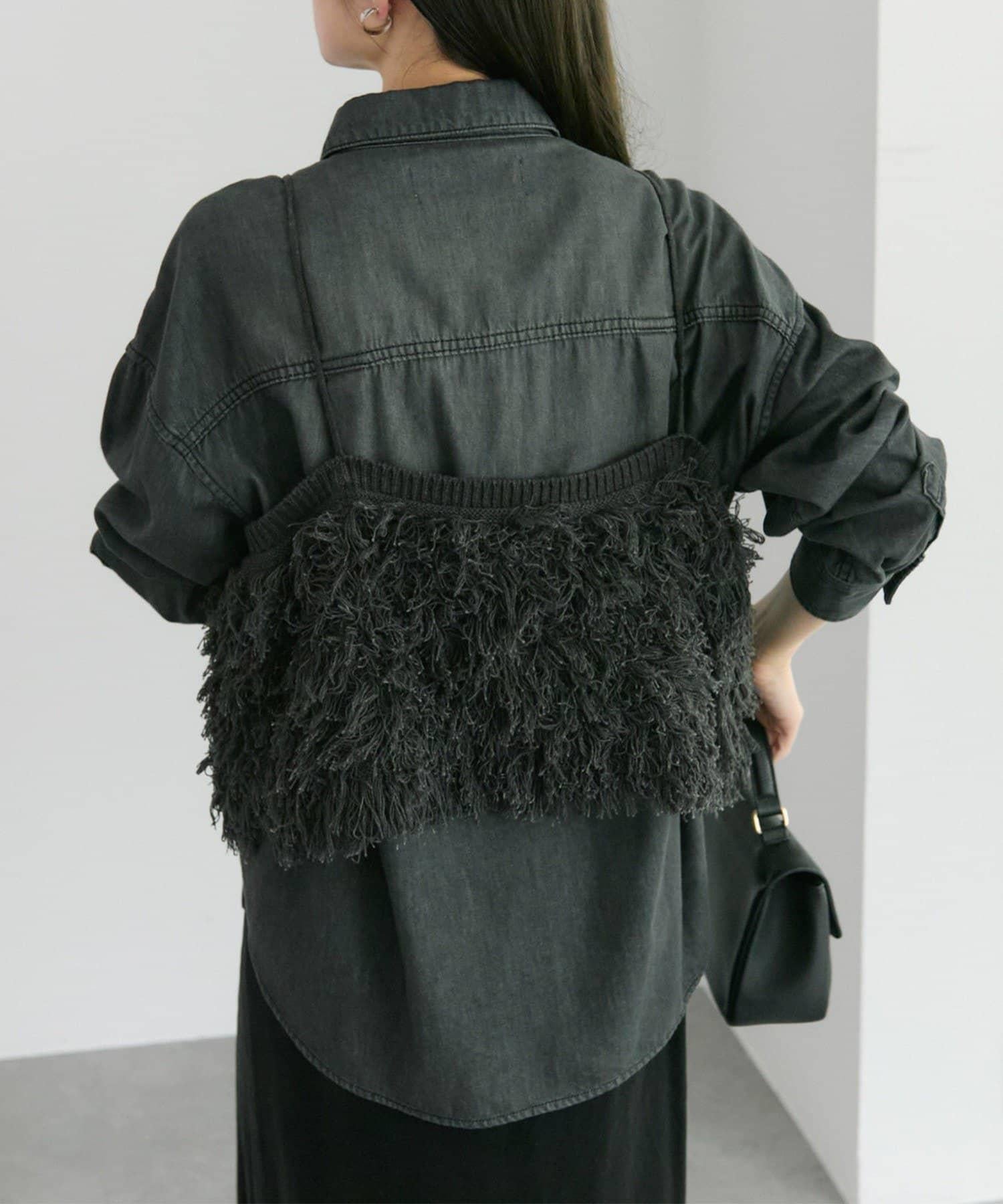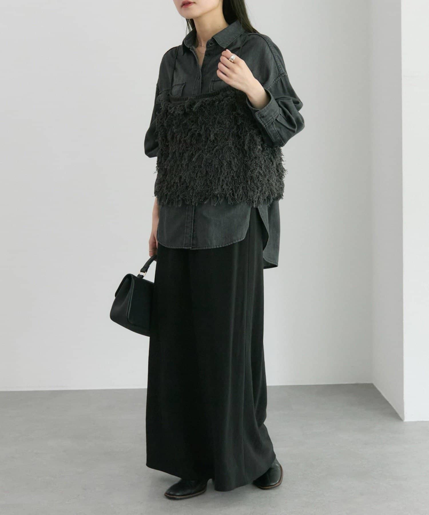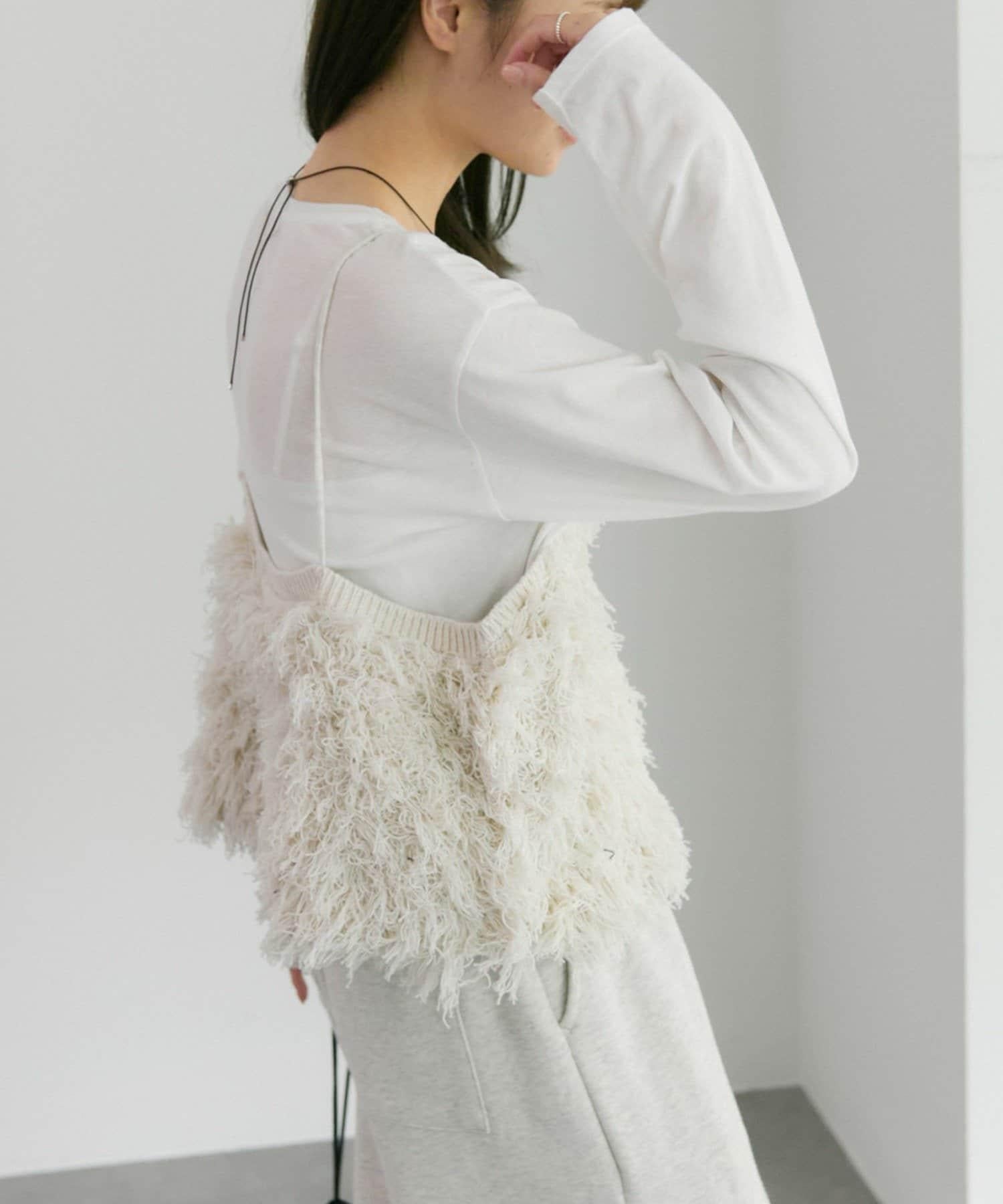 採用流蘇設計的針織半身裙,長長的毛皮賦予其極富表現力的質感。