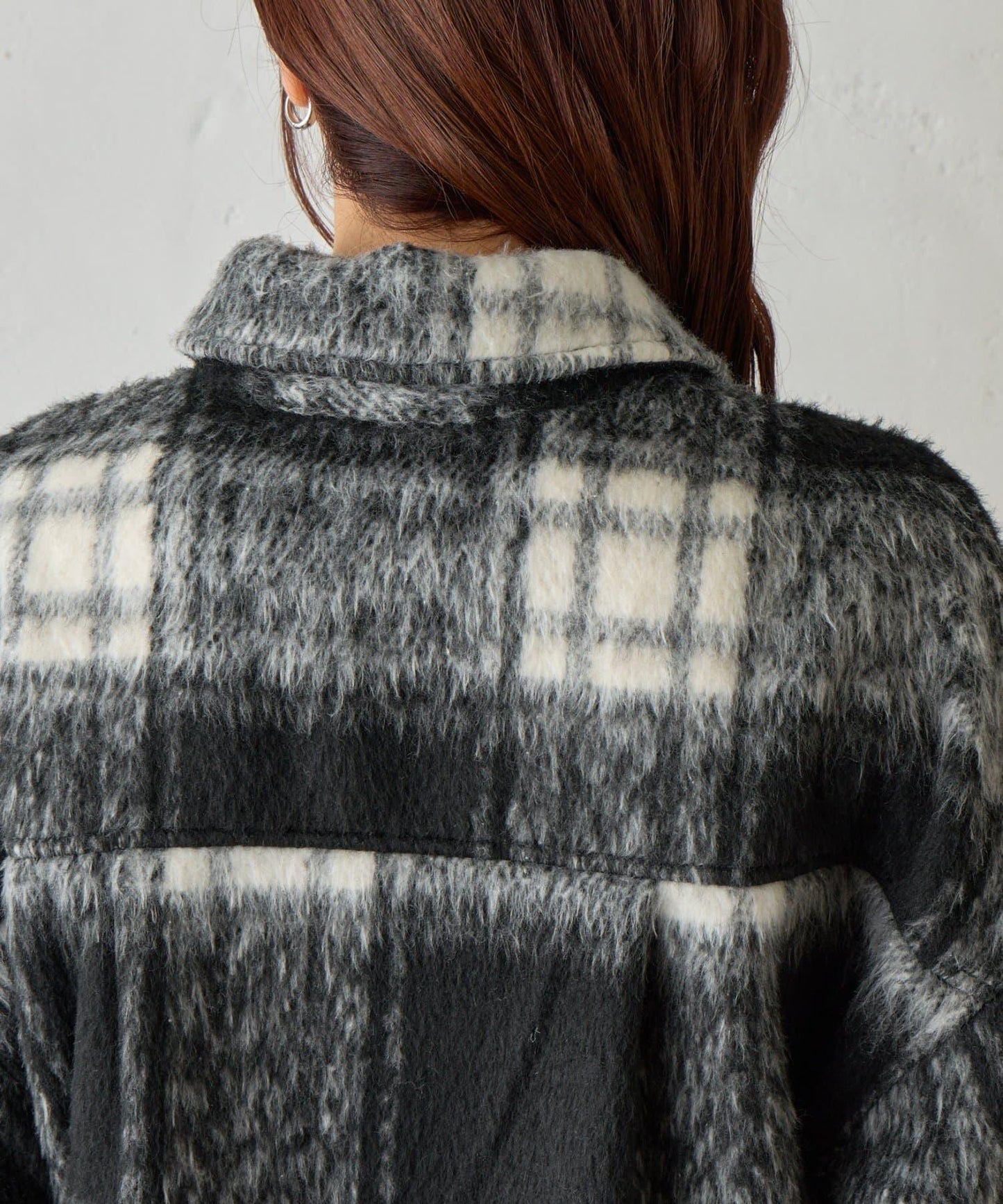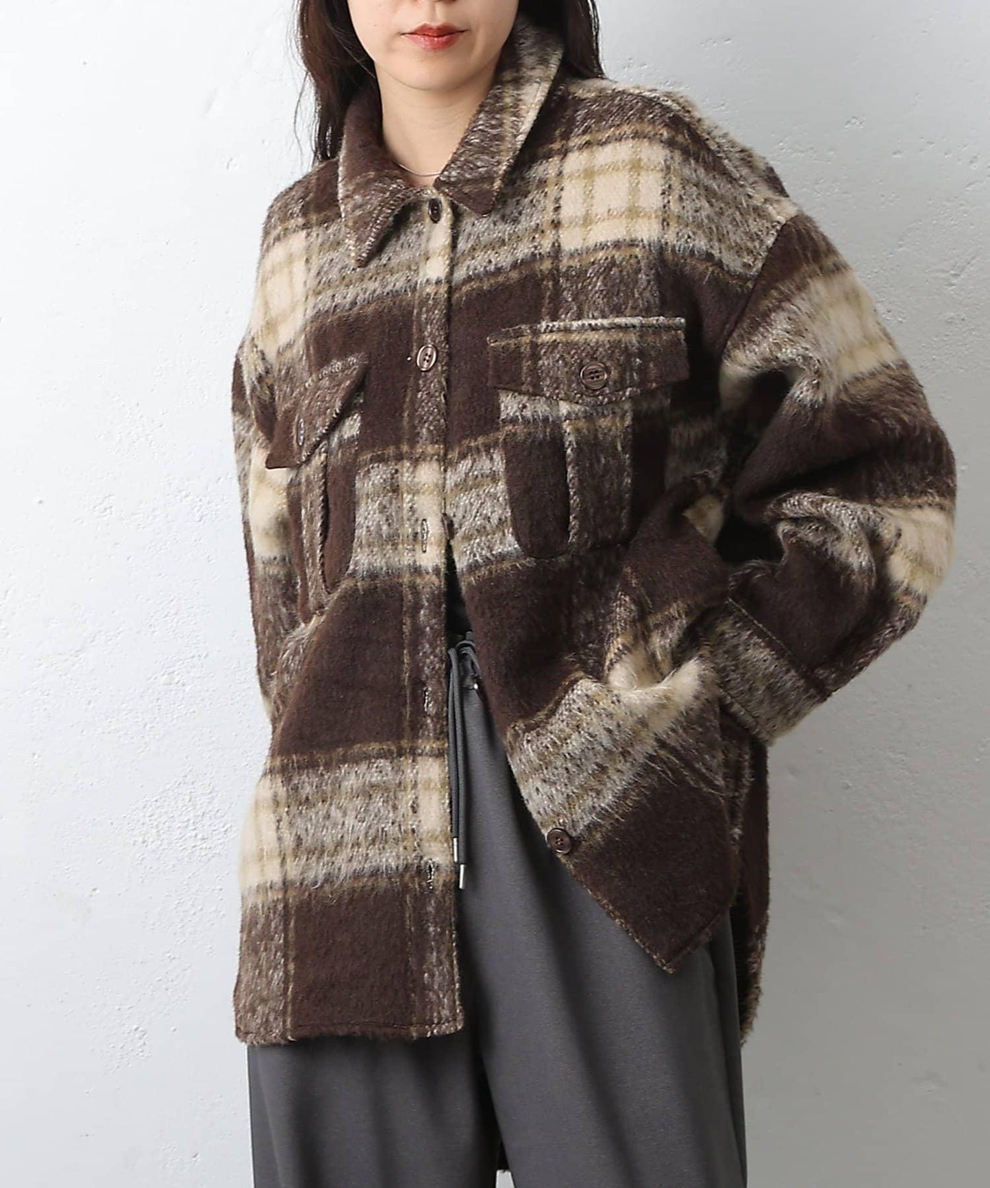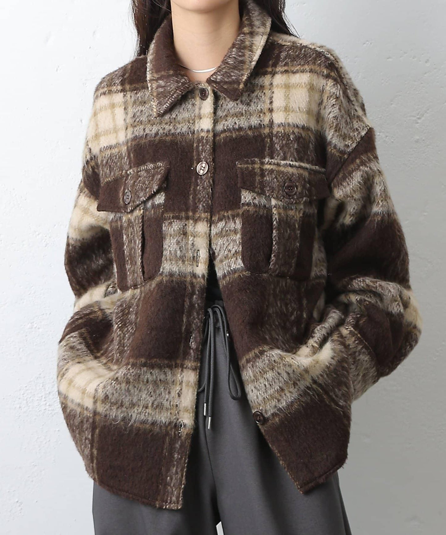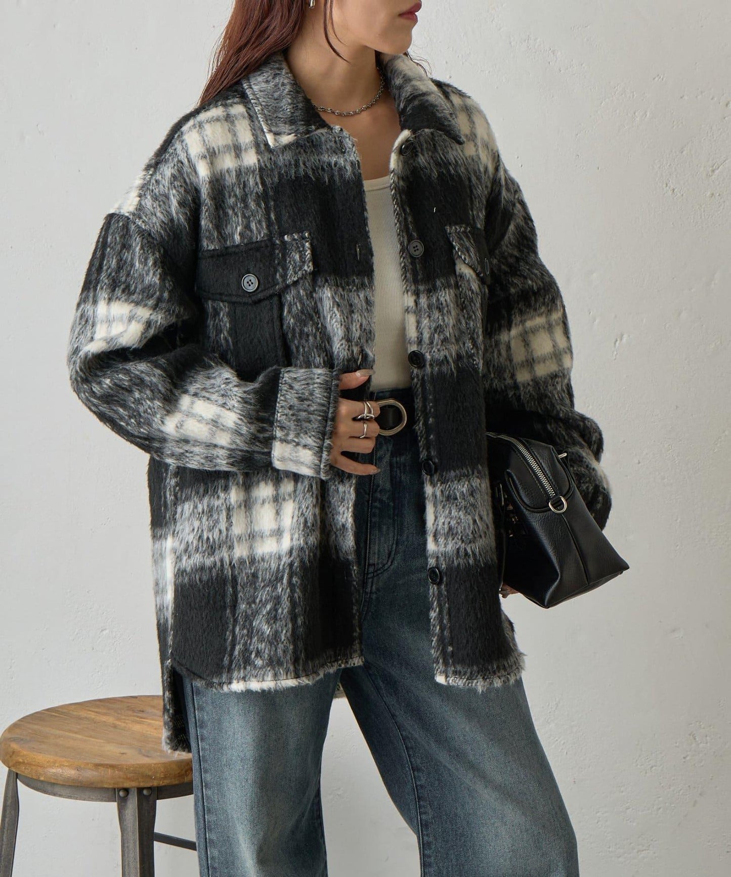 毛茸茸的格紋襯衫外衣,只需輕輕一穿,就能完成時尚造型。