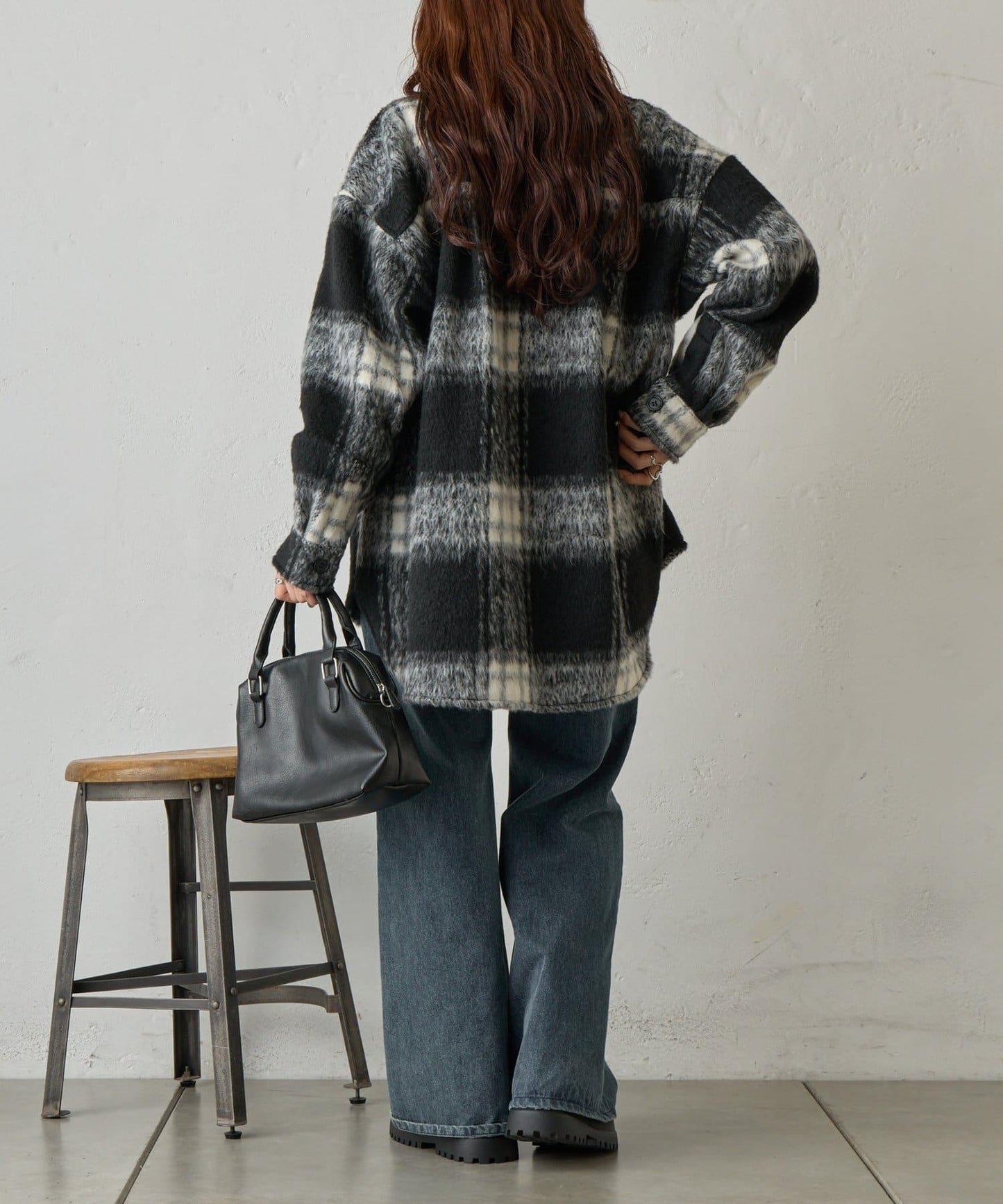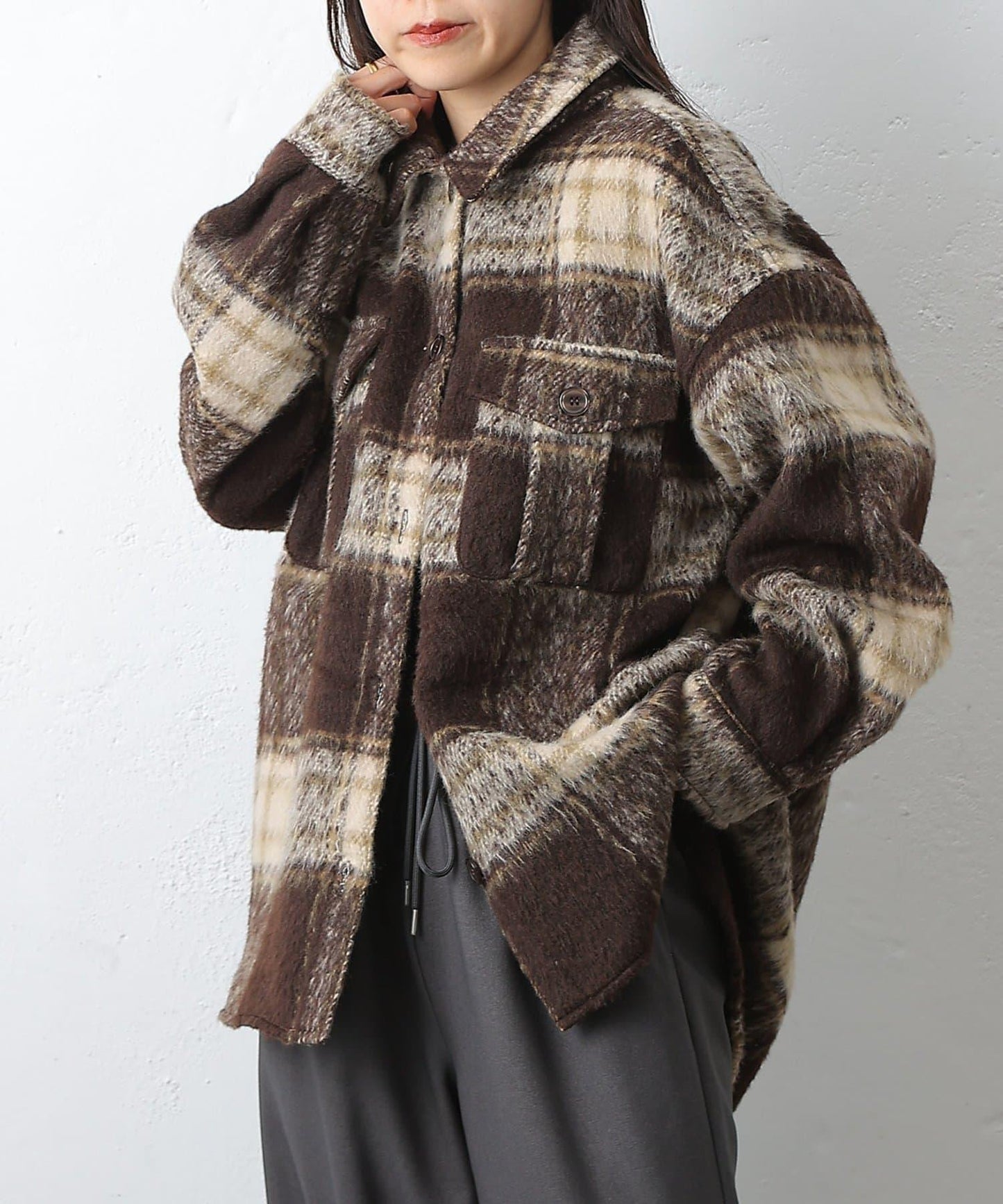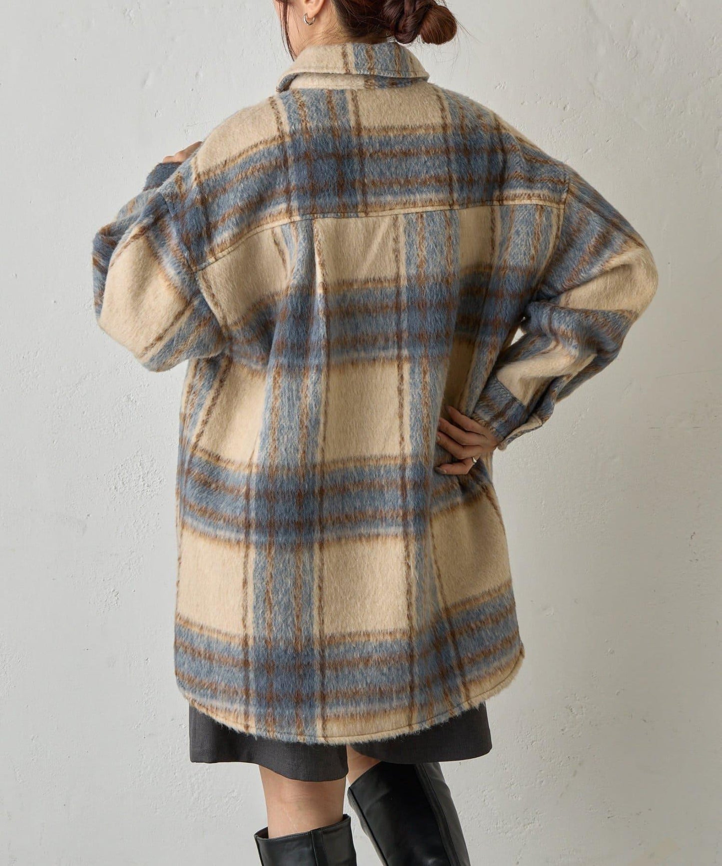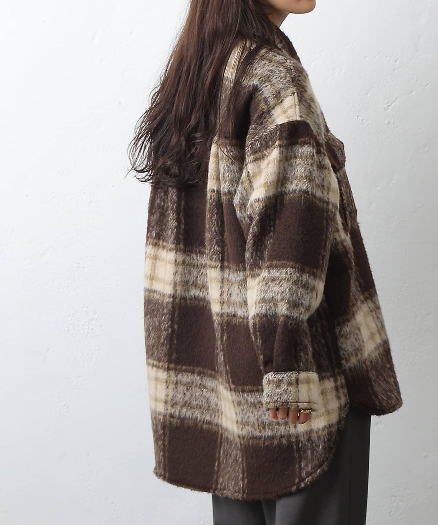 毛茸茸的格紋襯衫外衣,只需輕輕一穿,就能完成時尚造型。