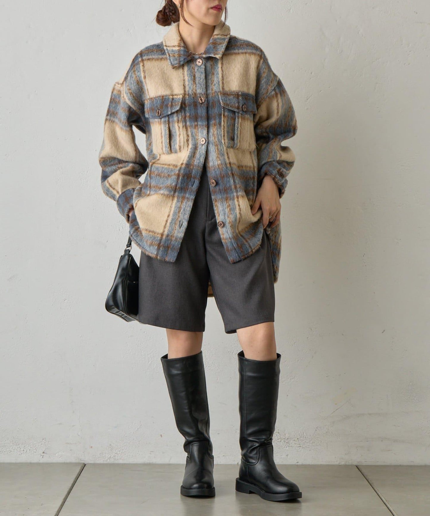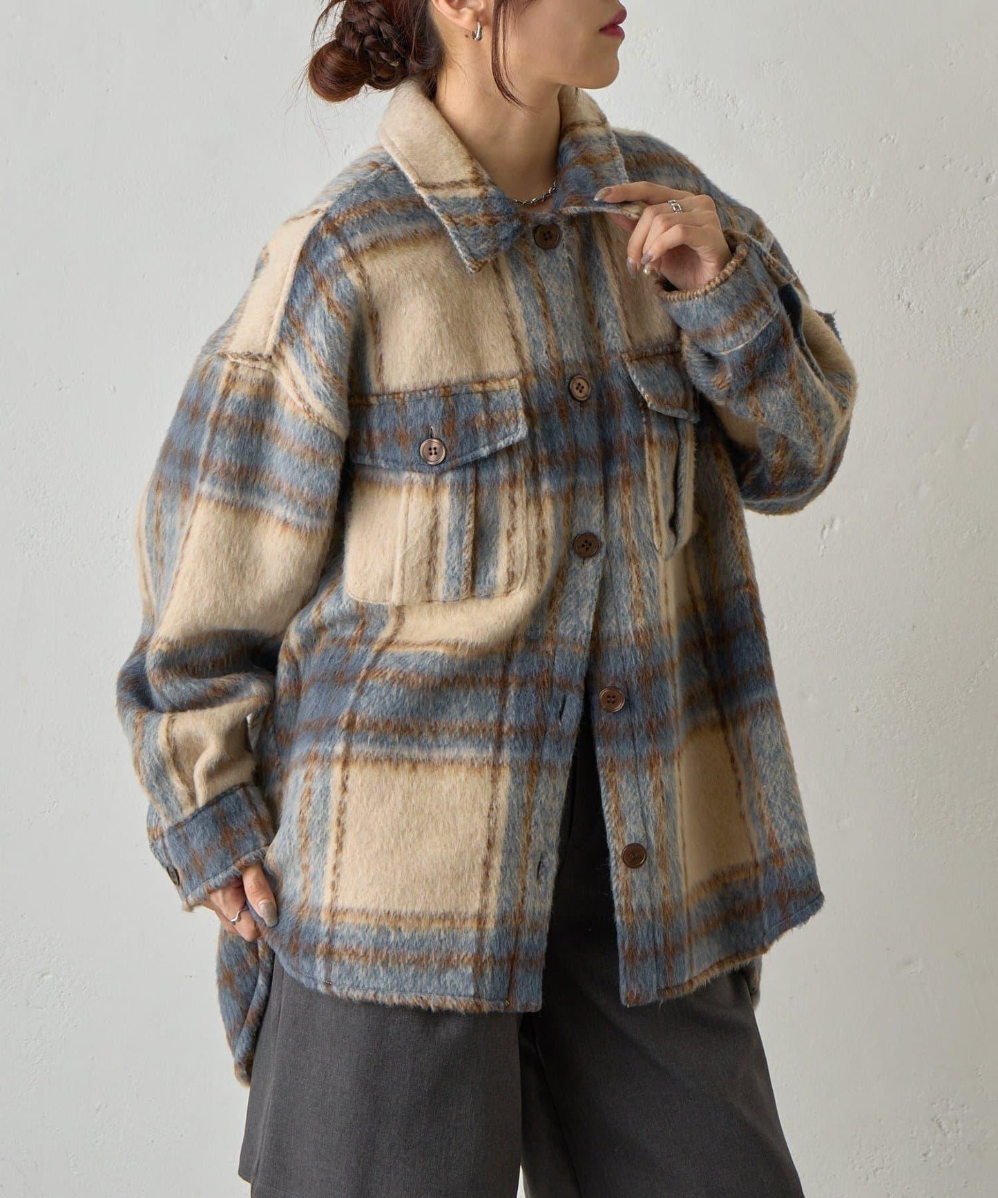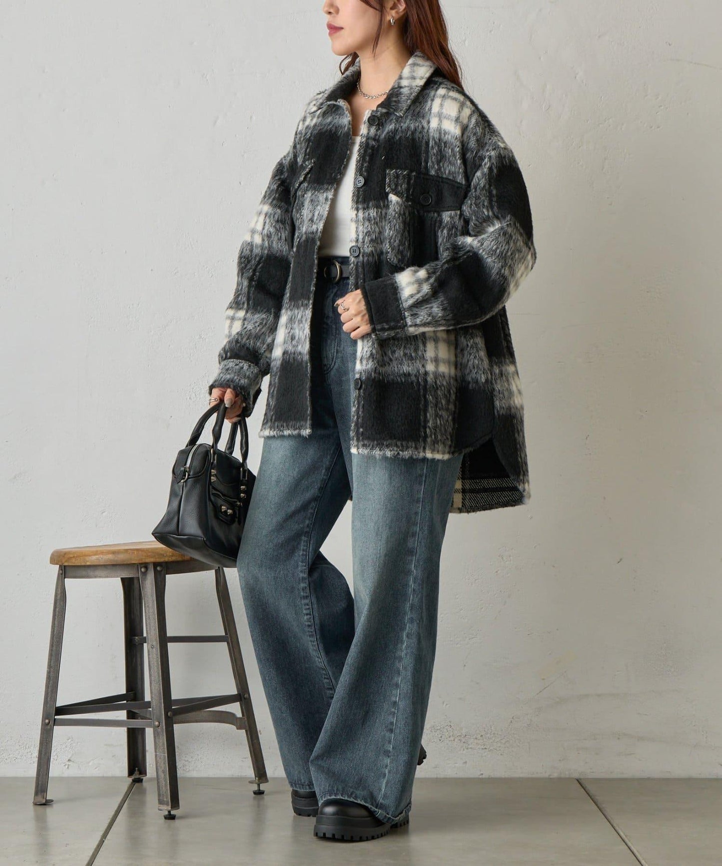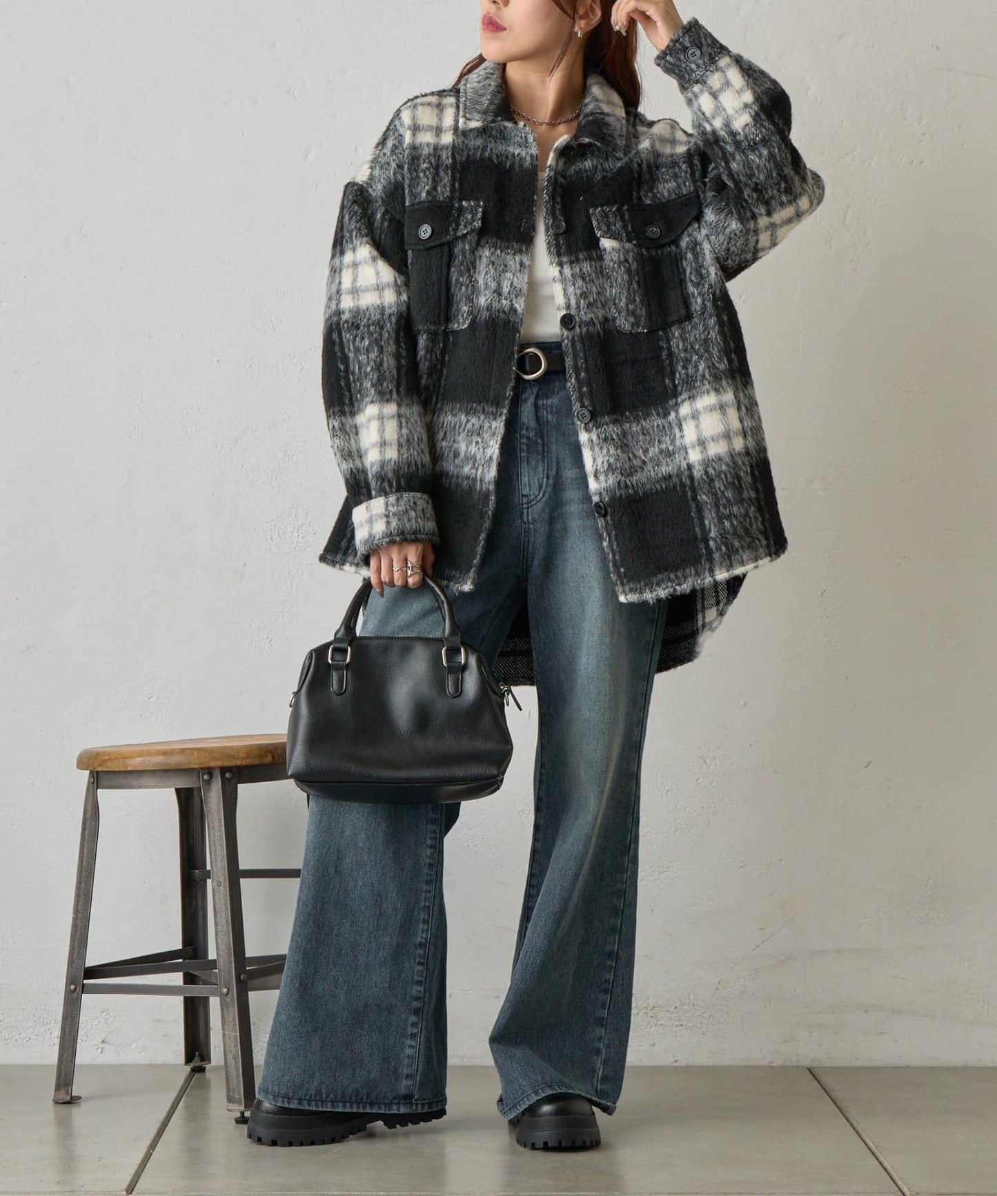 毛茸茸的格紋襯衫外衣,只需輕輕一穿,就能完成時尚造型。