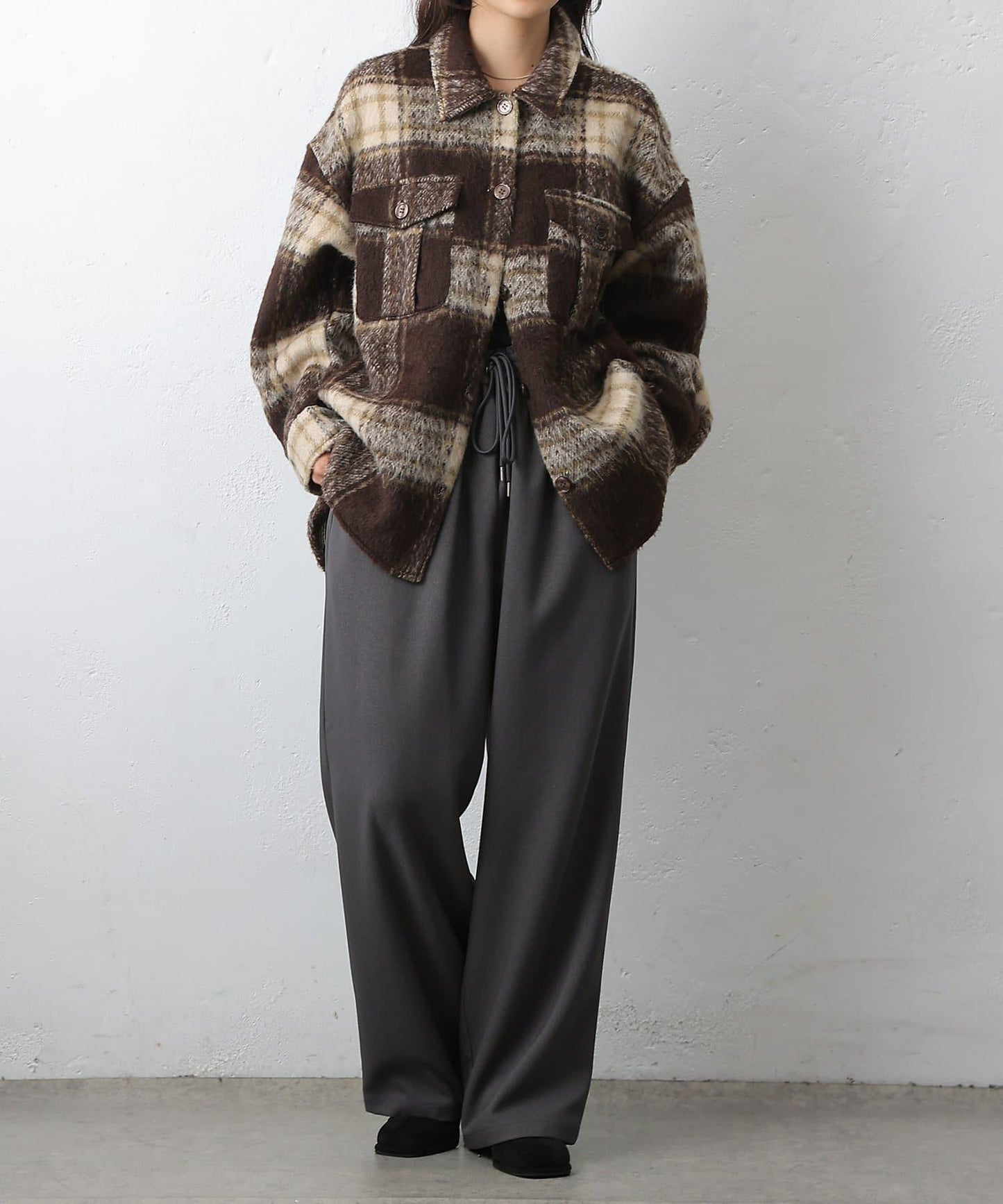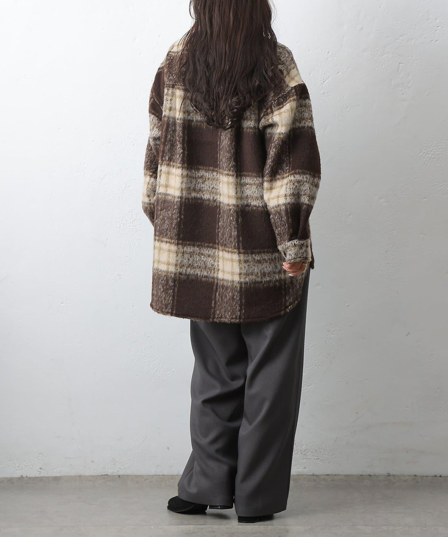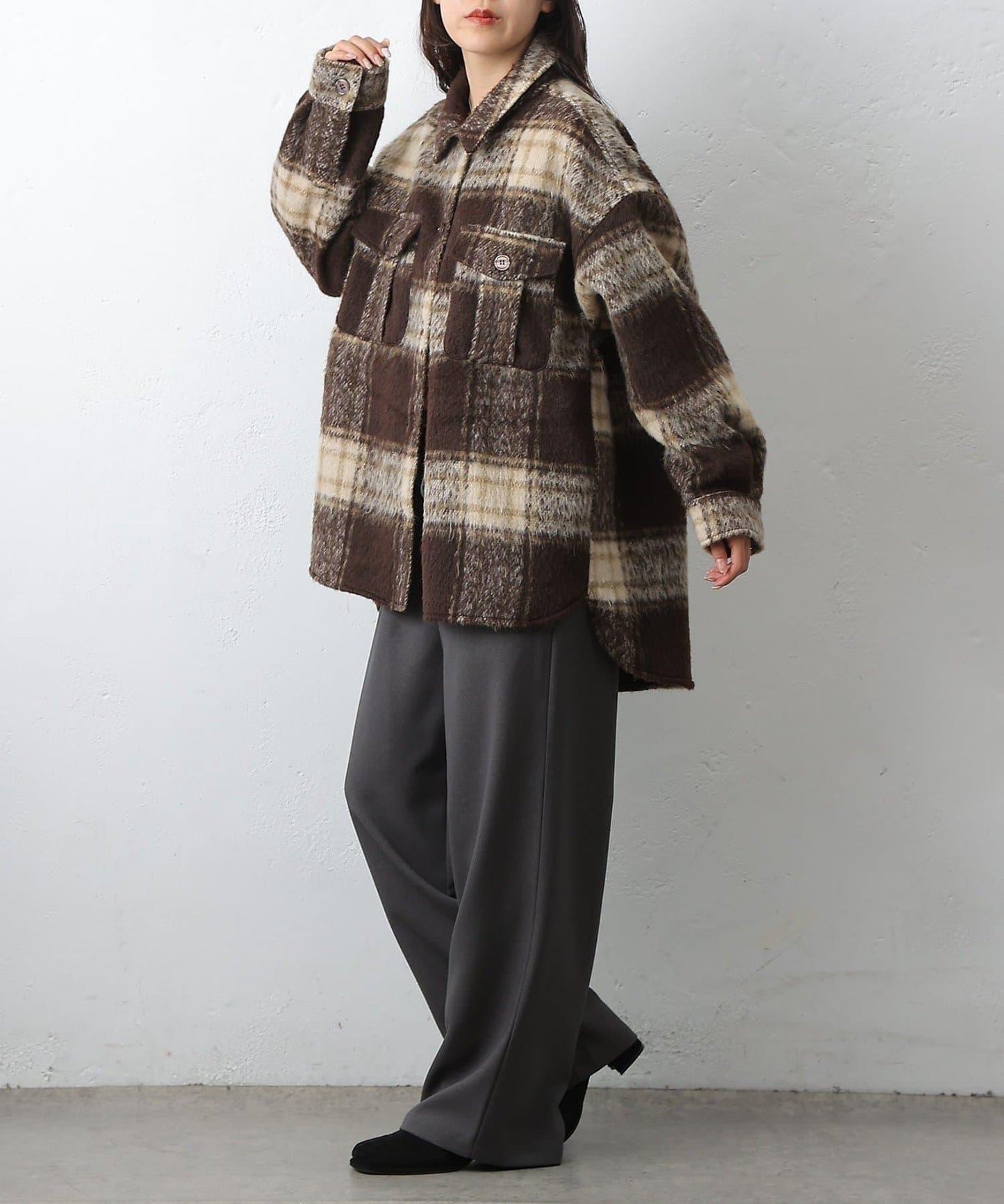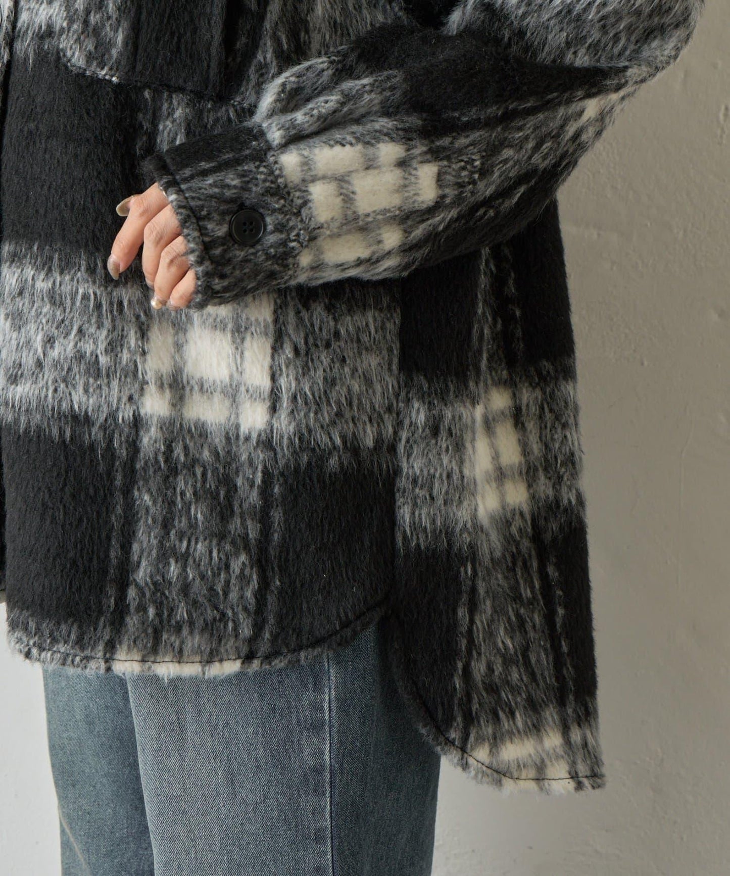 毛茸茸的格紋襯衫外衣,只需輕輕一穿,就能完成時尚造型。
